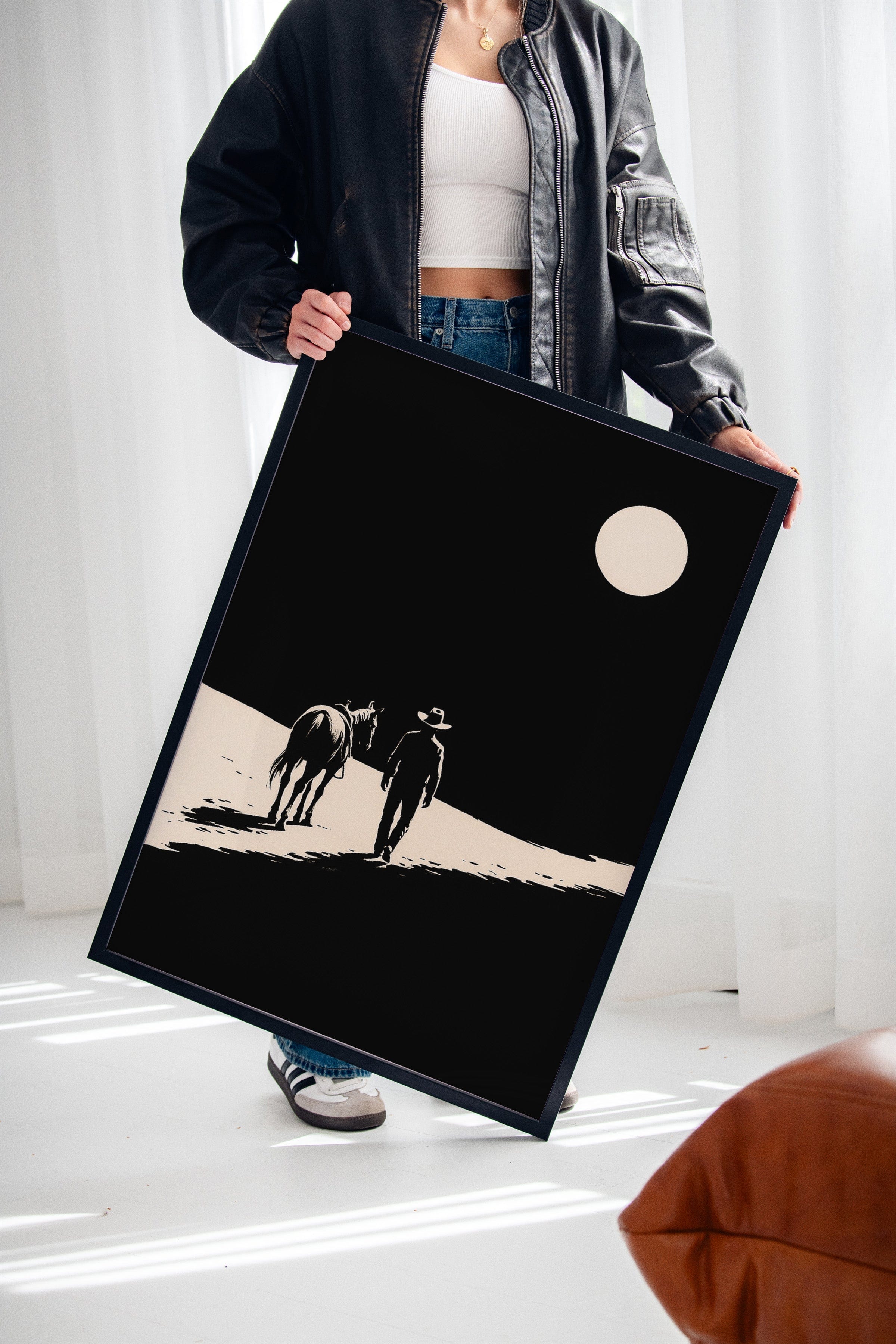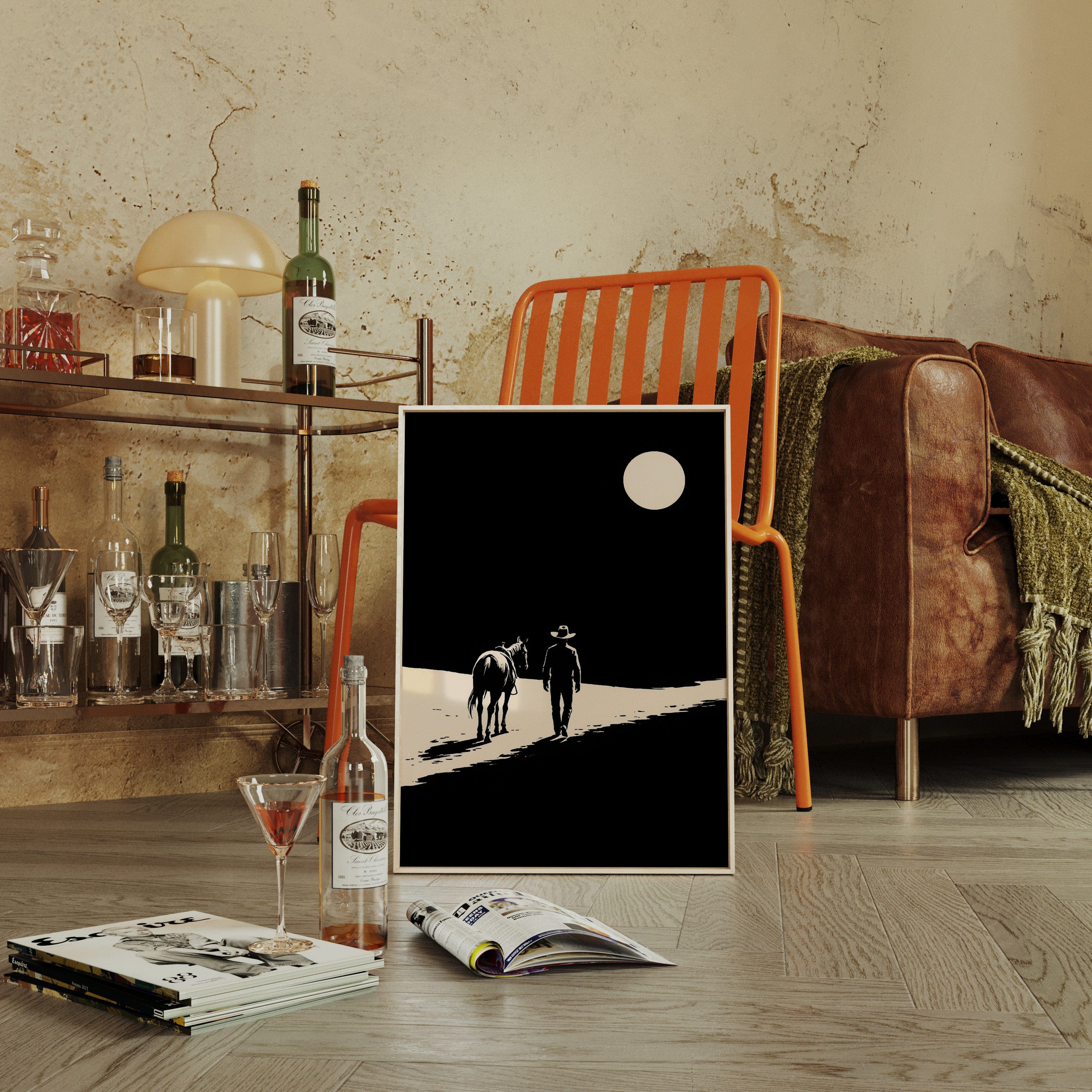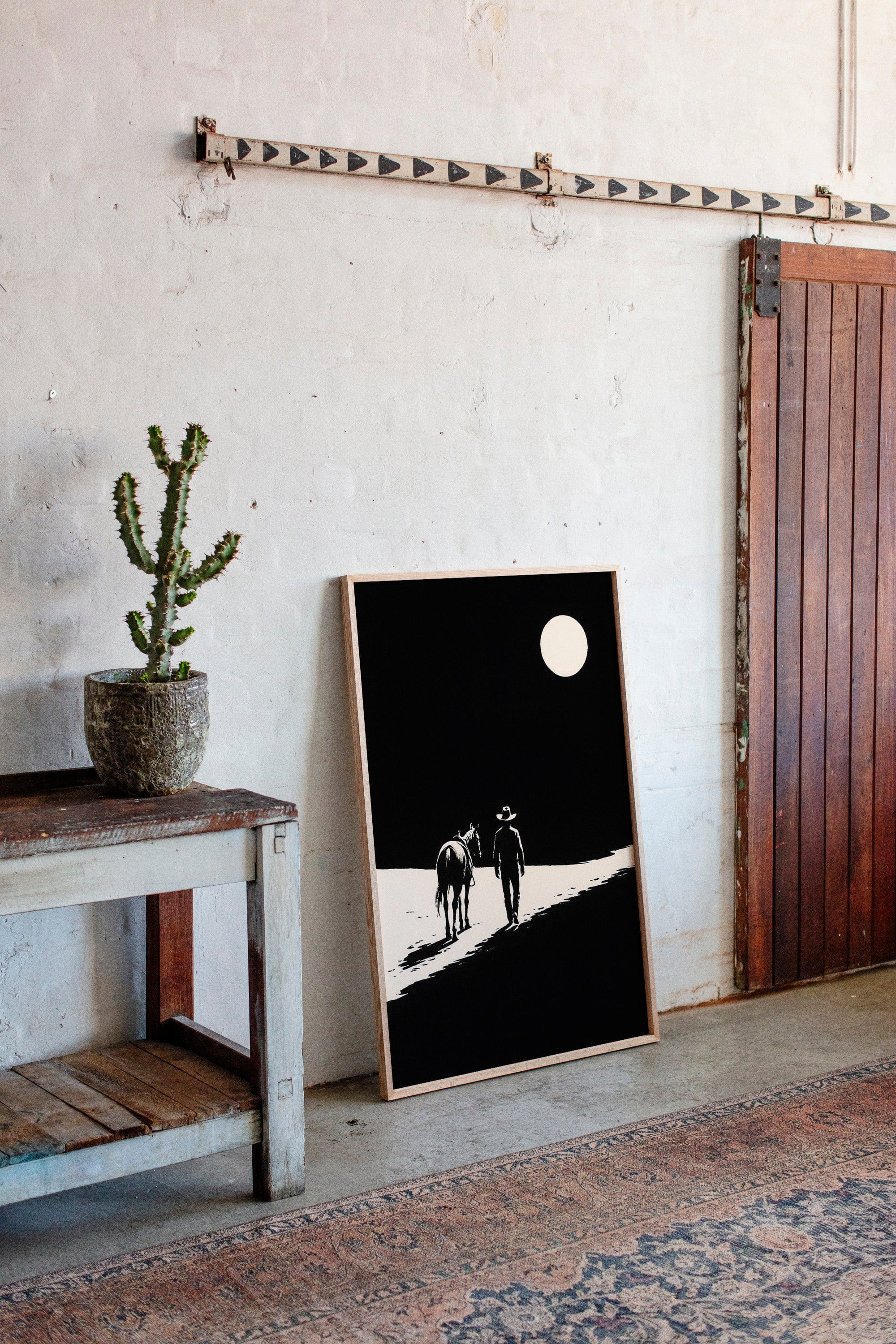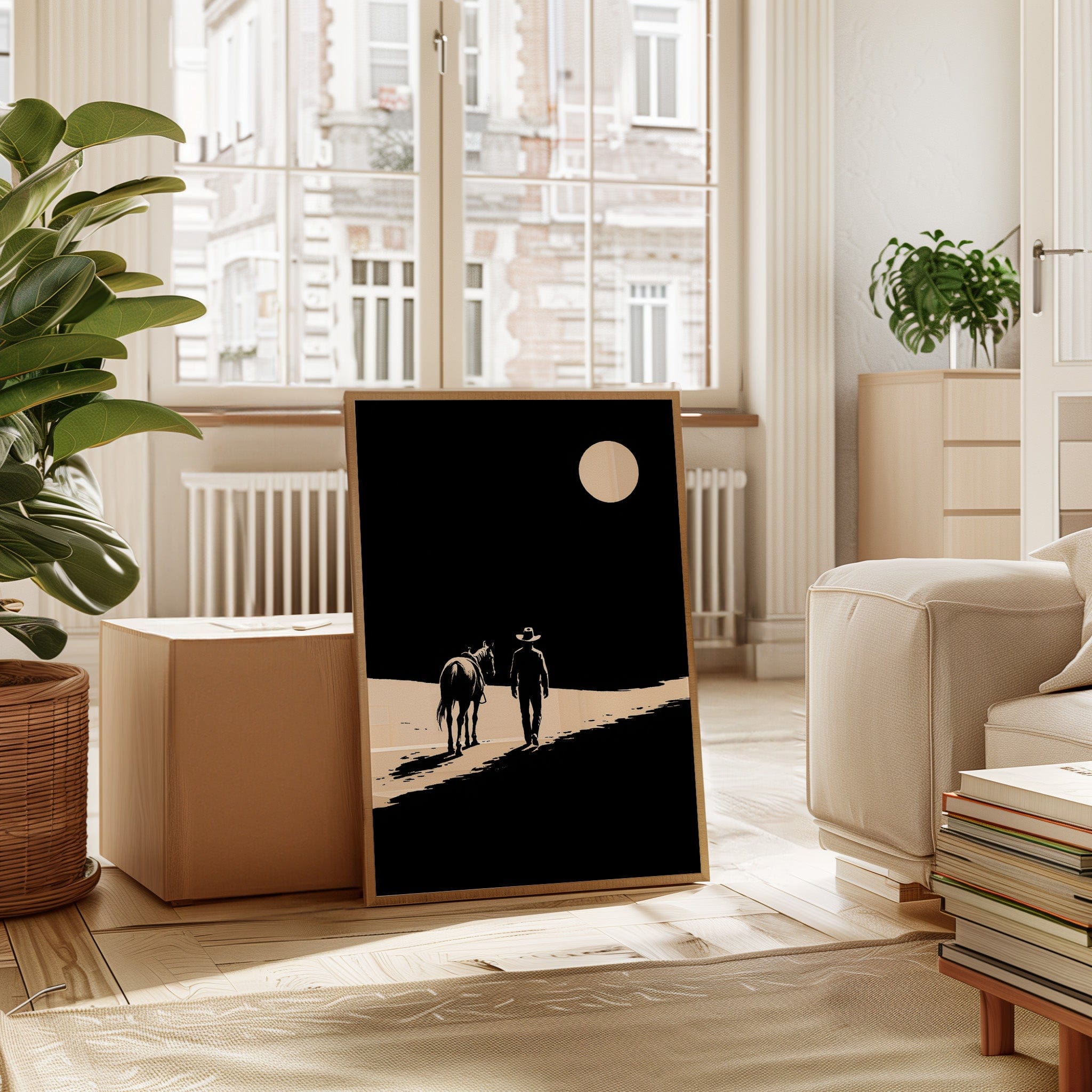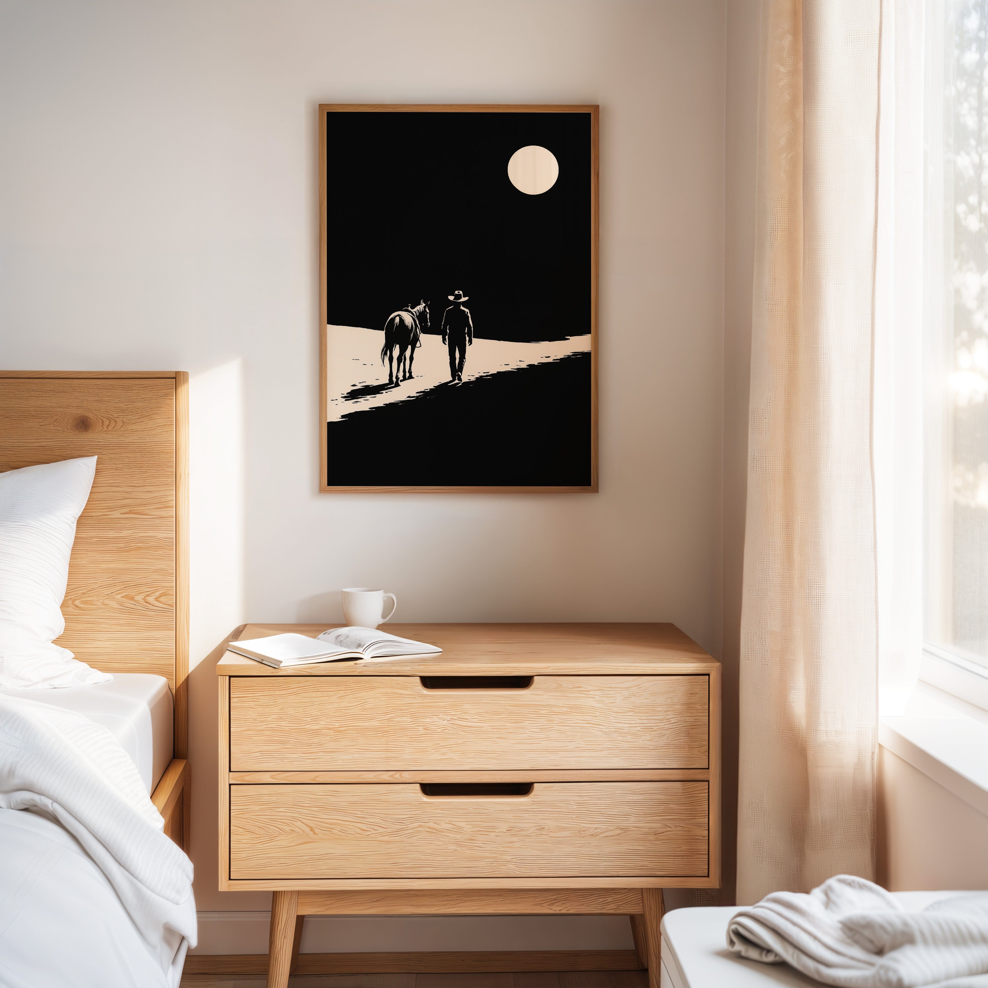 A minimalist Western silhouette of a lone cowboy and his horse under a full moon — a quiet ode to the long road home.