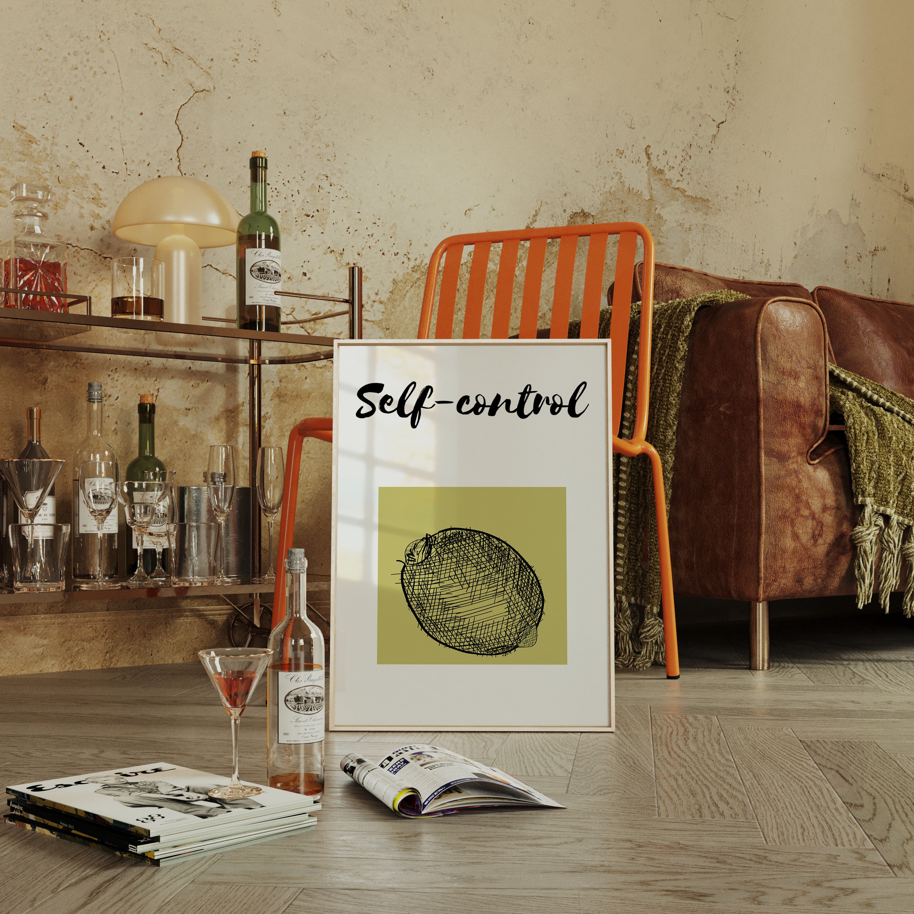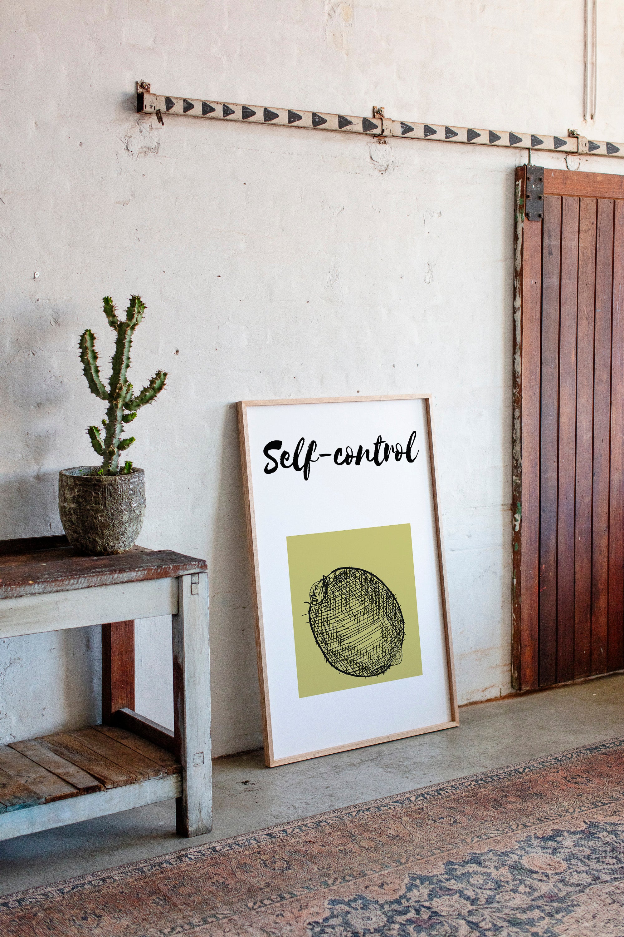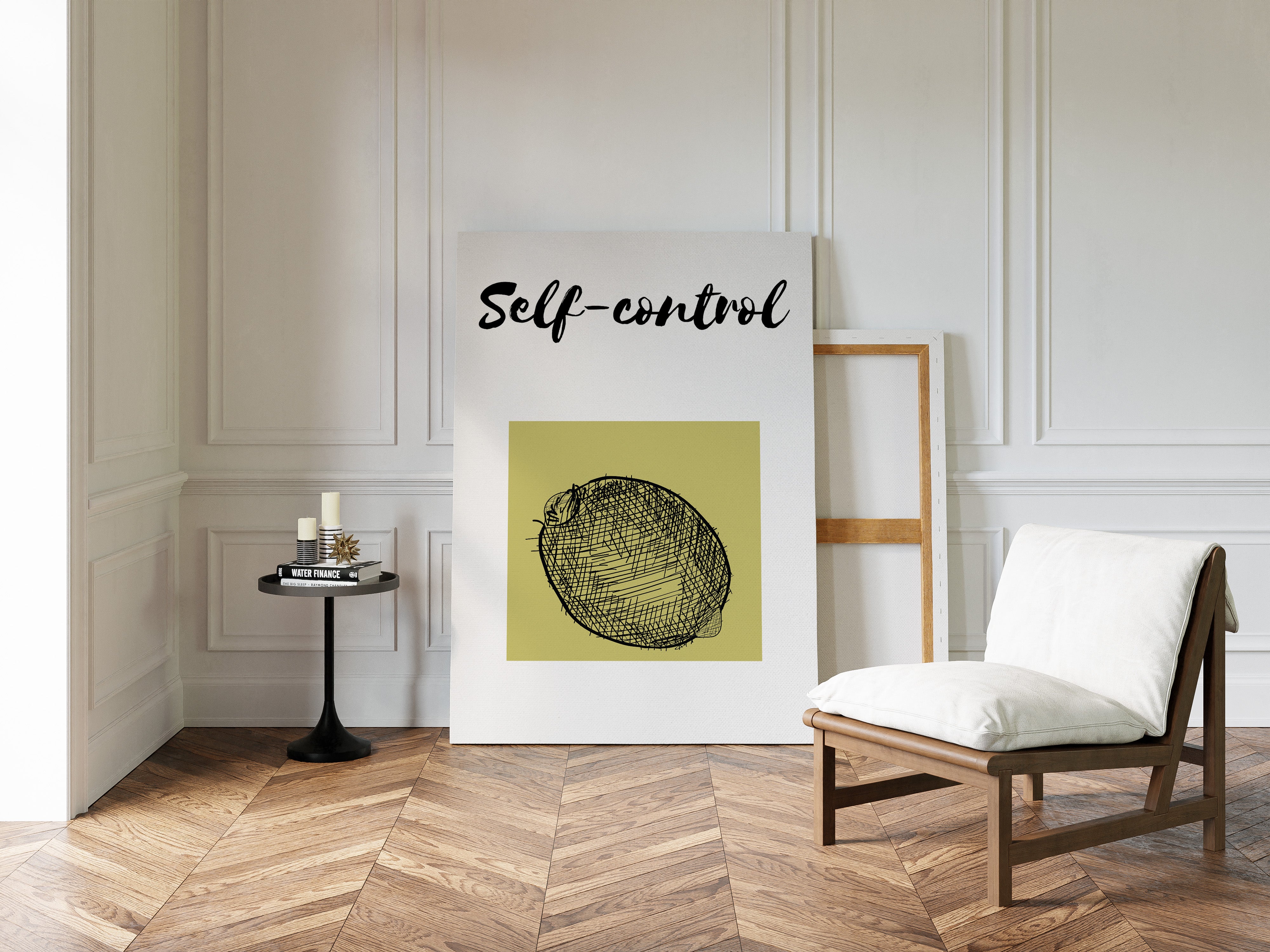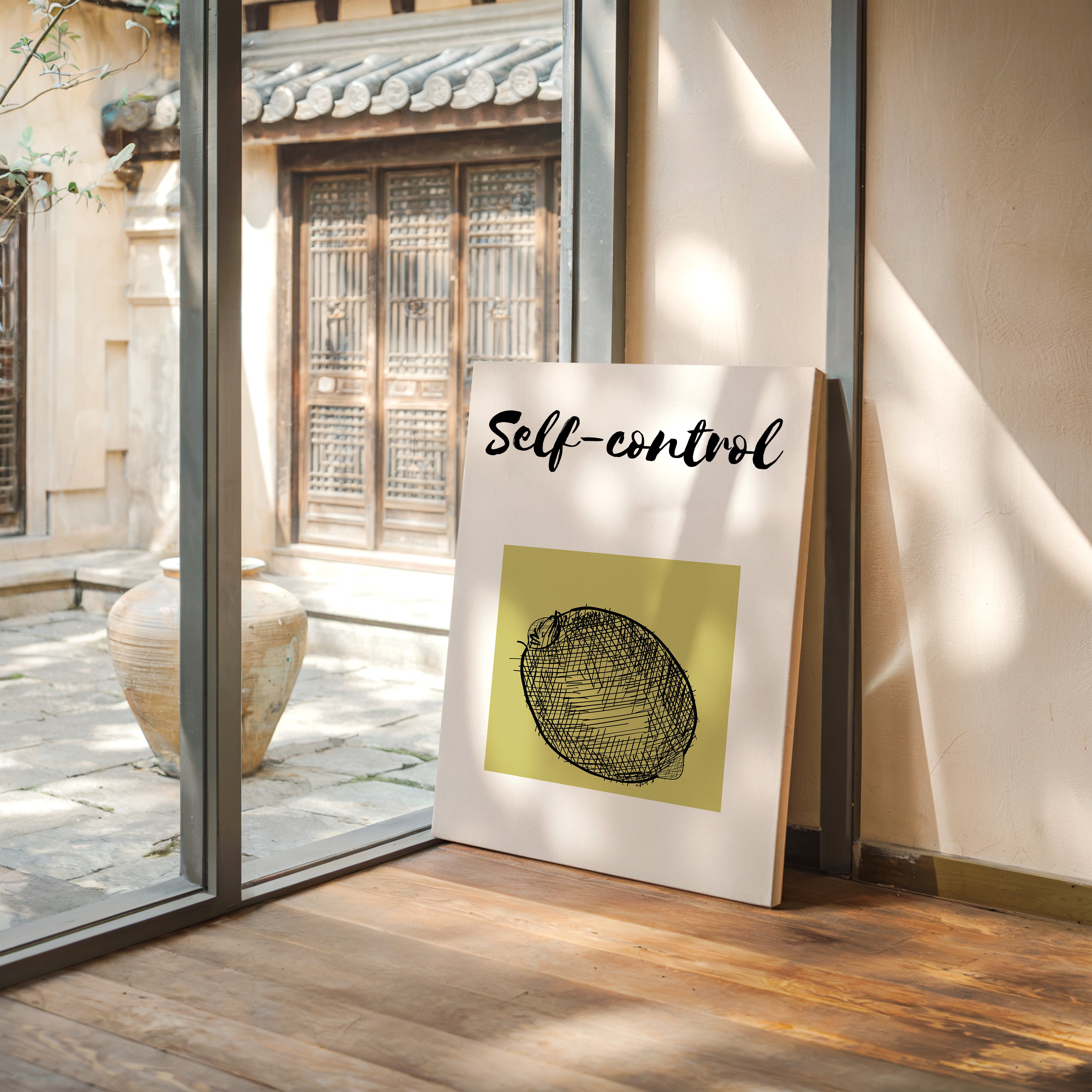Morning light streams across minimalist wisdom, where a simple sketch speaks volumes through bold strokes and quiet space. This piece from our Contemporary collection marries modern typography with understated fruit illustration in a masterful play of intention and restraint. The stark black lines against a soft chartreuse square create a compelling visual metaphor for life's fundamental truths, while the handwritten 'self-control' adds a touch of raw authenticity to the composition. Perfect for a home office or meditation space where daily reminders of mindful living feel most at home. The piece invites moments of reflection while adding sophisticated visual interest to any room.