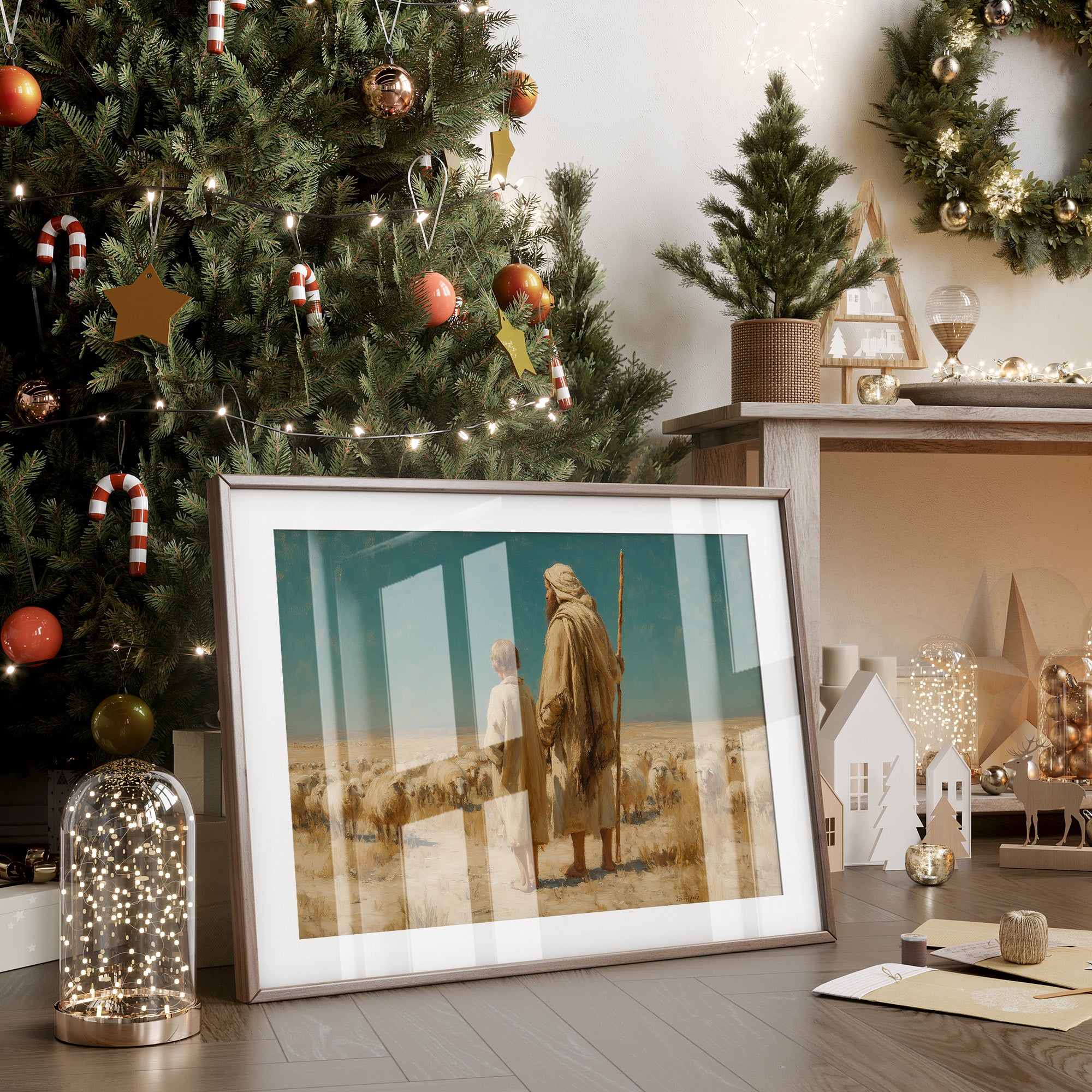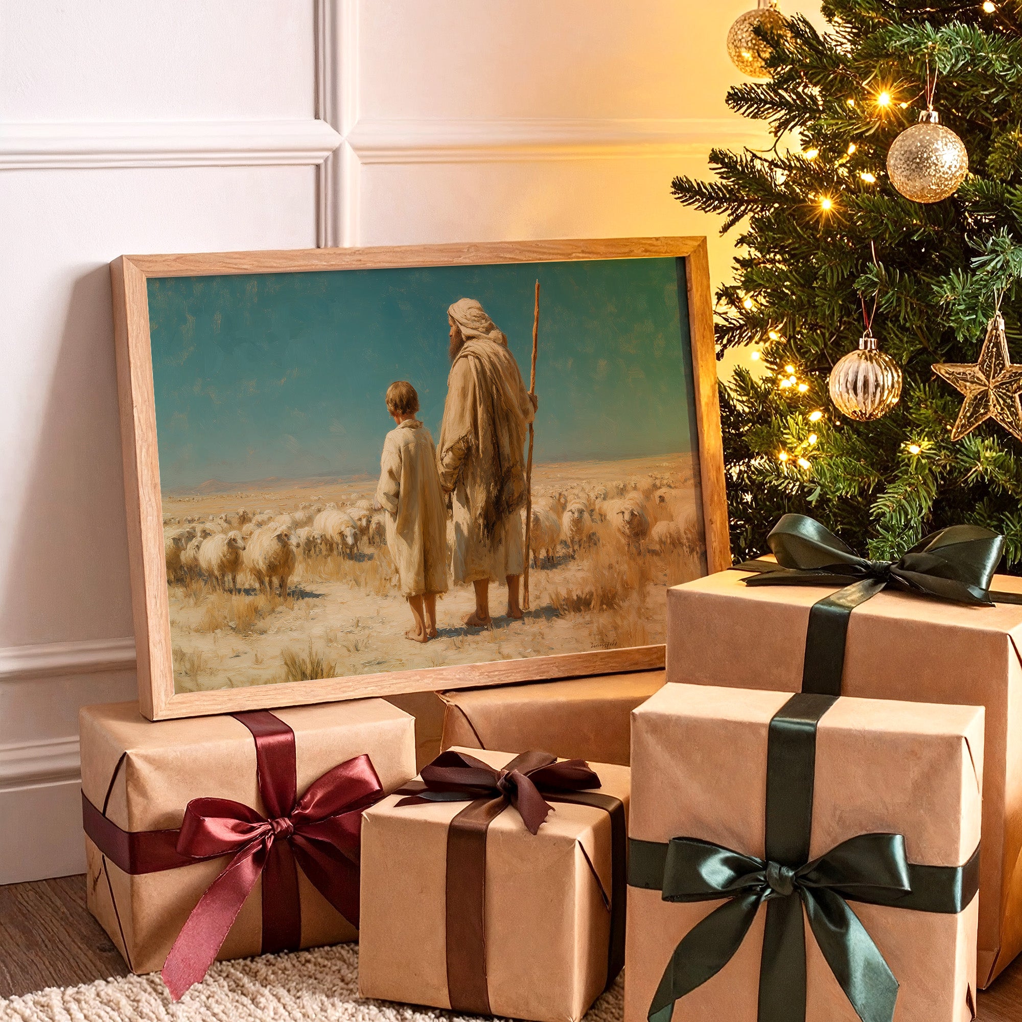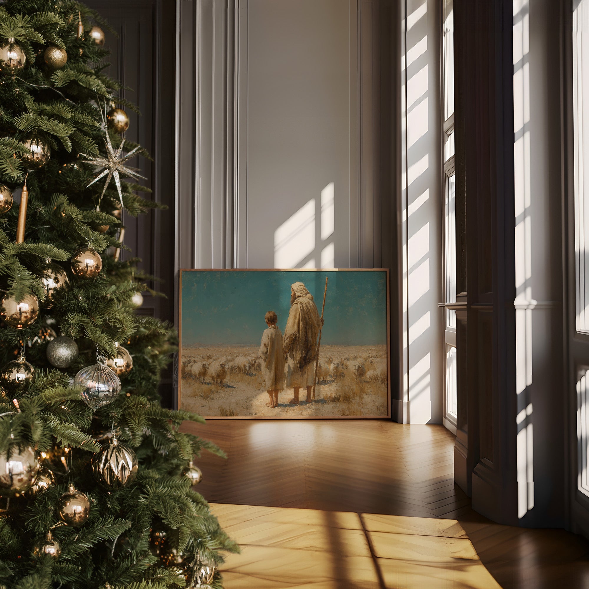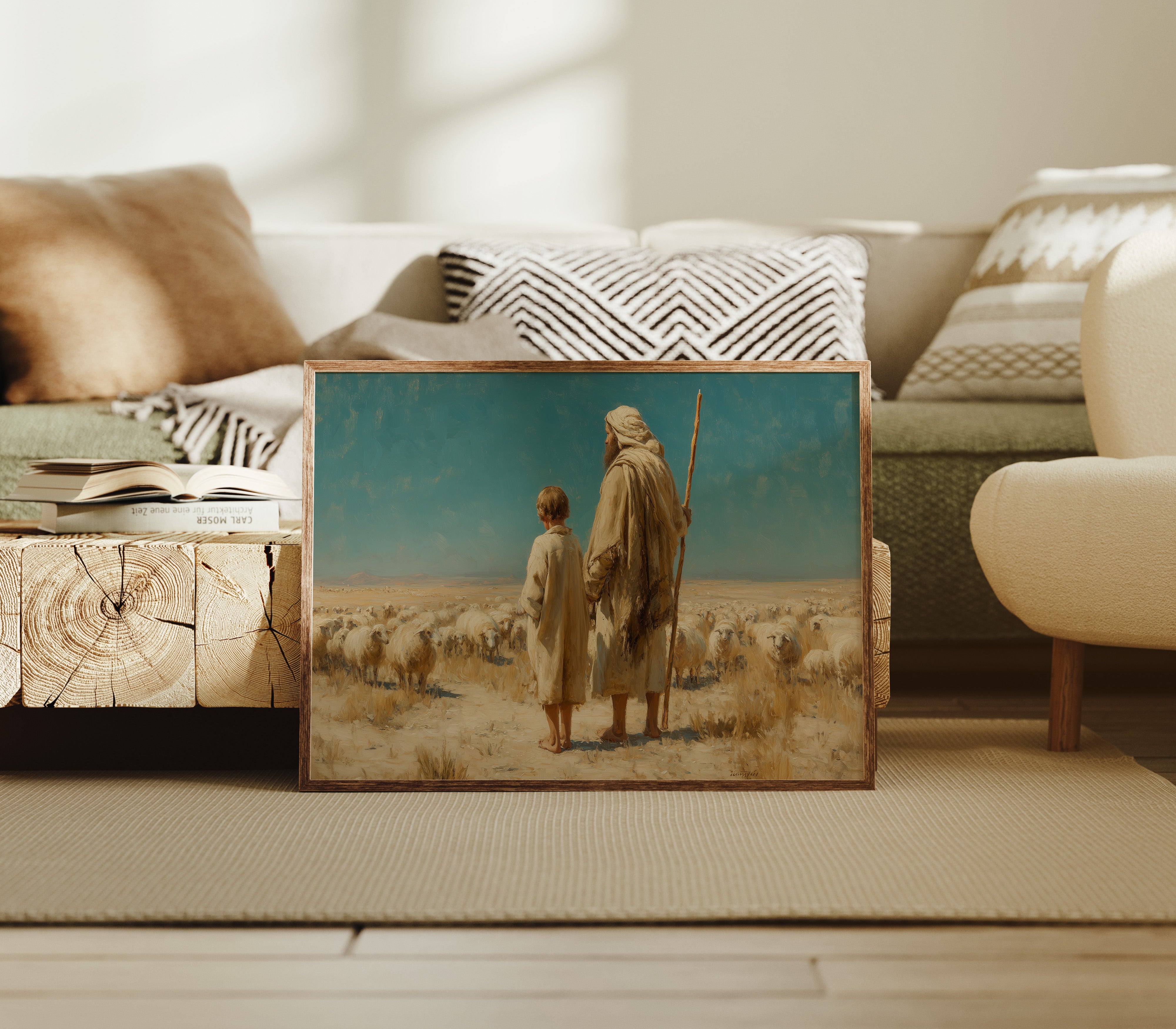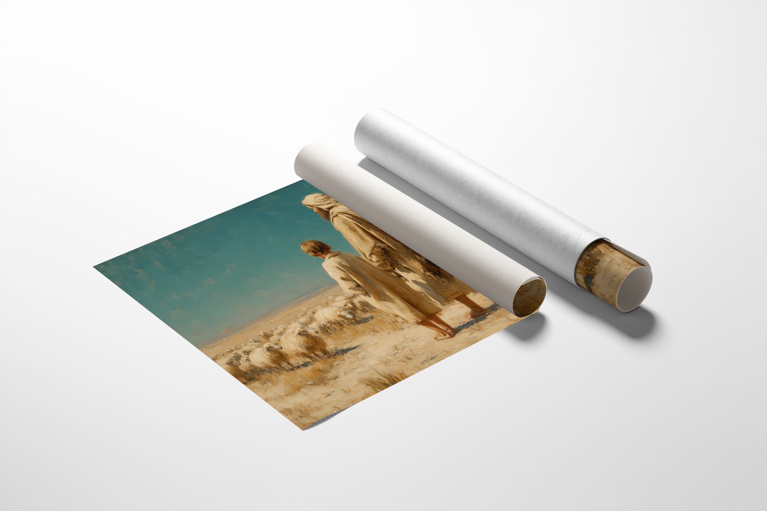 Golden light washes over an expansive desert landscape, where two figures stand in contemplative stillness before a sea of sheep. The ethereal turquoise sky creates a striking contrast against the sun-bleached earth, while weathered robes catch the warm breeze. Through masterful brushstrokes, the artist captures the timeless relationship between mentor and student, shepherd and apprentice. This piece speaks to the passing of wisdom across generations, set against nature's grand canvas. Perfect for spaces seeking to evoke reflection and tranquility, this piece brings pastoral serenity to living rooms, studies, or meditation spaces.