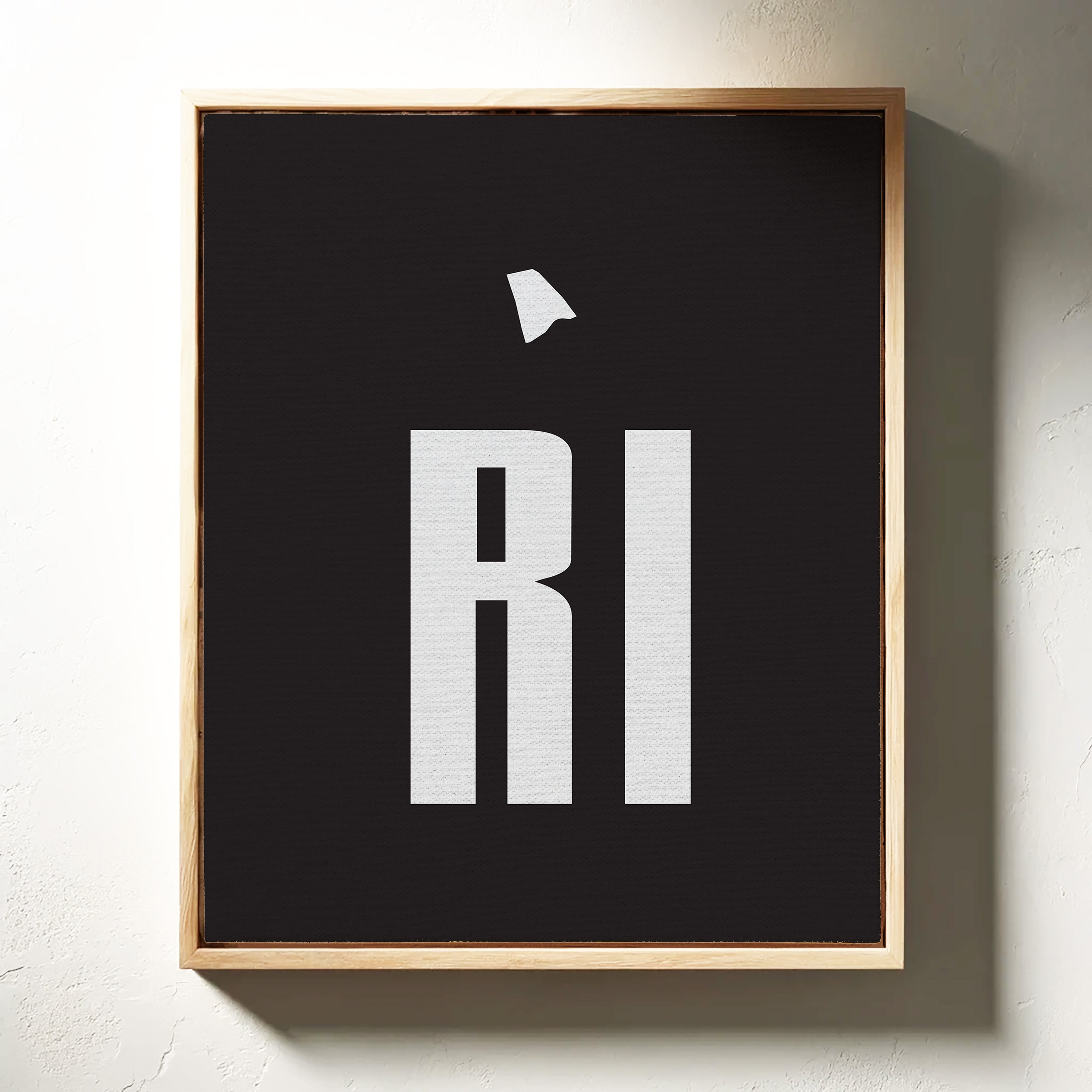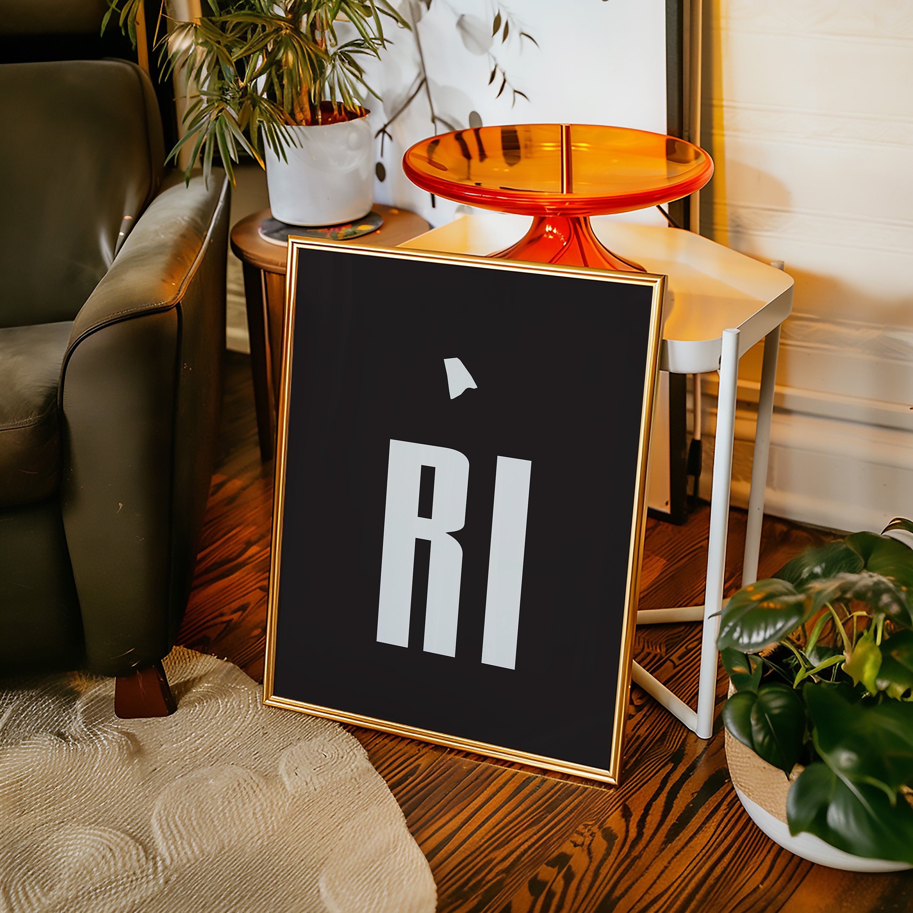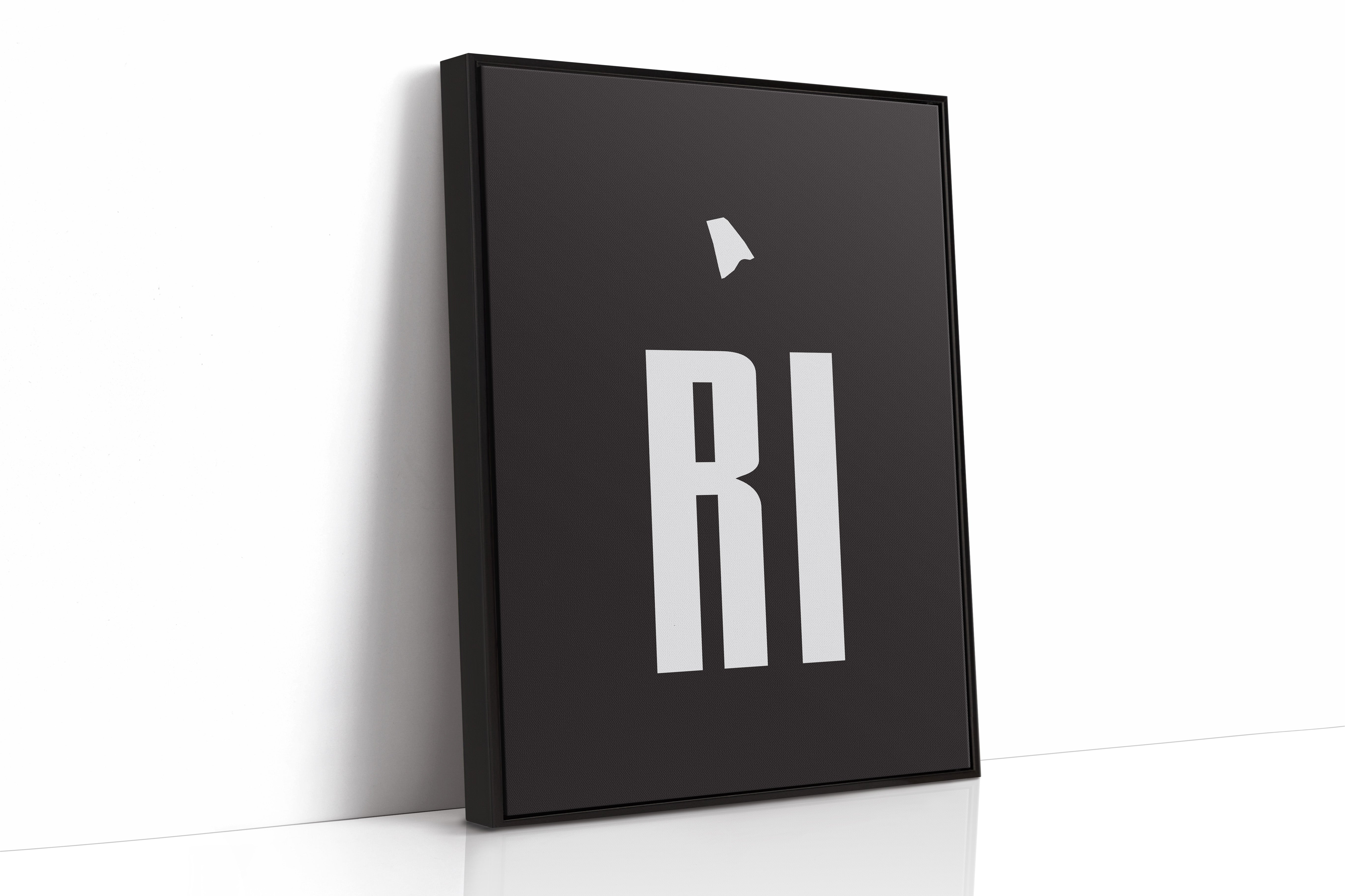 A stark white ""R"" and ""I"" emerge from the darkness, their forms precise yet seemingly in motion as a fragment breaks away toward freedom. The minimalist composition creates a powerful tension between structure and liberation. Against the deep black background, the clean typography takes on an almost sculptural quality, suggesting both order and rebellion in its geometric simplicity. This piece would make a commanding statement in a modern office space or creative studio, where its bold contrasts and conceptual depth can spark conversation and inspiration.