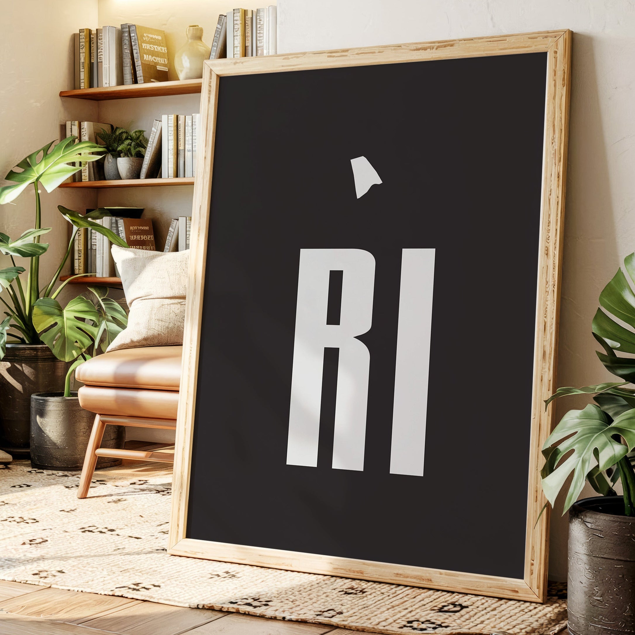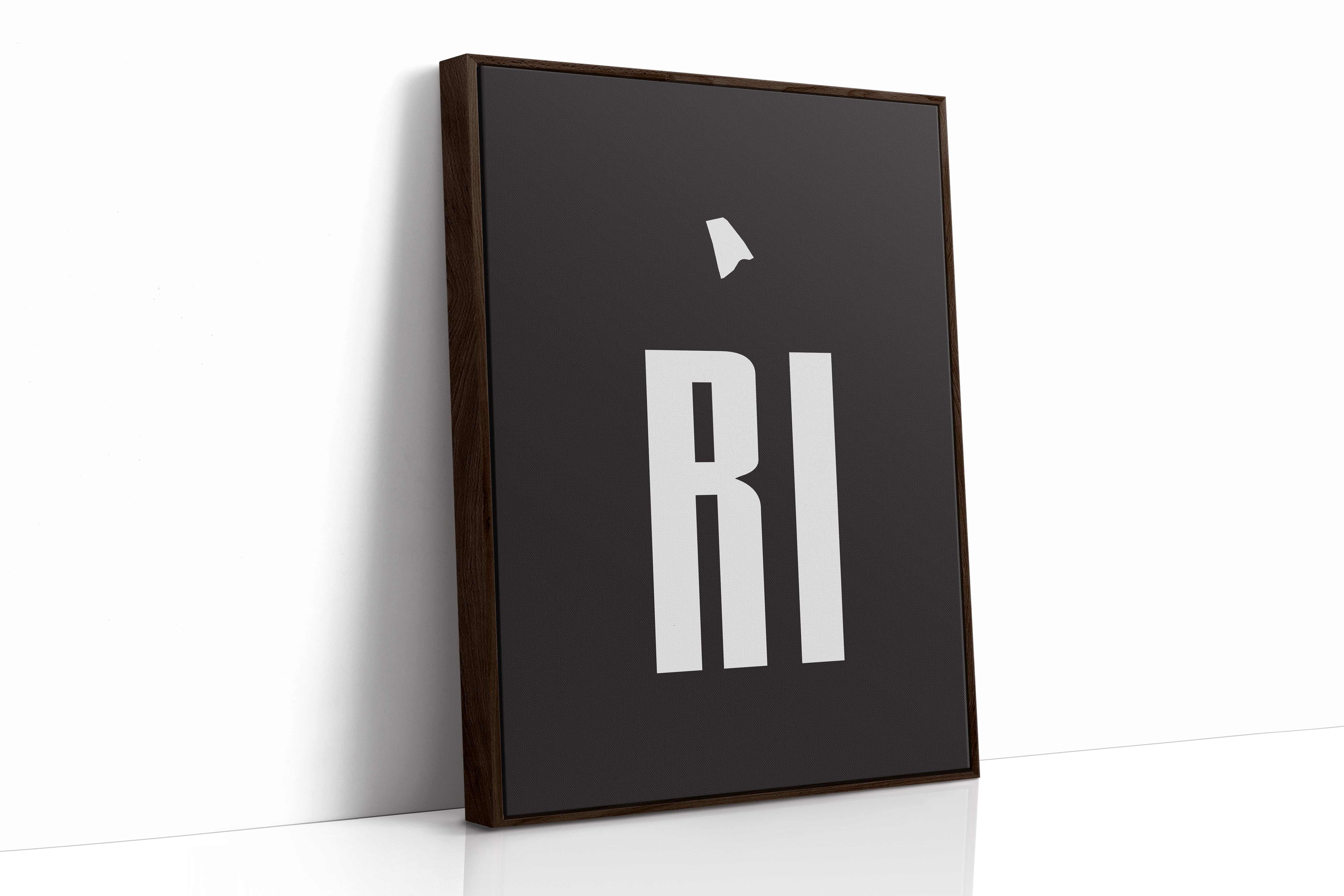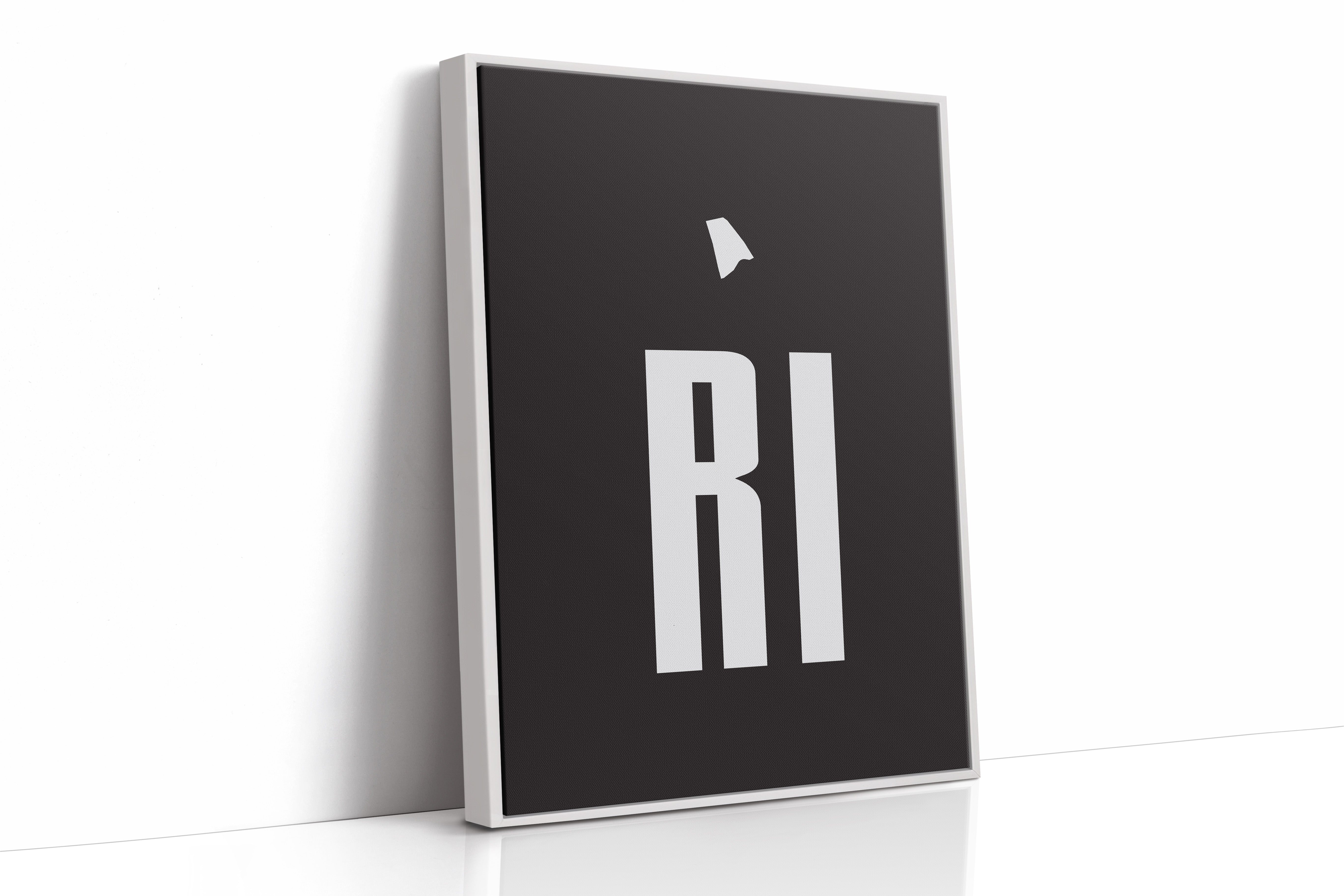 A stark white ""R"" and ""I"" emerge from the darkness, their forms precise yet seemingly in motion as a fragment breaks away toward freedom. The minimalist composition creates a powerful tension between structure and liberation. Against the deep black background, the clean typography takes on an almost sculptural quality, suggesting both order and rebellion in its geometric simplicity. This piece would make a commanding statement in a modern office space or creative studio, where its bold contrasts and conceptual depth can spark conversation and inspiration.