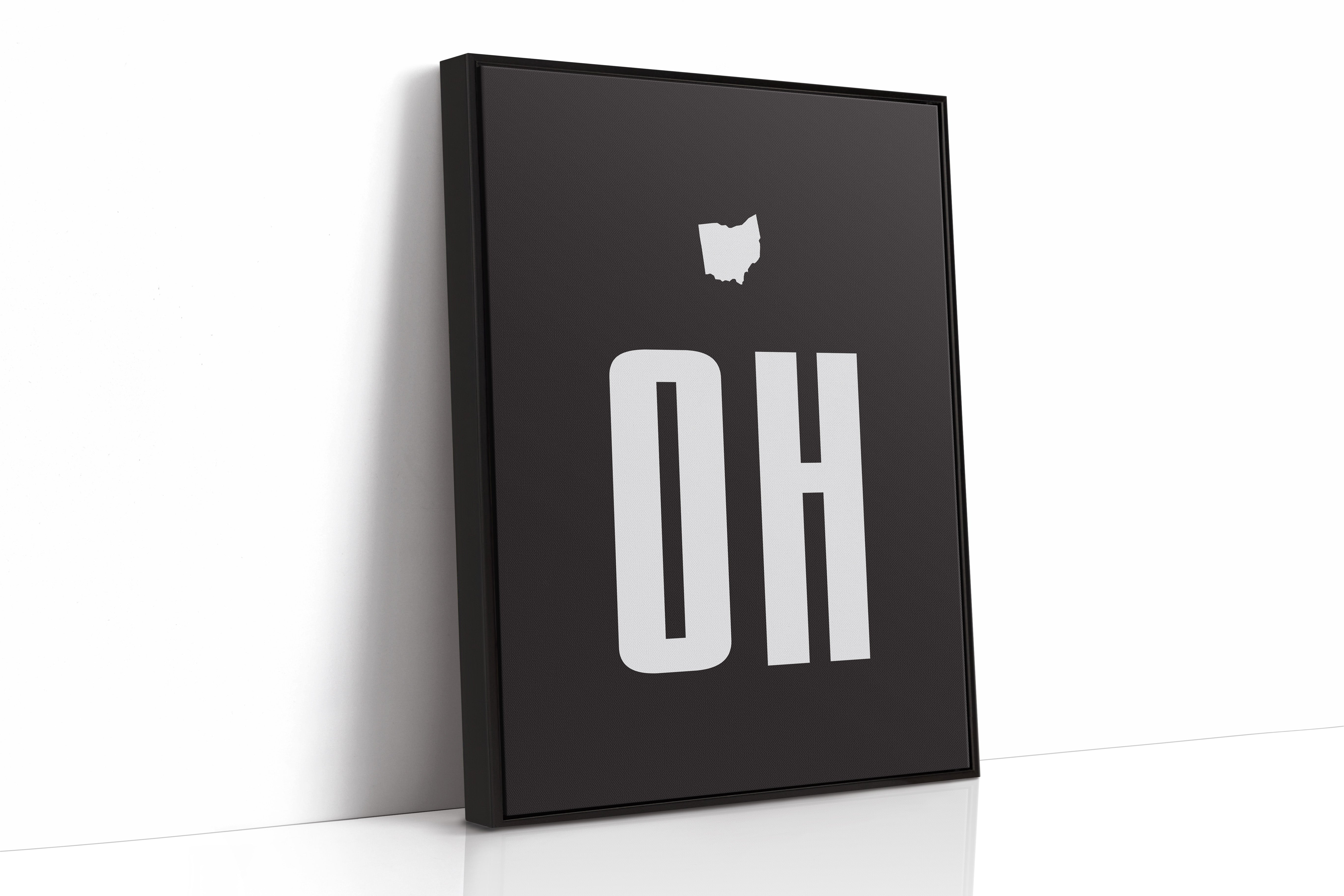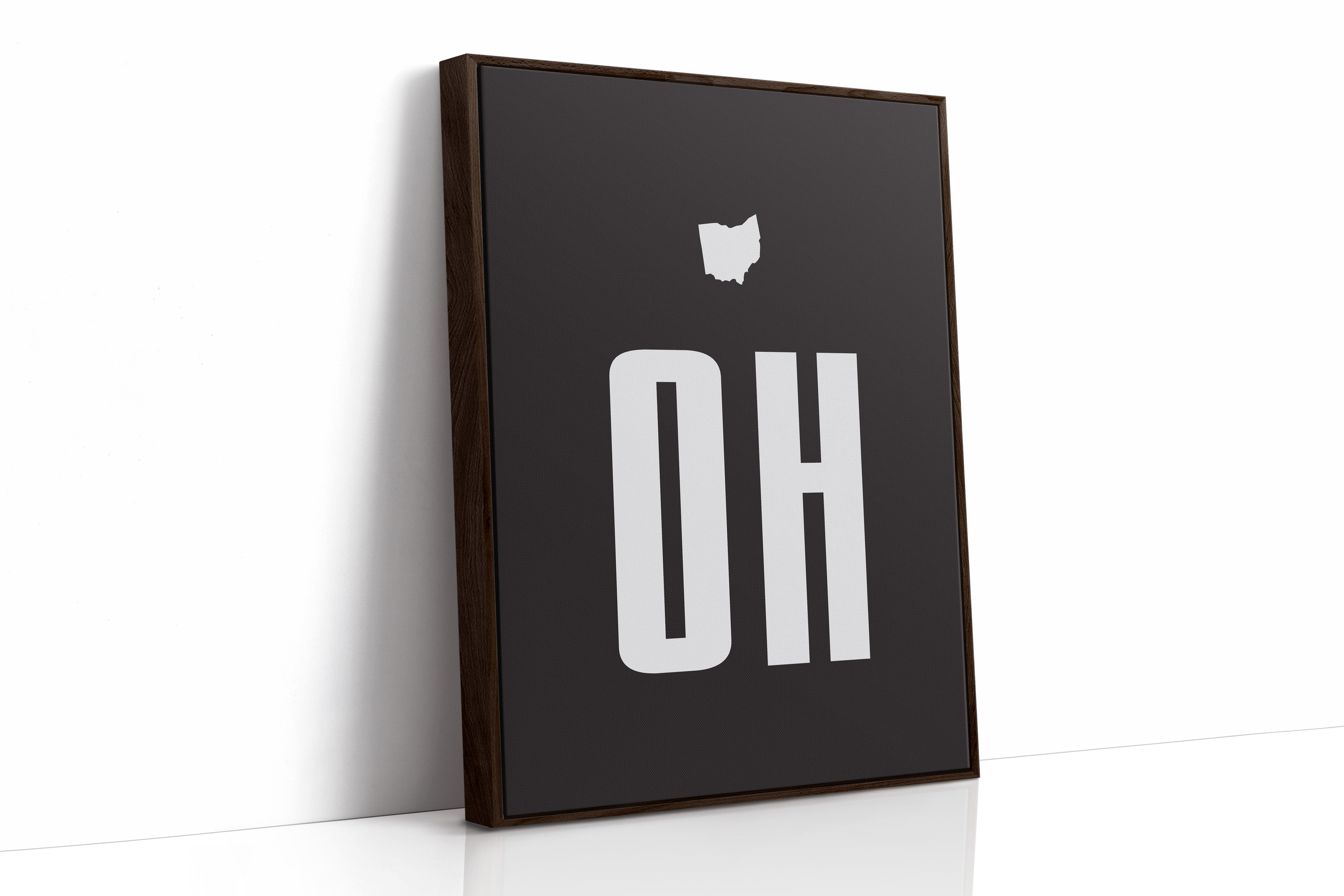 Bold white forms emerge from deep darkness, creating a striking visual statement of Ohio's identity. The minimalist design pairs the state's distinctive silhouette with contemporary typography, speaking volumes through negative space. The stark contrast between light and shadow gives weight to each element, while the clean lines evoke modern sophistication and geometric precision. This piece would command attention in a modern office space or add graphic punch to a contemporary living room.