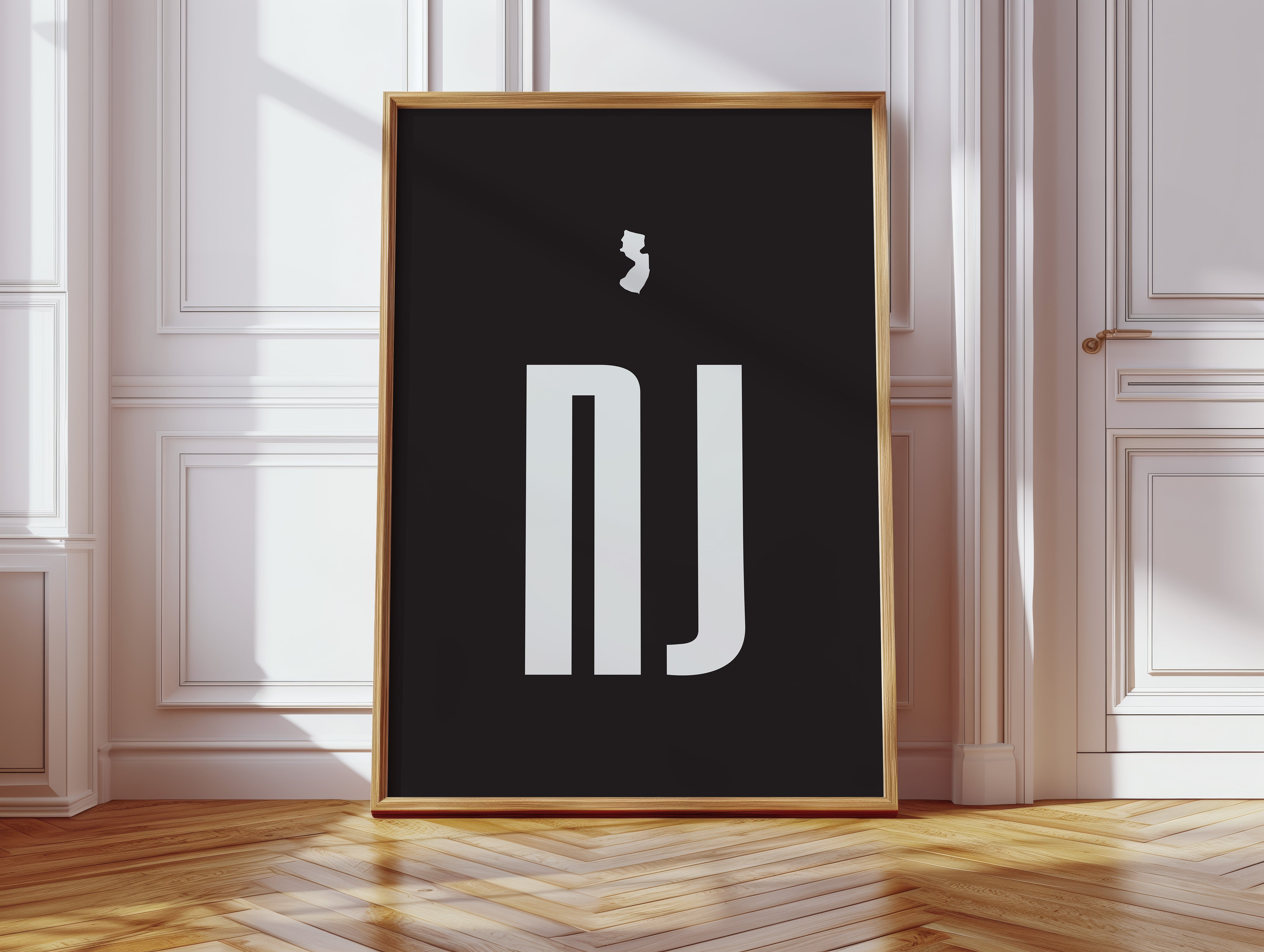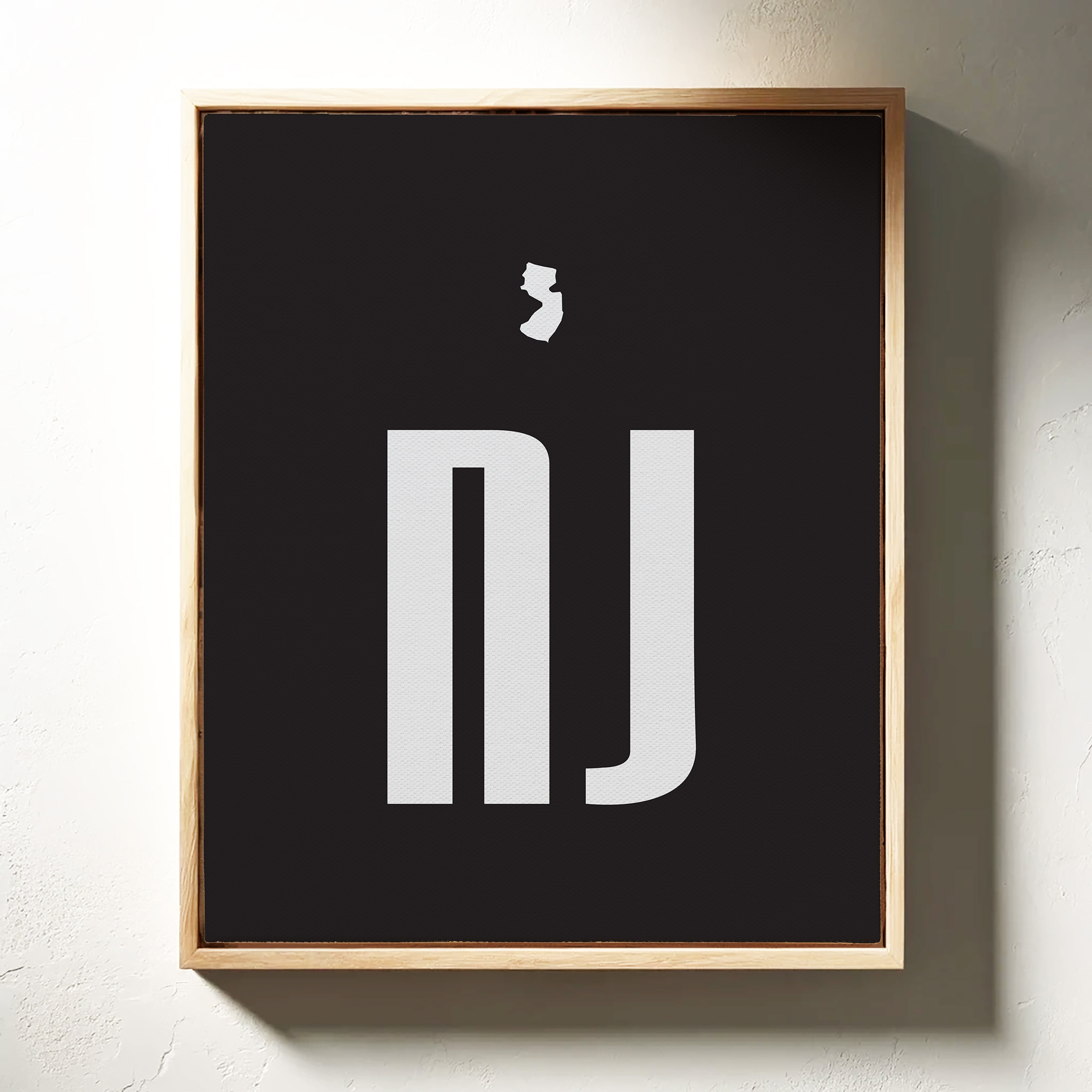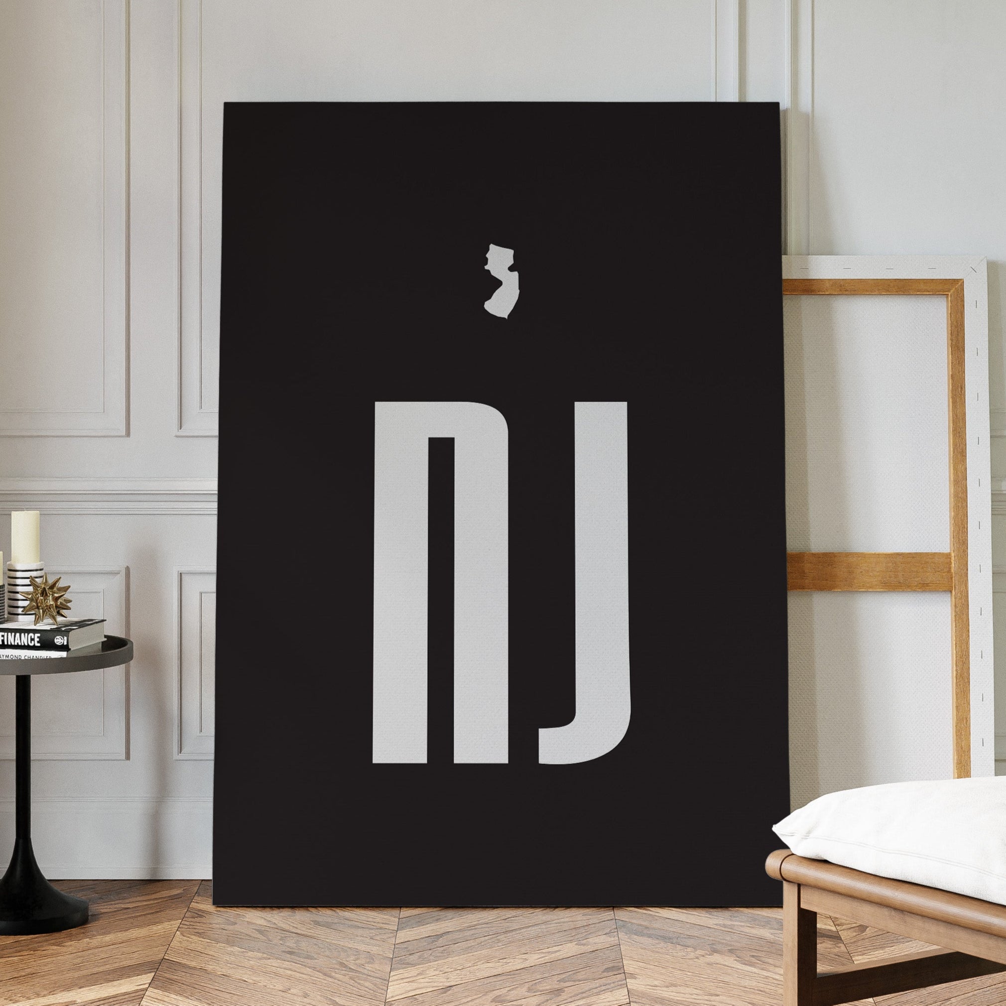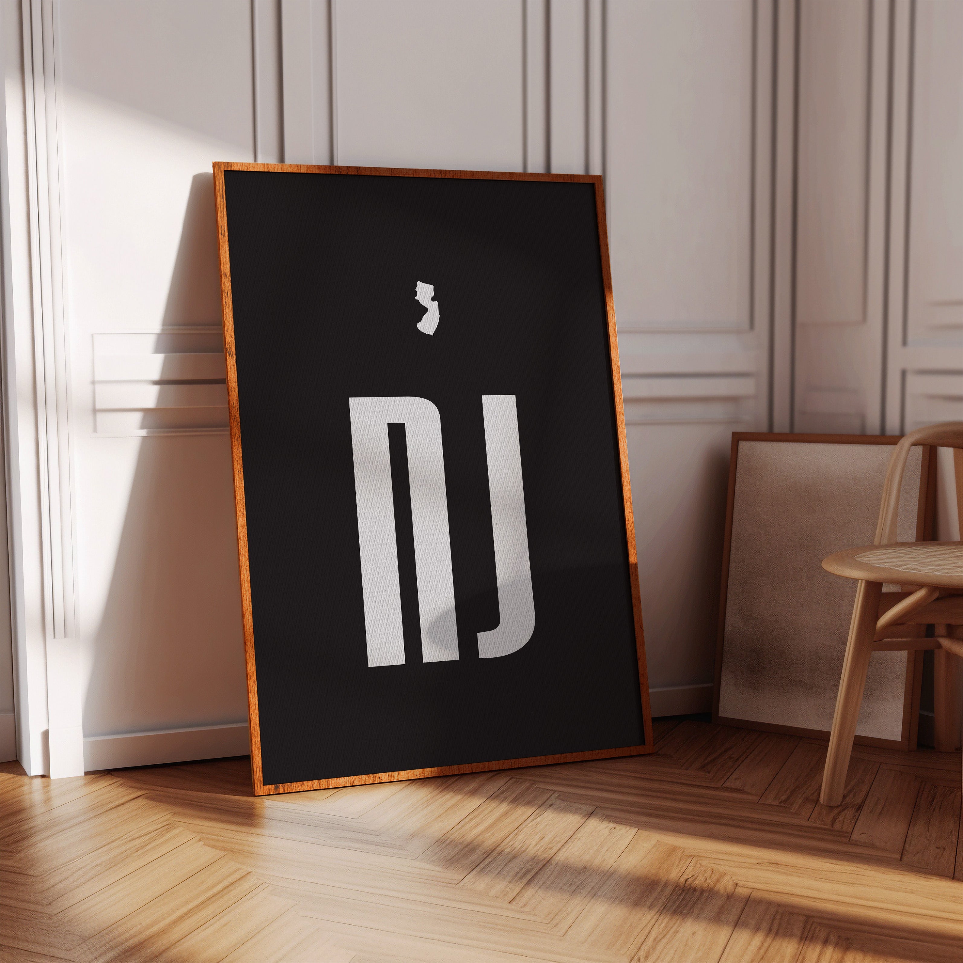 Clean lines cut through darkness, forming a bold typographic statement of New Jersey's iconic abbreviation. The state's silhouette hovers above like a crown, creating a powerful geometric dialogue in stark black and white. The minimalist composition speaks volumes through negative space, letting the simple forms command attention with quiet confidence. This striking piece makes a sophisticated statement in modern office spaces, creative studios, or any space celebrating state pride with contemporary design sensibilities.
