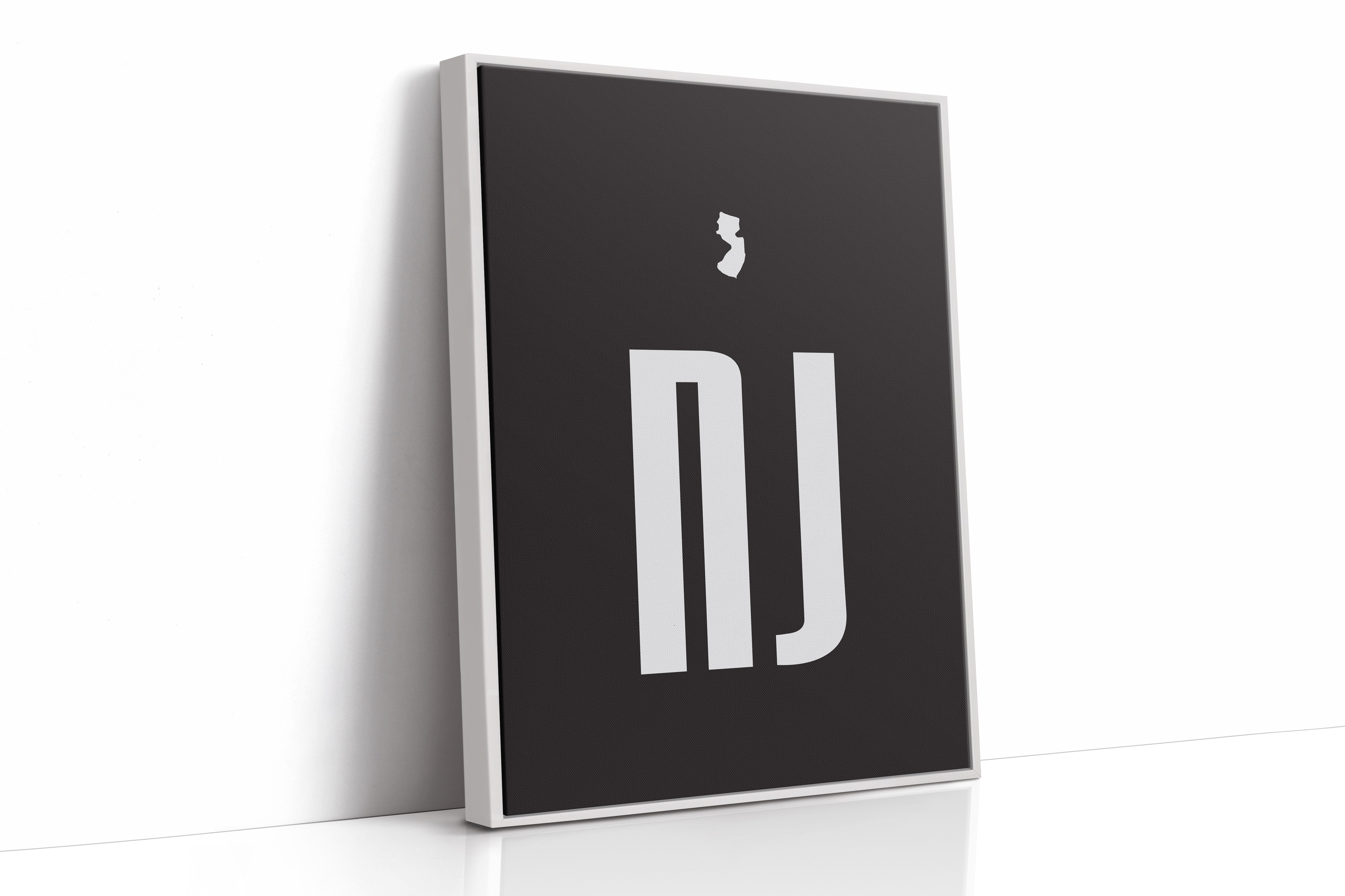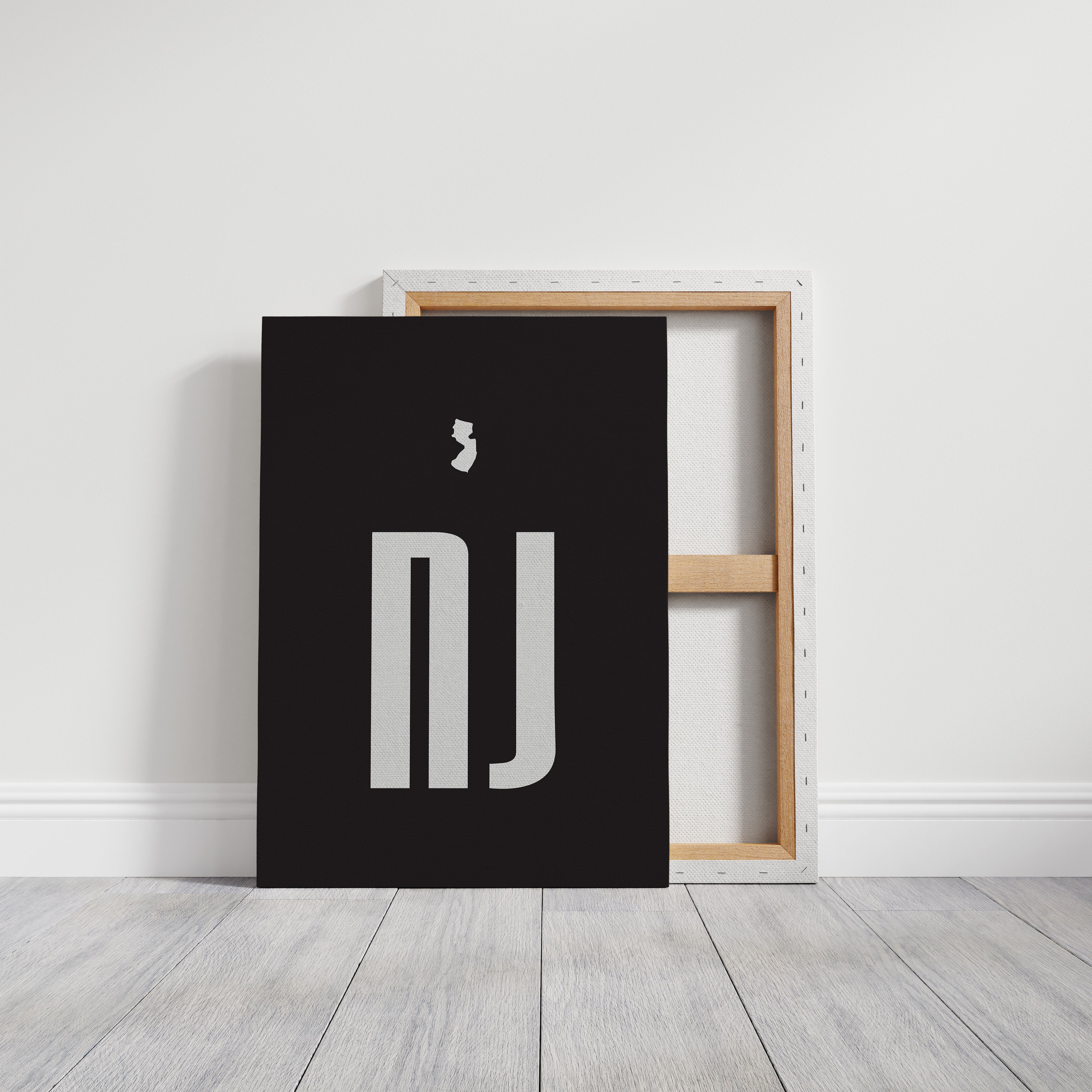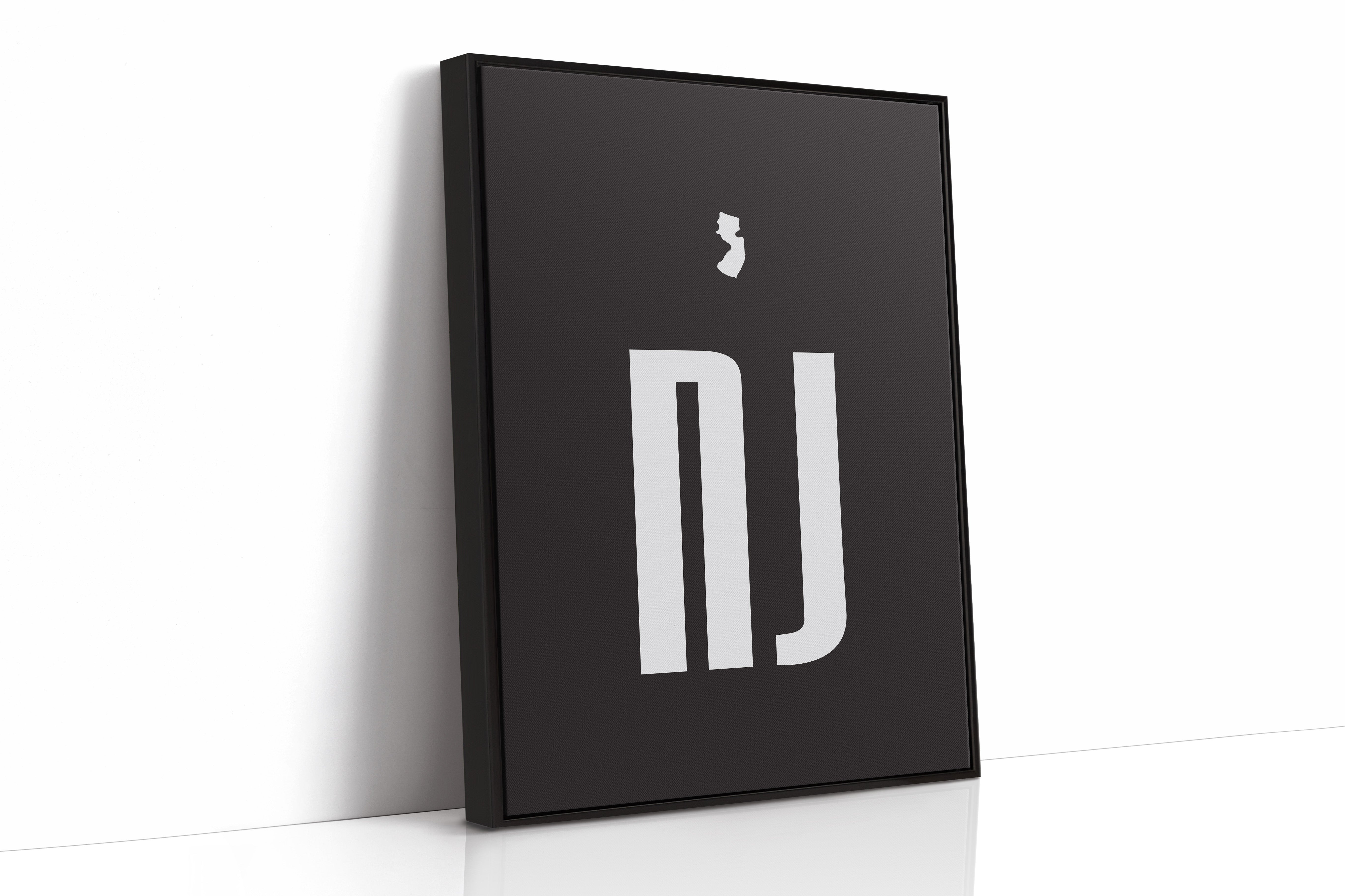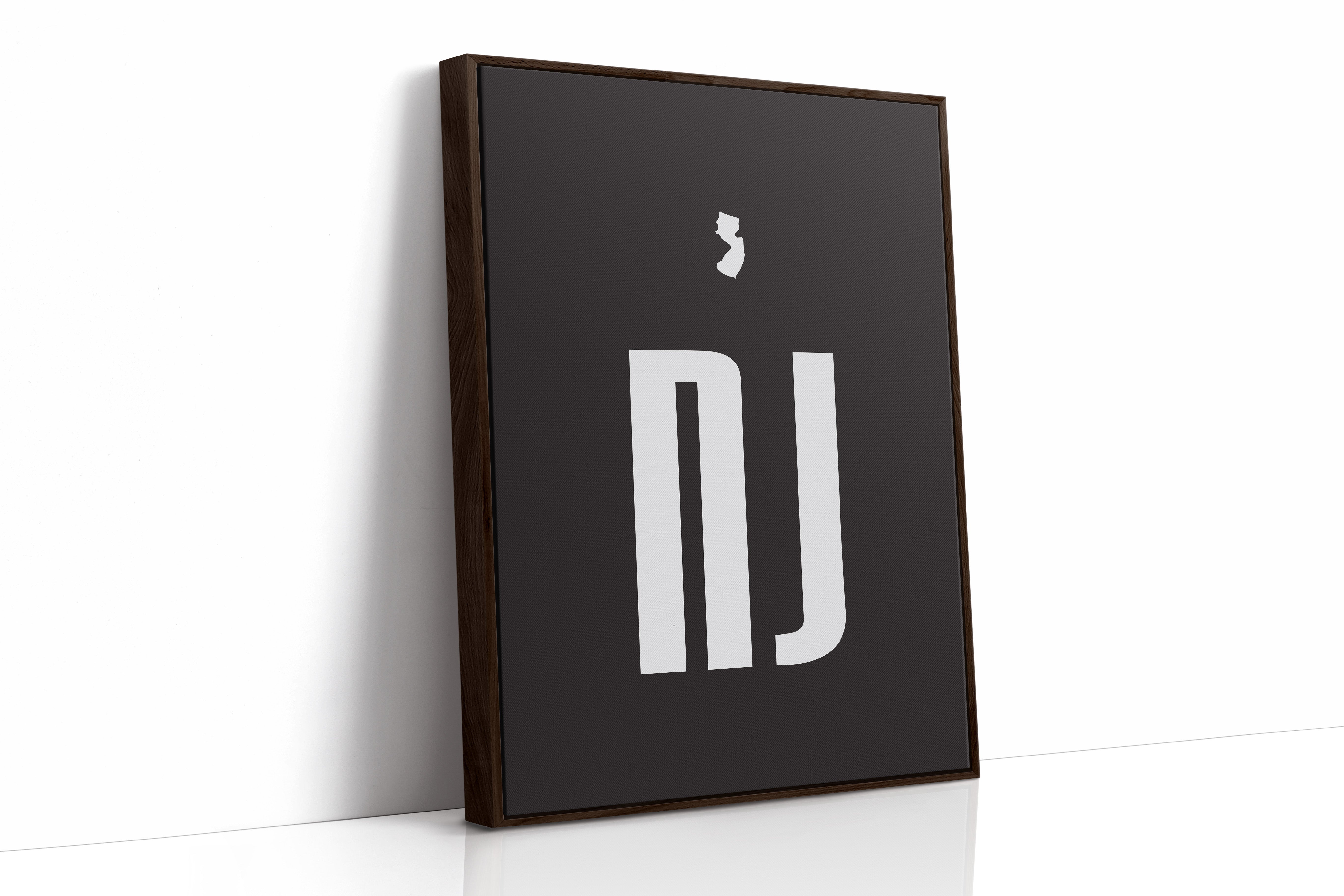 Clean lines cut through darkness, forming a bold typographic statement of New Jersey's iconic abbreviation. The state's silhouette hovers above like a crown, creating a powerful geometric dialogue in stark black and white. The minimalist composition speaks volumes through negative space, letting the simple forms command attention with quiet confidence. This striking piece makes a sophisticated statement in modern office spaces, creative studios, or any space celebrating state pride with contemporary design sensibilities.