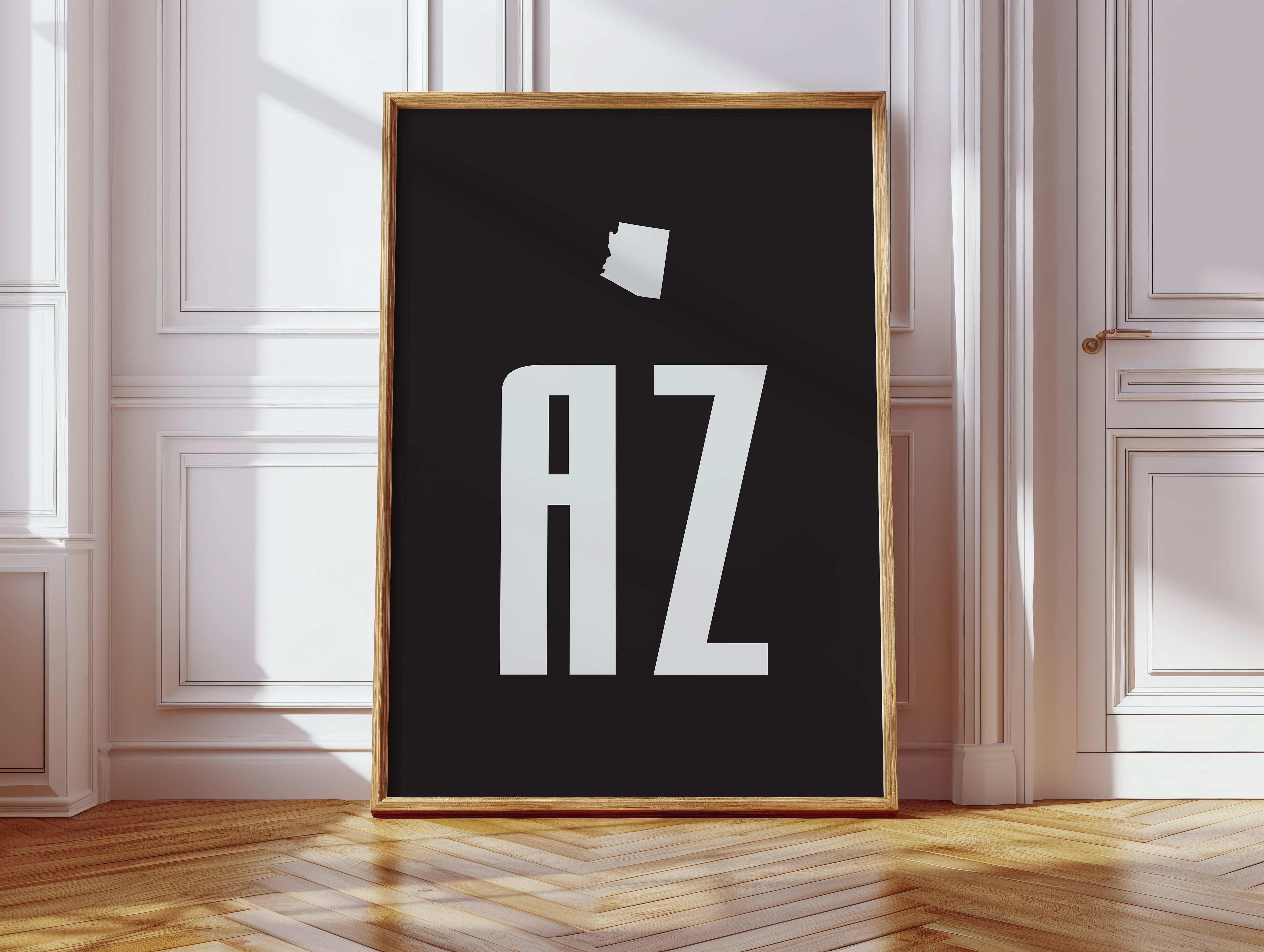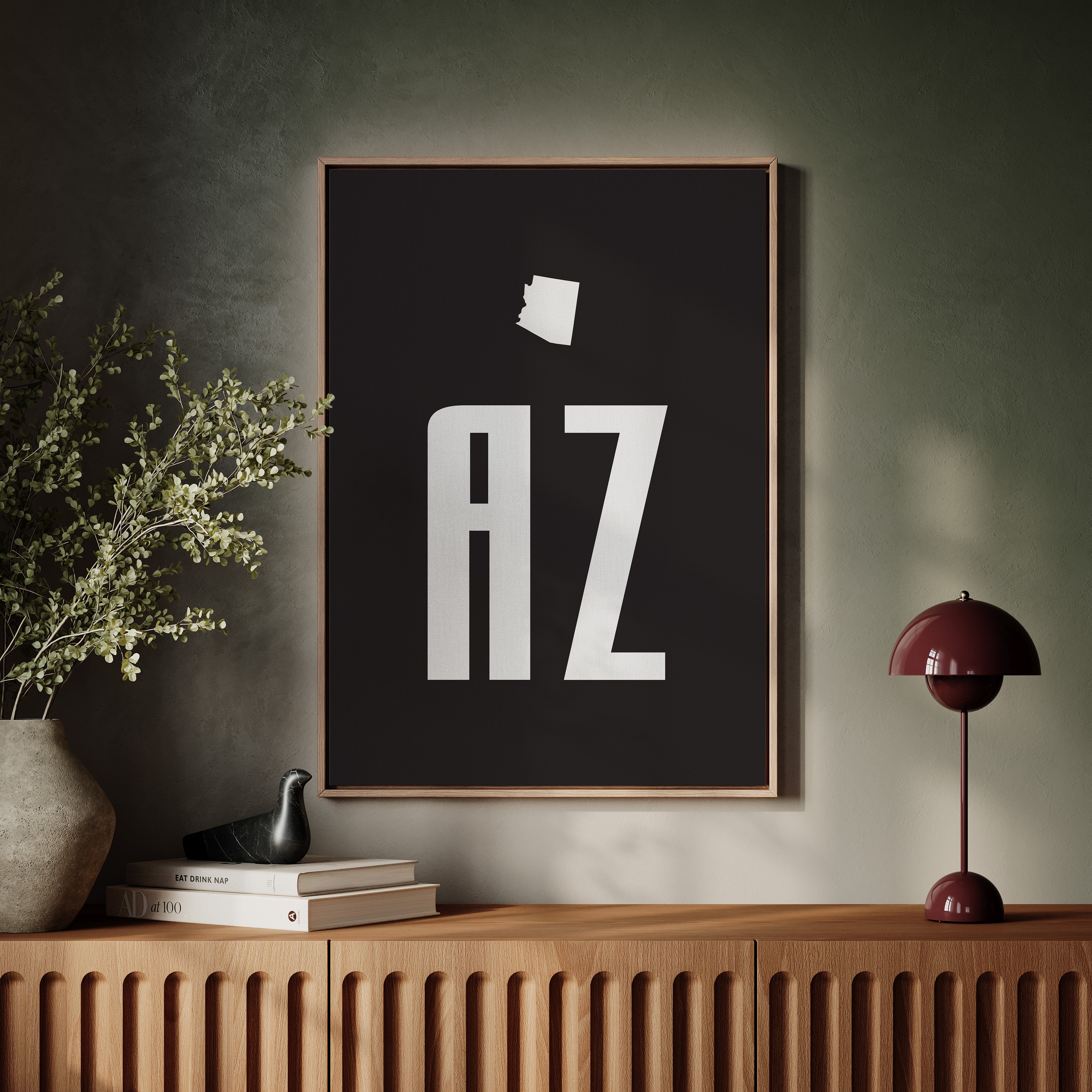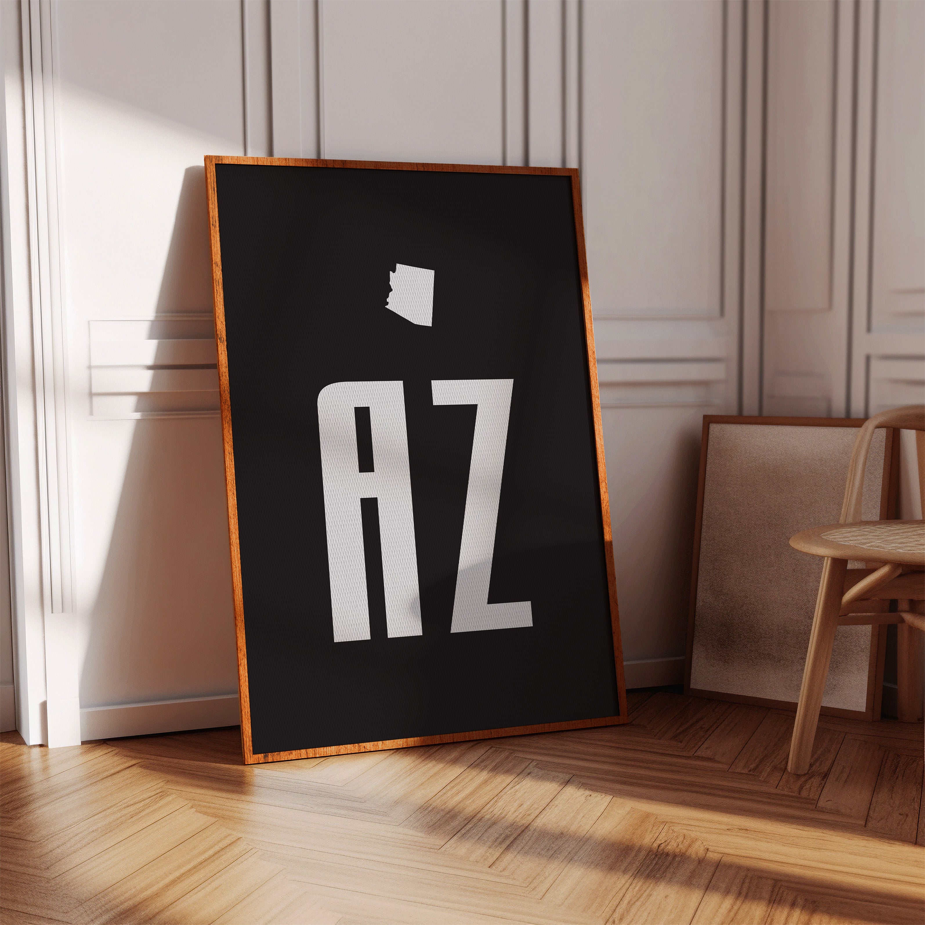 Clean lines cut through darkness, forming a bold ""AZ"" that stands like a monument against the night. The striking contrast between pure white typography and deep black background creates a powerful visual statement, while Arizona's silhouette floats above like a crown. The minimalist design speaks volumes through negative space, celebrating the state's identity with architectural precision and contemporary elegance. This piece commands attention in modern spaces, perfect for an office, studio, or any room seeking sophisticated geometric impact.