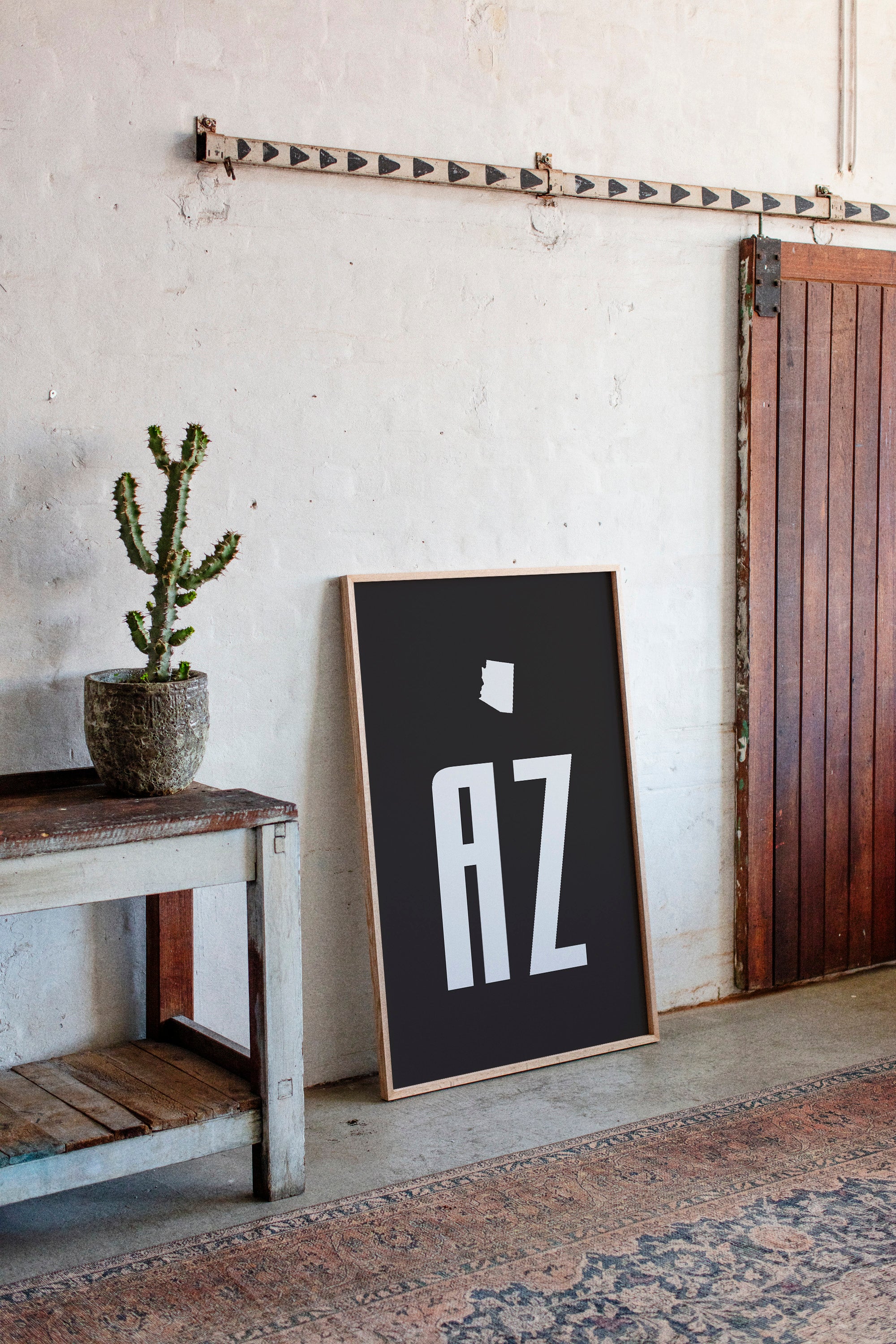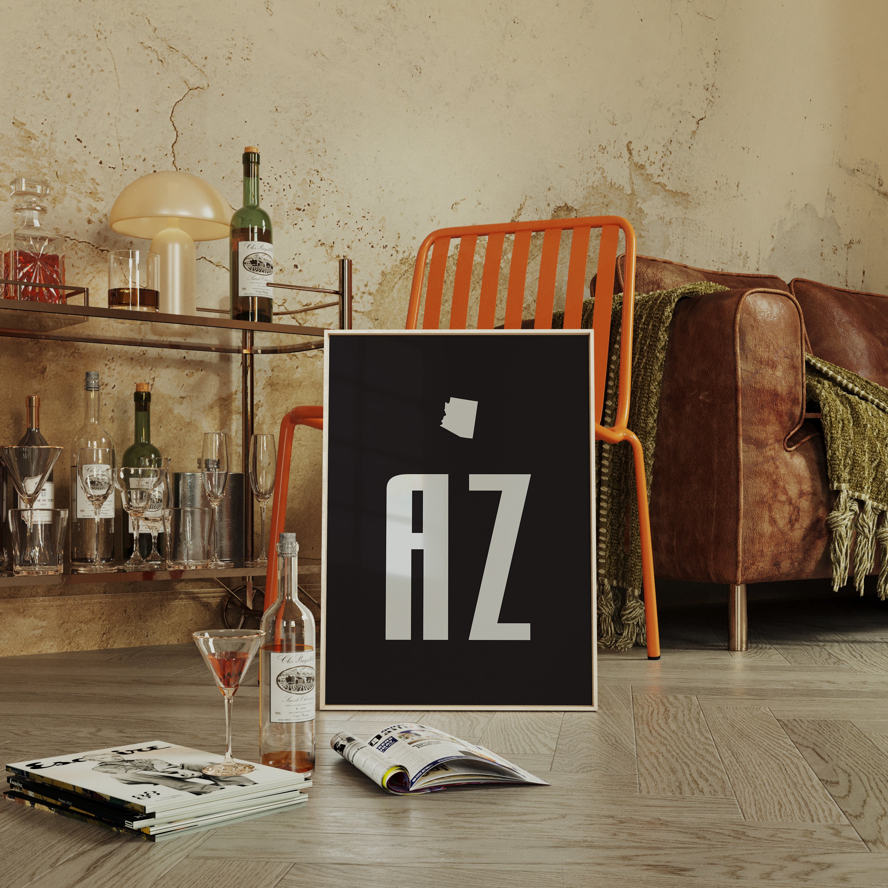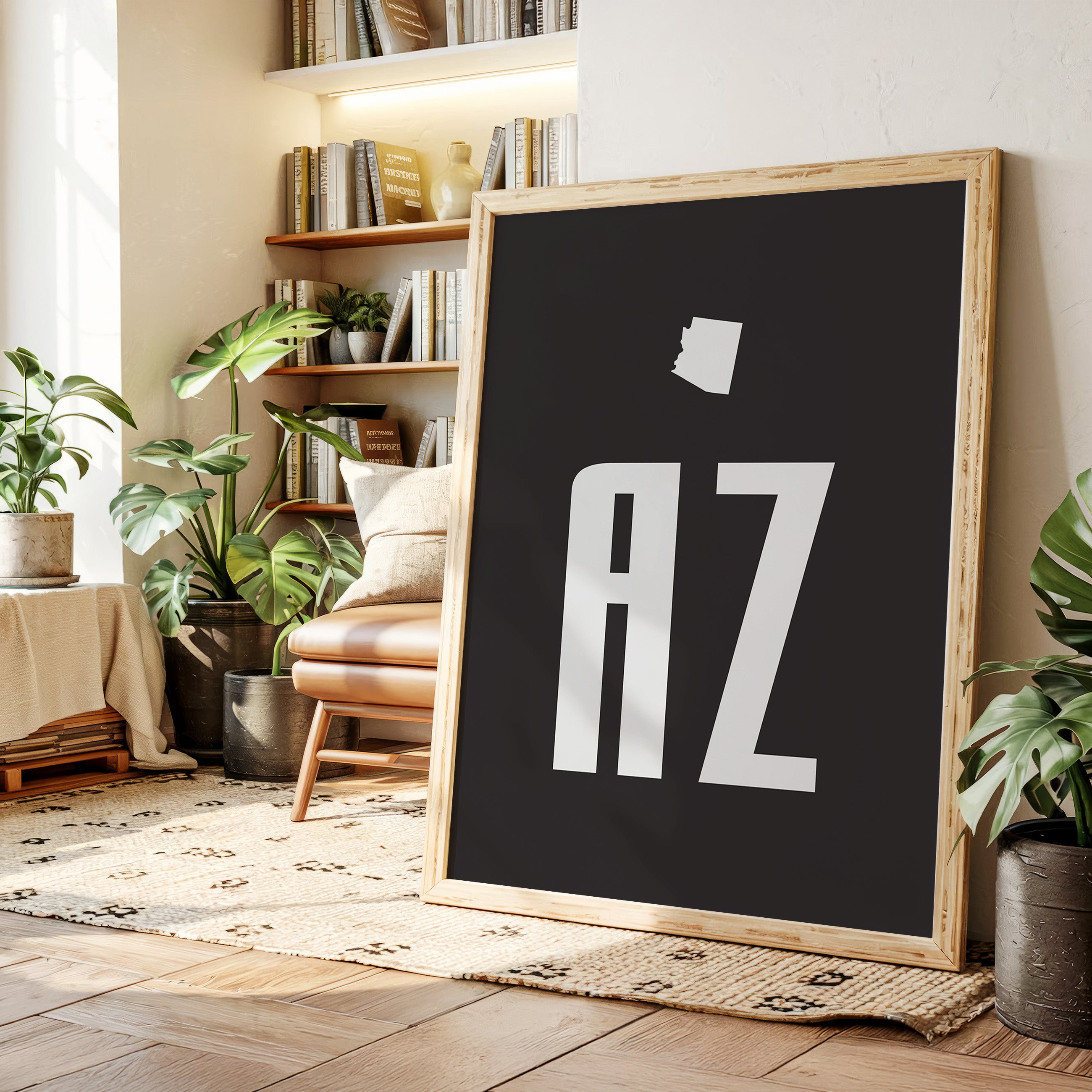 Clean lines cut through darkness, forming a bold ""AZ"" that stands like a monument against the night. The striking contrast between pure white typography and deep black background creates a powerful visual statement, while Arizona's silhouette floats above like a crown. The minimalist design speaks volumes through negative space, celebrating the state's identity with architectural precision and contemporary elegance. This piece commands attention in modern spaces, perfect for an office, studio, or any room seeking sophisticated geometric impact.