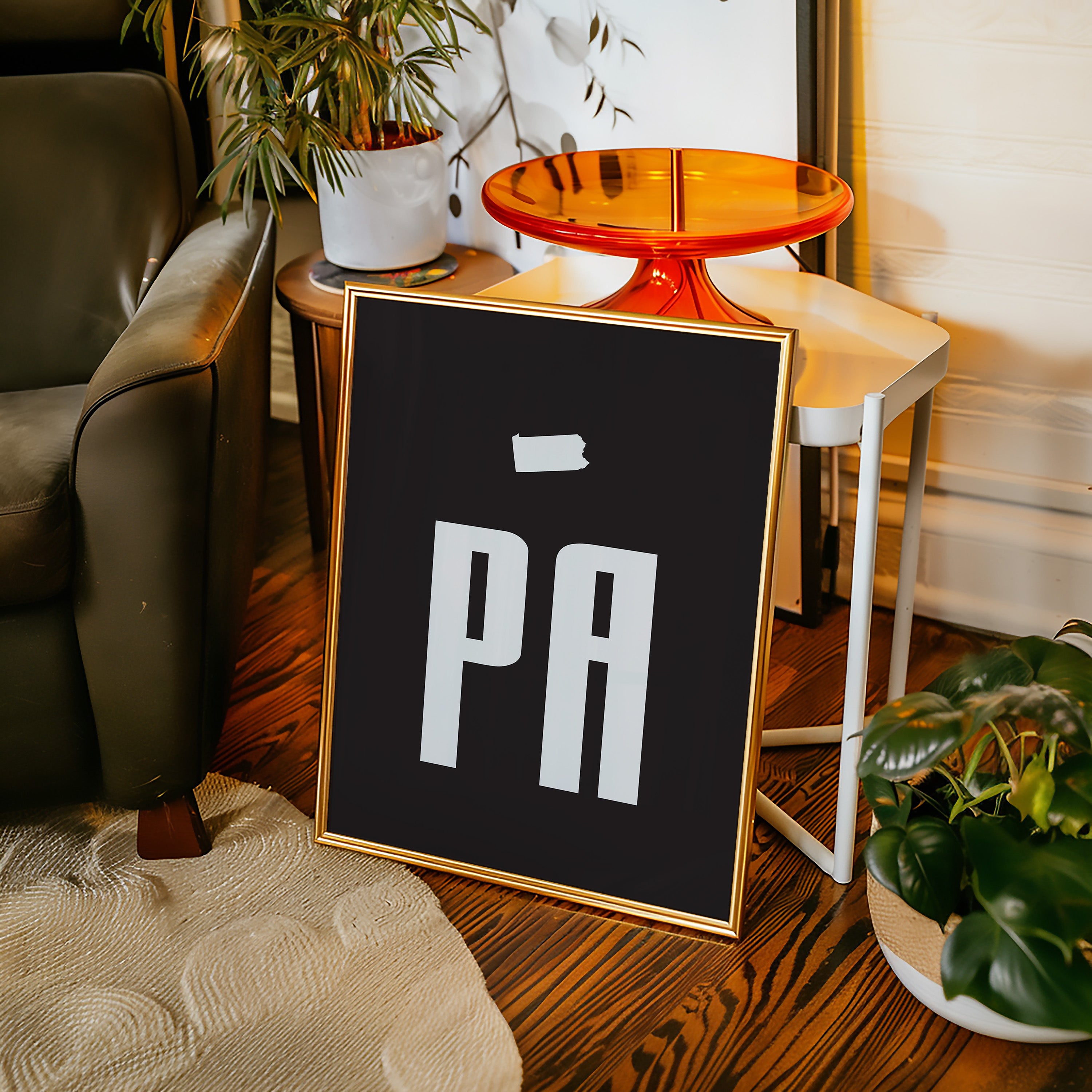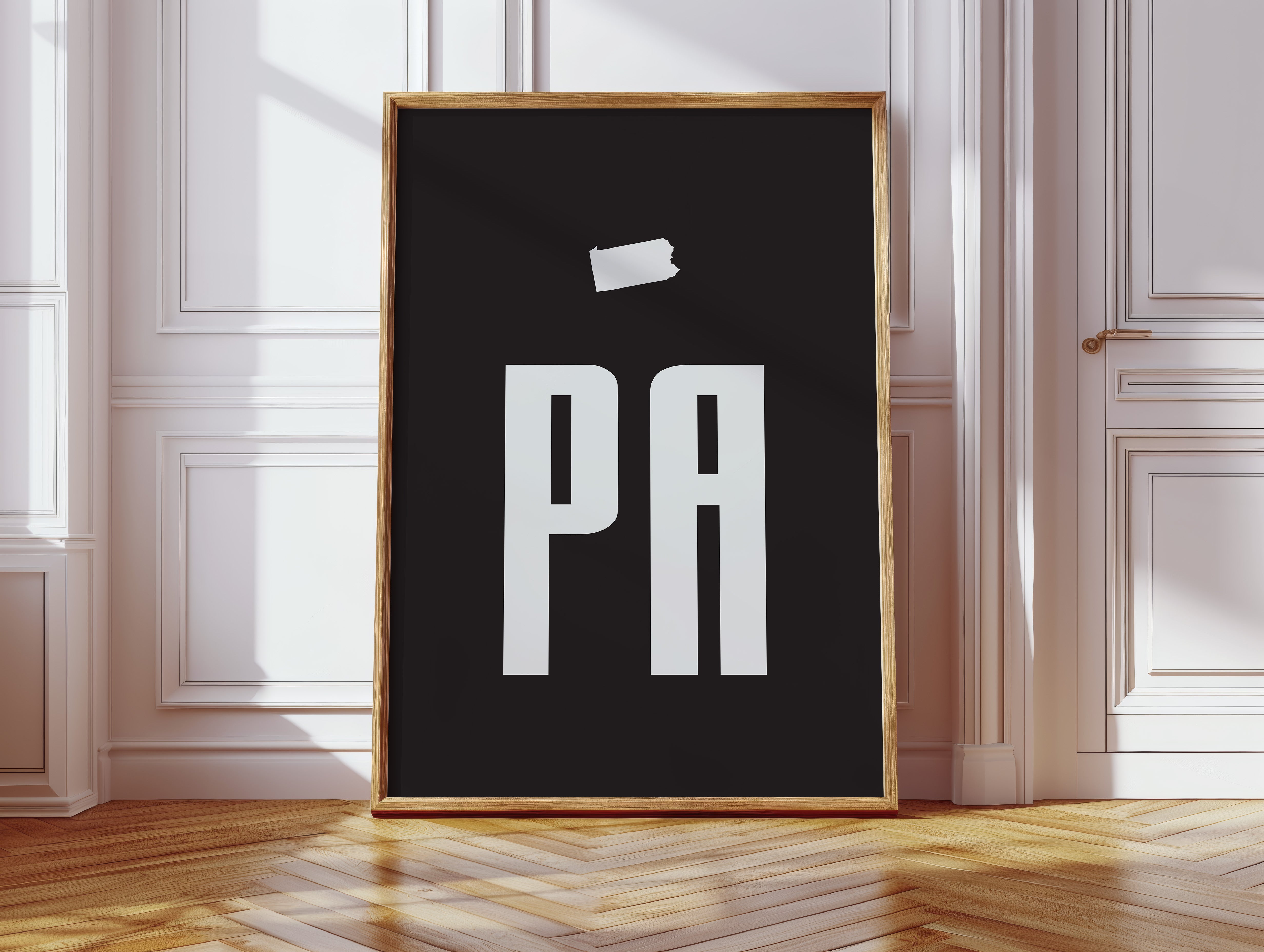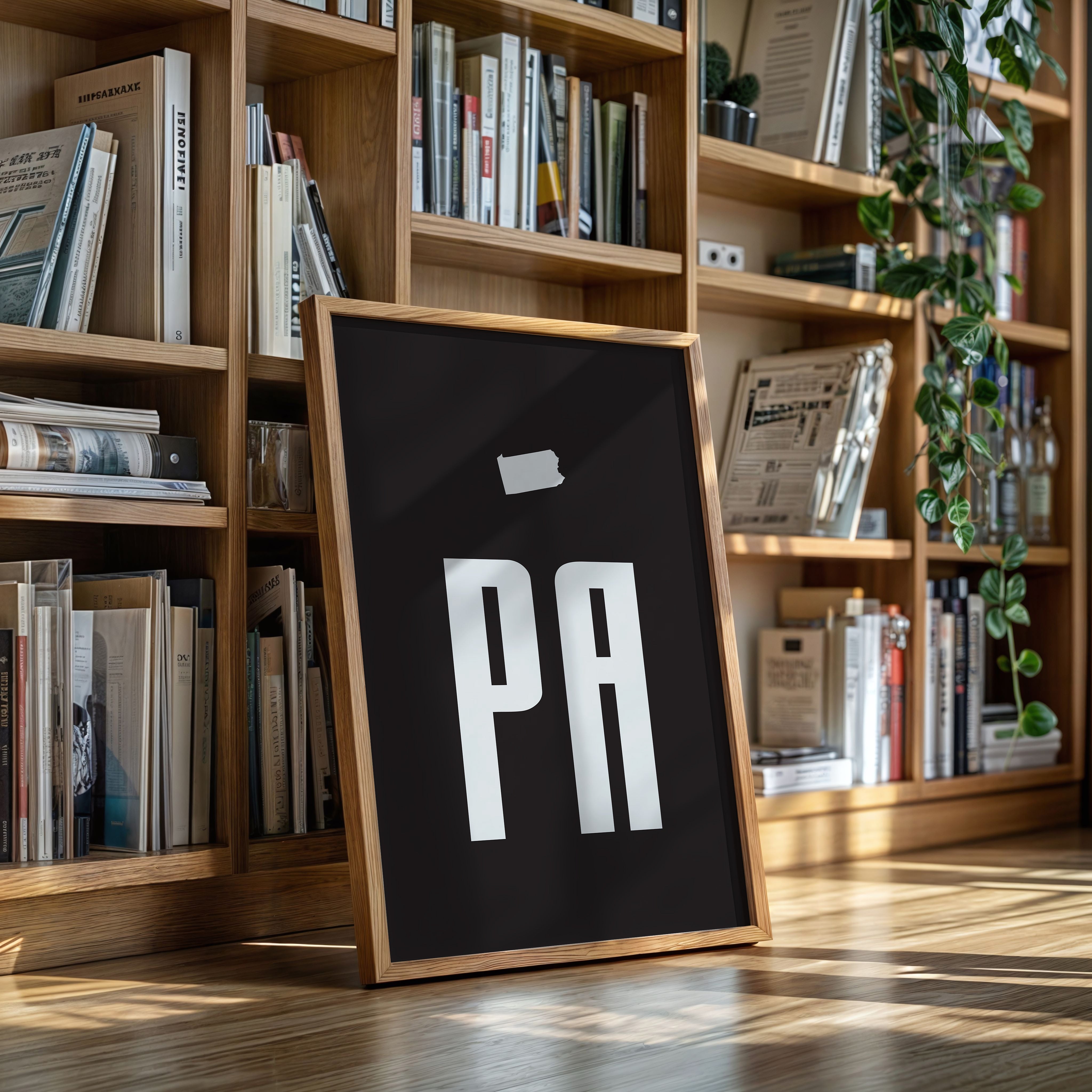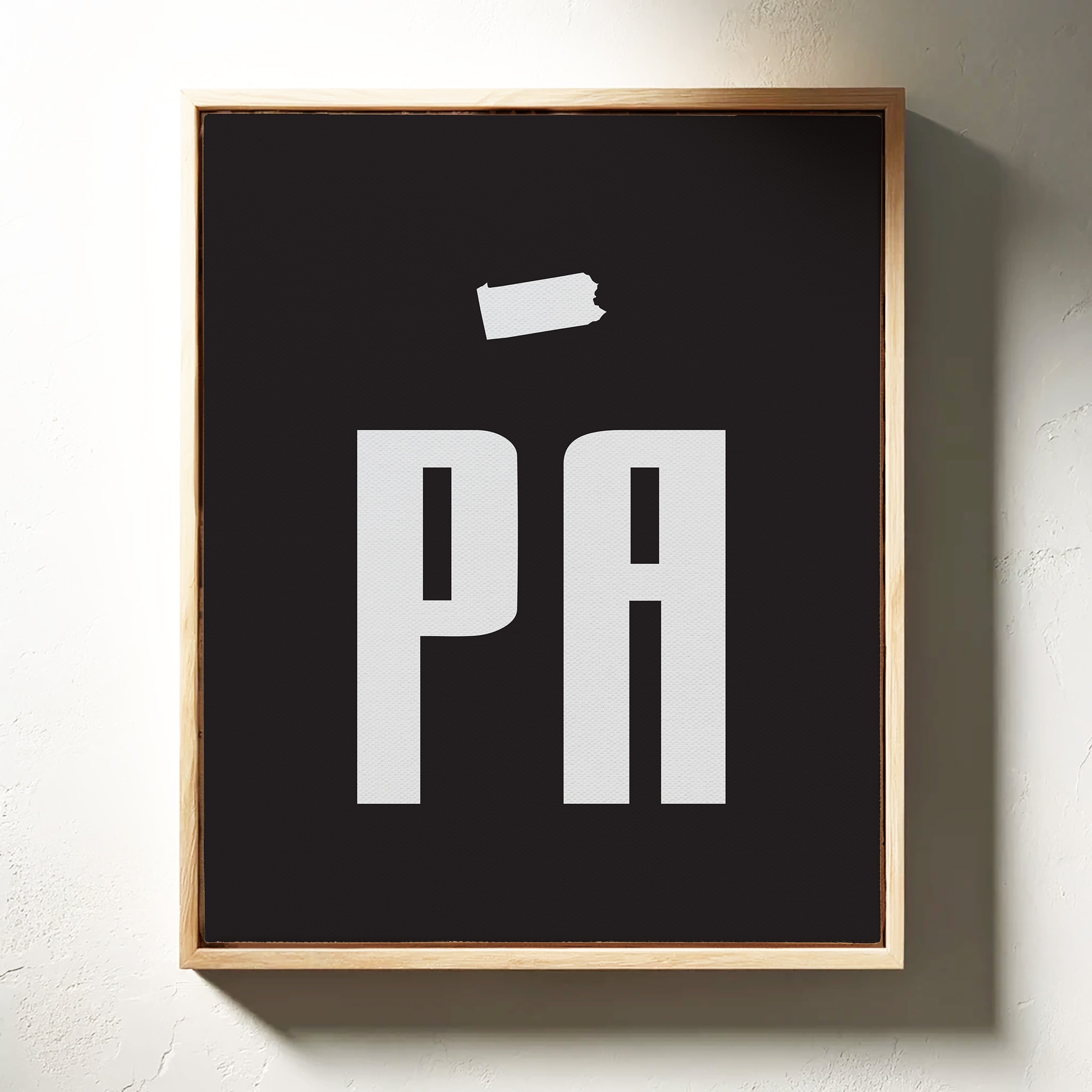 Bold white shapes emerge from deep darkness, creating a striking typographic statement of ""PA"" with Pennsylvania's silhouette floating above. The minimalist design speaks volumes through negative space, where absence becomes presence. Clean lines and geometric precision blend with subtle architectural references, suggesting both modern design sensibility and historical significance. This piece would make a powerful statement in a modern office space or creative studio, where its stark contrast and geographic identity can spark conversation.