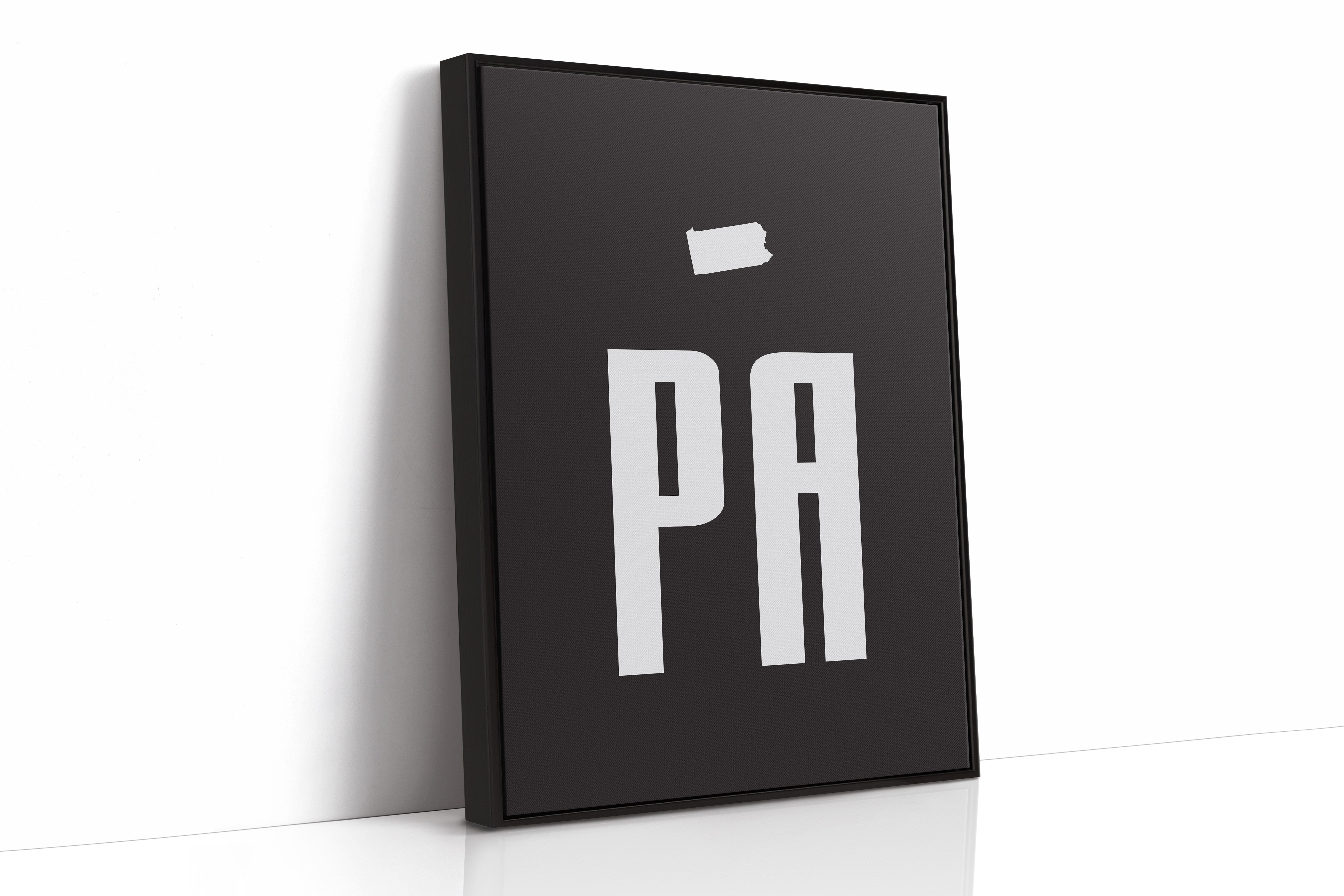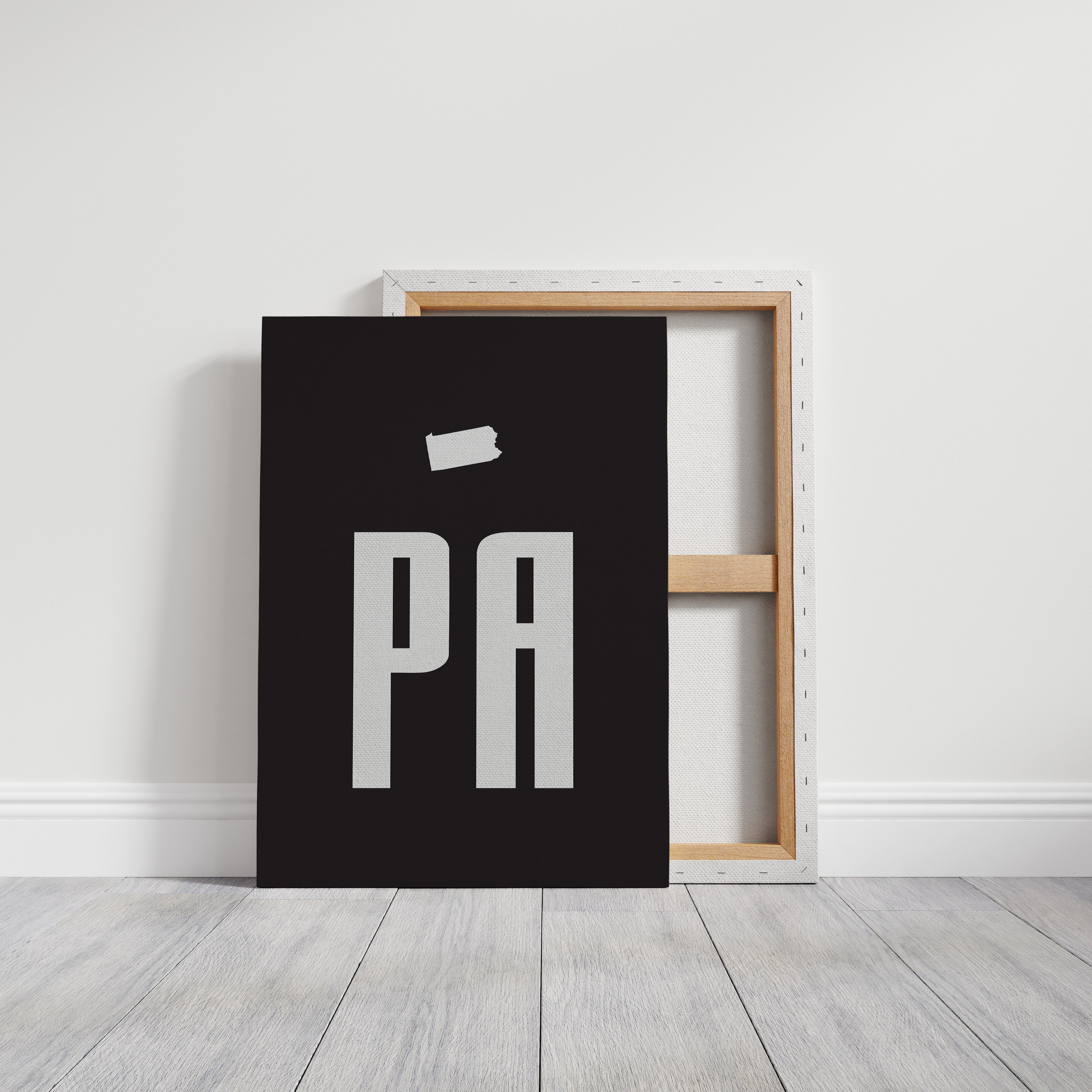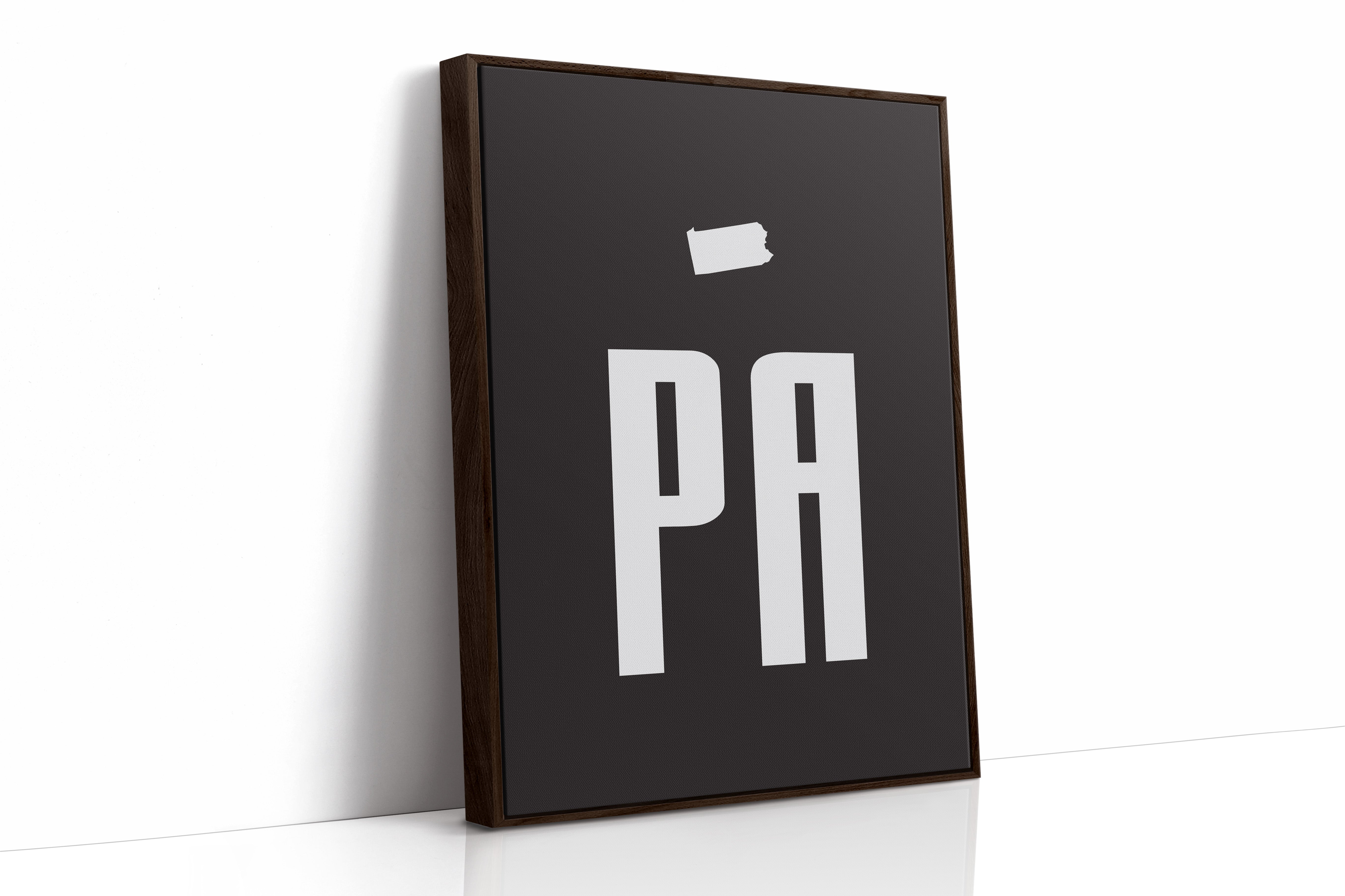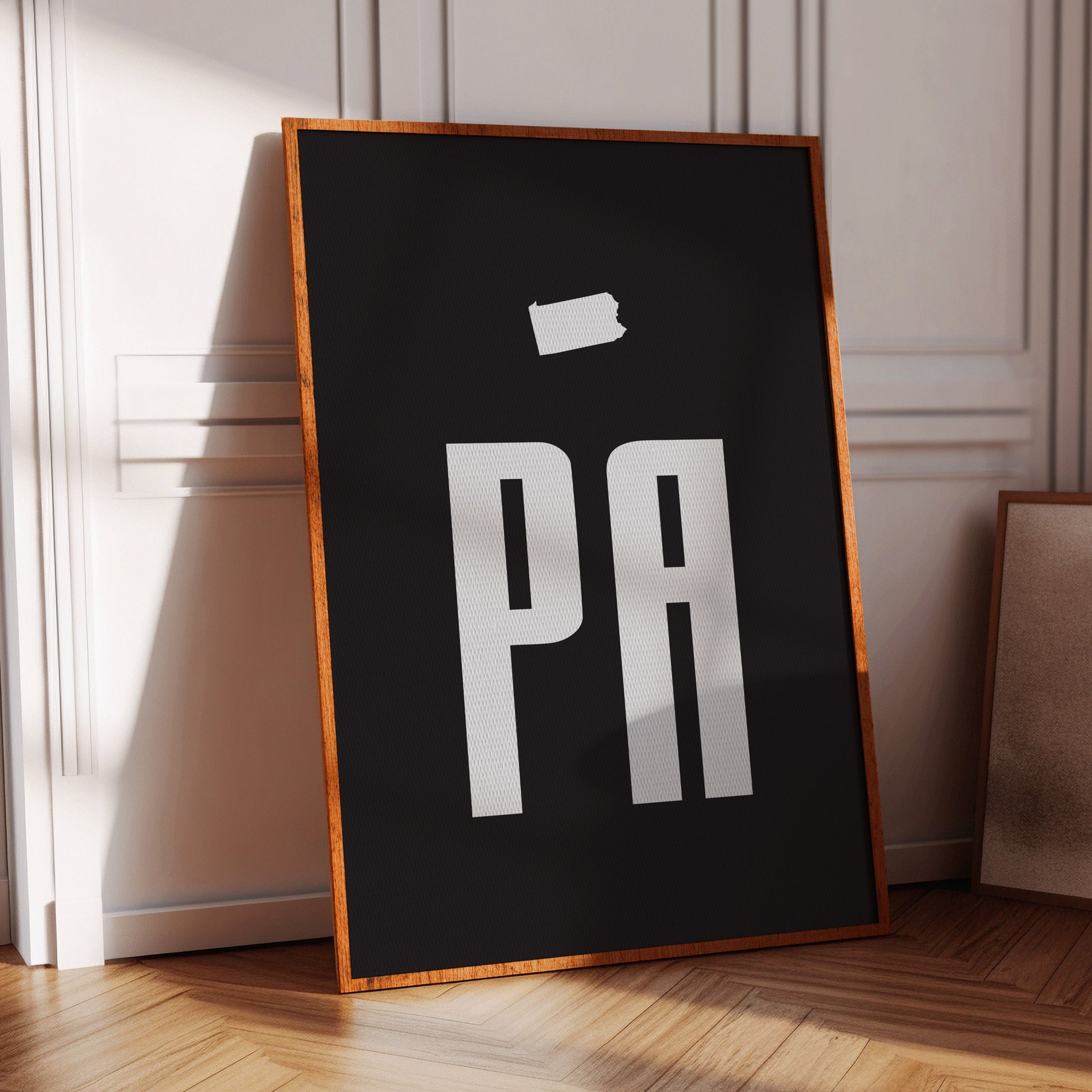 Bold white shapes emerge from deep darkness, creating a striking typographic statement of ""PA"" with Pennsylvania's silhouette floating above. The minimalist design speaks volumes through negative space, where absence becomes presence. Clean lines and geometric precision blend with subtle architectural references, suggesting both modern design sensibility and historical significance. This piece would make a powerful statement in a modern office space or creative studio, where its stark contrast and geographic identity can spark conversation.