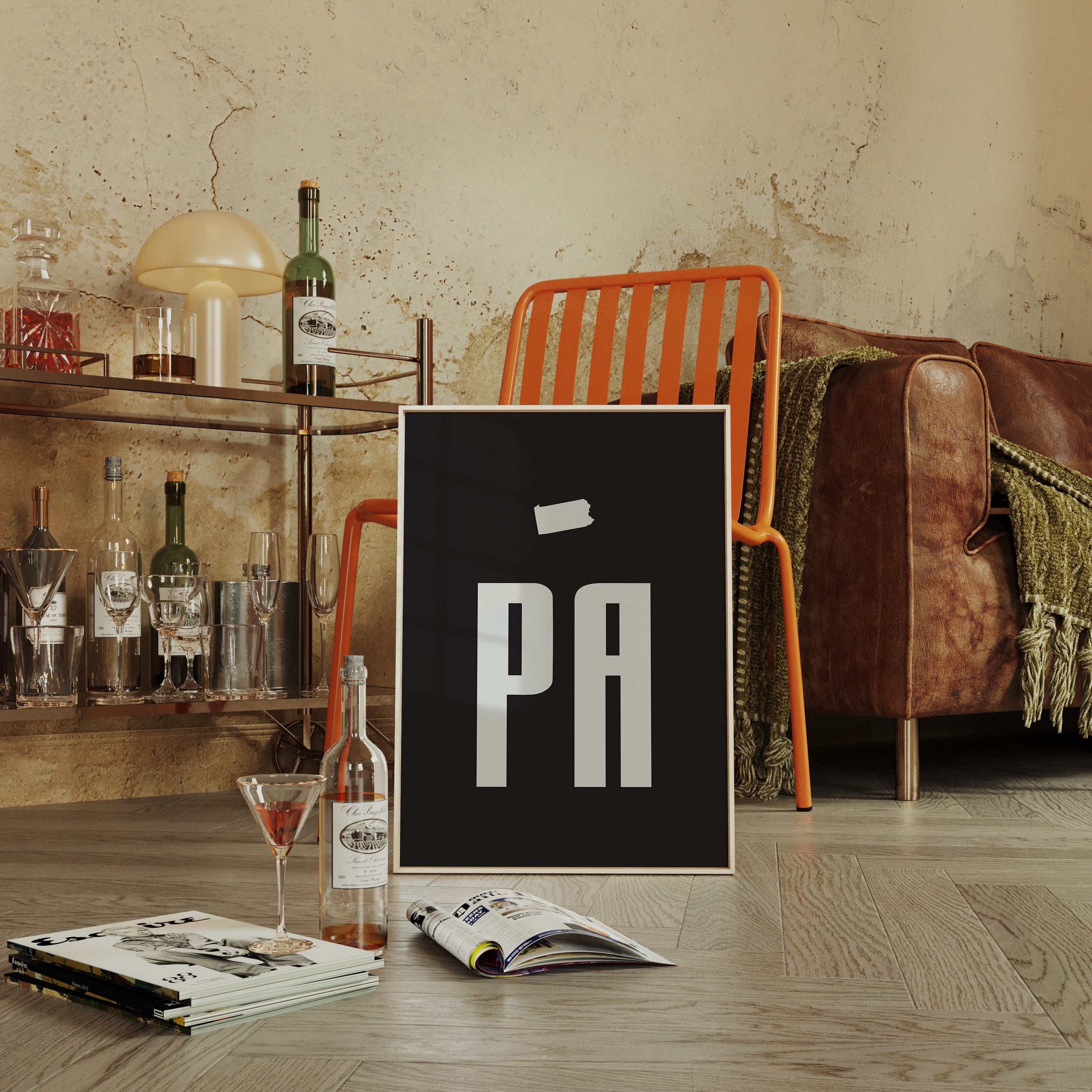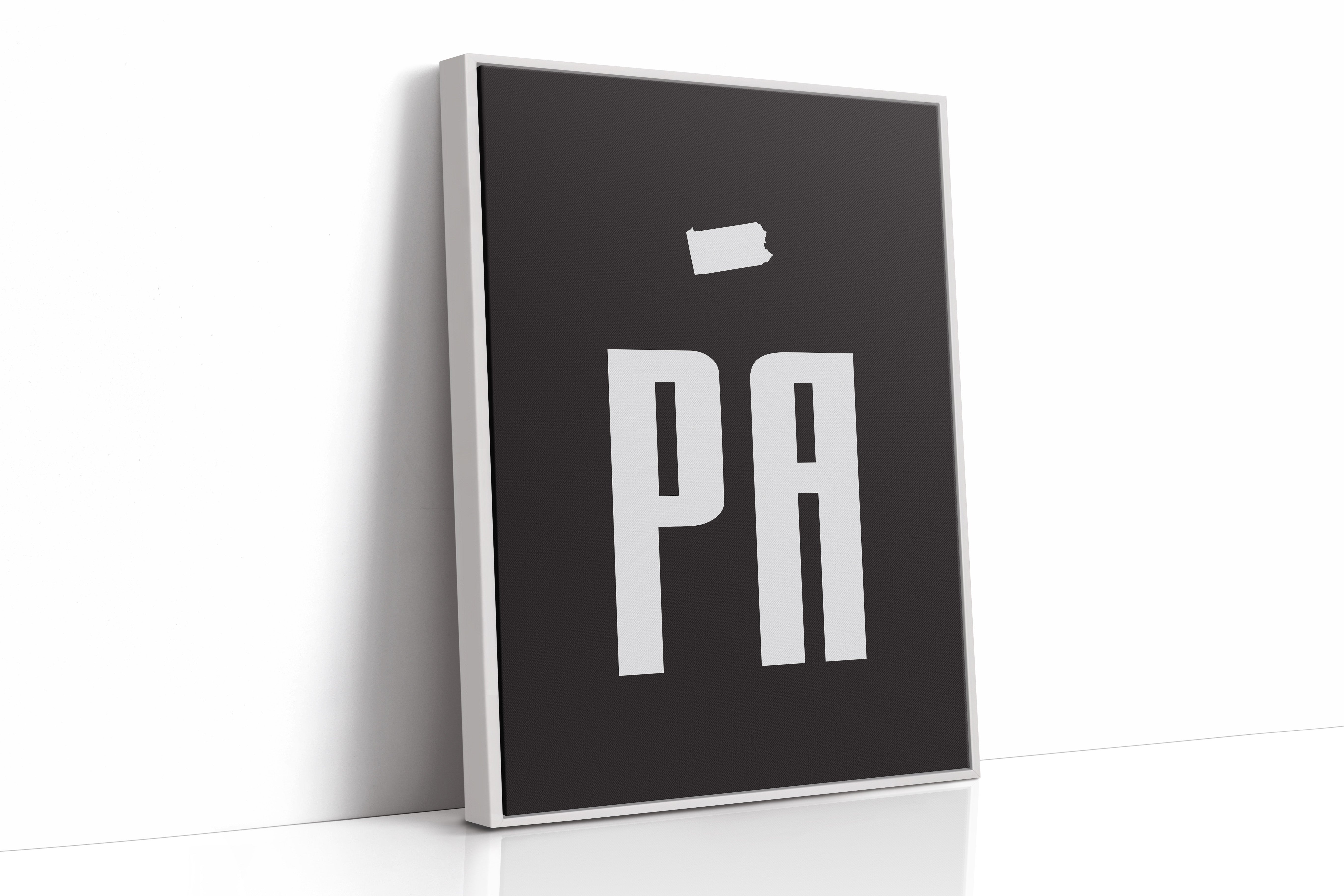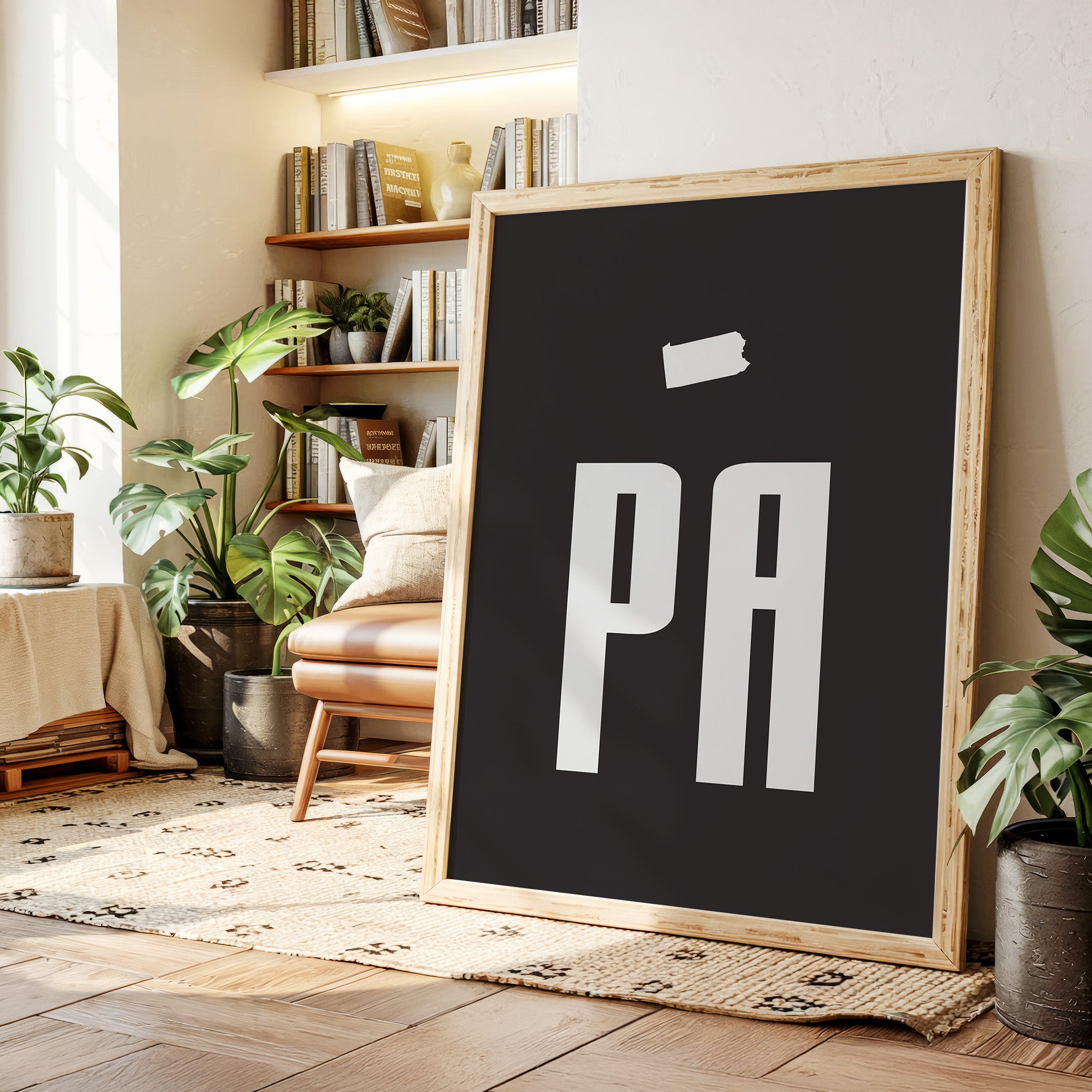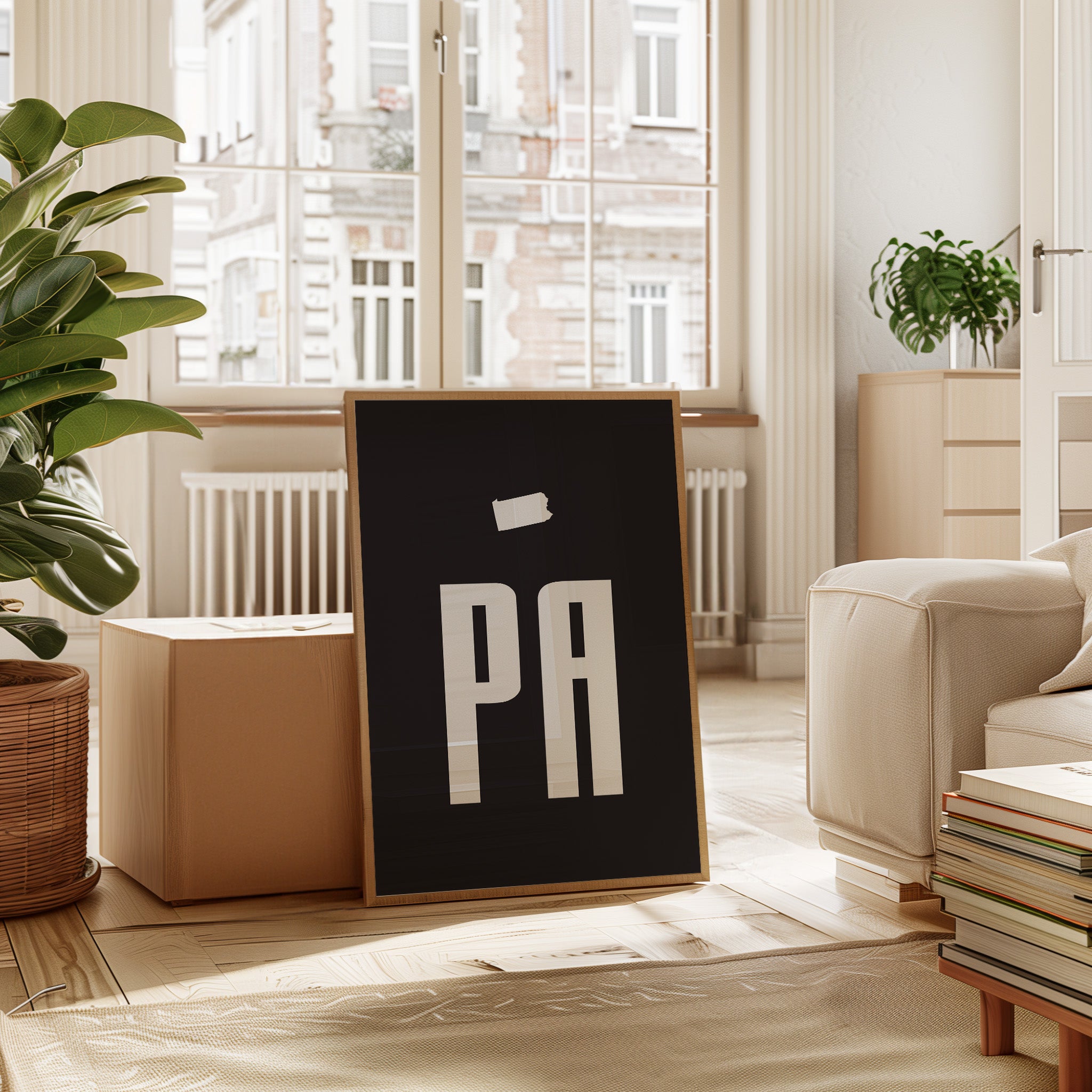Bold white shapes emerge from deep darkness, creating a striking typographic statement of ""PA"" with Pennsylvania's silhouette floating above. The minimalist design speaks volumes through negative space, where absence becomes presence. Clean lines and geometric precision blend with subtle architectural references, suggesting both modern design sensibility and historical significance. This piece would make a powerful statement in a modern office space or creative studio, where its stark contrast and geographic identity can spark conversation.