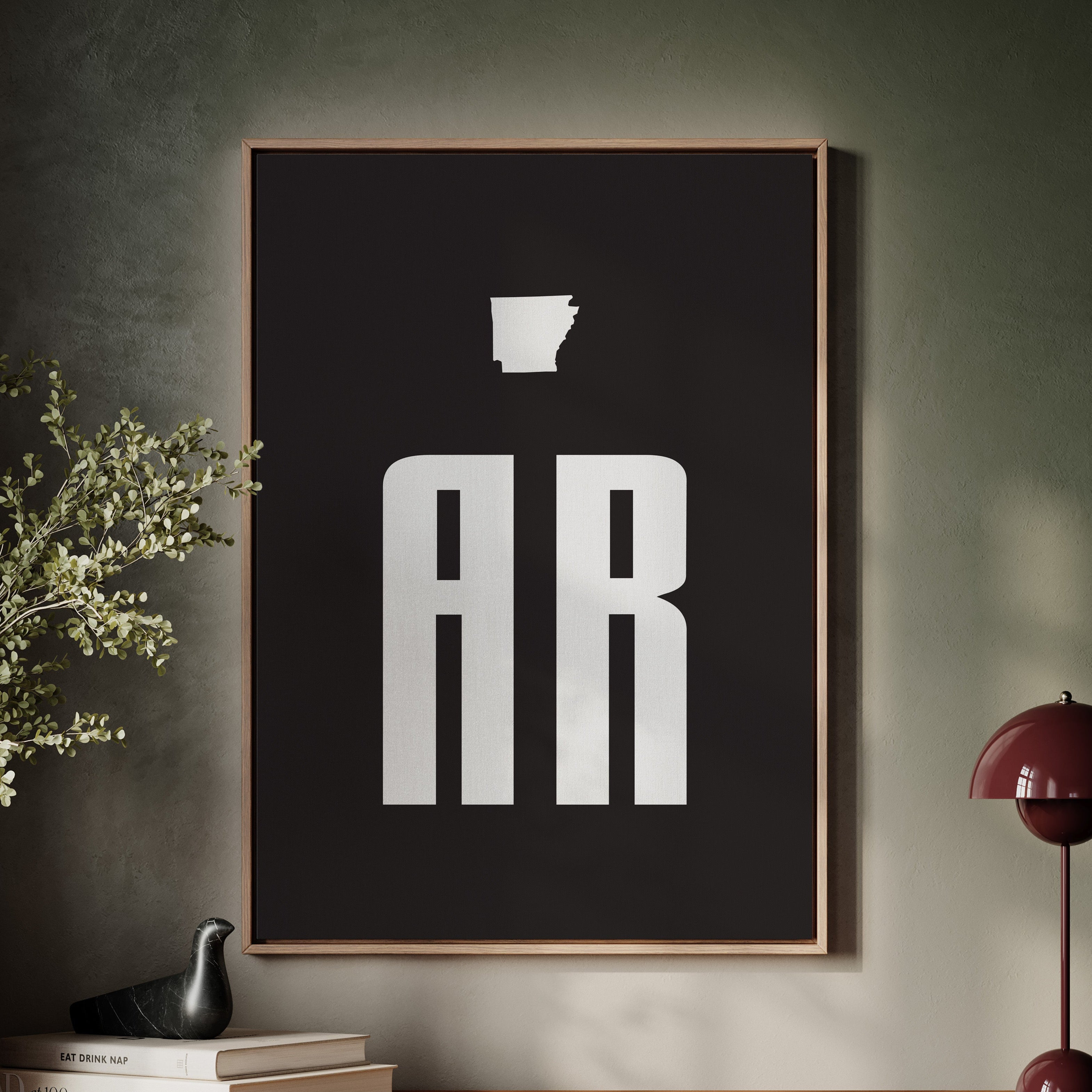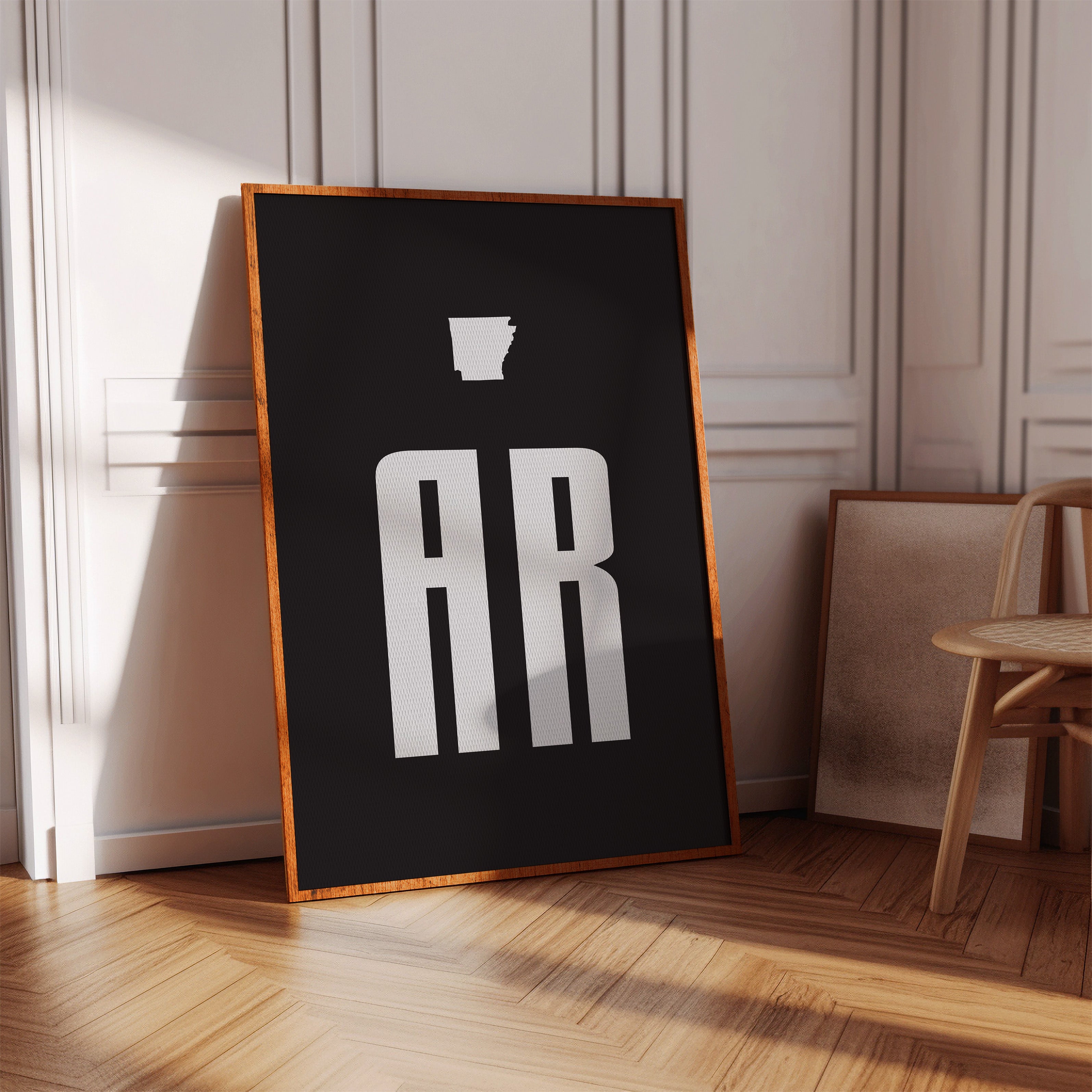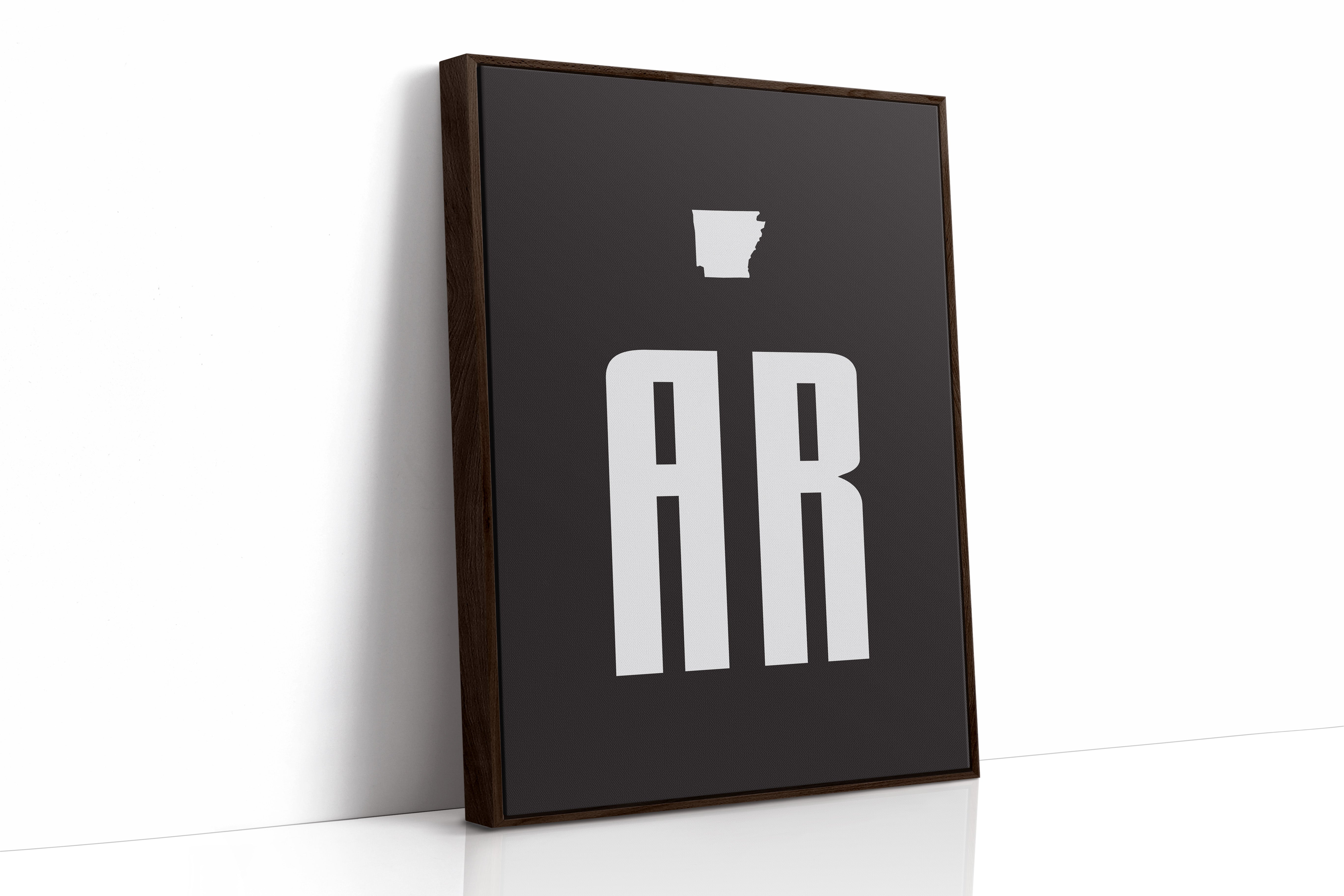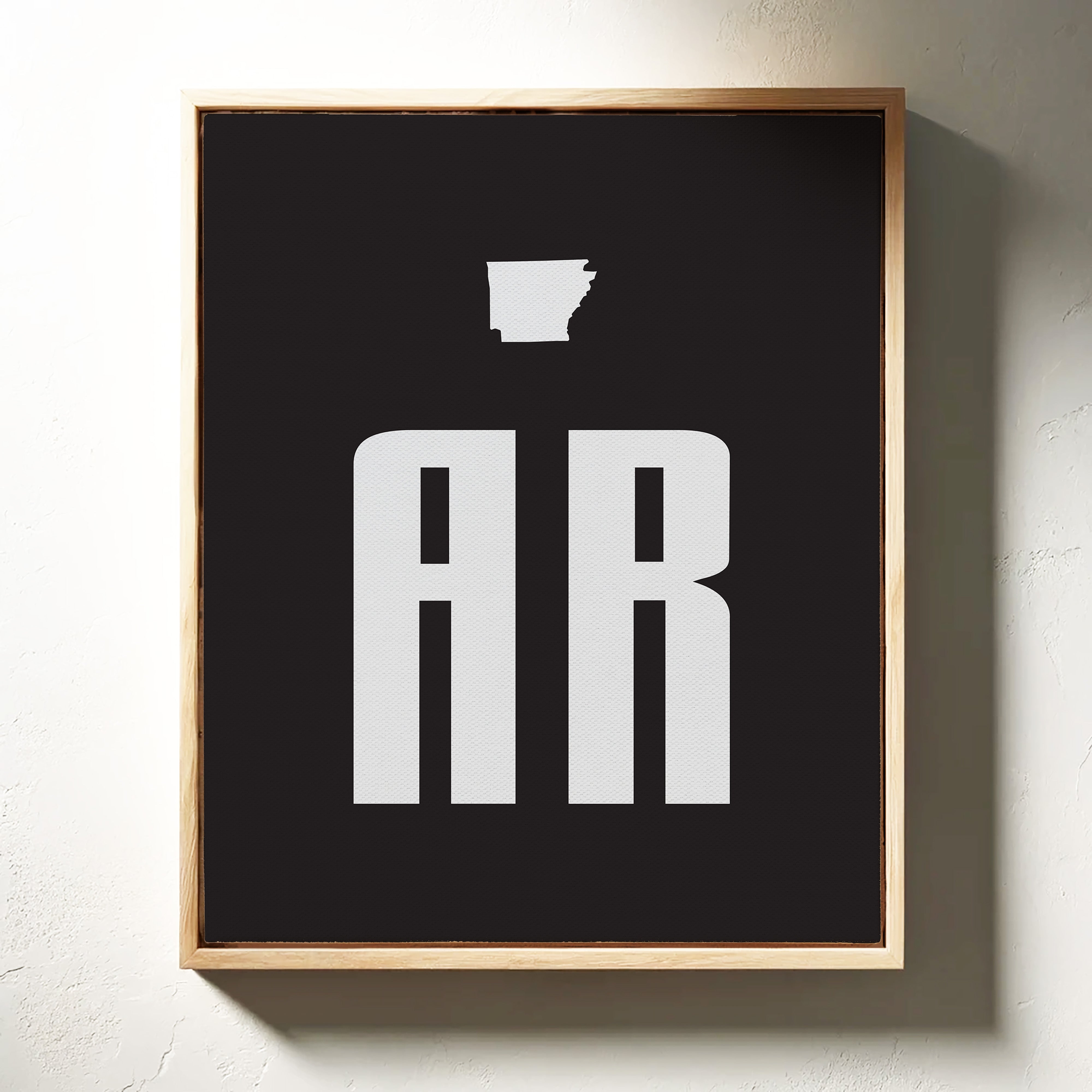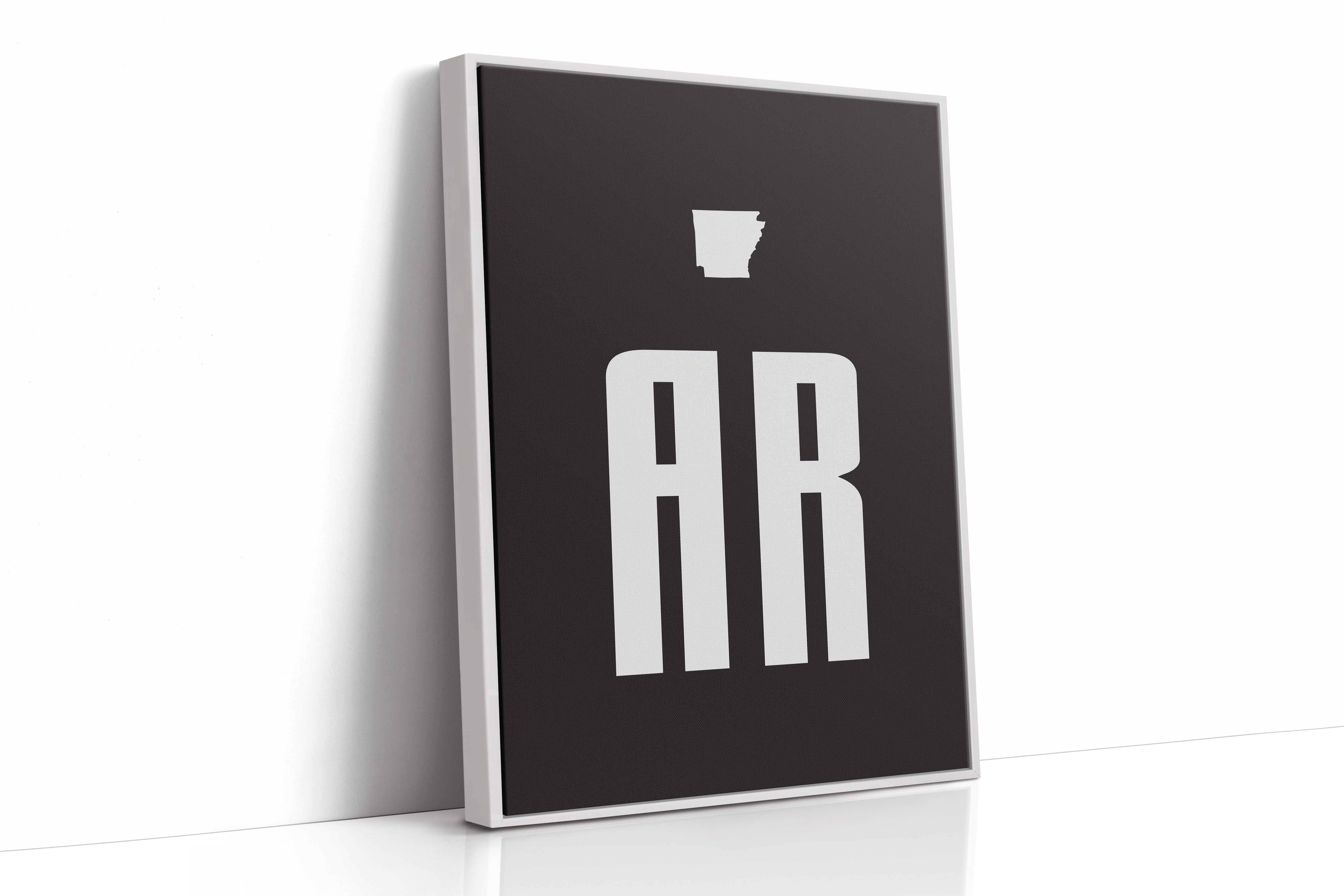 Bold white forms stand stark against deepest black, creating a powerful geographic identity. The distinctive silhouette of Arkansas hovers above modernist typography, where 'AR' rises like twin monuments on the landscape. This minimalist design speaks volumes through negative space, letting simplicity carry its message with confidence and clarity. Perfect for a contemporary office space or modern study where clean lines and strong statements set the tone.
