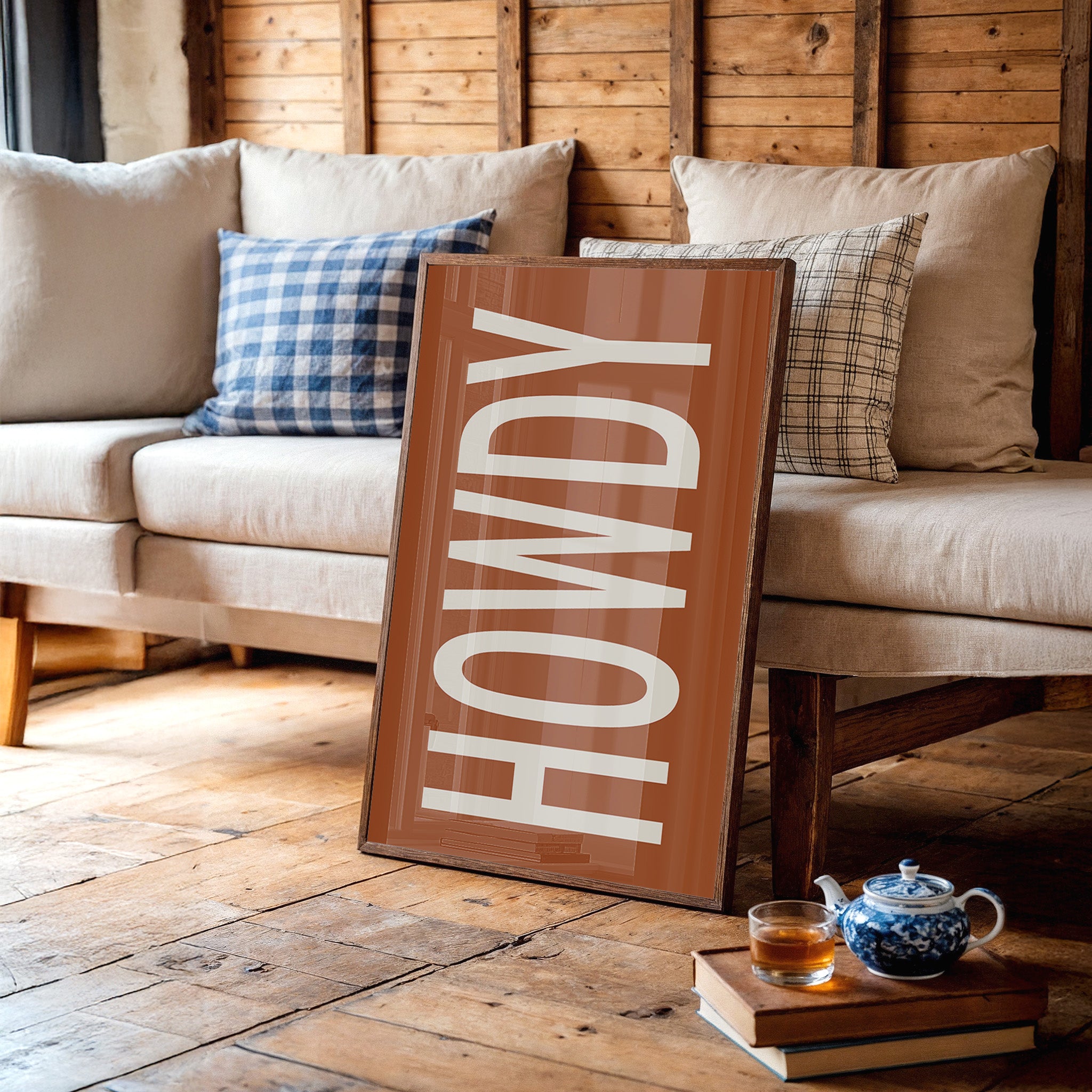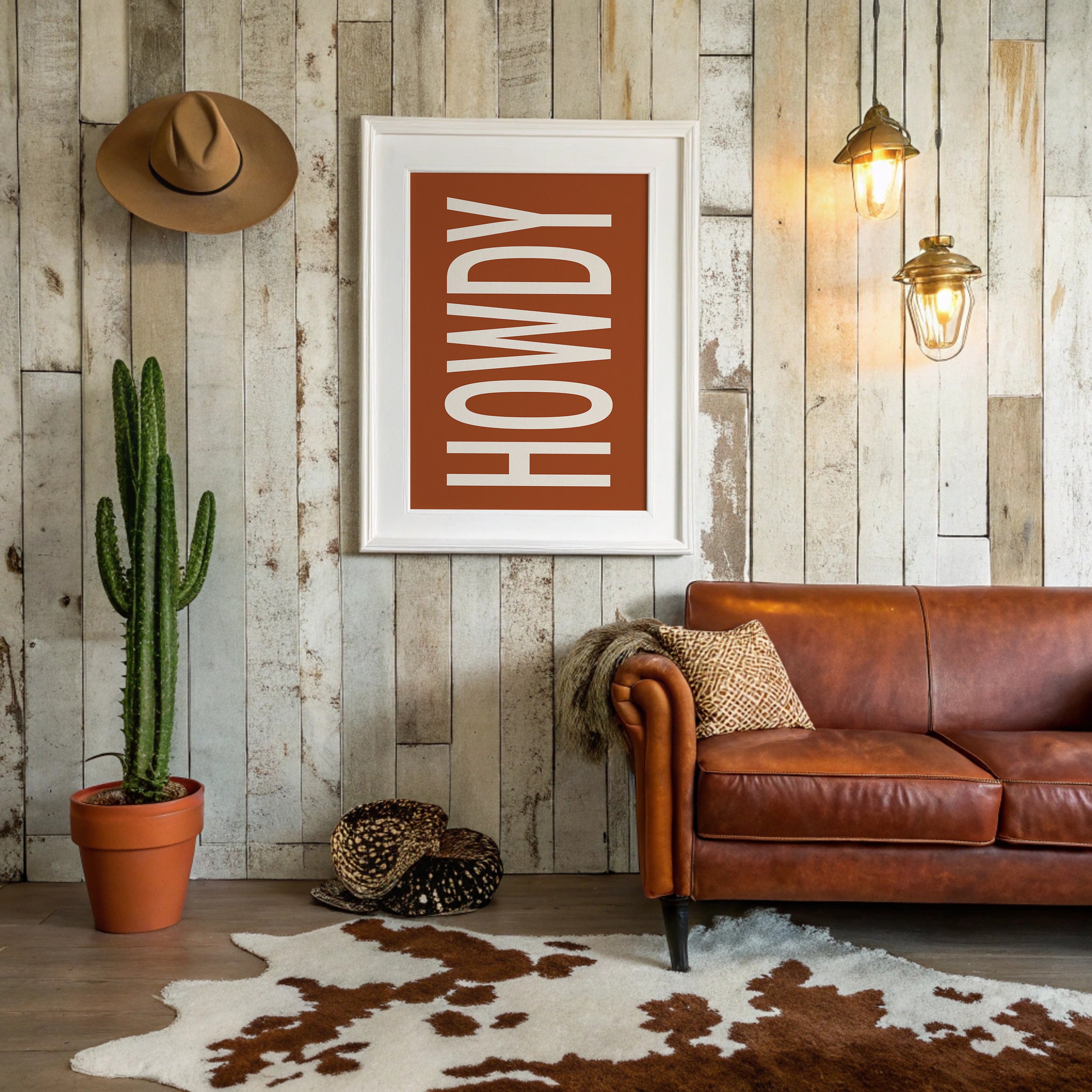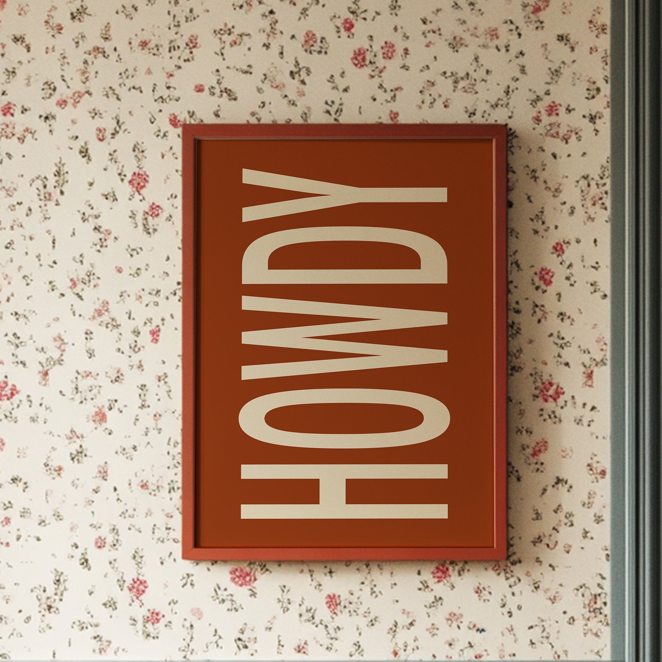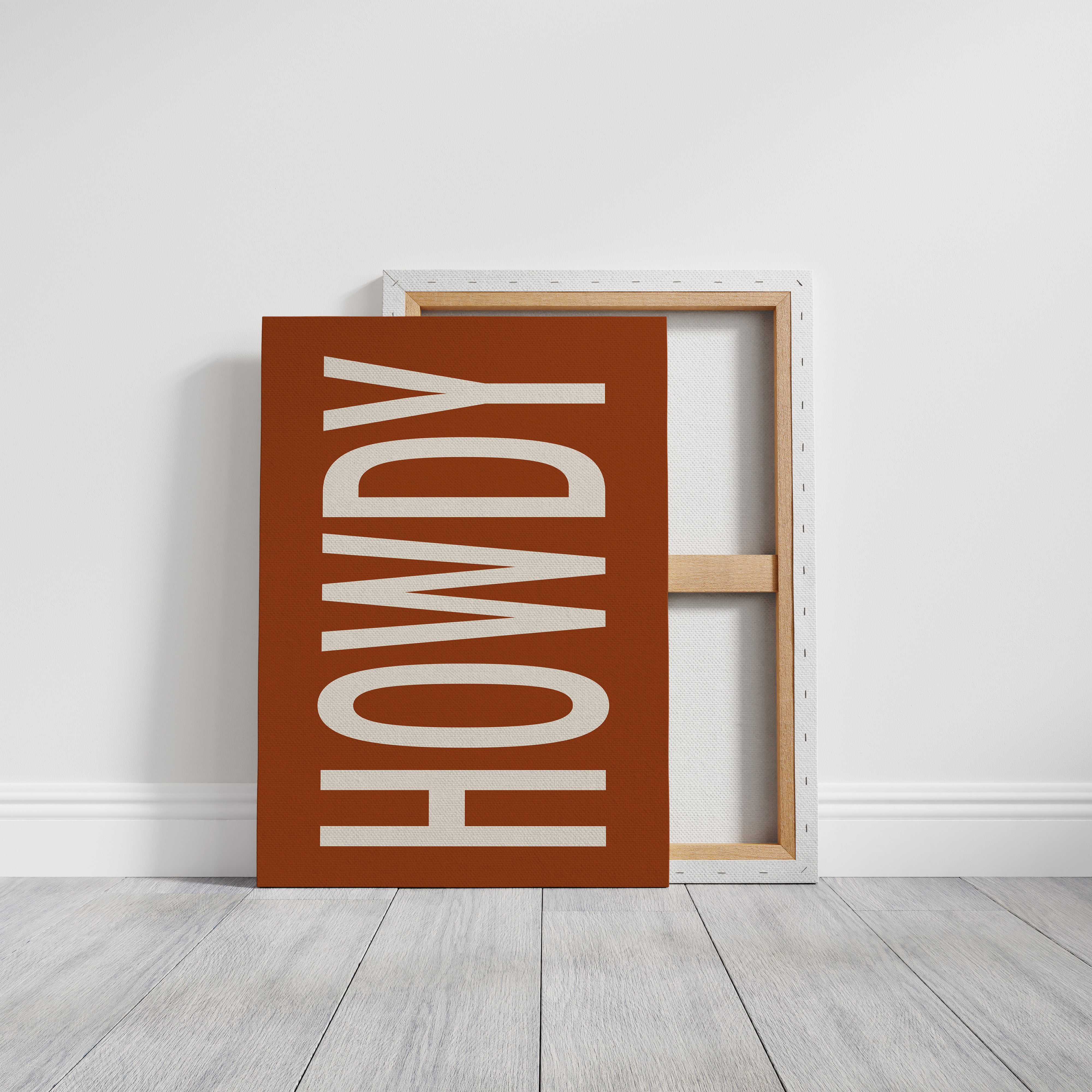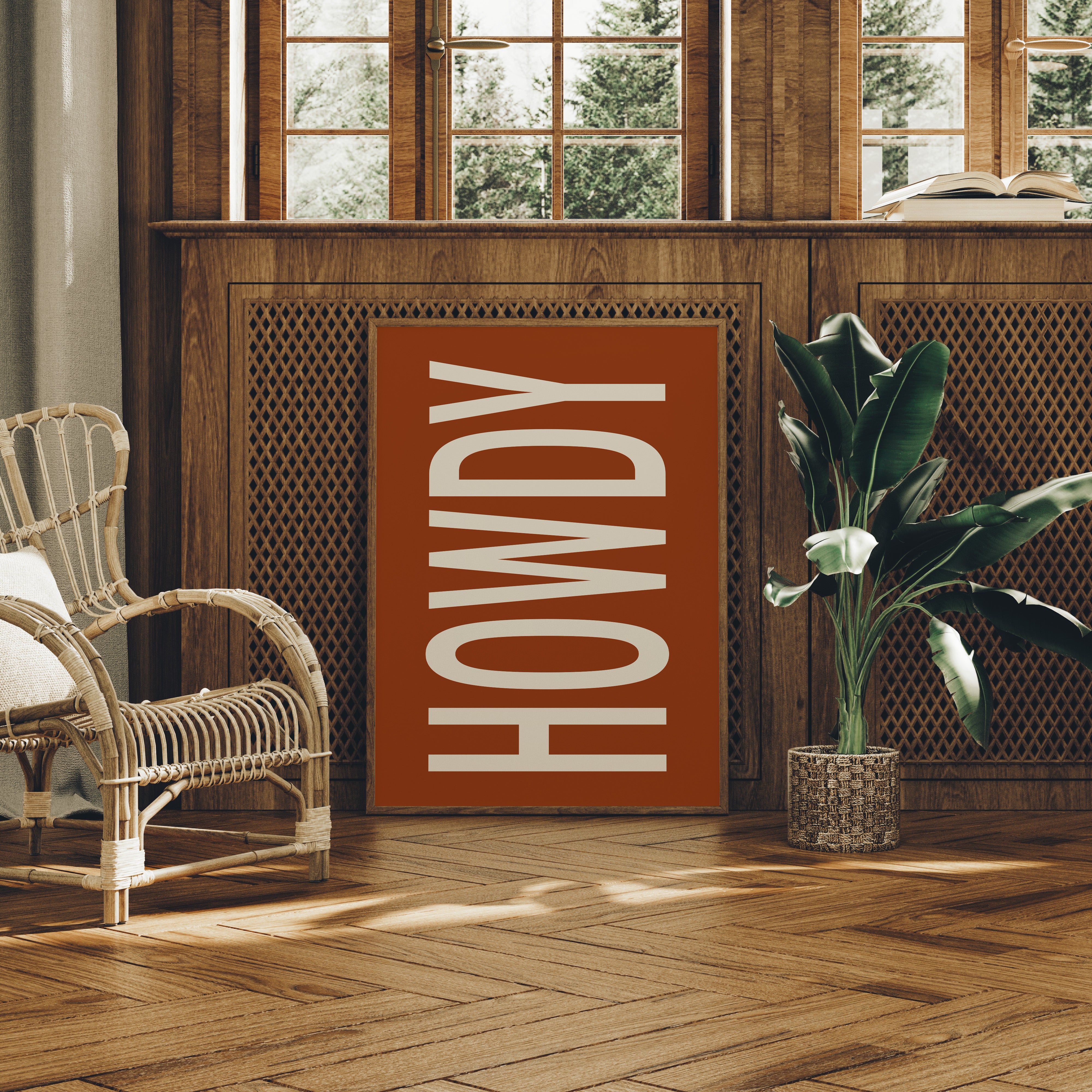 Bold typography emerges from a rich terra cotta background, commanding attention with stark simplicity. The clean lines of 'HOWDY' stretch across the canvas in crisp cream against warm russet tones, creating a striking interplay of positive and negative space. This contemporary interpretation of classic greeting typography brings together modern minimalism with a touch of western warmth. Perfect for adding a bold statement to modern offices, creative studios, or any space seeking sophisticated yet approachable design energy.
