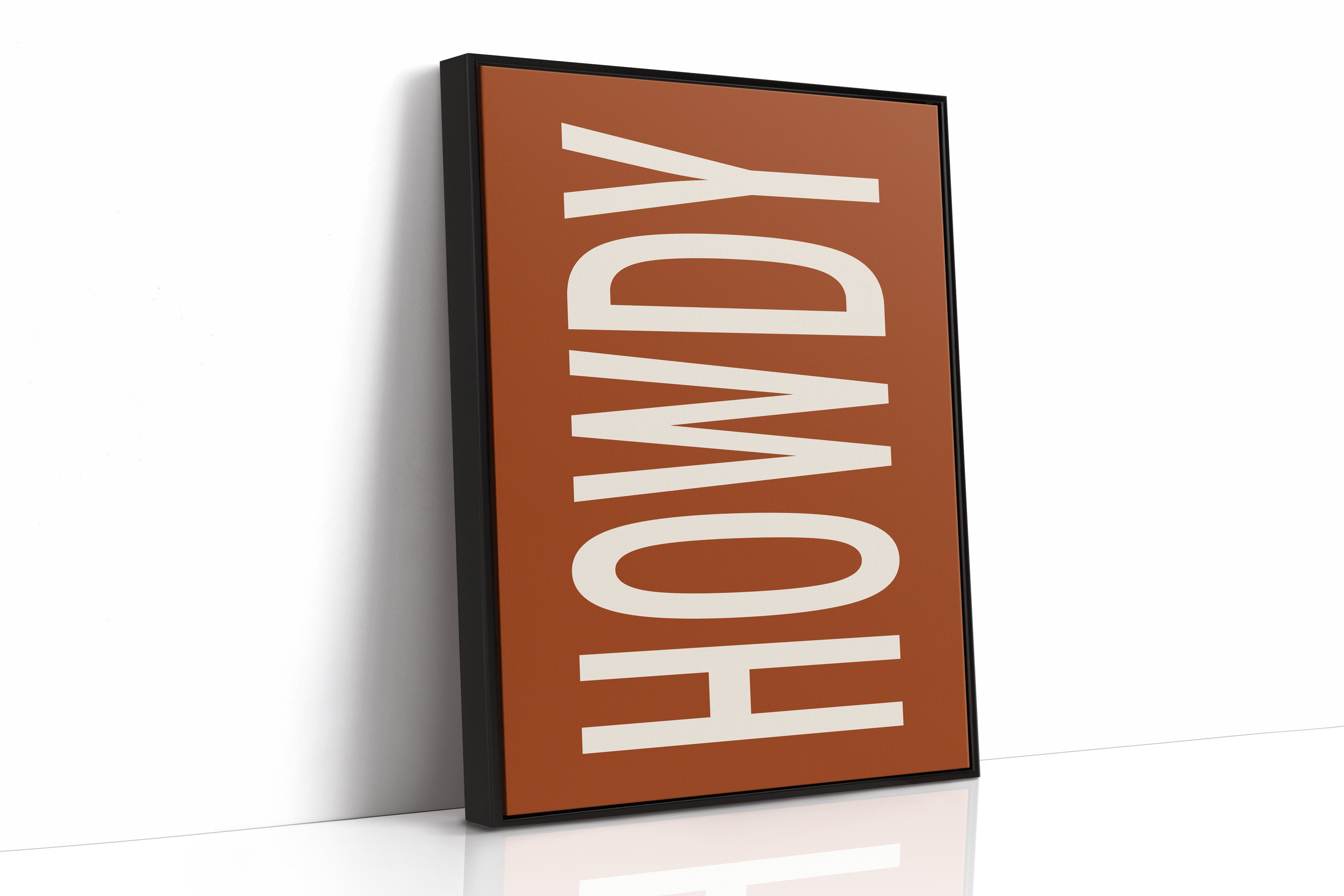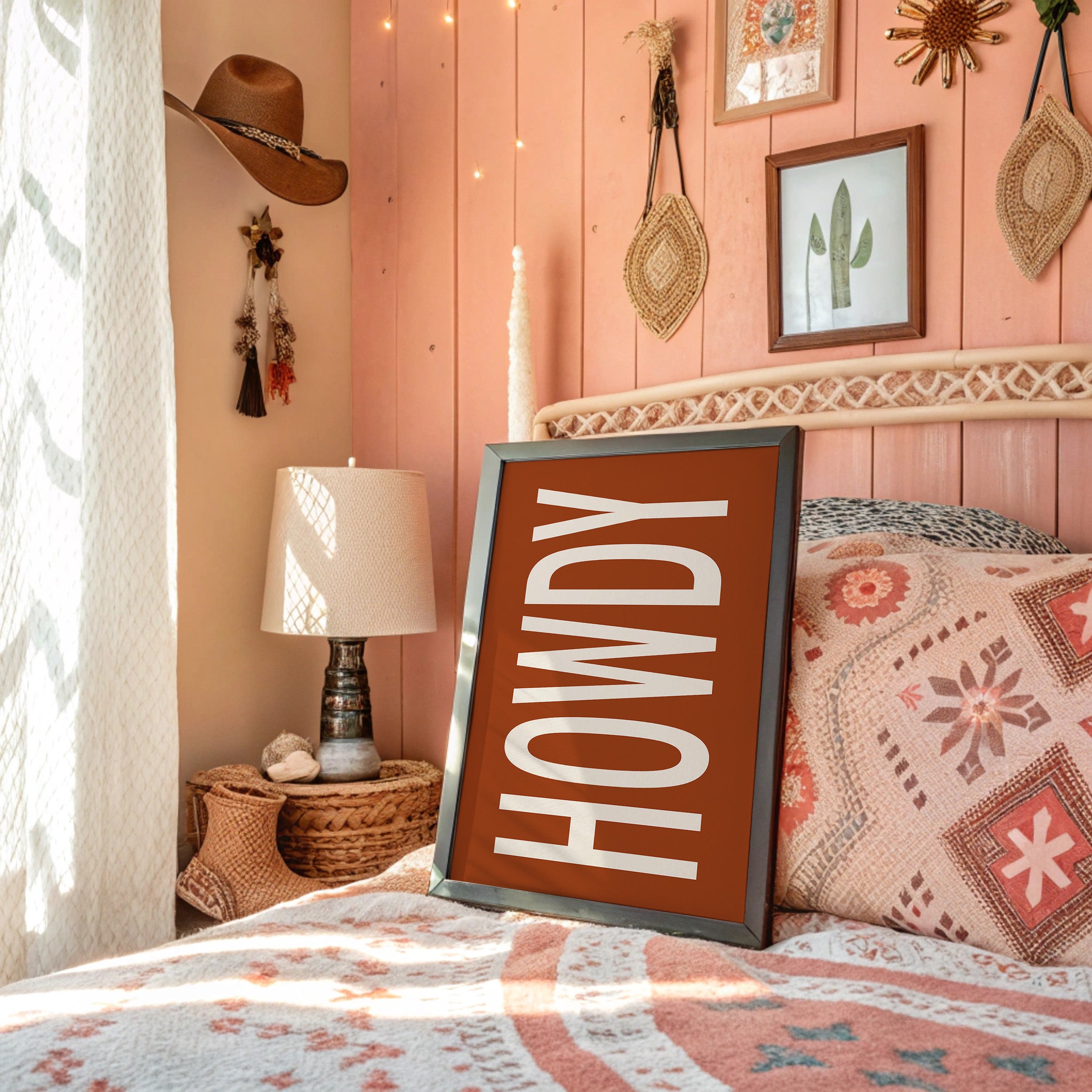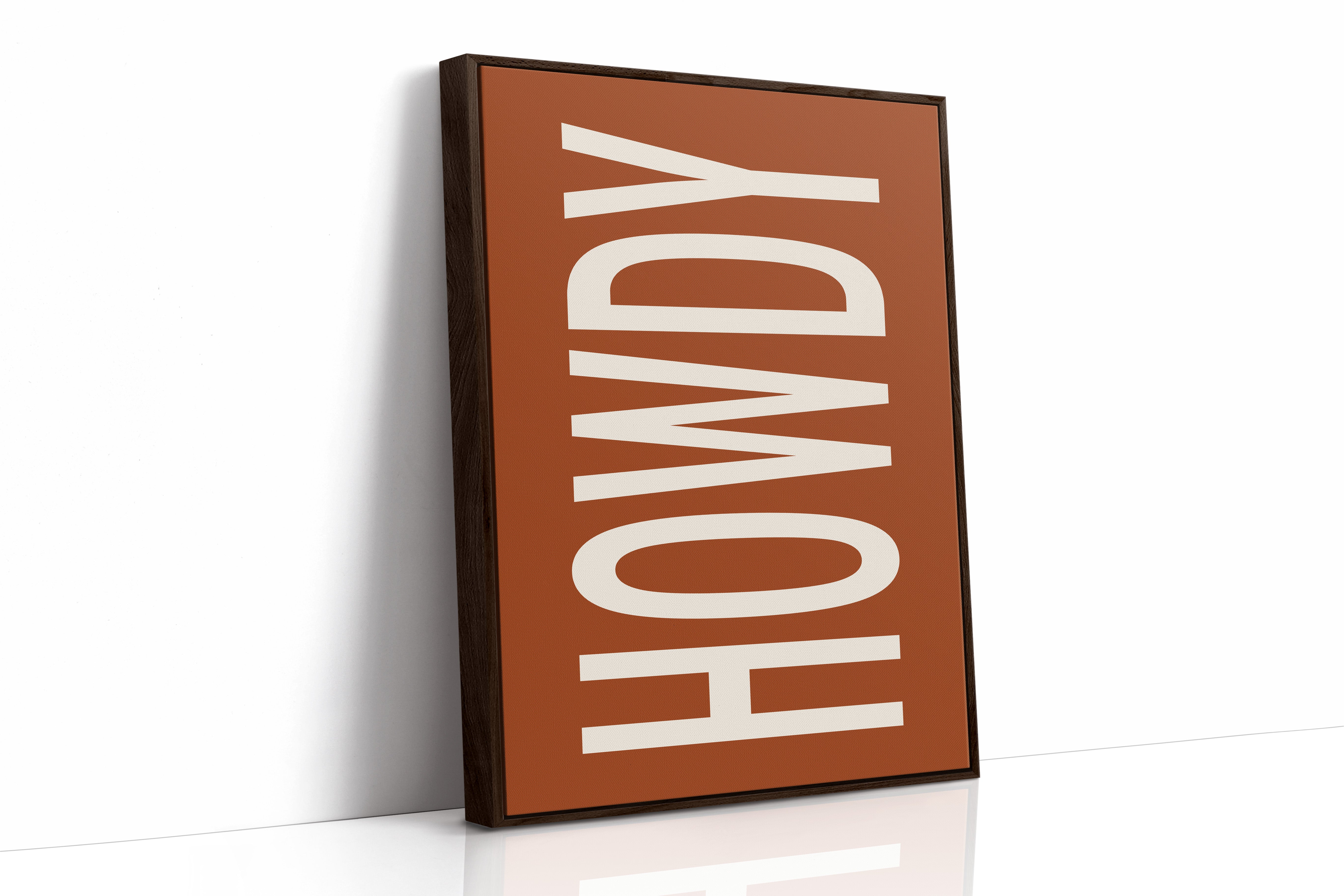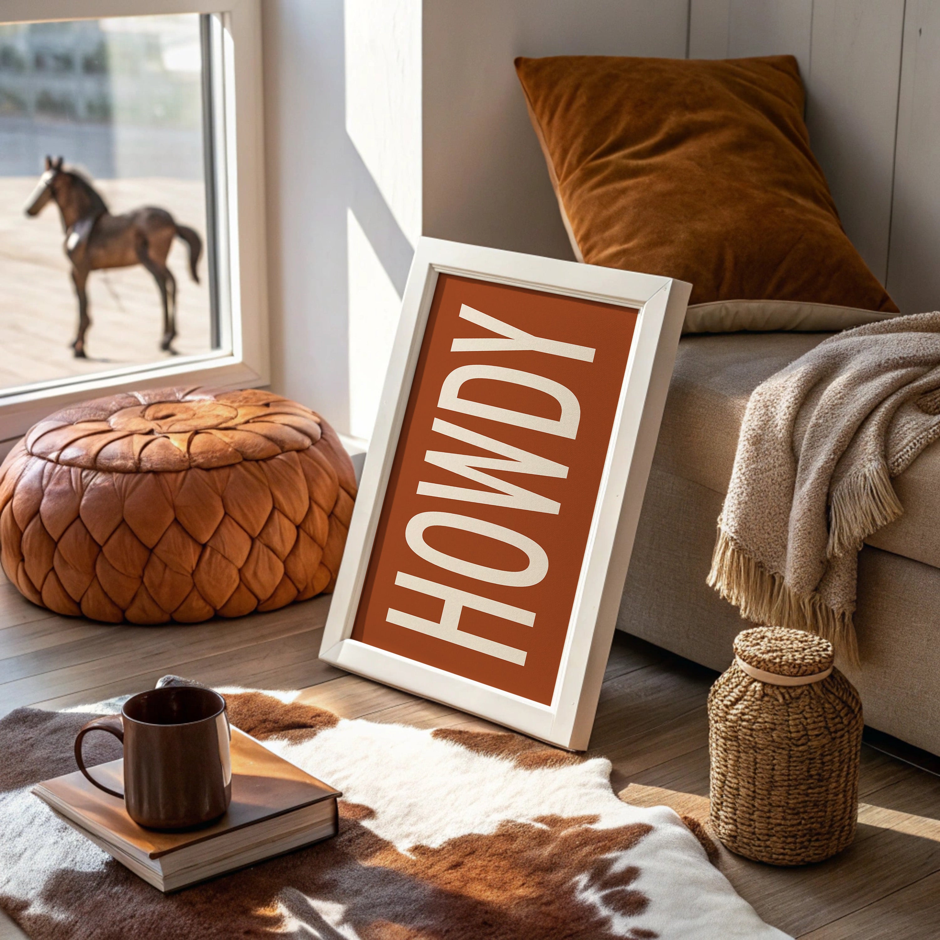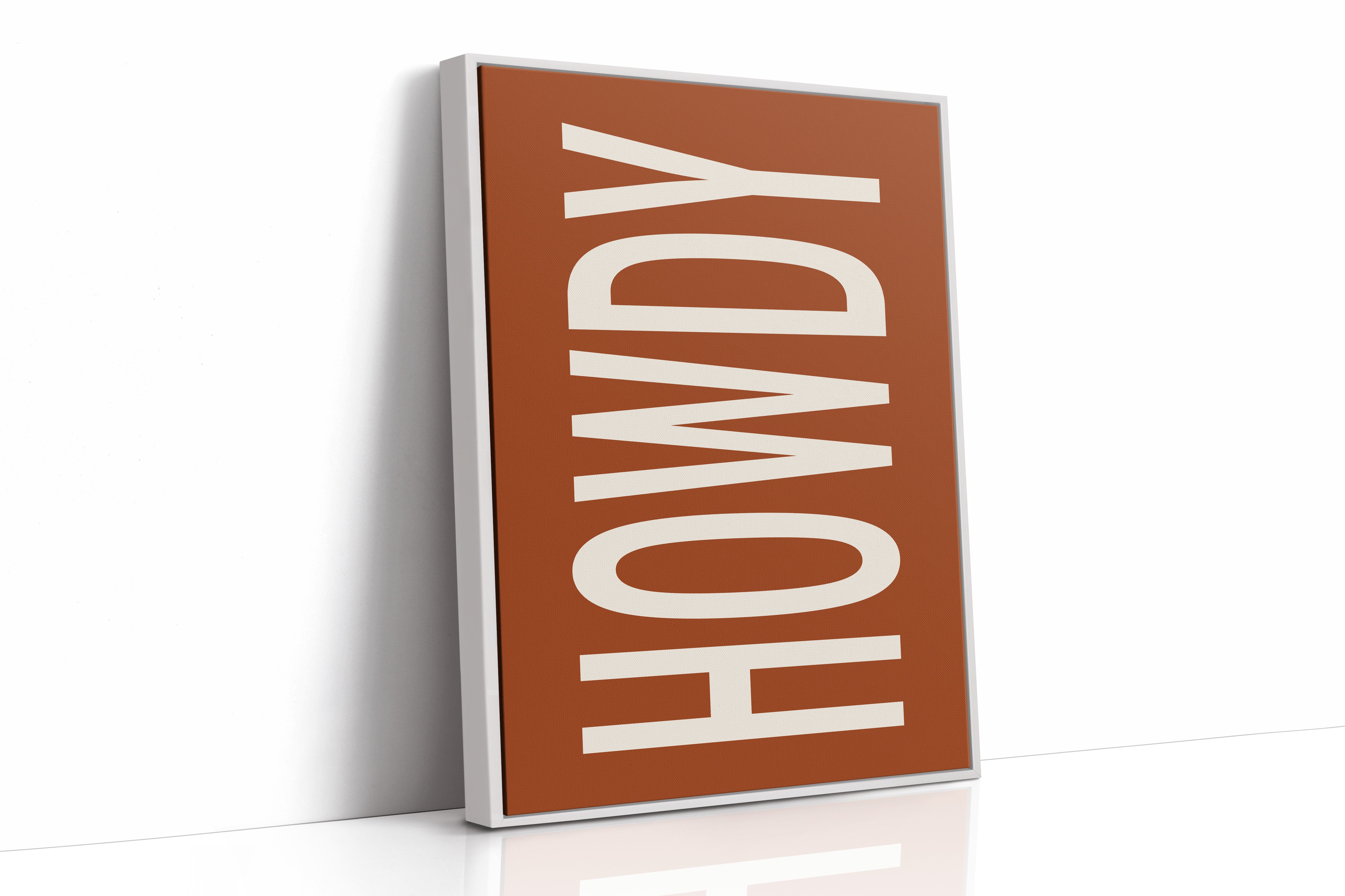 Bold typography emerges from a rich terra cotta background, commanding attention with stark simplicity. The clean lines of 'HOWDY' stretch across the canvas in crisp cream against warm russet tones, creating a striking interplay of positive and negative space. This contemporary interpretation of classic greeting typography brings together modern minimalism with a touch of western warmth. Perfect for adding a bold statement to modern offices, creative studios, or any space seeking sophisticated yet approachable design energy.
