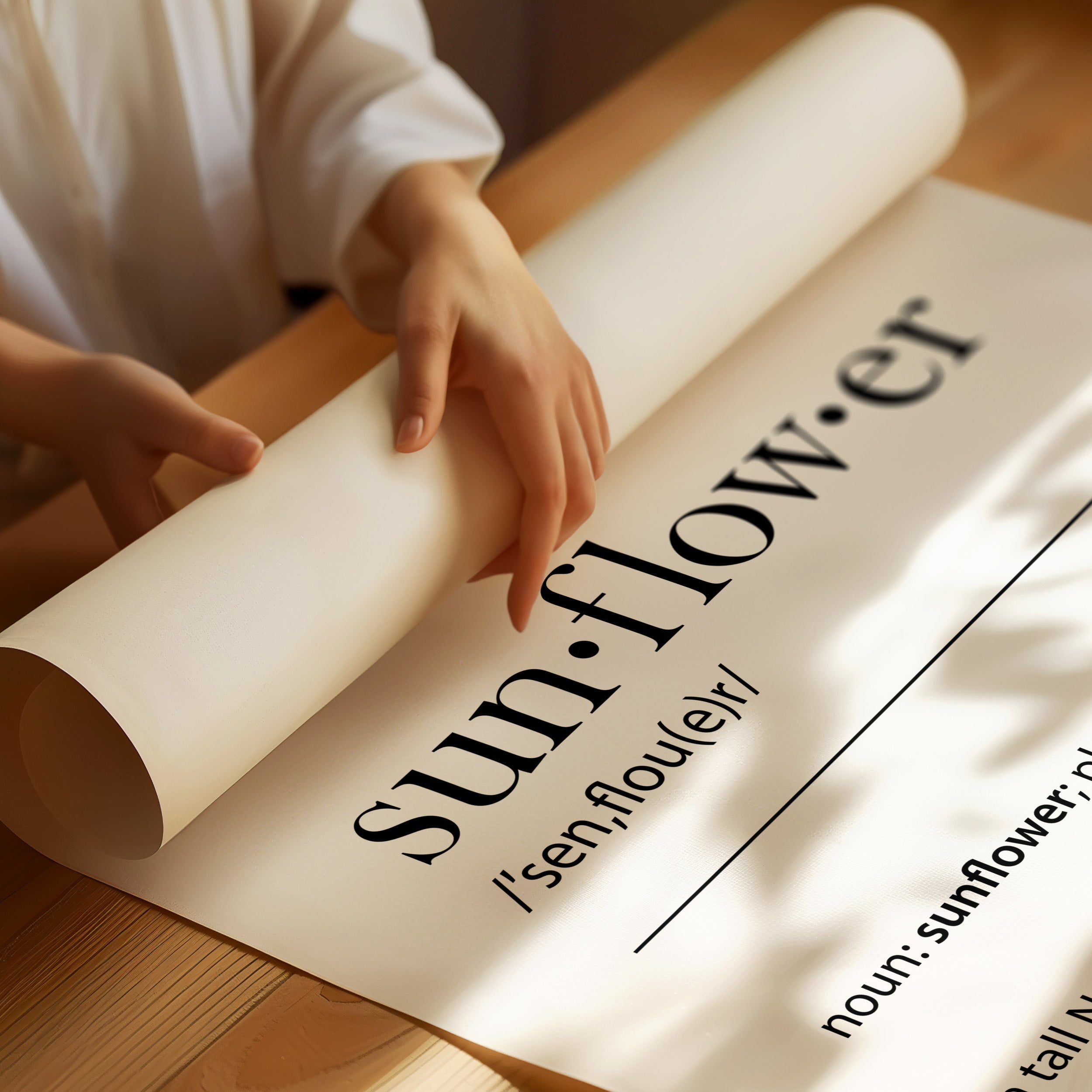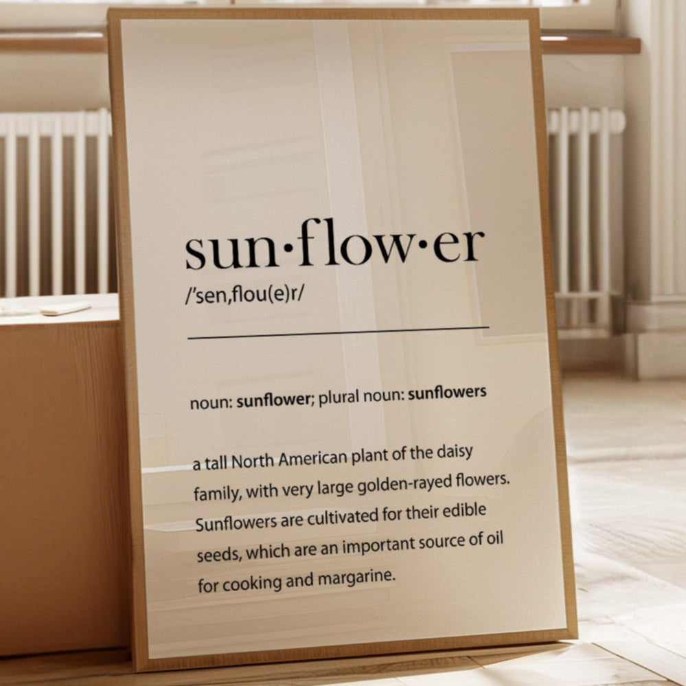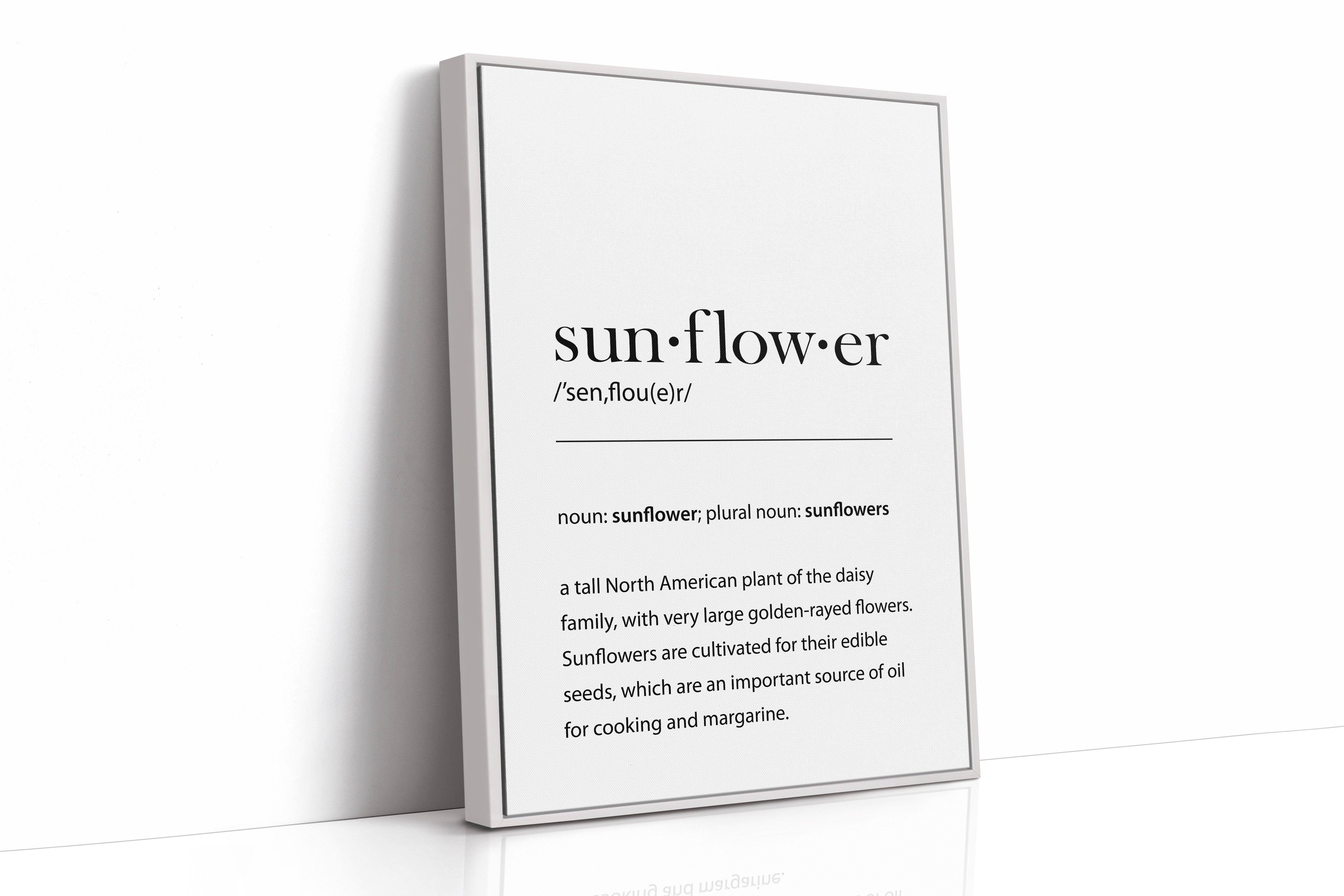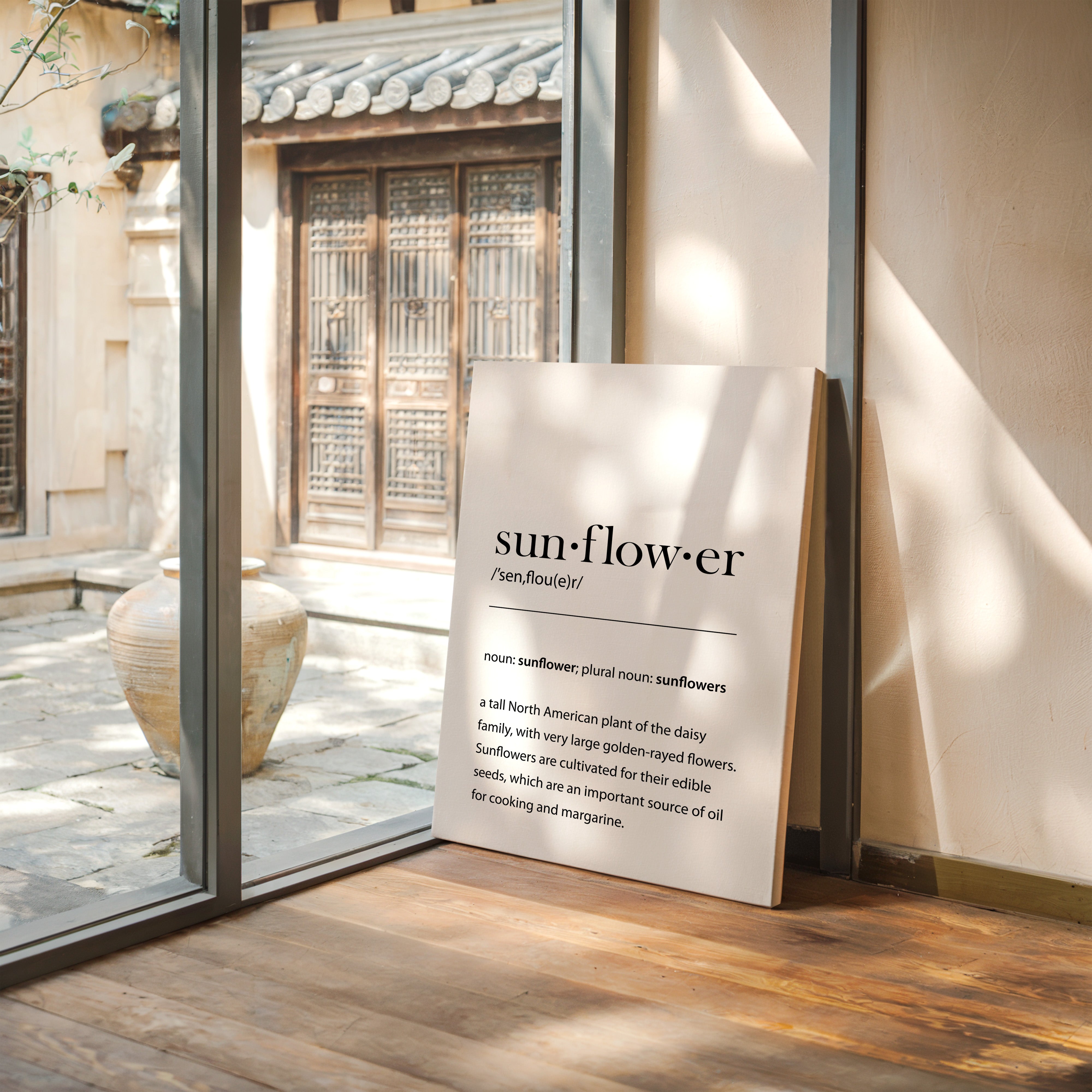 Simple black letters dance across pristine white space, revealing the essence of nature's most devoted bloom. This minimalist typography piece brings academic elegance to botanical definitions. The clean lines and precise phonetic spelling tell the story of the sunflower - from its Latin roots to its modern significance, creating an unexpected portrait of this beloved flower through words alone. Each carefully chosen letter serves as both education and art, transforming botanical knowledge into visual poetry. Perfect for adding intellectual charm to a home office, library, or any space where literature meets nature.