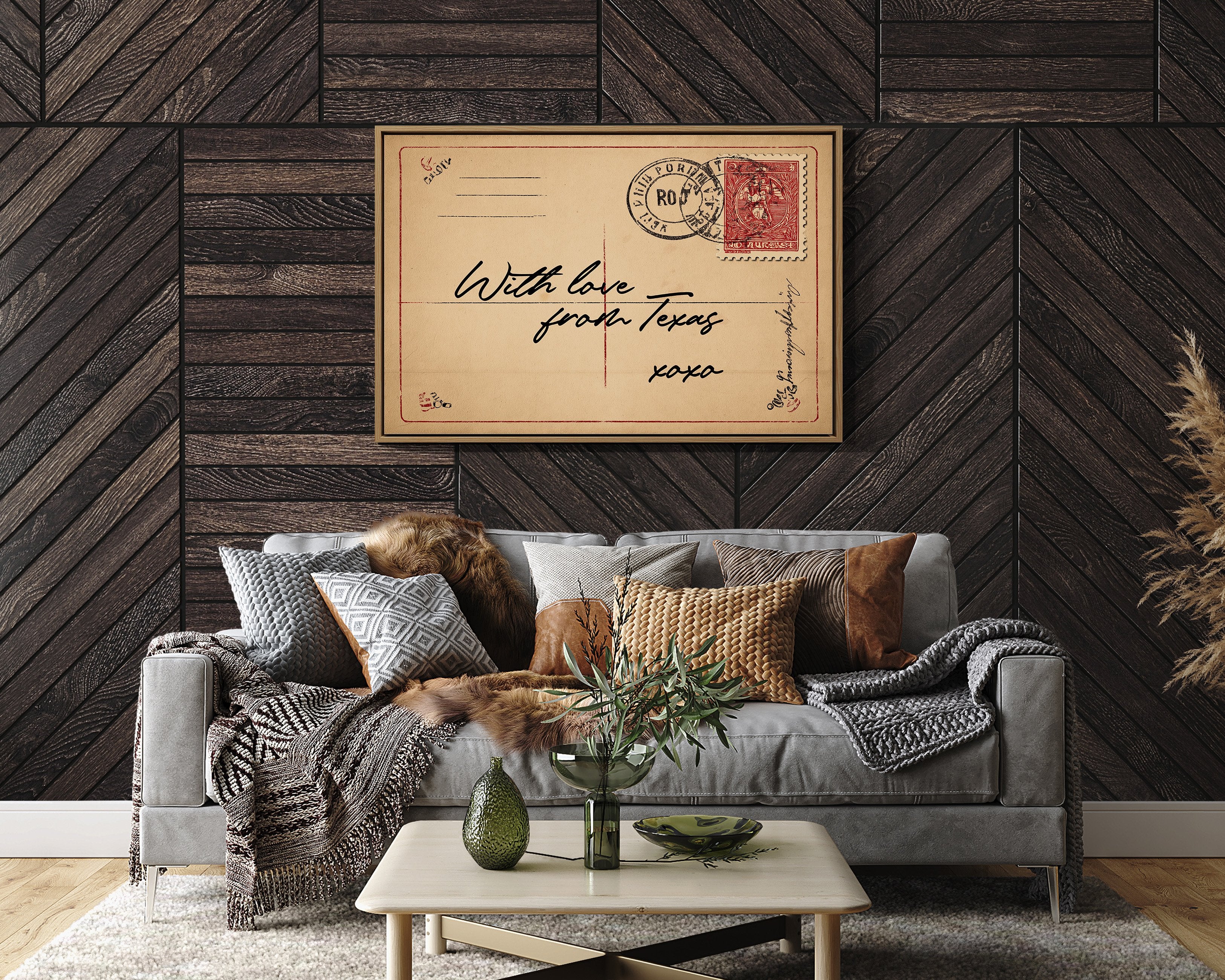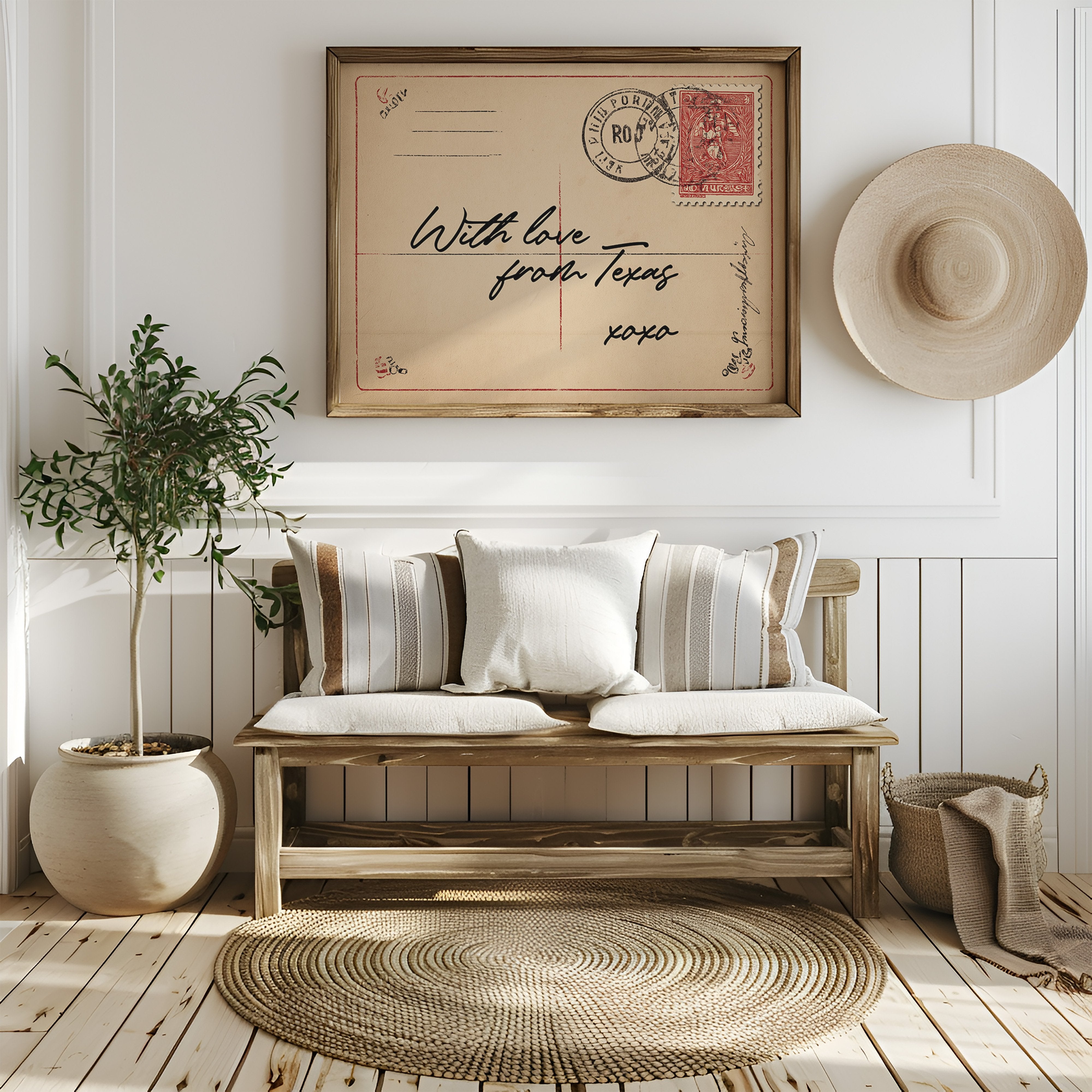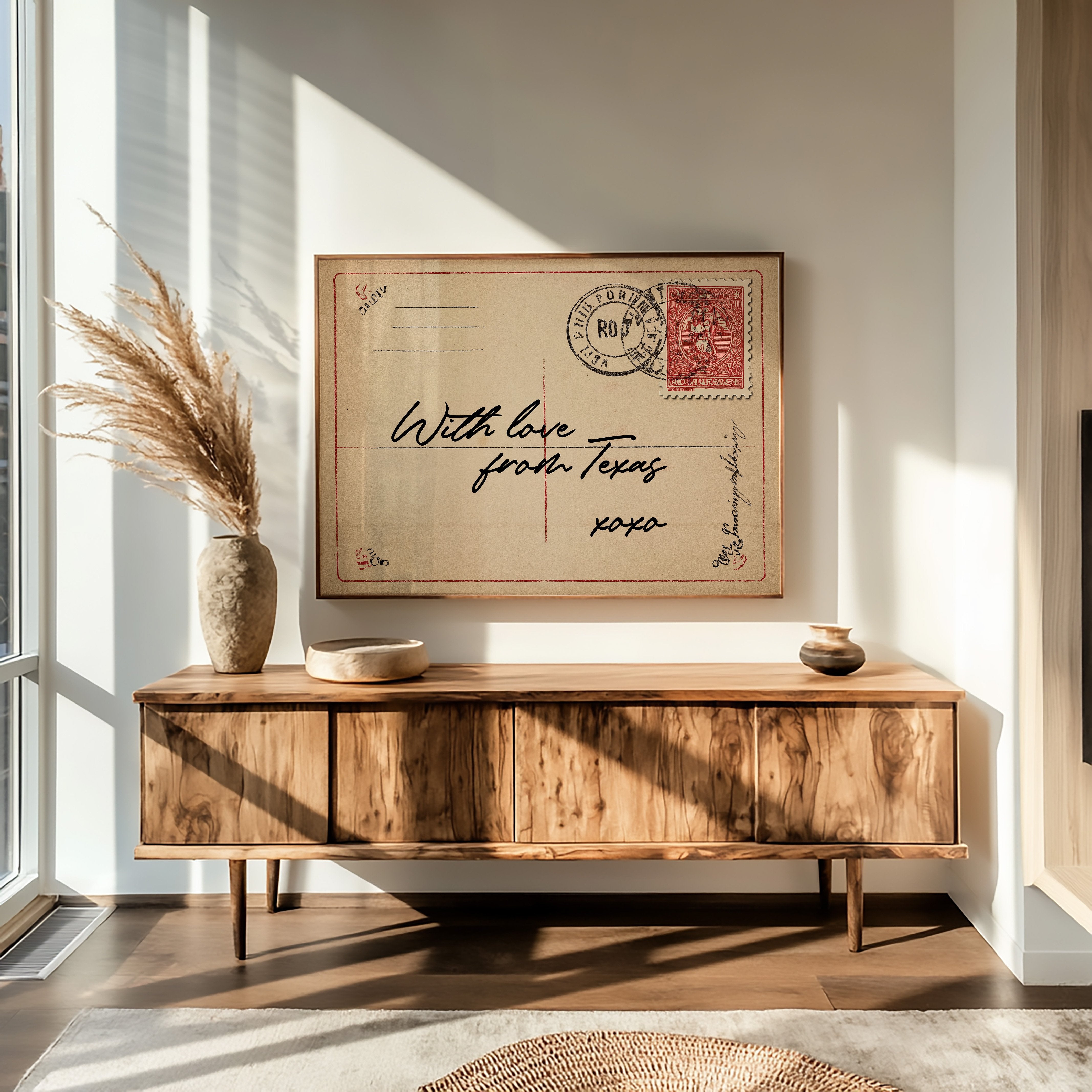 A vintage postcard whispers tales of nostalgia, its aged paper carrying handwritten sentiments ""With love from Texas"" across decades. The delicate red stamp and postmark stand in beautiful contrast to the warm beige background, creating a timeless piece that celebrates both personal connection and the lost art of handwritten correspondence. This evocative piece brings character to modern spaces while honoring the simple beauty of communication from a bygone era.