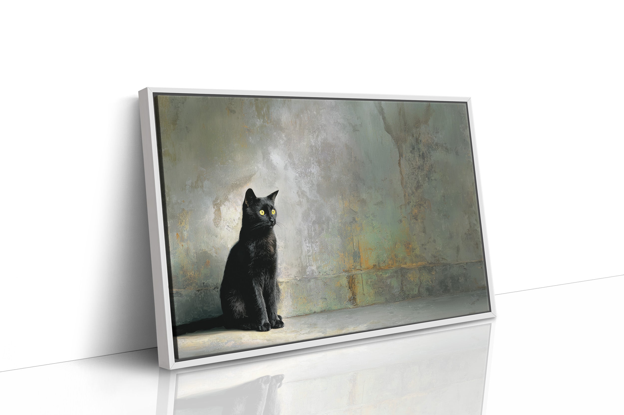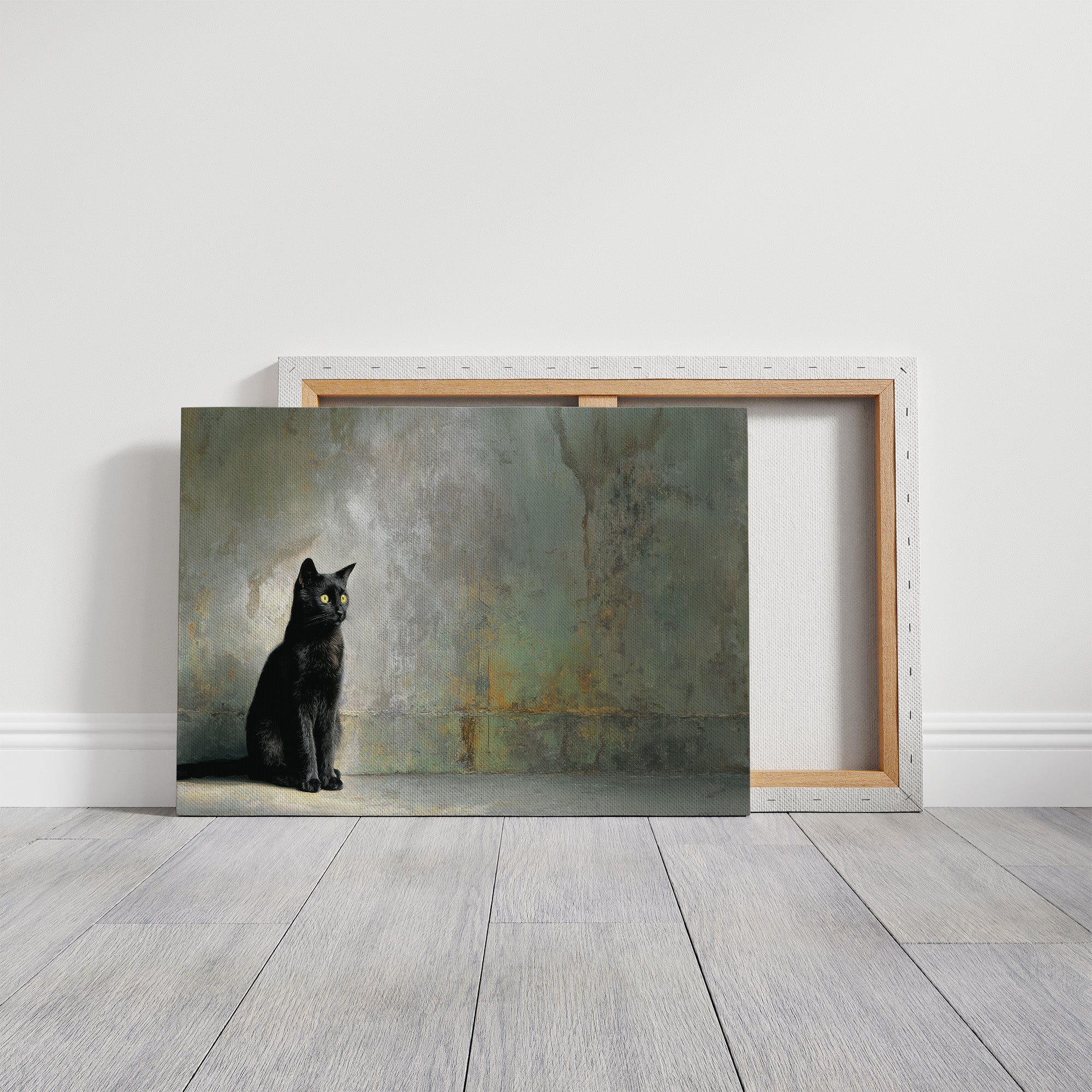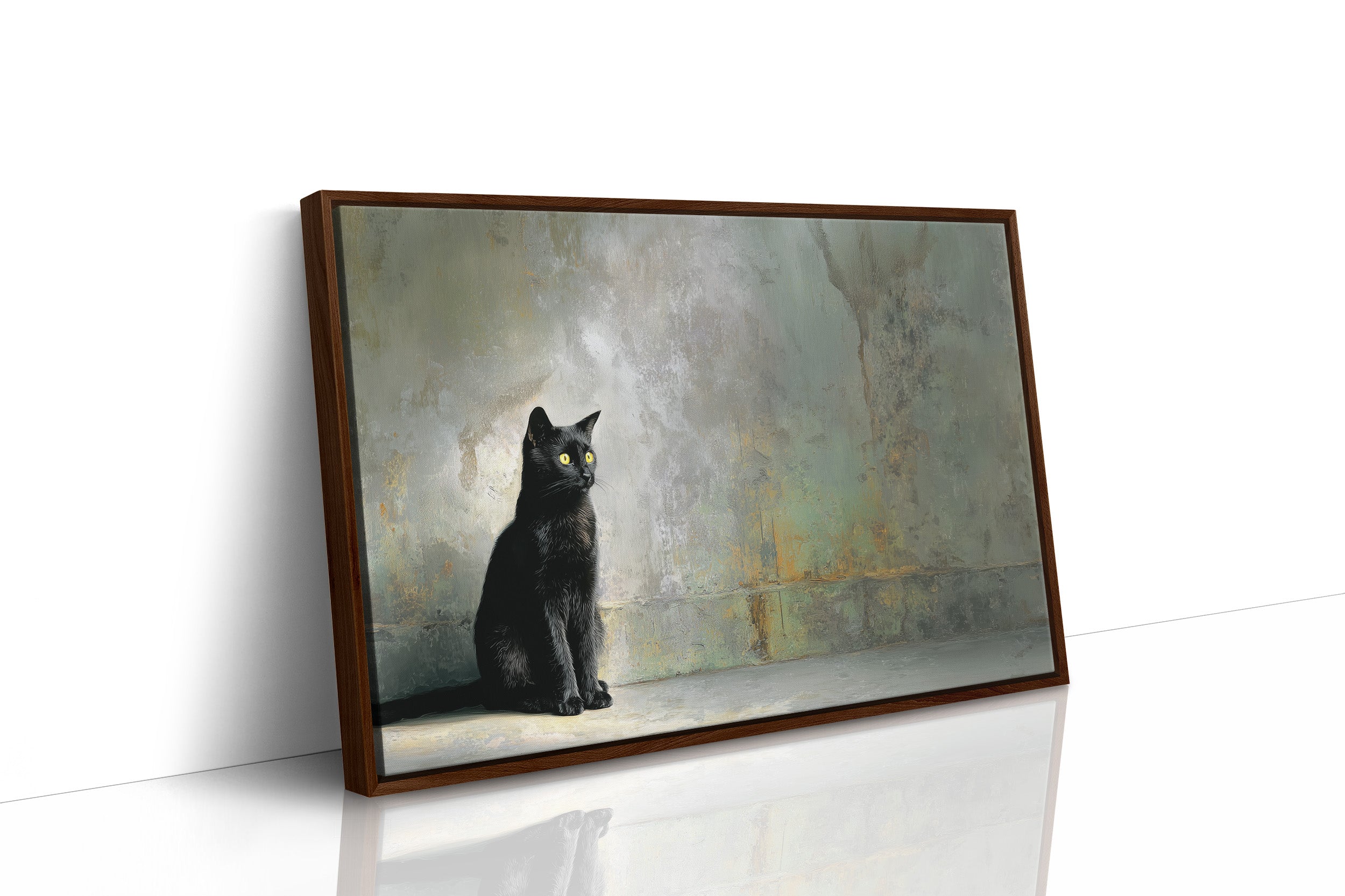 A solitary black cat sits poised against a weathered backdrop, its bright eyes alert with ancient wisdom. The textured patina of muted greens and golds creates a timeless stage for this feline sentinel, capturing a moment of quiet contemplation amid stories untold. Displayed against a backdrop of countless books, this framed portrait bridges worlds between literary treasure and living guardian.