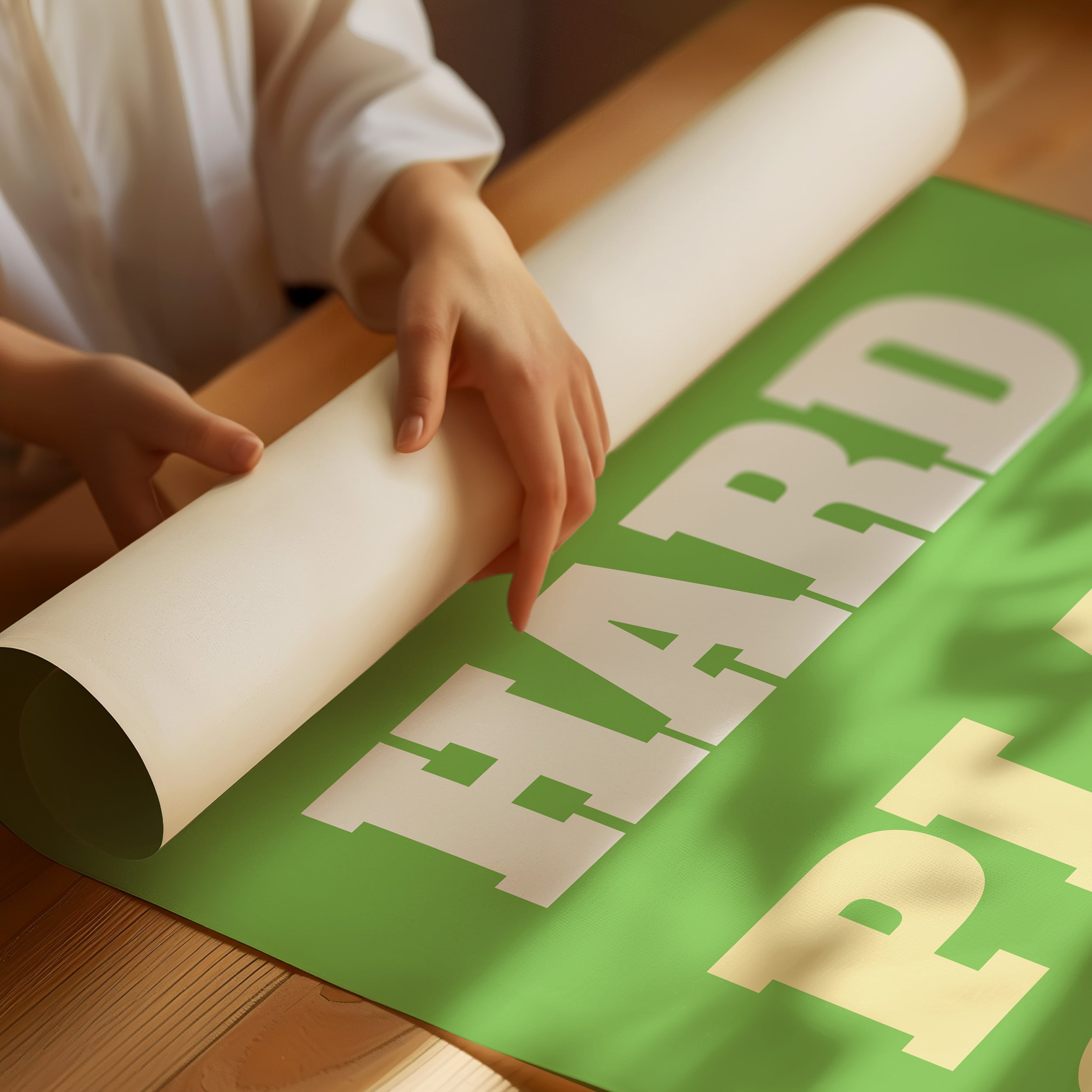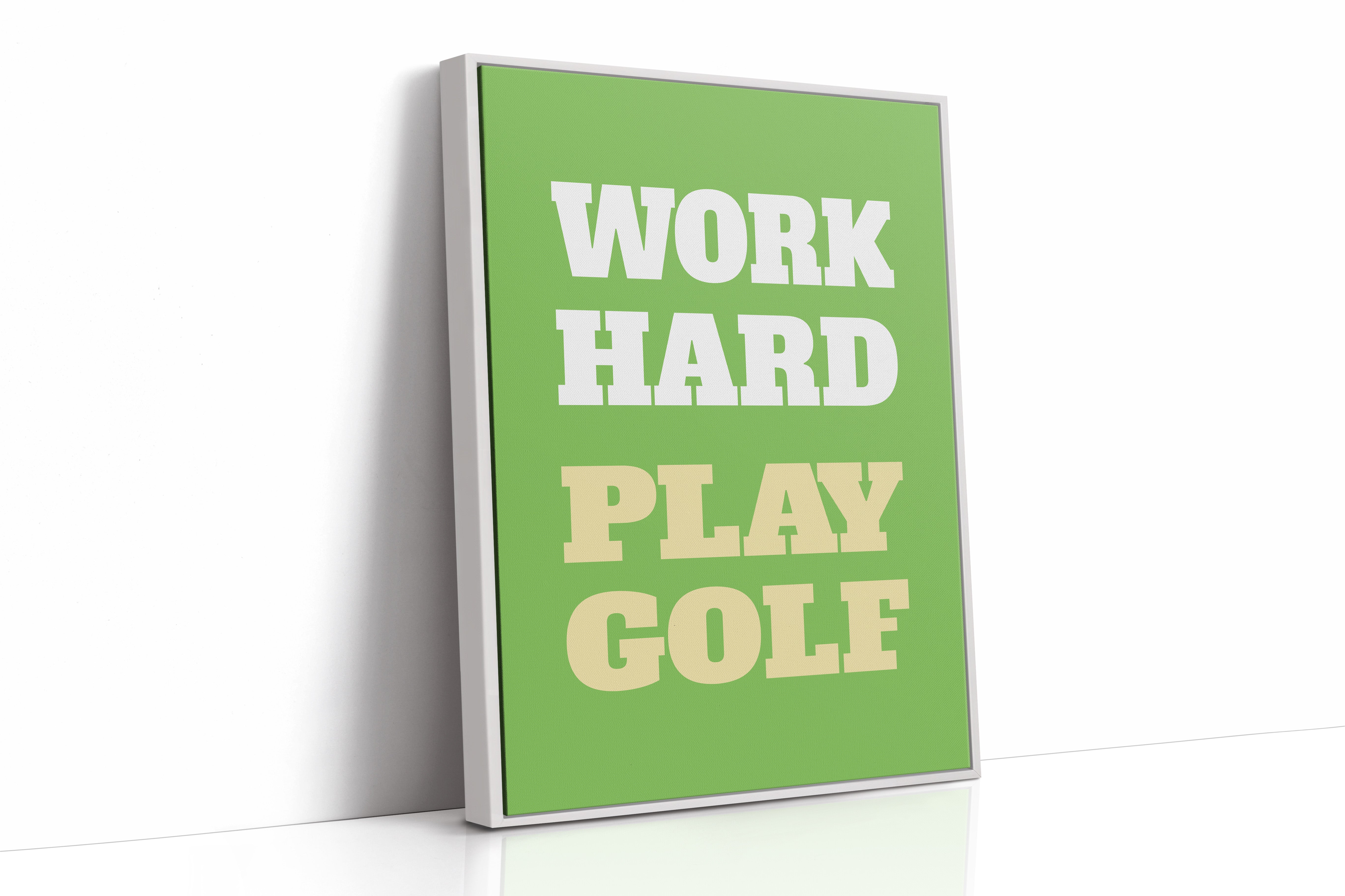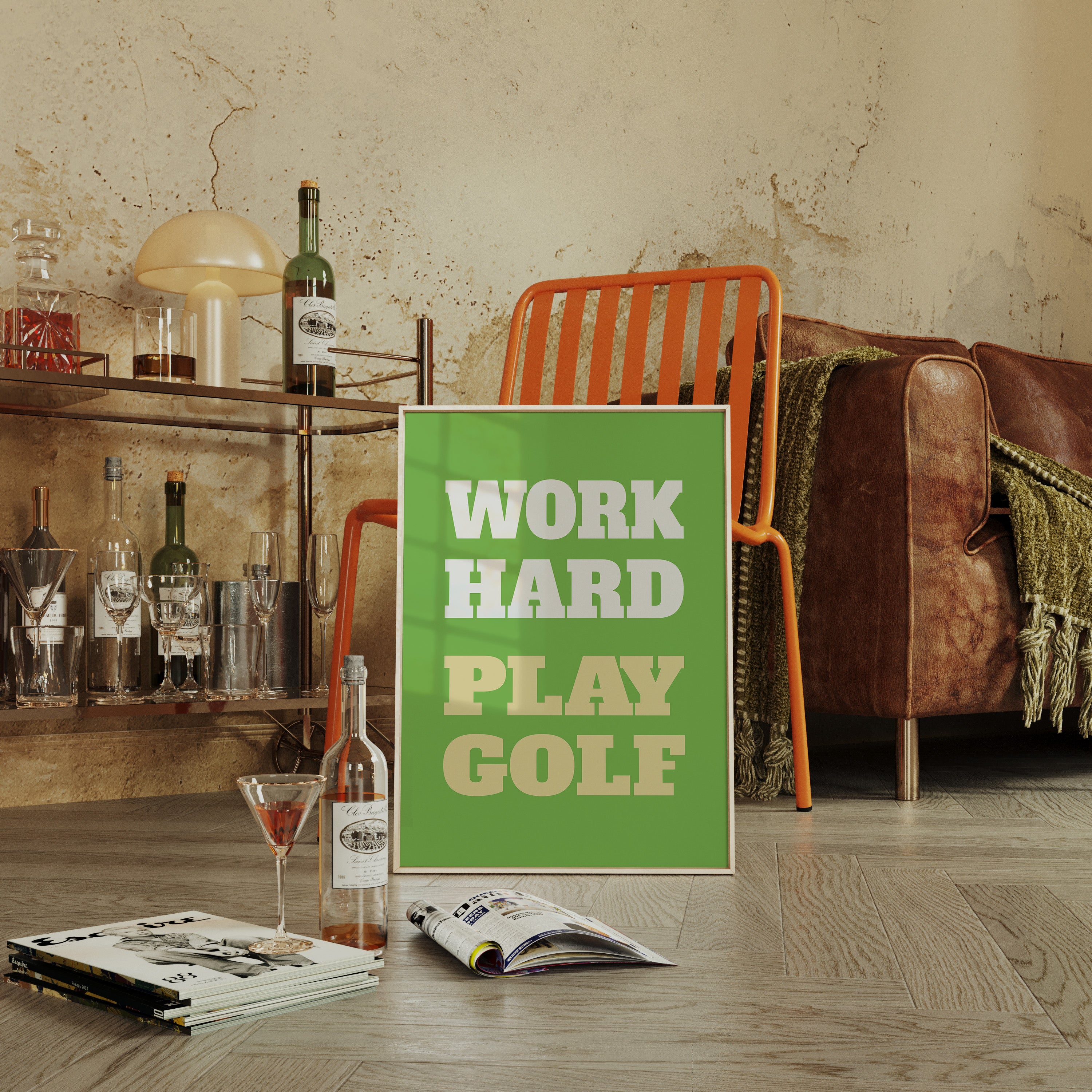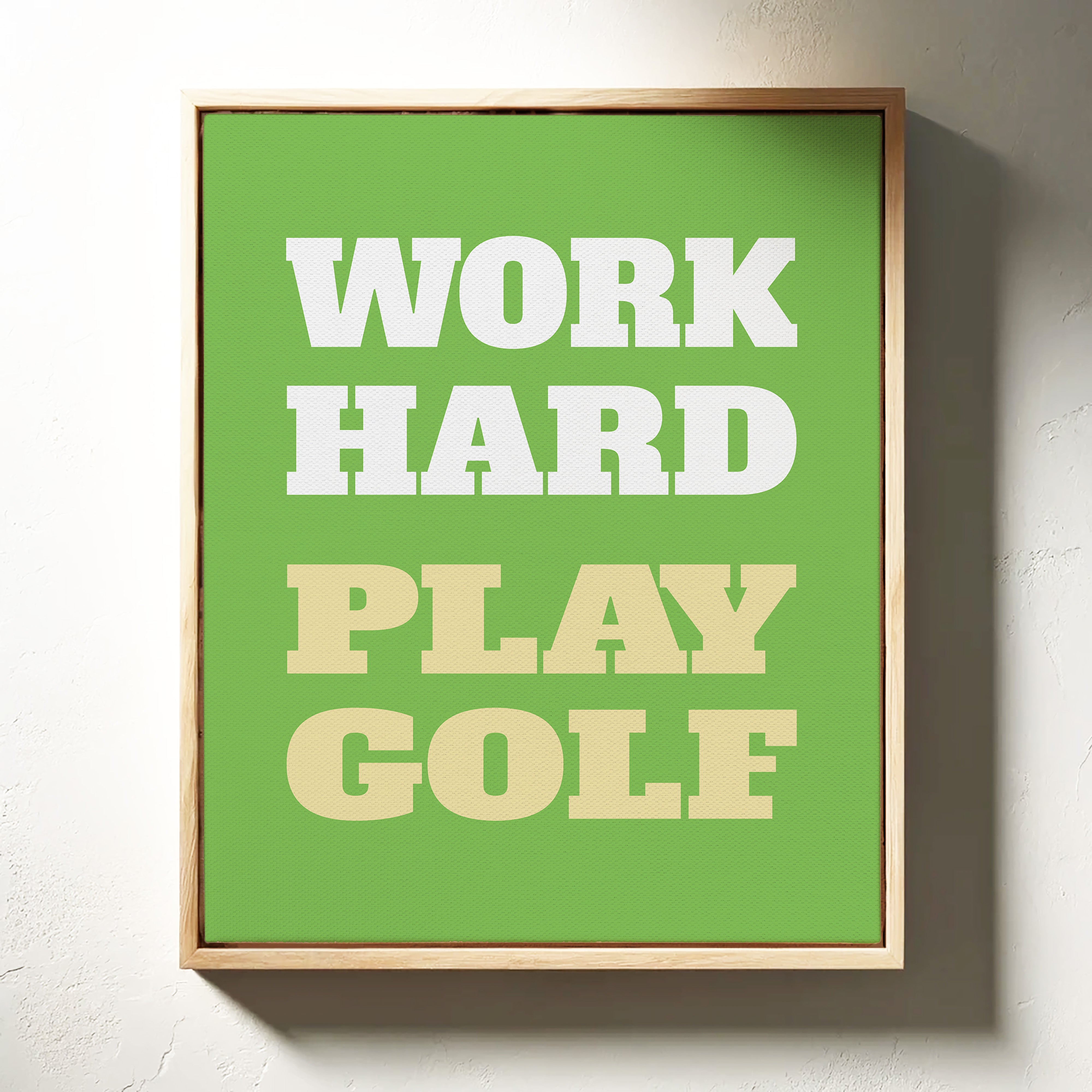 Bold typography stands against a vibrant green backdrop, delivering a message that resonates with both ambition and leisure. This piece from our Contemporary collection marries minimalist design with motivational messaging. The stark contrast between the commanding white 'WORK HARD' and the softer cream 'PLAY GOLF' creates a visual rhythm that mirrors life's essential balance. The fresh green color evokes the perfectly manicured grass of a golf course, while the bold letterforms command attention and inspire action. Perfect for a home office or golf club lounge, this piece serves as a daily reminder that success comes from both dedication and enjoyment.