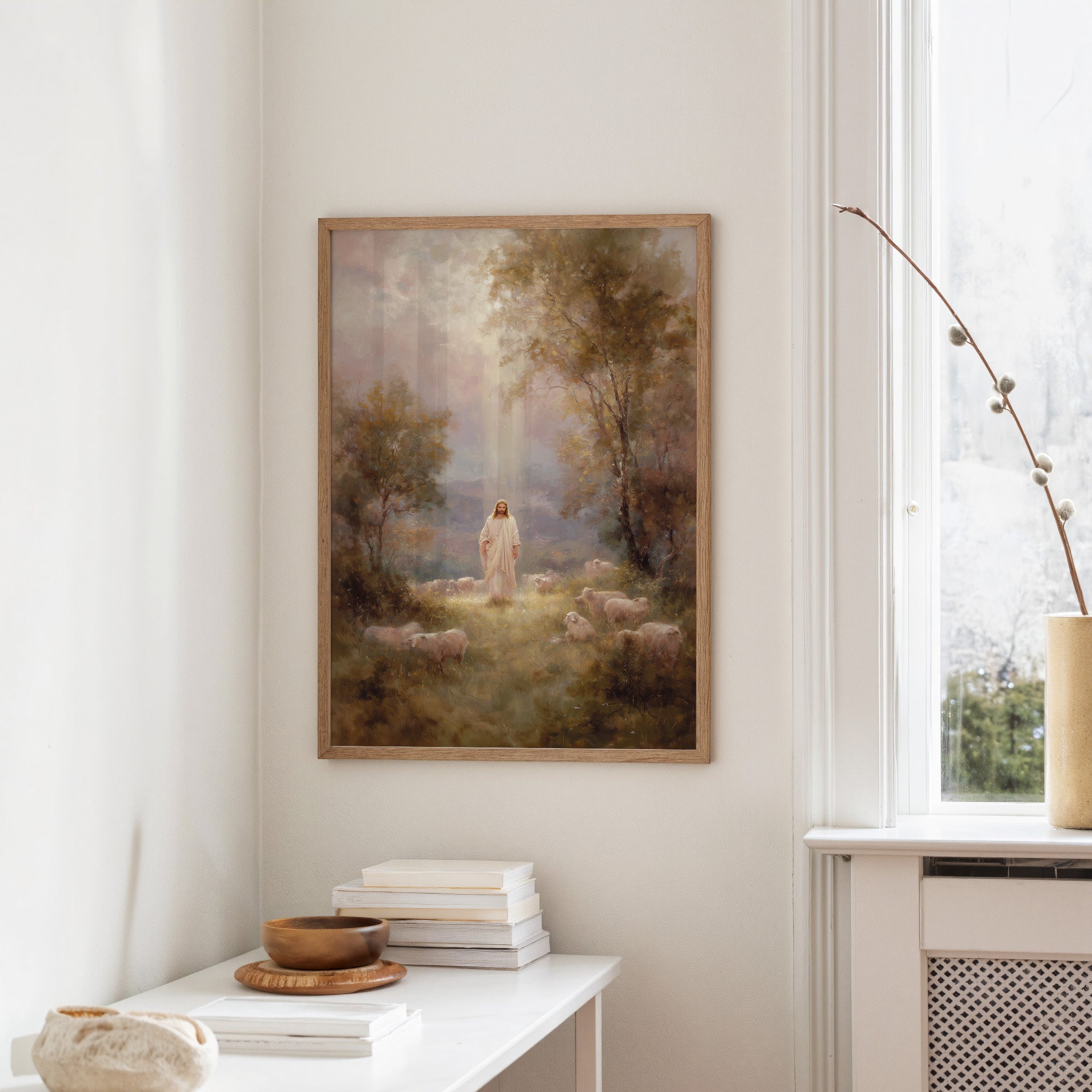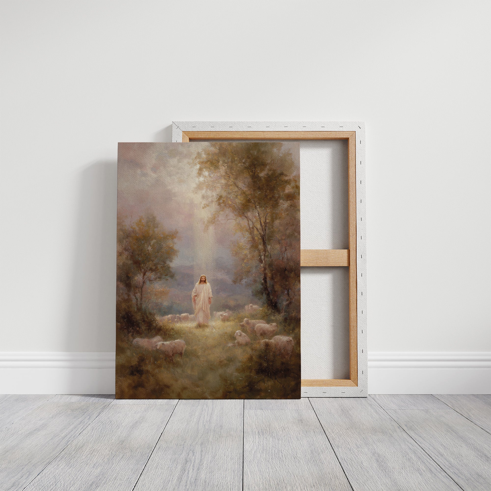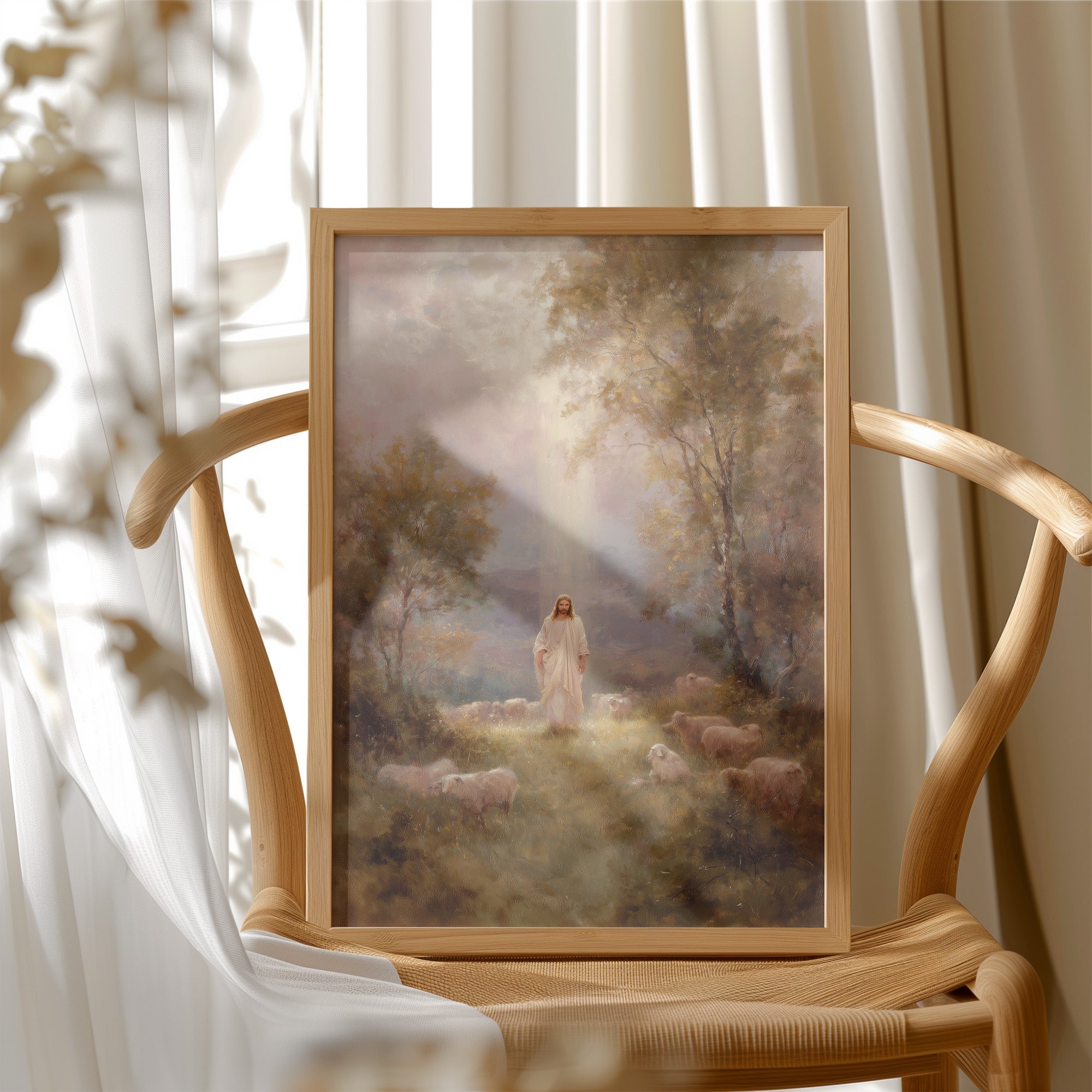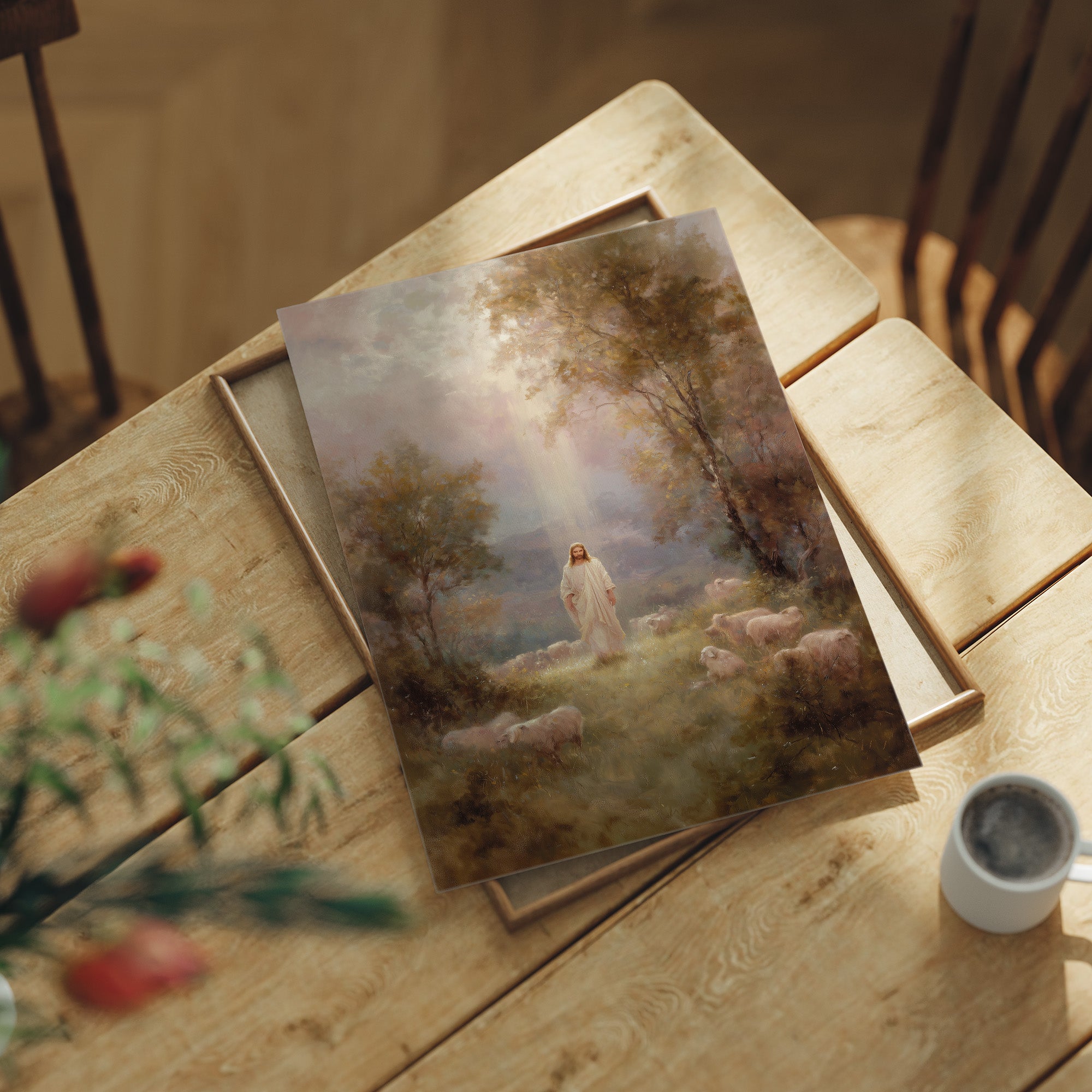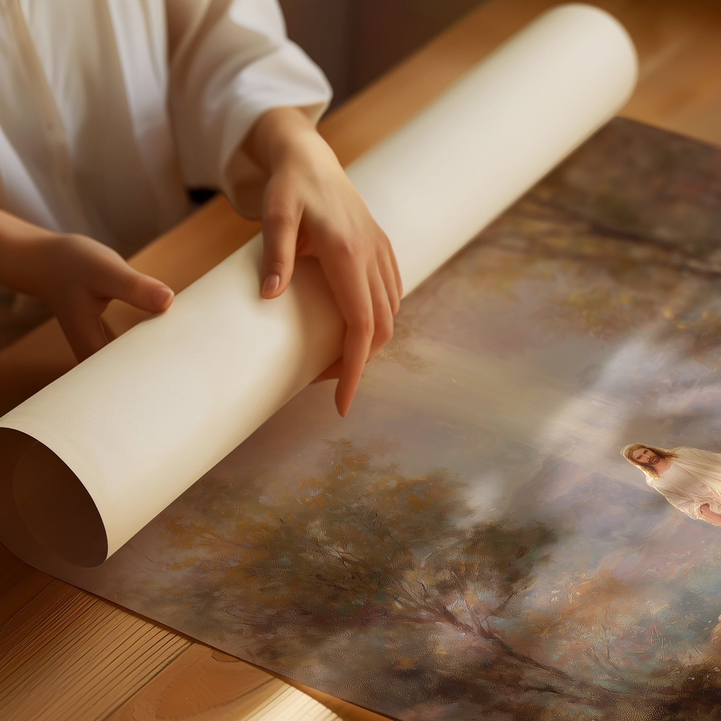 Warm sunbeams pierce through morning mist, illuminating a pastoral scene of tranquility and peace. The soft brushstrokes create a dreamlike quality as autumn trees frame the composition, their golden leaves catching the gentle light. The painting rests on a rustic wooden table, inviting contemplation of simpler times and eternal truths.