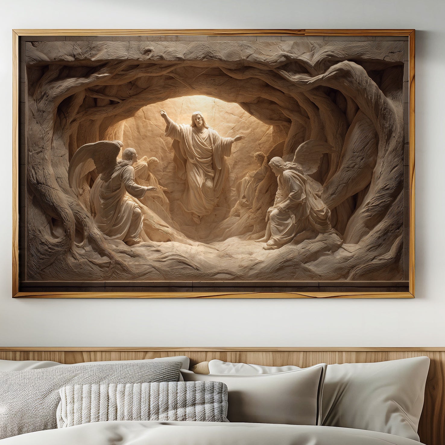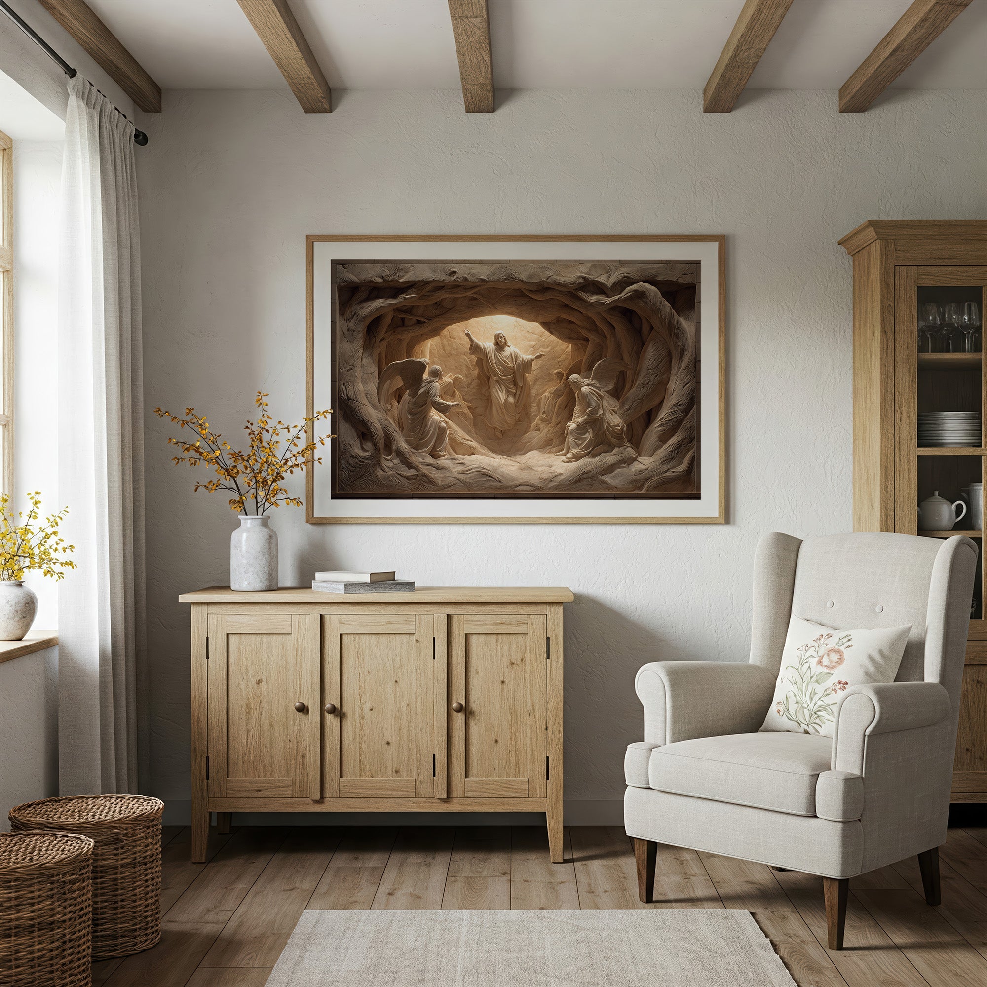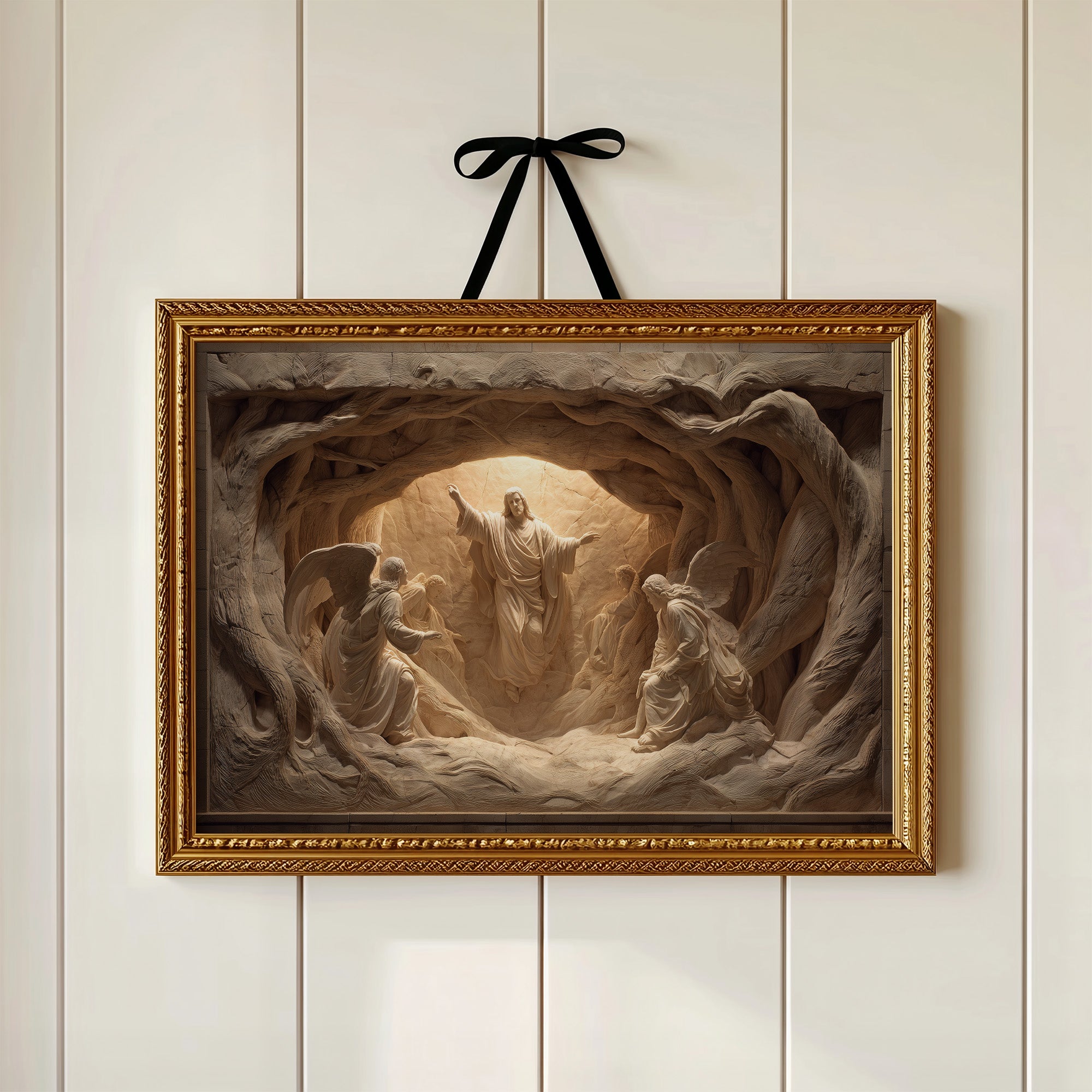 A sacred moment captured in stone relief, where golden light illuminates the central figure rising in triumph. The sculptural artwork depicts a powerful resurrection scene with intricate details of carved rock formations and reverent witnesses gathered in awe. The warm amber glow against the cool gray stone creates a profound sense of transcendence and hope emerging from darkness.