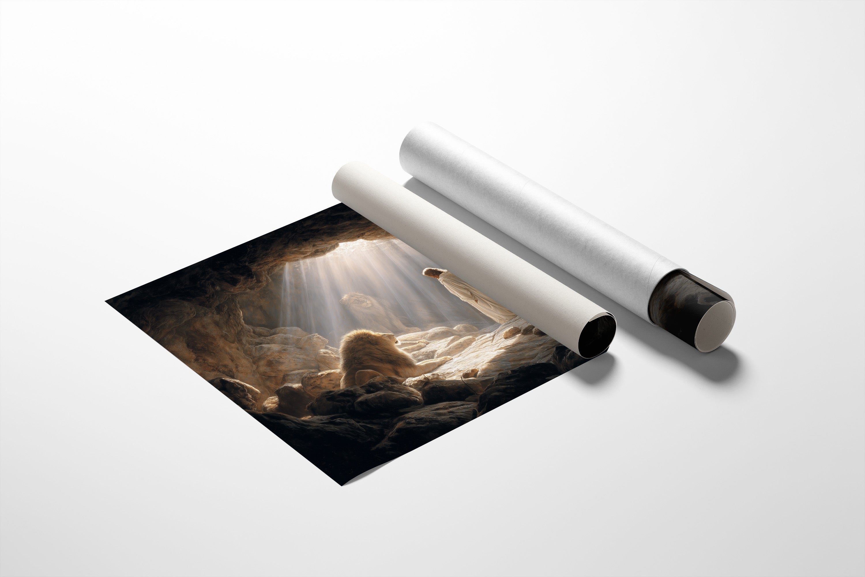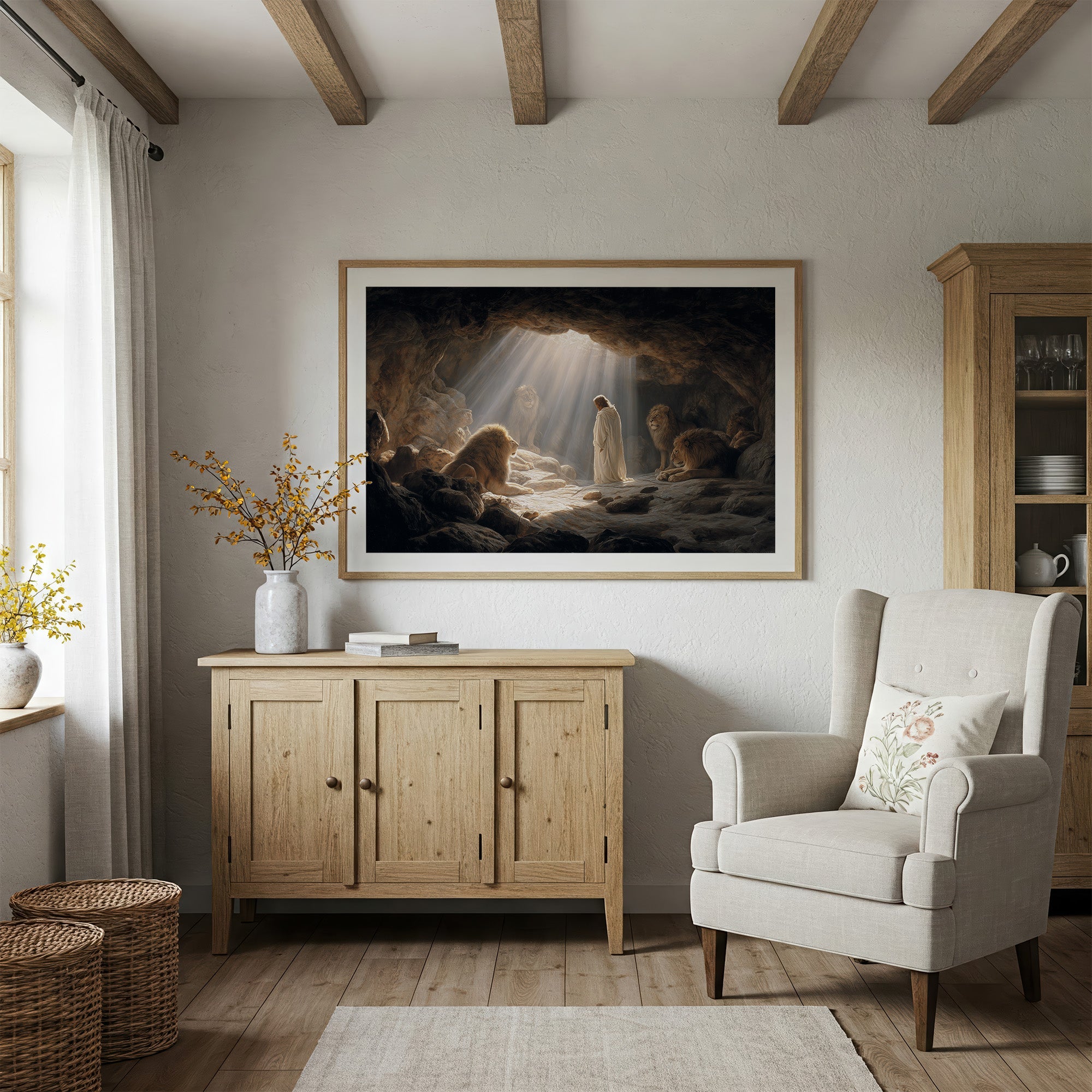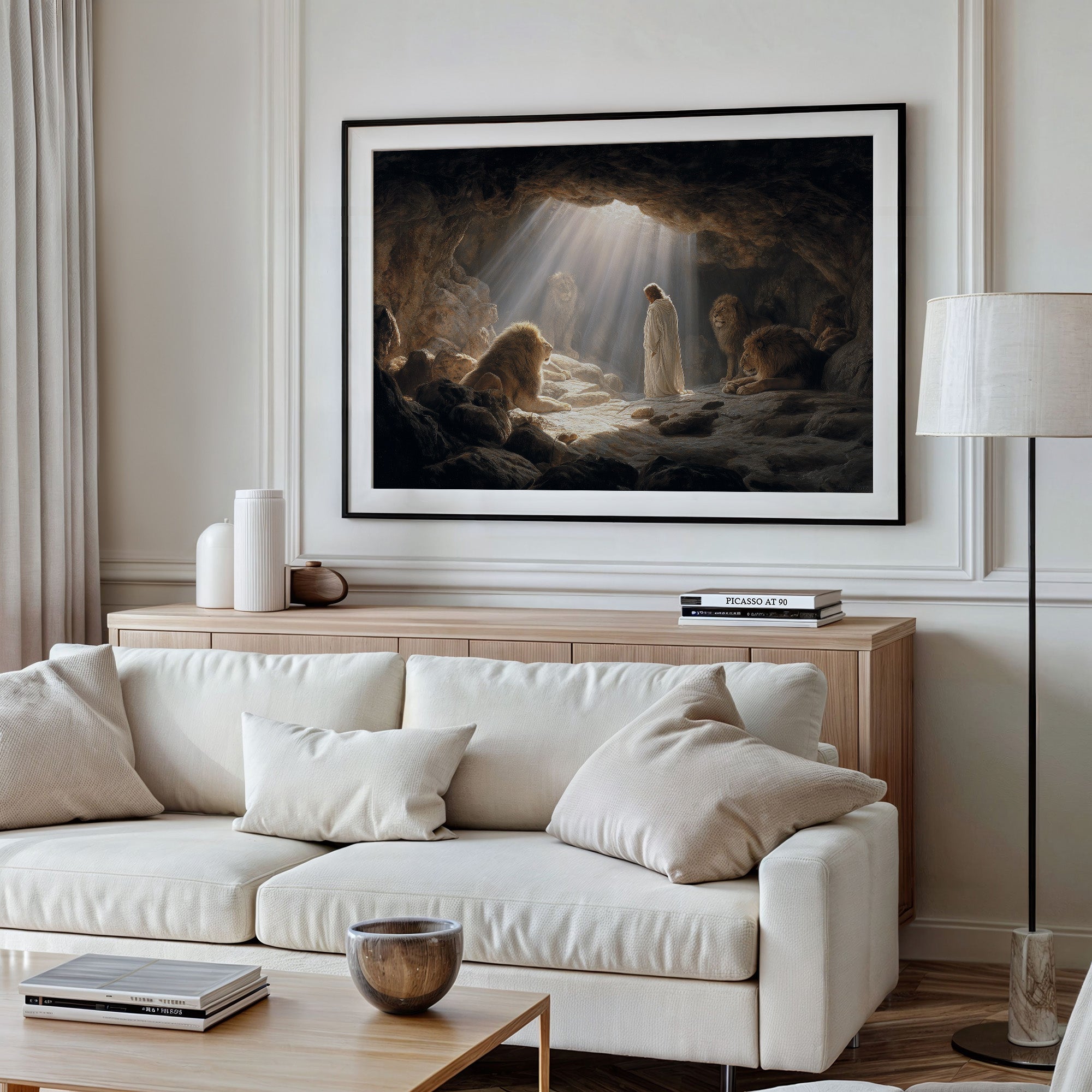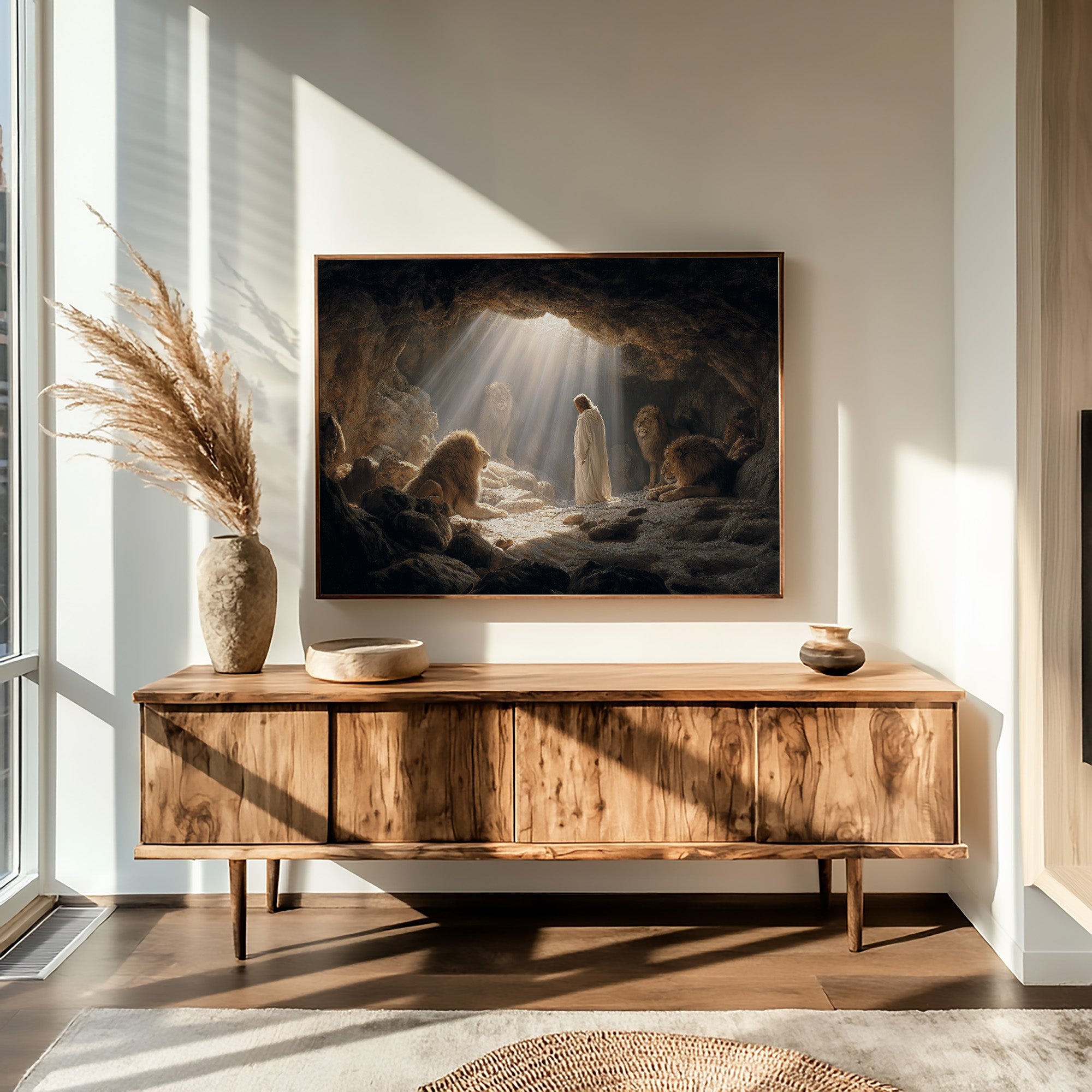 A solitary figure stands bathed in heavenly beams cutting through darkness, surrounded by watchful lions in their rocky sanctuary. The dramatic interplay of shadow and illumination creates a powerful narrative of courage and divine presence, with warm golden light cascading down from above. This contemplative scene rests elegantly among books and dried pampas grass, bringing spiritual depth and artistic sophistication to a home library or meditation space.
