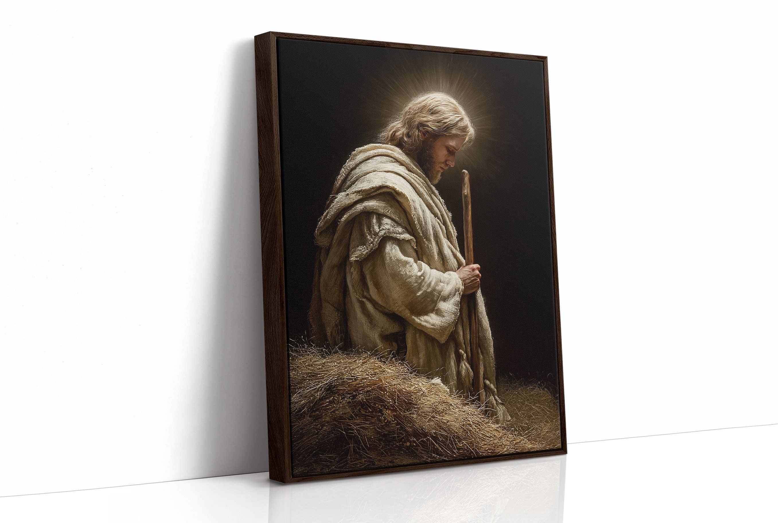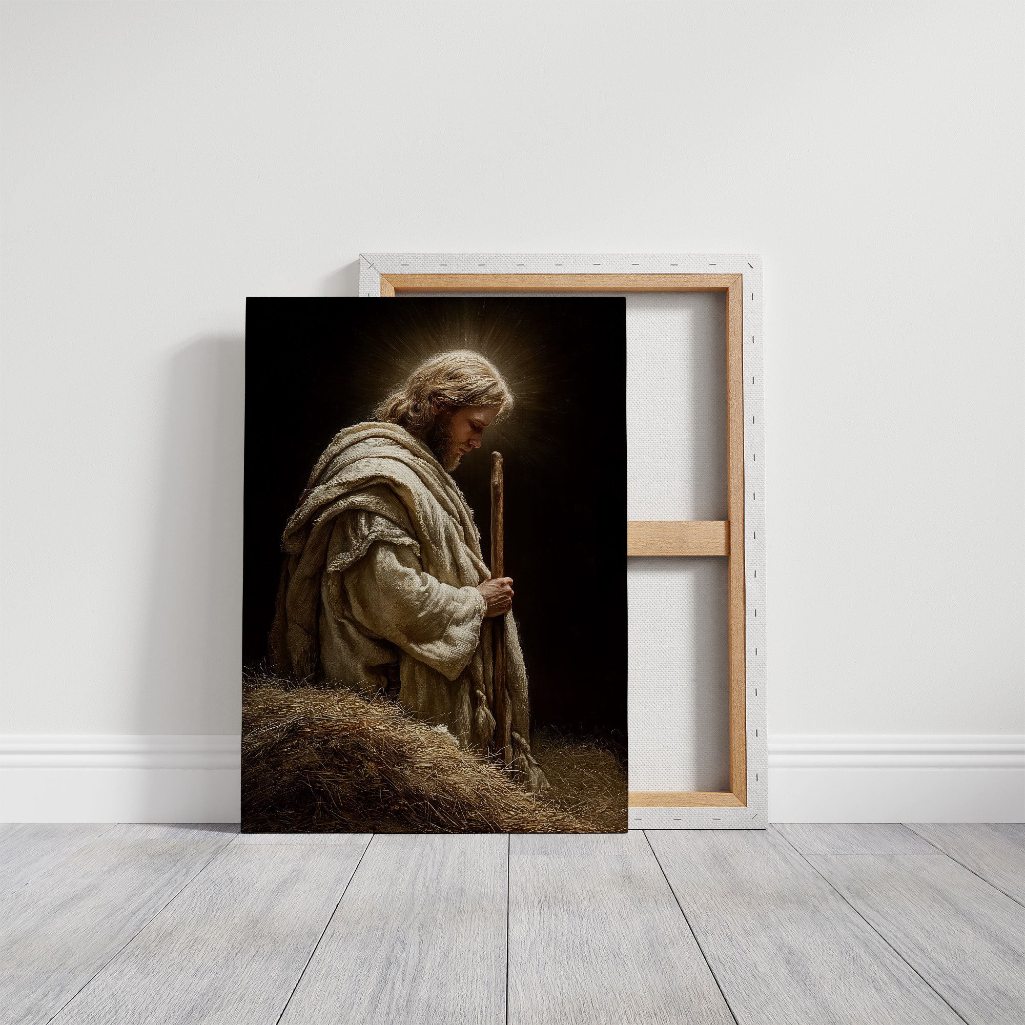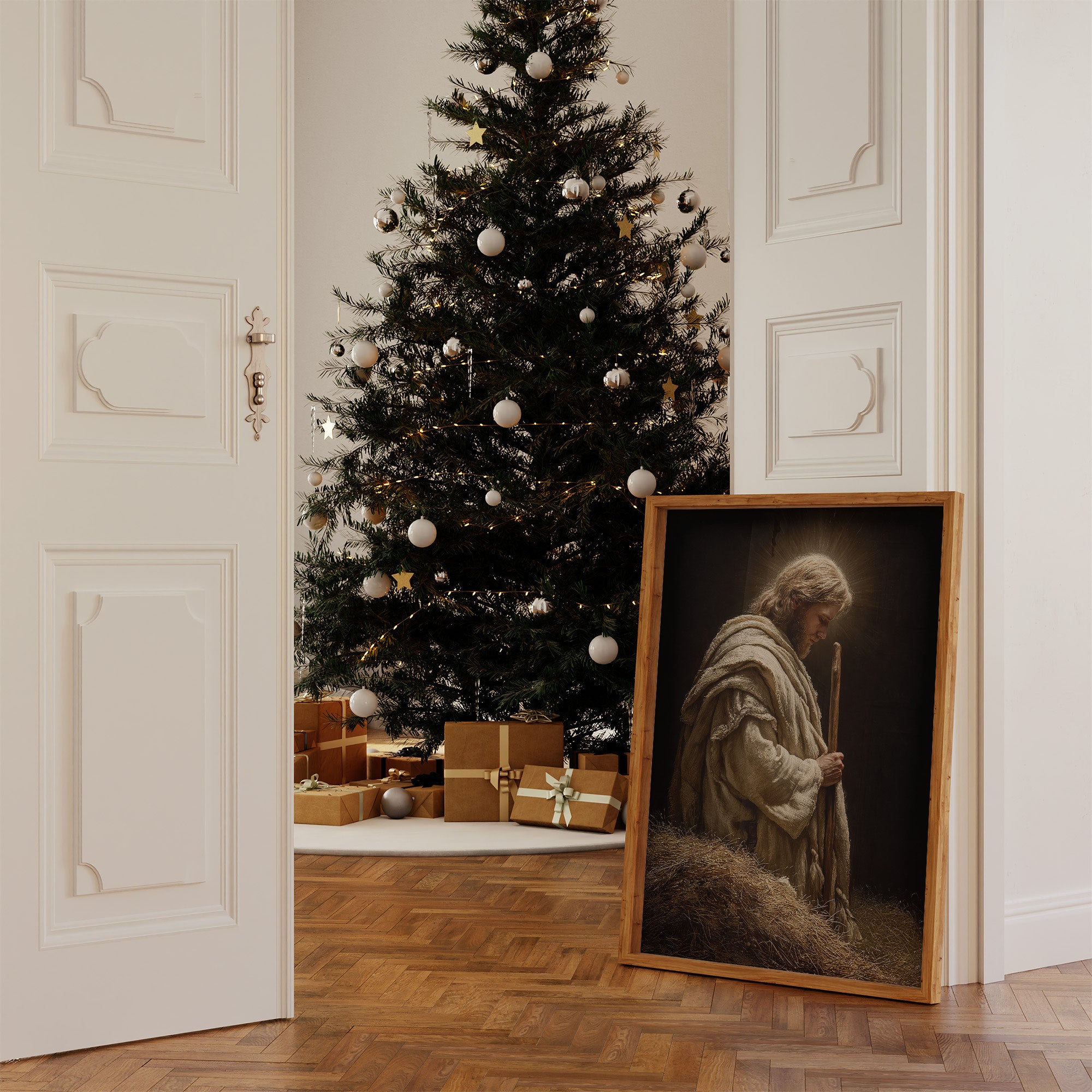 A serene corner captures the essence of divine contemplation, where natural light filters through sheer curtains, casting gentle shadows across cream-colored walls. The striking contrast between the illuminated white Christmas tree and the classical portrait creates a harmonious dialogue between contemporary and traditional spirituality. Rich earth tones in the wooden elements and bench cushion ground the space, while the glowing tree adds an ethereal quality to this thoughtfully curated vignette. This piece would bring a sense of peaceful reflection to a meditation room, prayer space, or quiet reading nook.