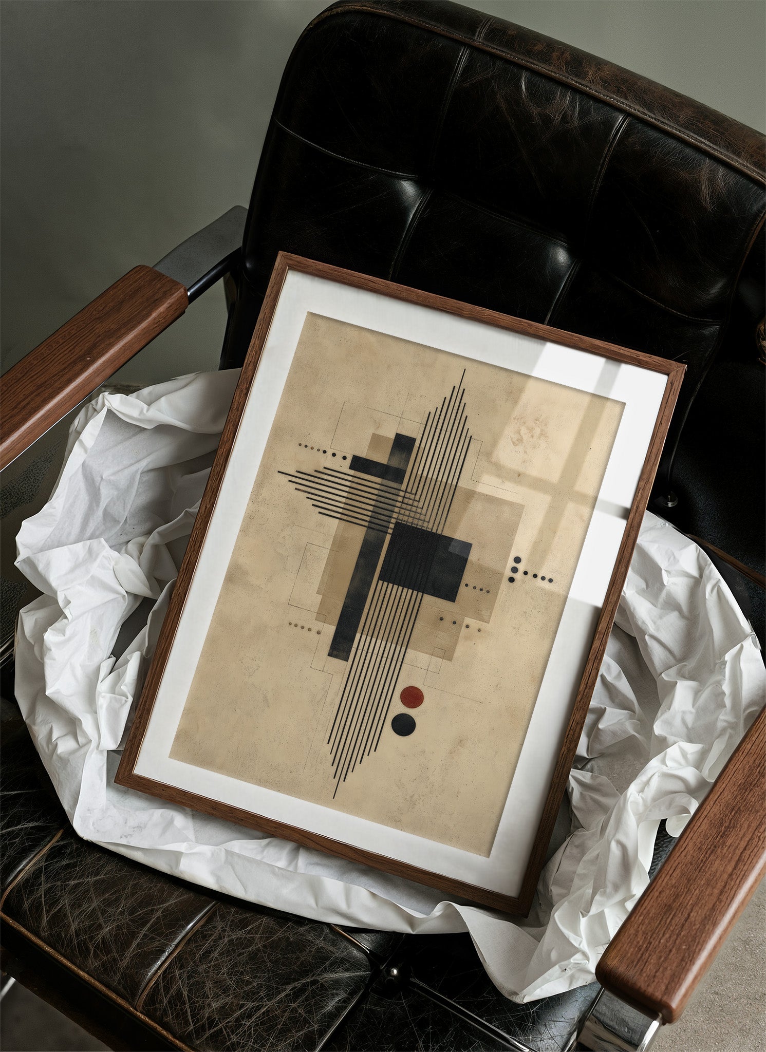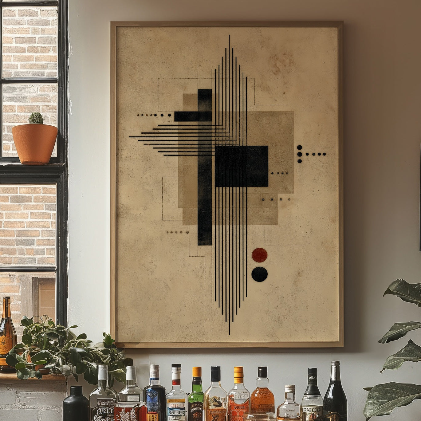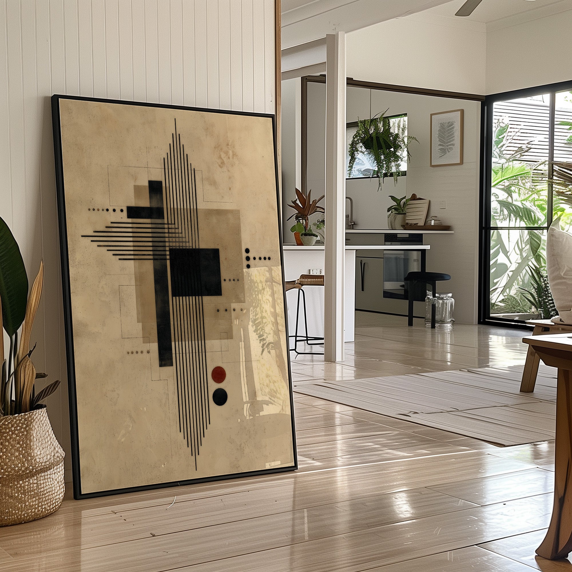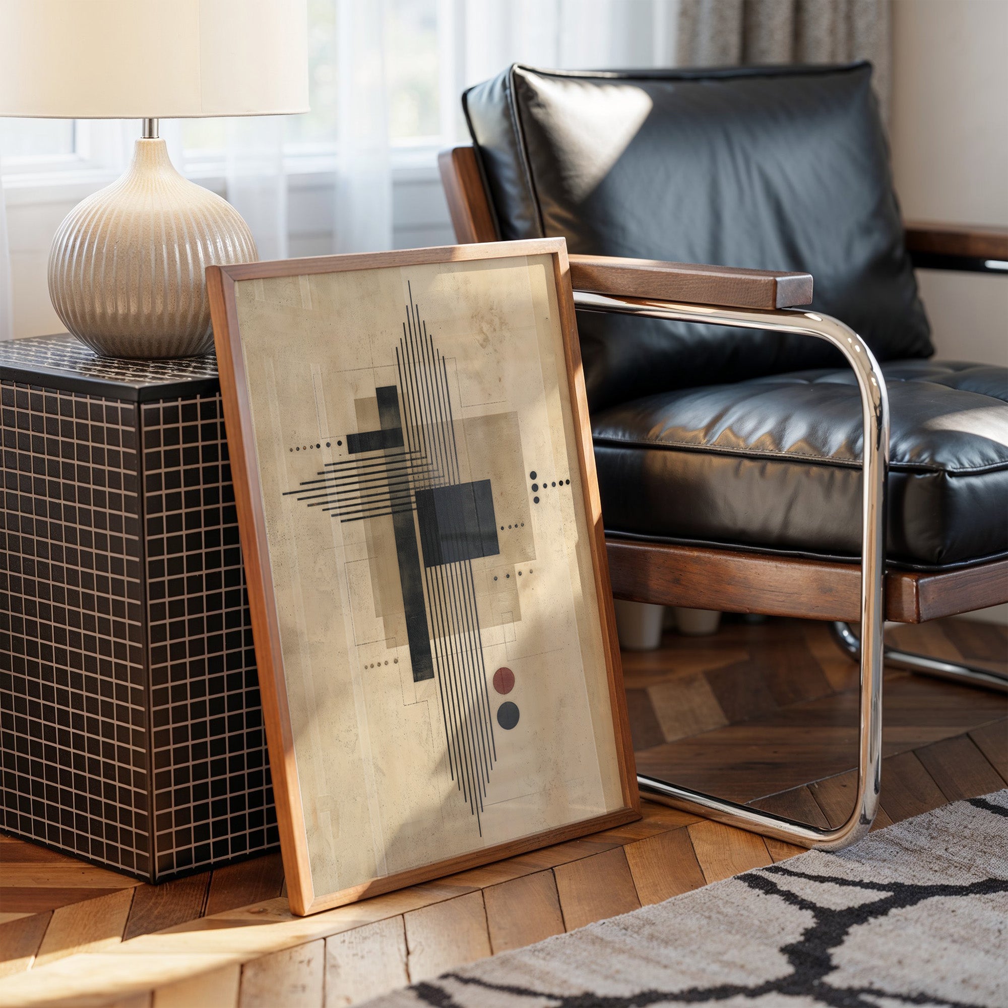 Sunlight streams across a sophisticated living space, casting geometric shadows that complement the abstract artwork's clean lines and neutral palette. The composition balances warm wood tones against chrome and leather, creating a harmonious dialogue between vintage and contemporary elements. The modernist print, with its architectural precision and subtle color dots, anchors the scene while a ribbed ceramic lamp adds organic texture to this carefully curated corner.