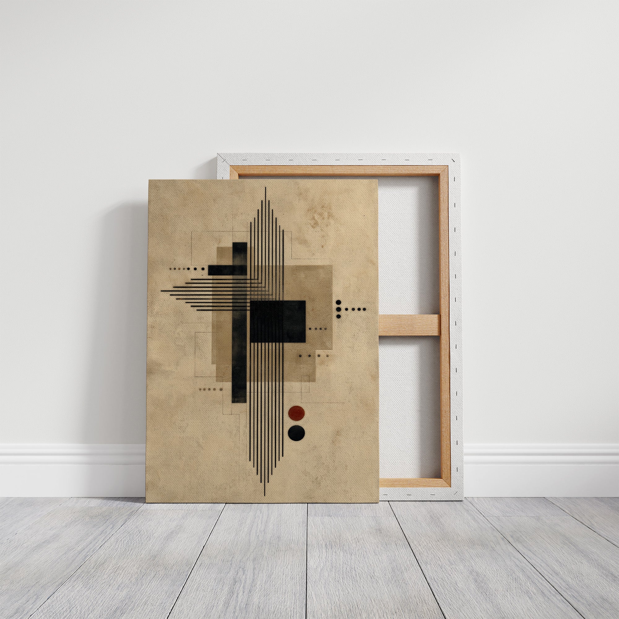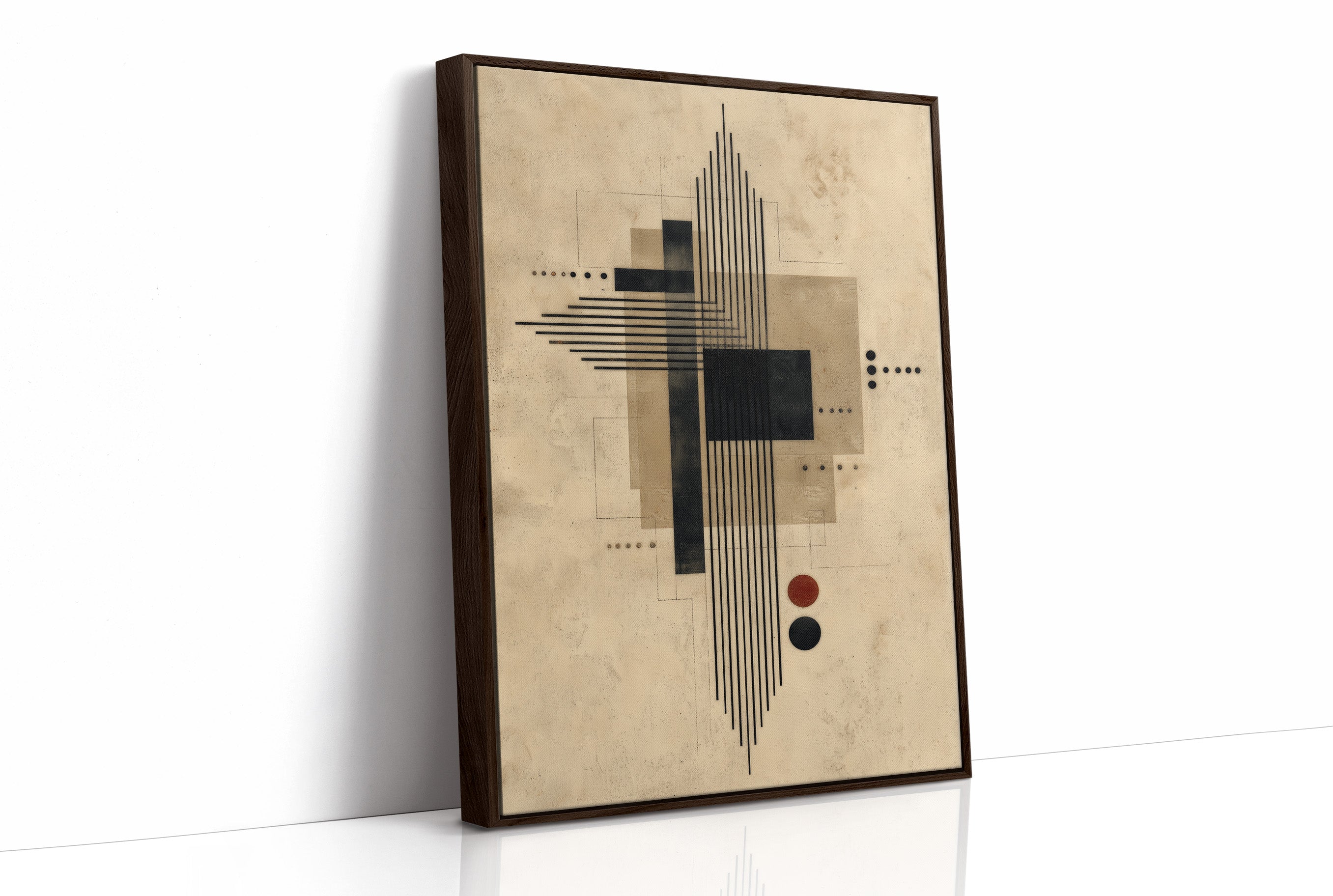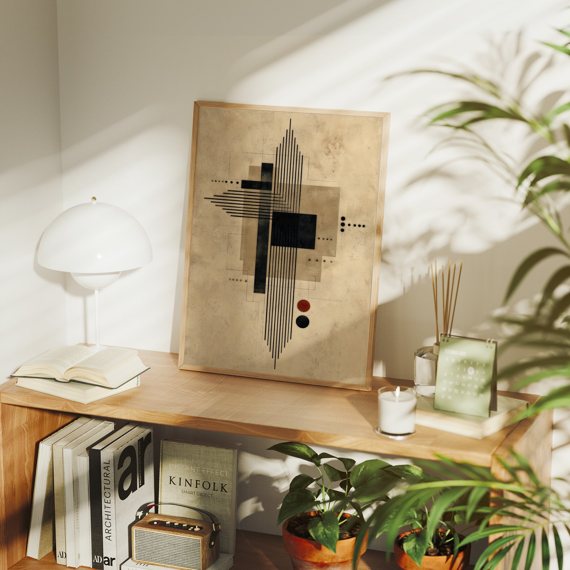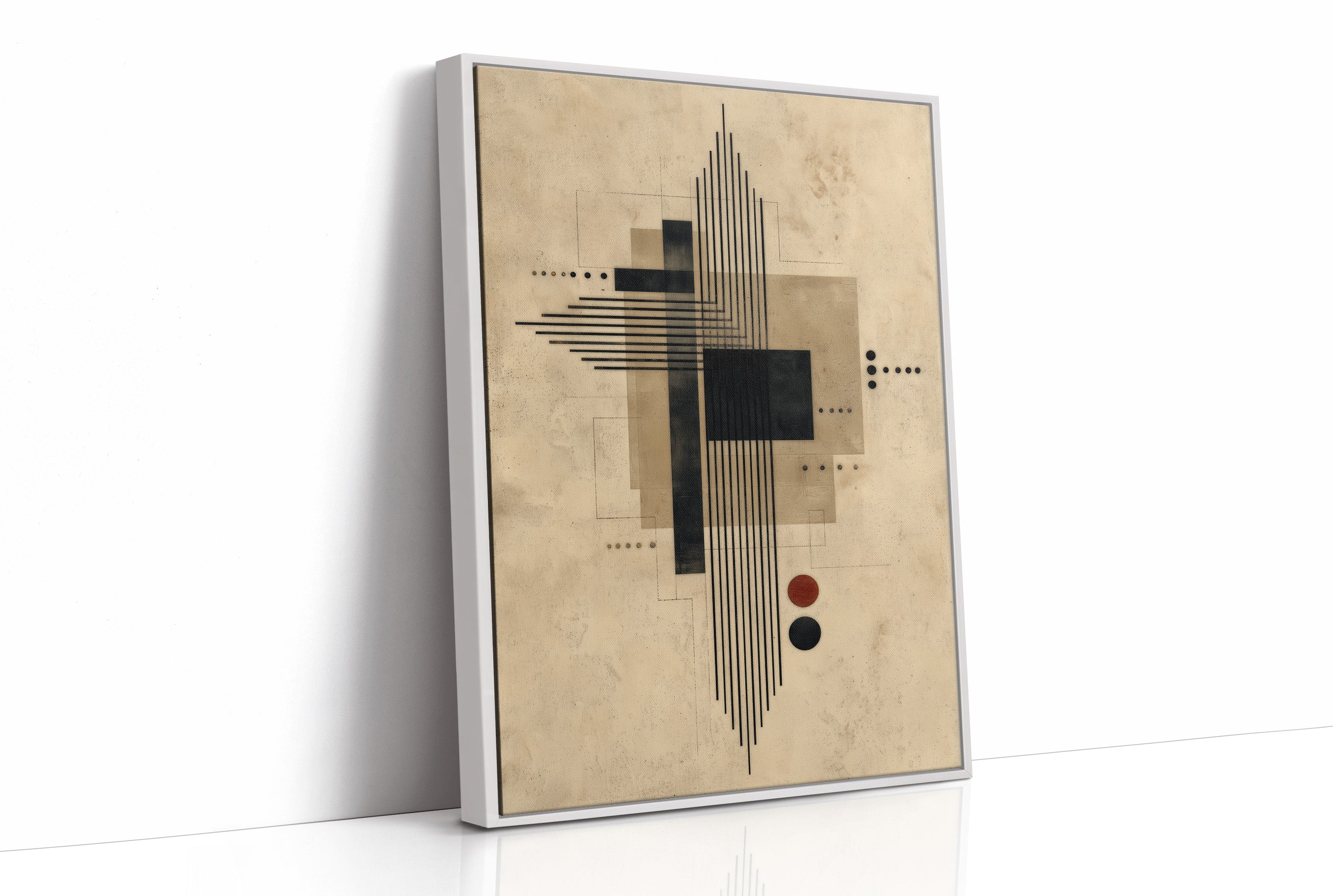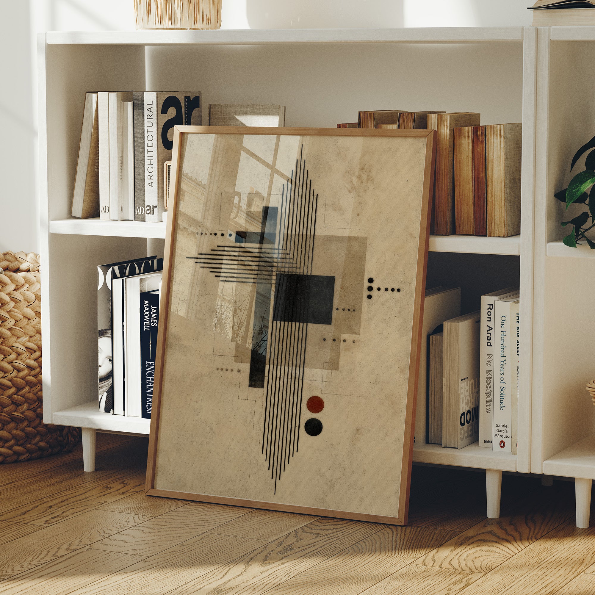 Sunlight streams across a sophisticated living space, casting geometric shadows that complement the abstract artwork's clean lines and neutral palette. The composition balances warm wood tones against chrome and leather, creating a harmonious dialogue between vintage and contemporary elements. The modernist print, with its architectural precision and subtle color dots, anchors the scene while a ribbed ceramic lamp adds organic texture to this carefully curated corner.