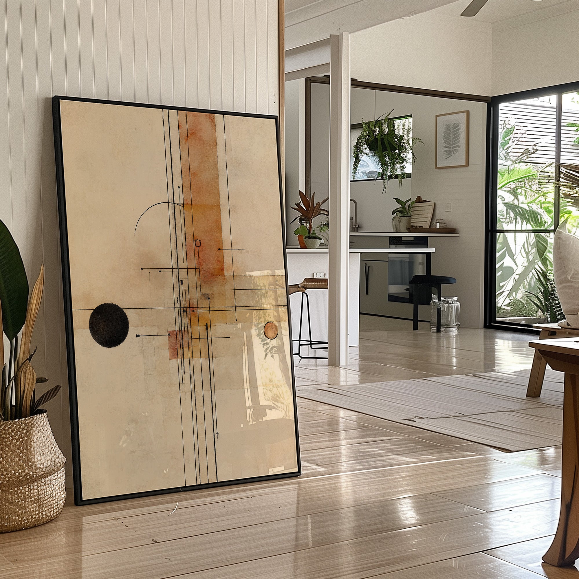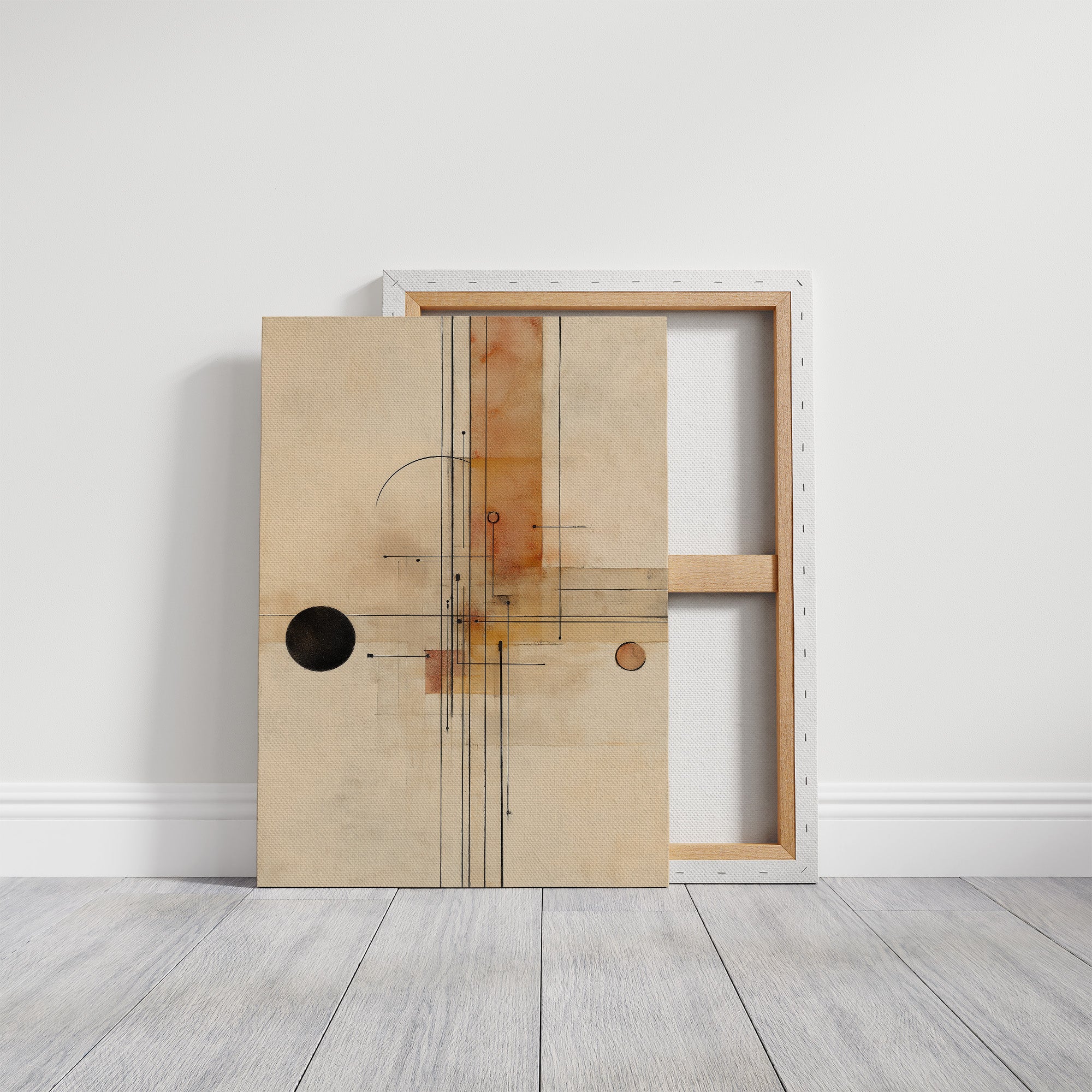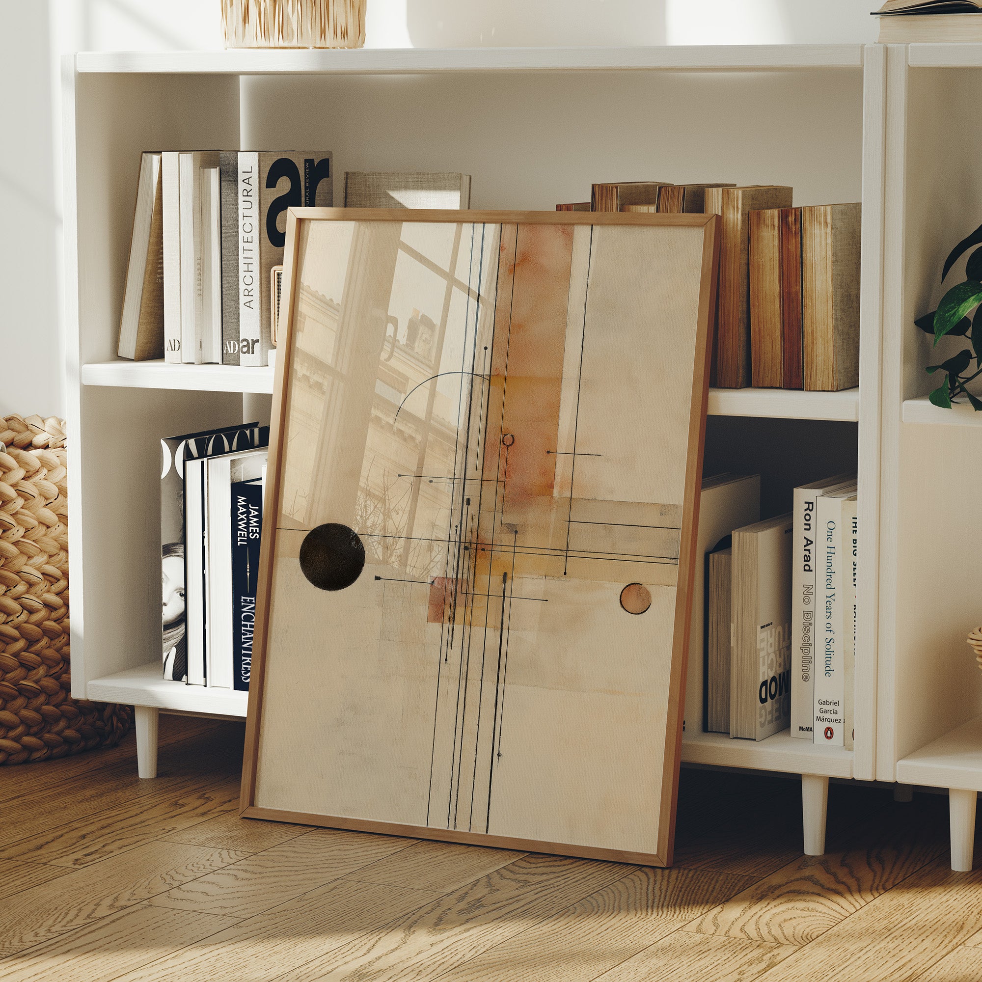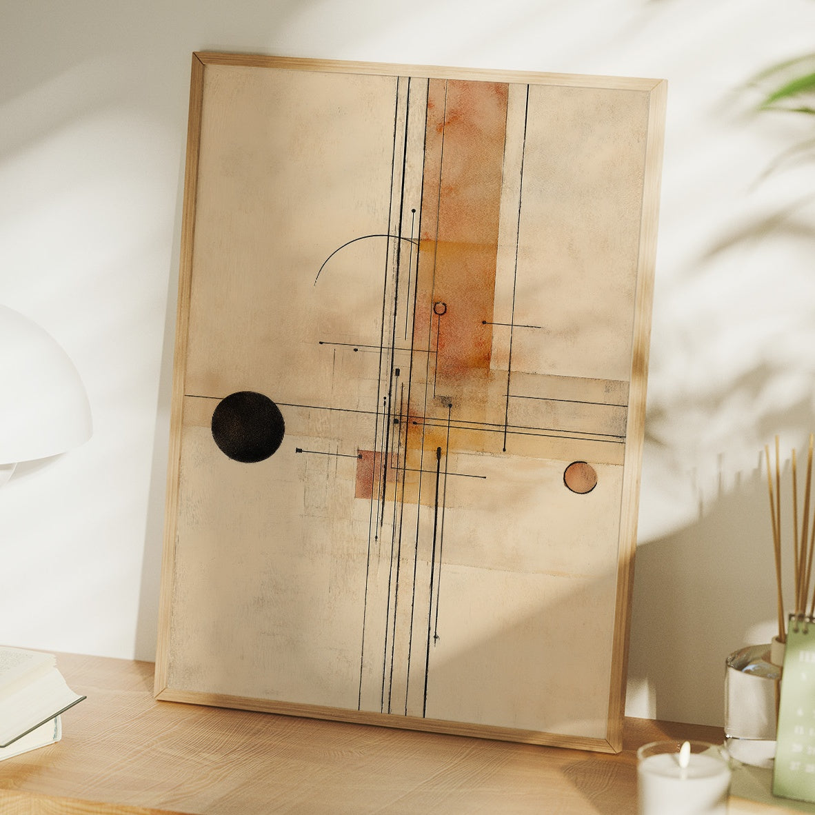 Delicate black lines traverse a warm, sandy canvas like early morning shadows stretching across desert dunes. The composition balances geometric precision with organic warmth, where circles float like distant suns against a peaceful neutral backdrop. The interplay of straight lines and gentle washes of peach and cream creates a meditative rhythm that speaks of both structure and freedom. This sophisticated piece would elevate a modern home office or reading nook, bringing calm sophistication to any thoughtfully curated space.