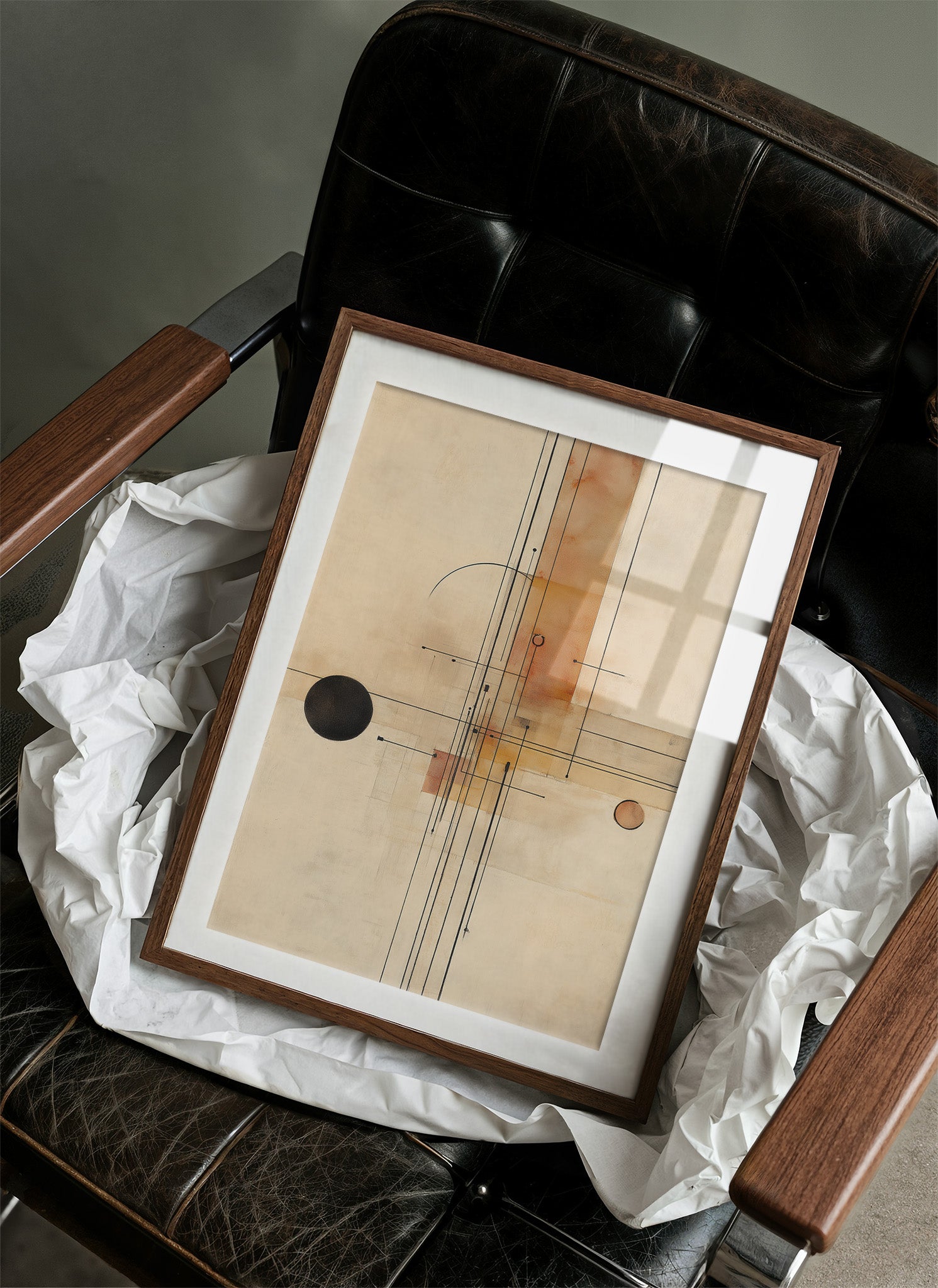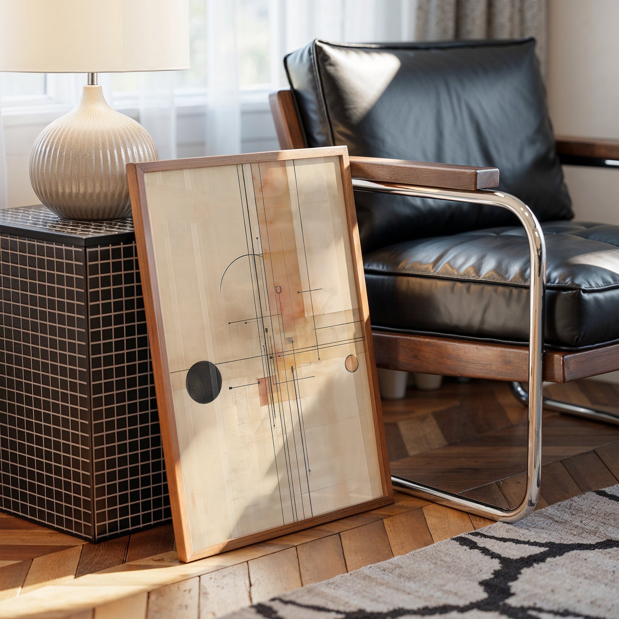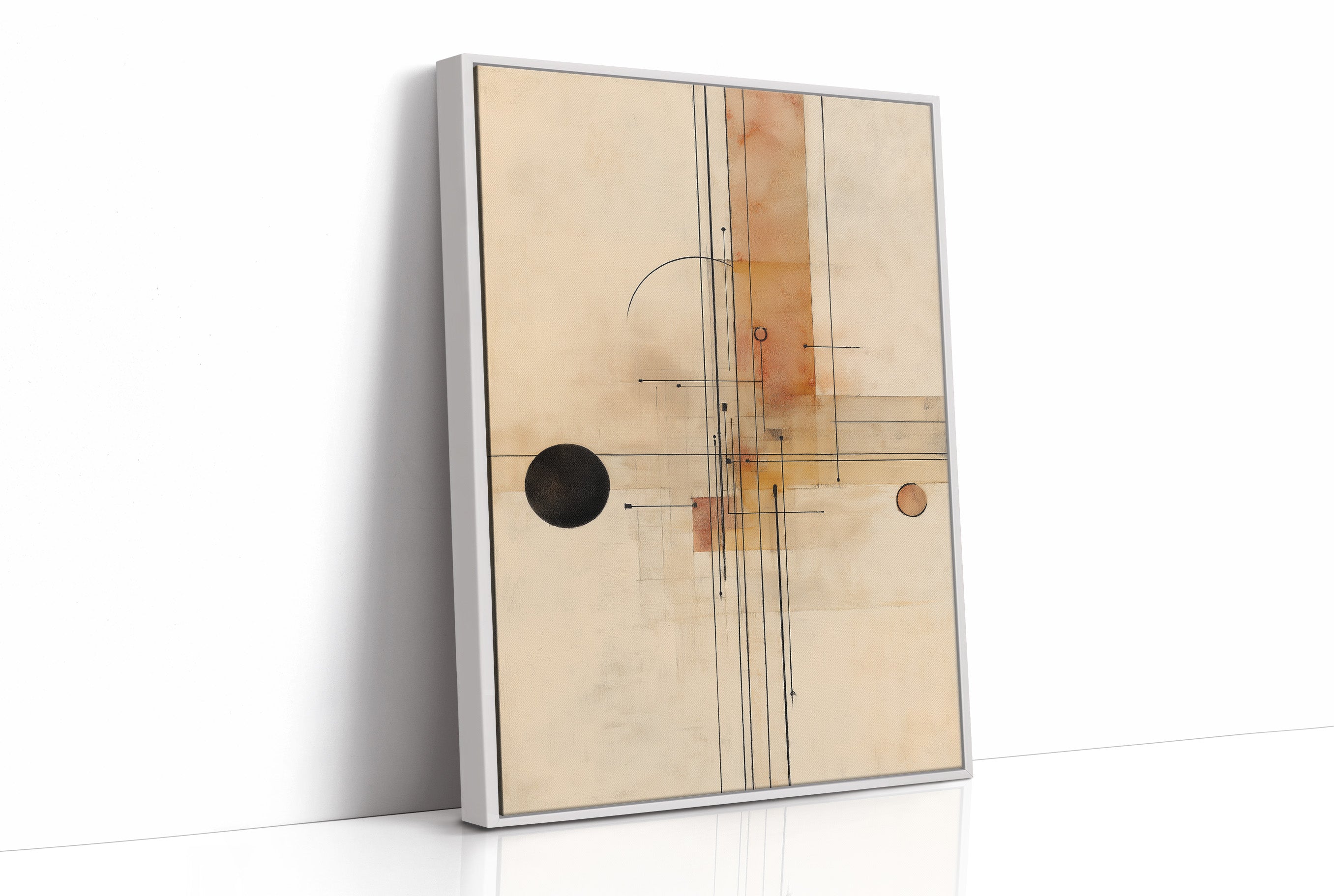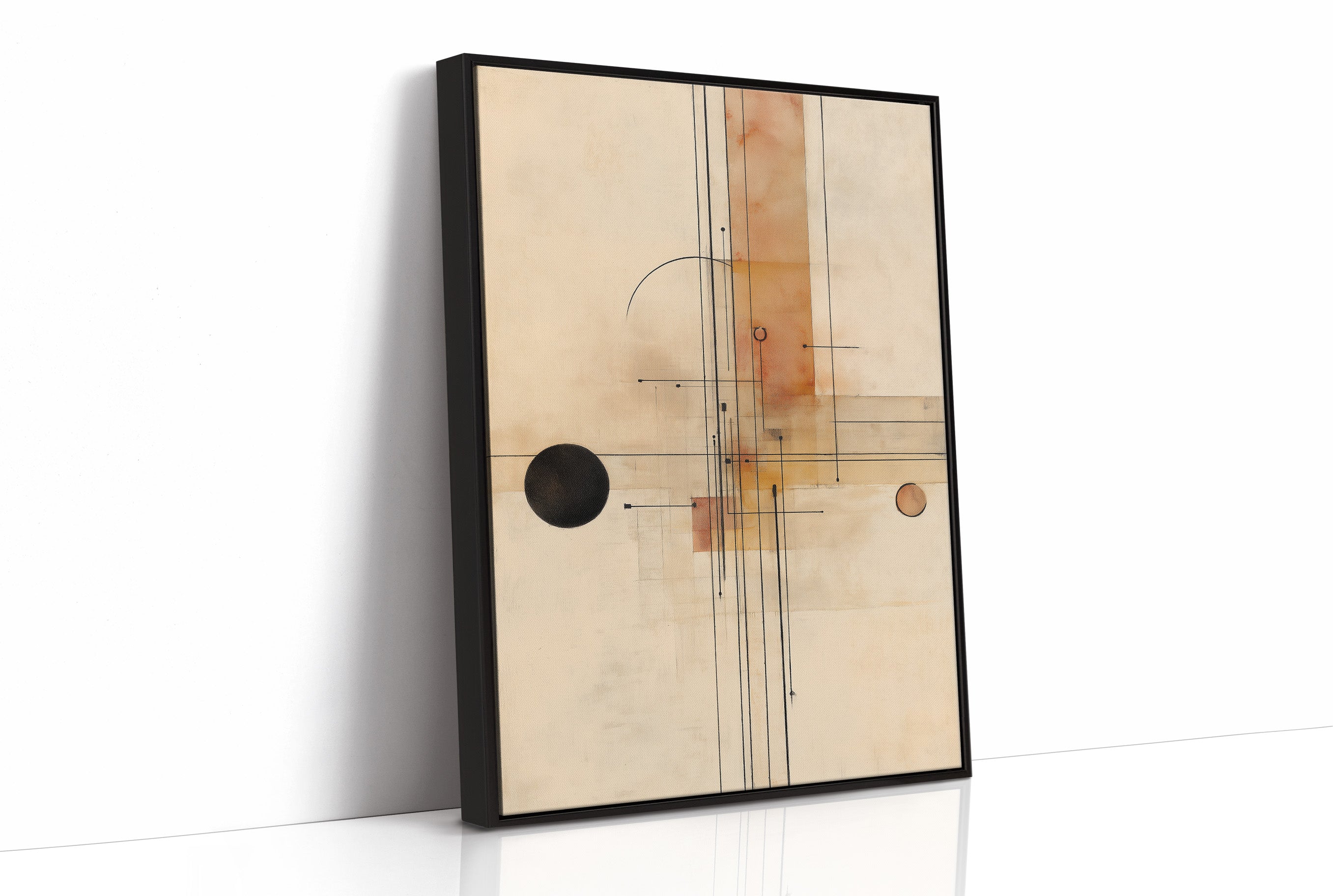 Delicate black lines traverse a warm, sandy canvas like early morning shadows stretching across desert dunes. The composition balances geometric precision with organic warmth, where circles float like distant suns against a peaceful neutral backdrop. The interplay of straight lines and gentle washes of peach and cream creates a meditative rhythm that speaks of both structure and freedom. This sophisticated piece would elevate a modern home office or reading nook, bringing calm sophistication to any thoughtfully curated space.