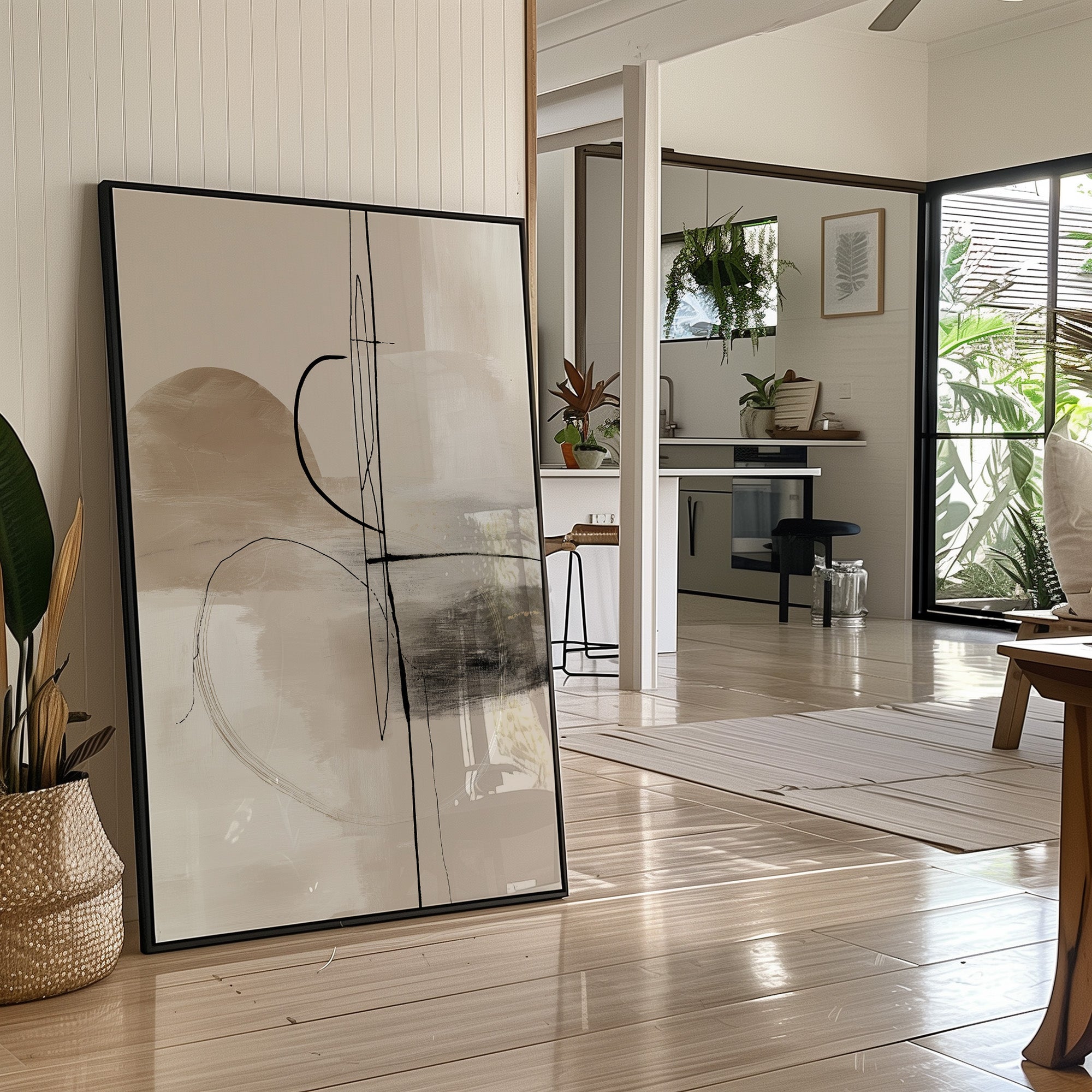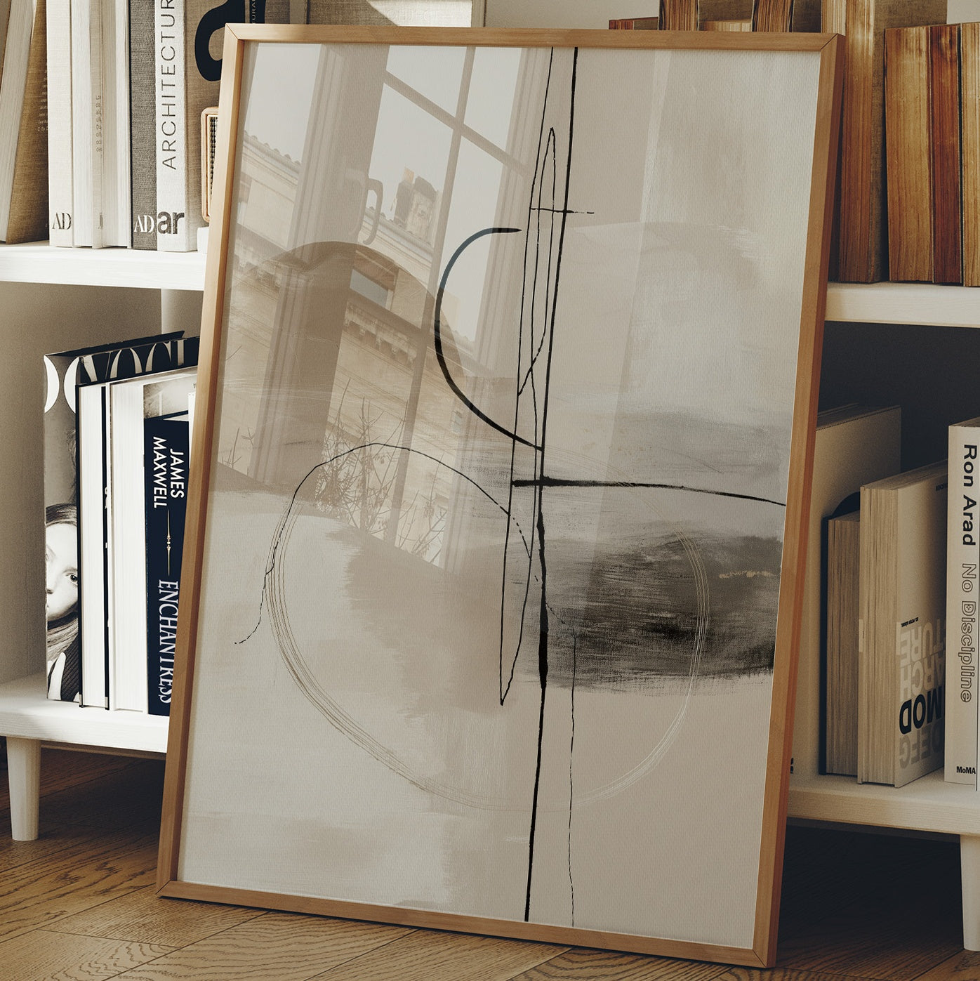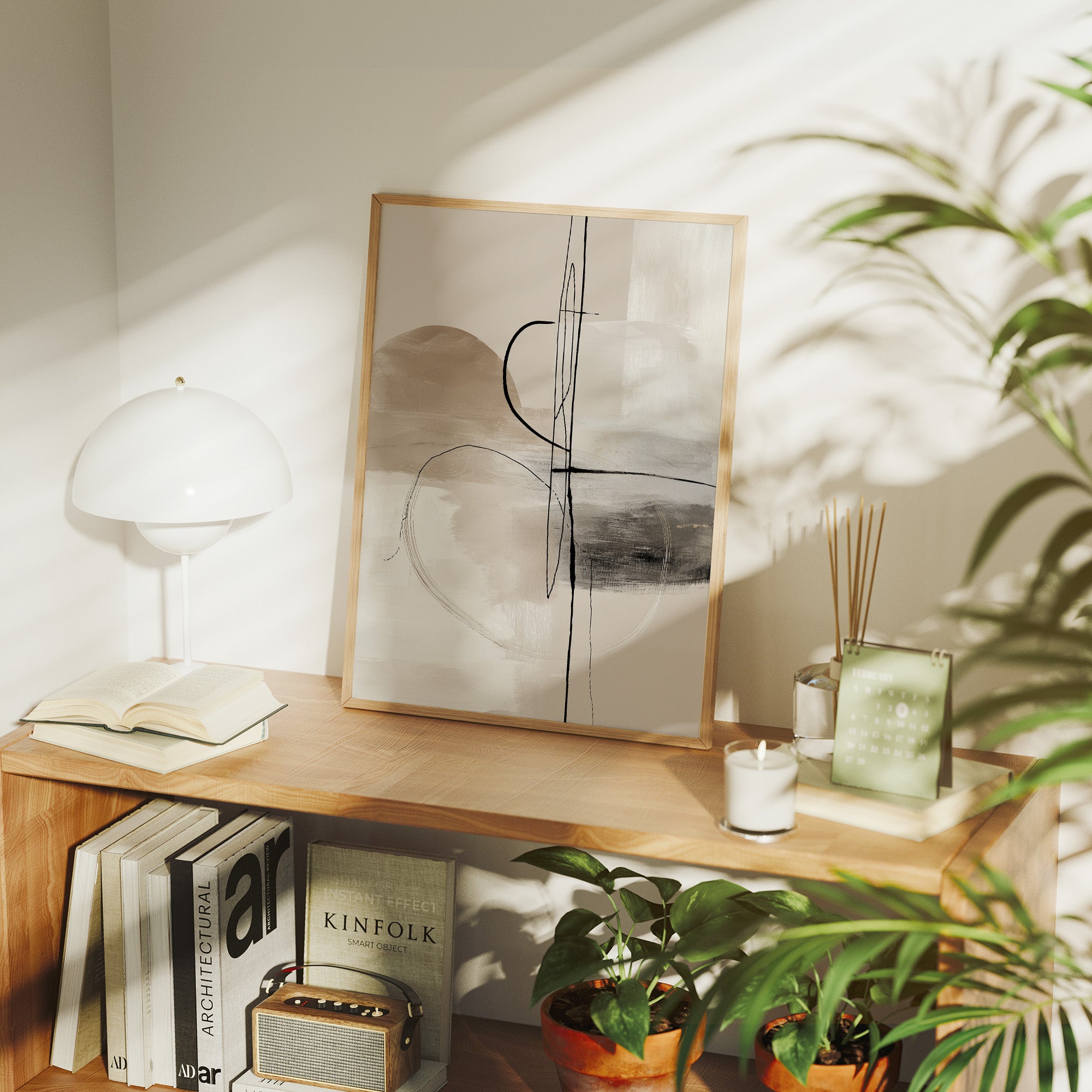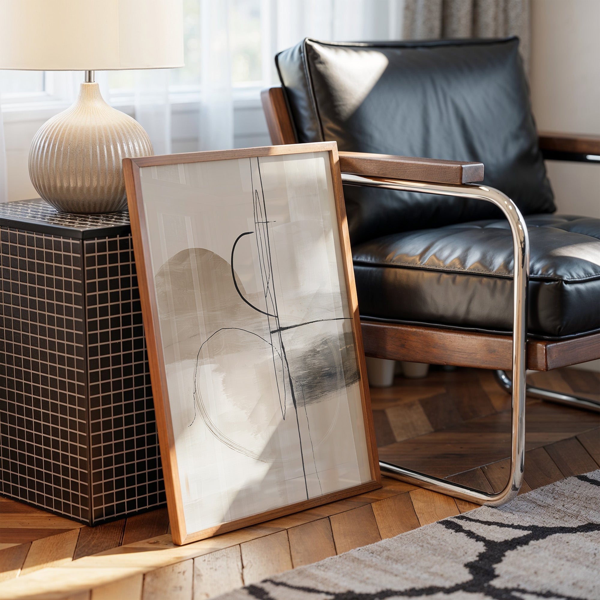 Sunlight streams across a serene corner, casting gentle shadows that play with a minimalist abstract piece. The artwork's bold black lines and subtle grey washes create a contemplative dialogue with negative space, while natural light bathes the scene in warmth. A thoughtfully curated vignette emerges with design books, a modern dome lamp, and lush greenery offering organic contrast to the geometric composition. This piece would elevate a reading nook or home office, creating a sophisticated focal point that invites both reflection and creativity.