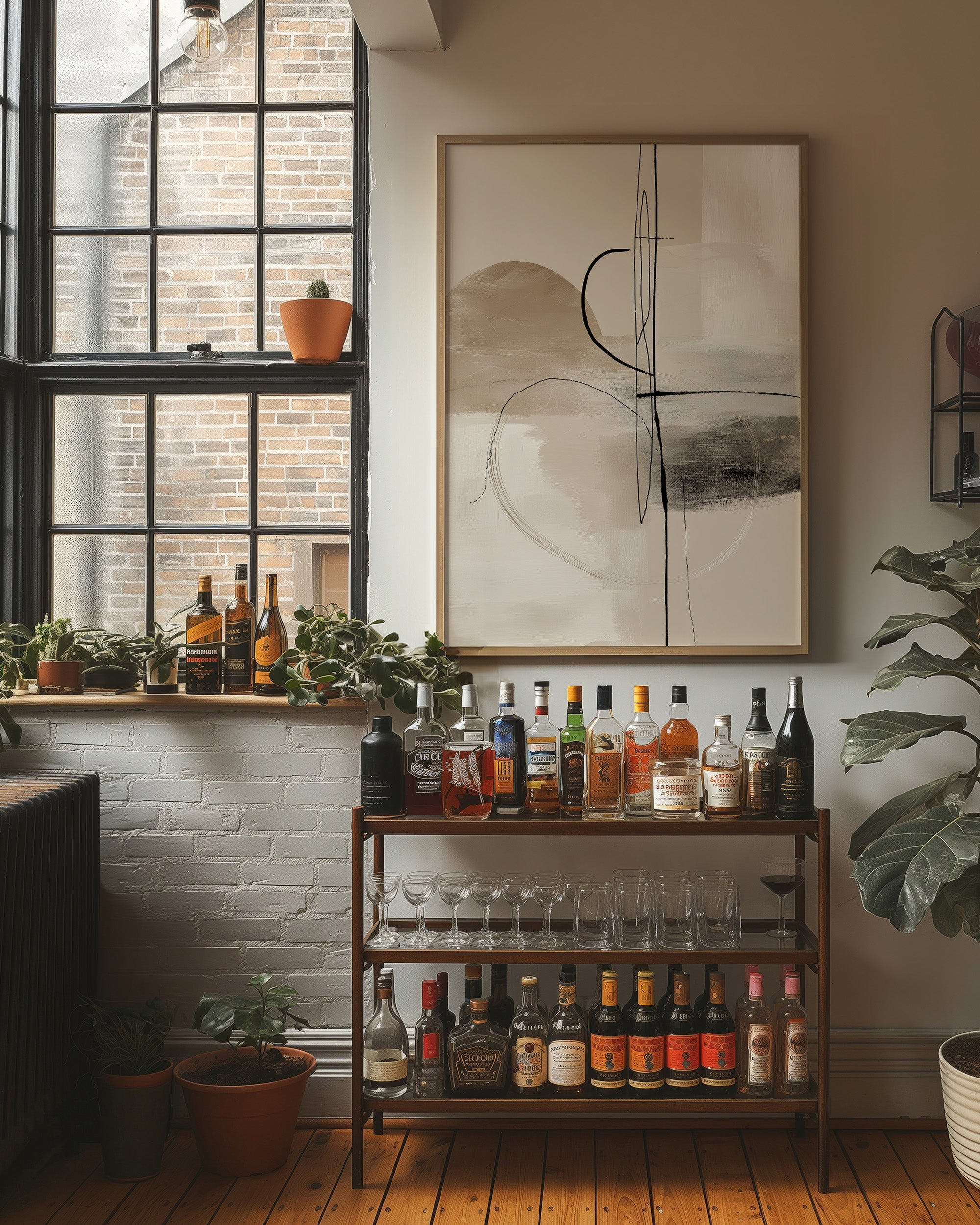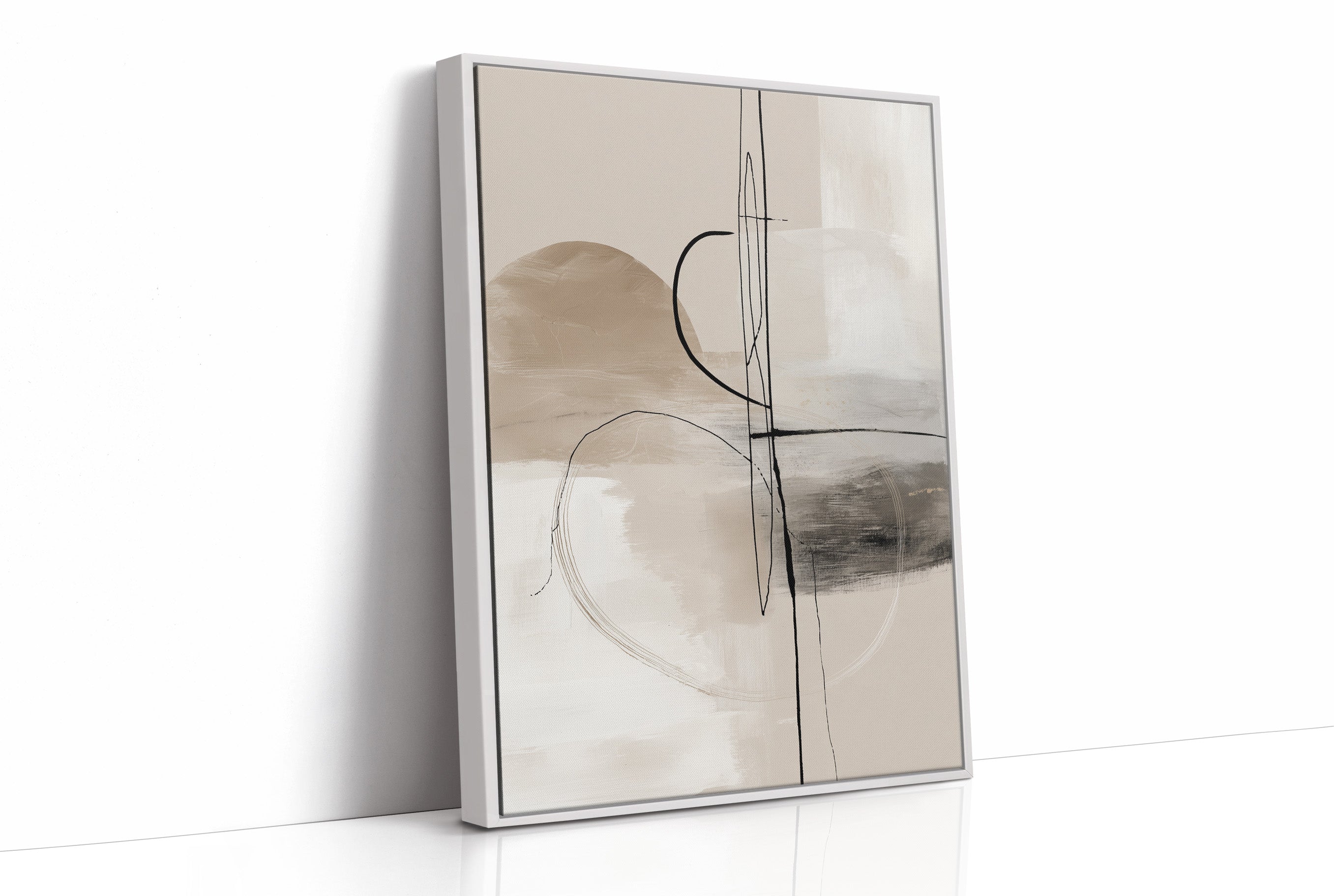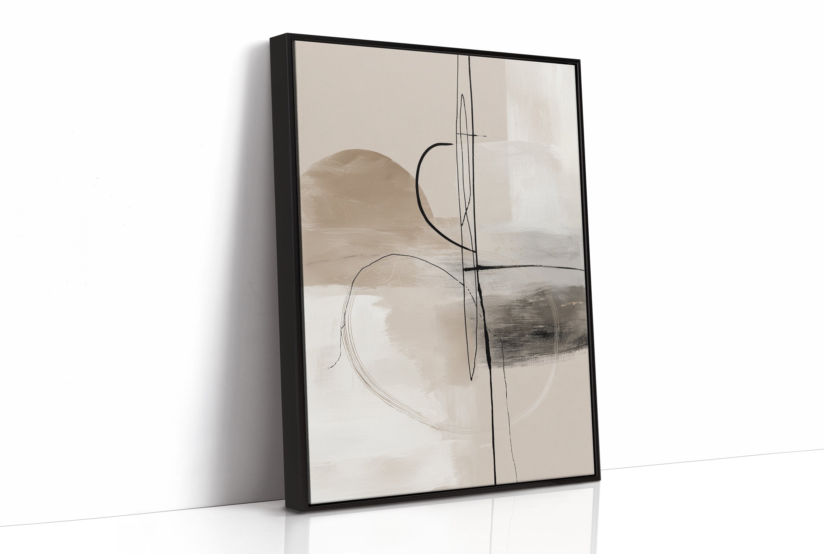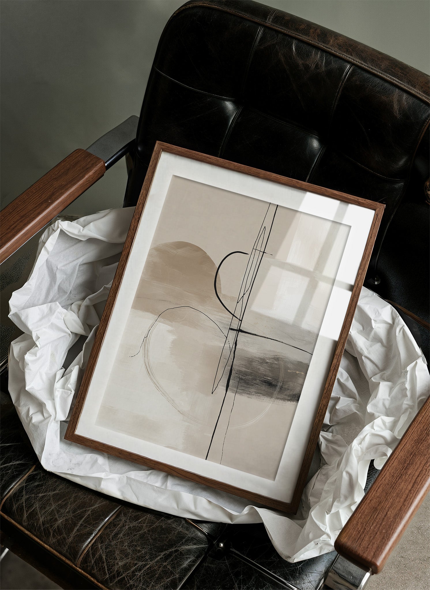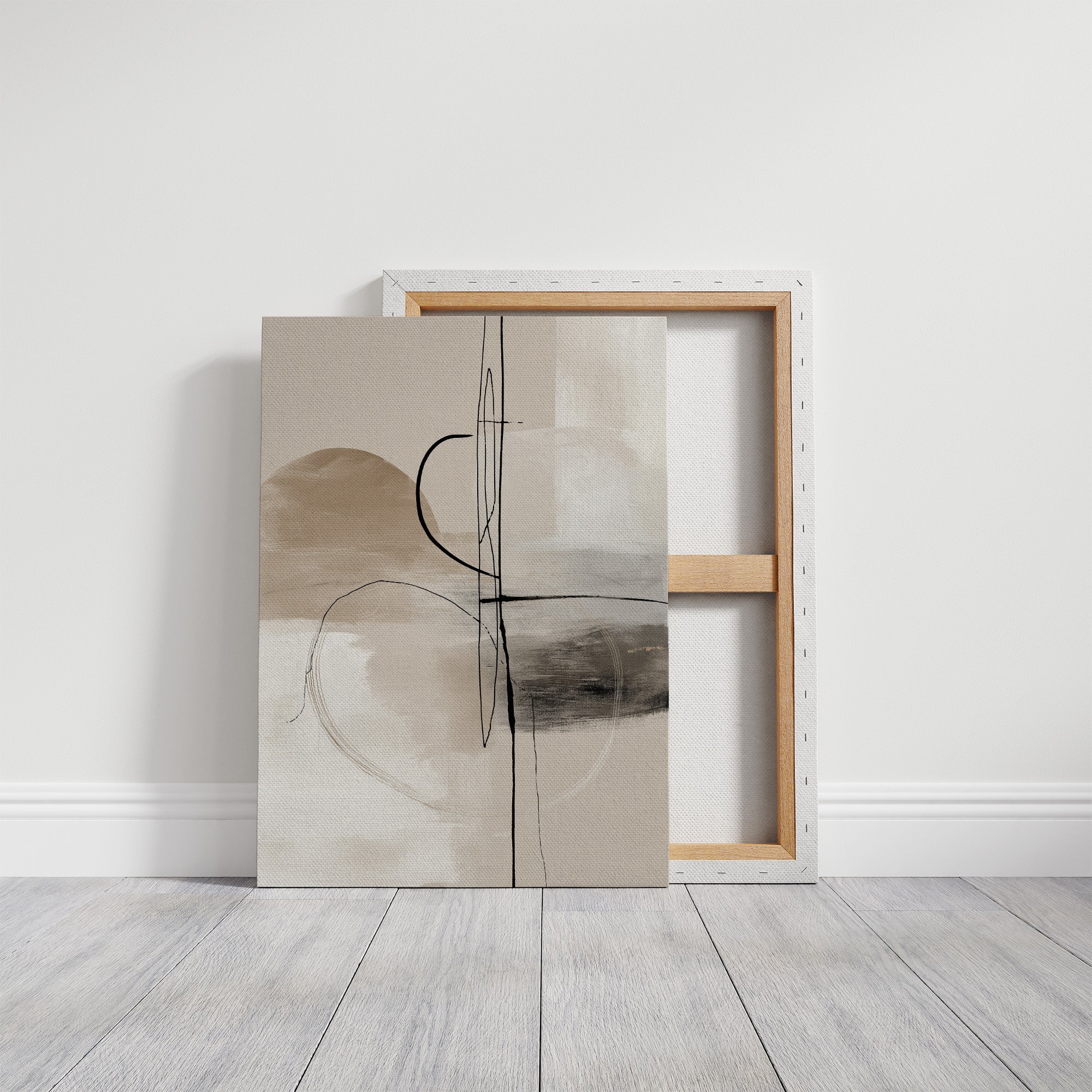 Sunlight streams across a serene corner, casting gentle shadows that play with a minimalist abstract piece. The artwork's bold black lines and subtle grey washes create a contemplative dialogue with negative space, while natural light bathes the scene in warmth. A thoughtfully curated vignette emerges with design books, a modern dome lamp, and lush greenery offering organic contrast to the geometric composition. This piece would elevate a reading nook or home office, creating a sophisticated focal point that invites both reflection and creativity.