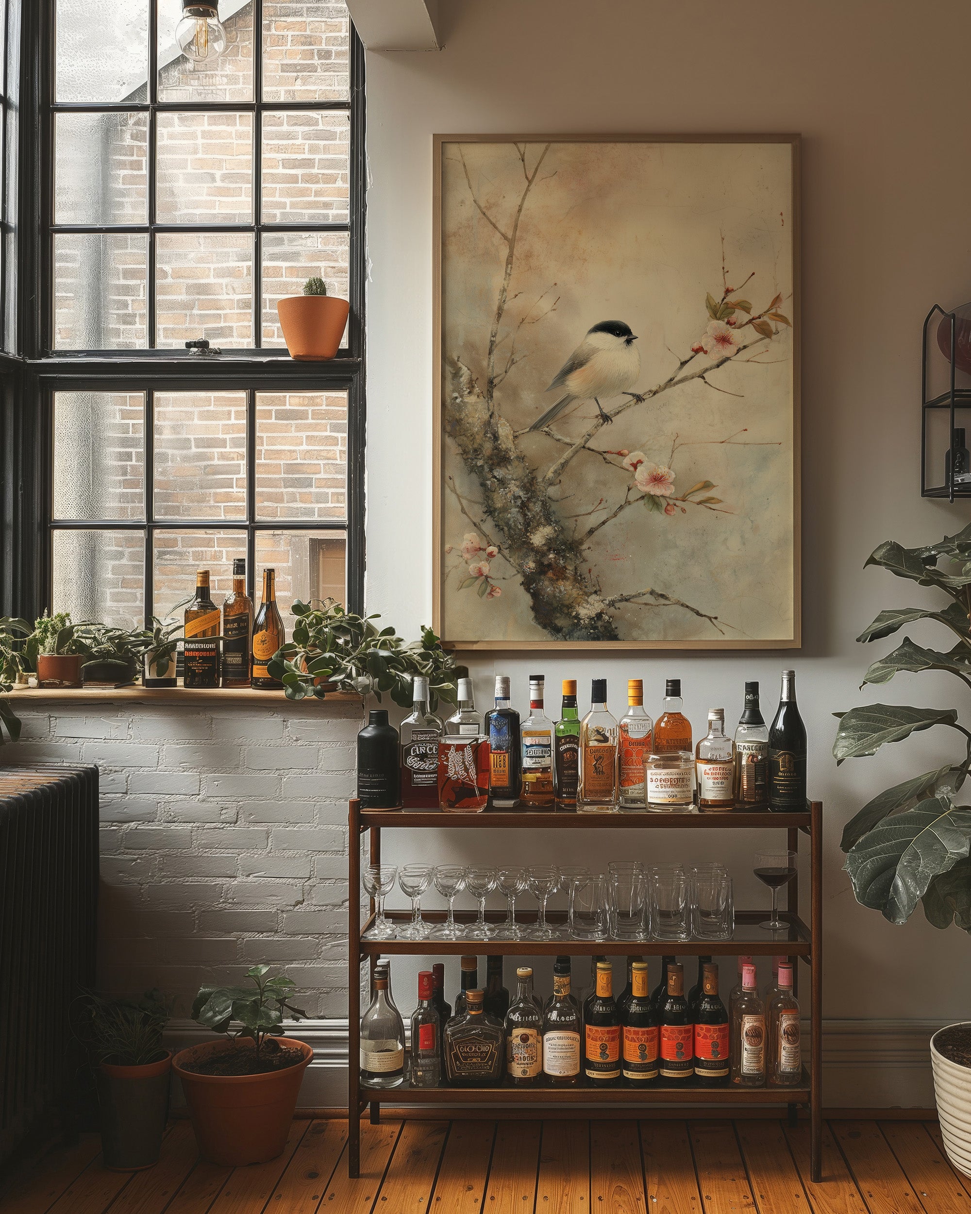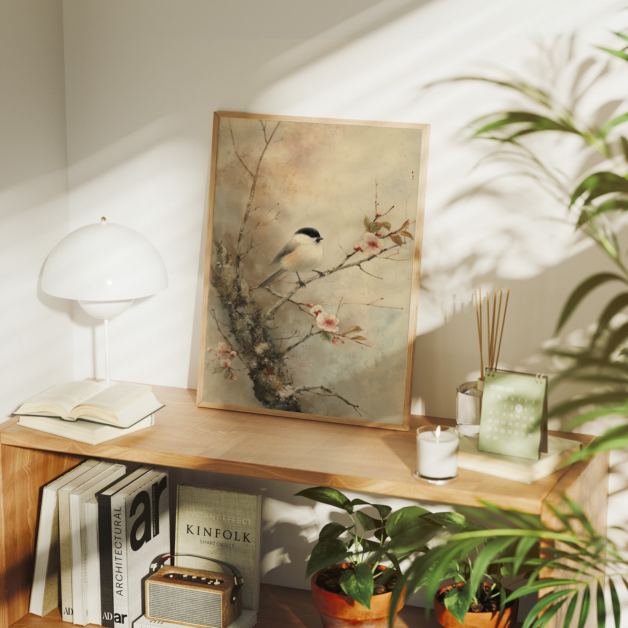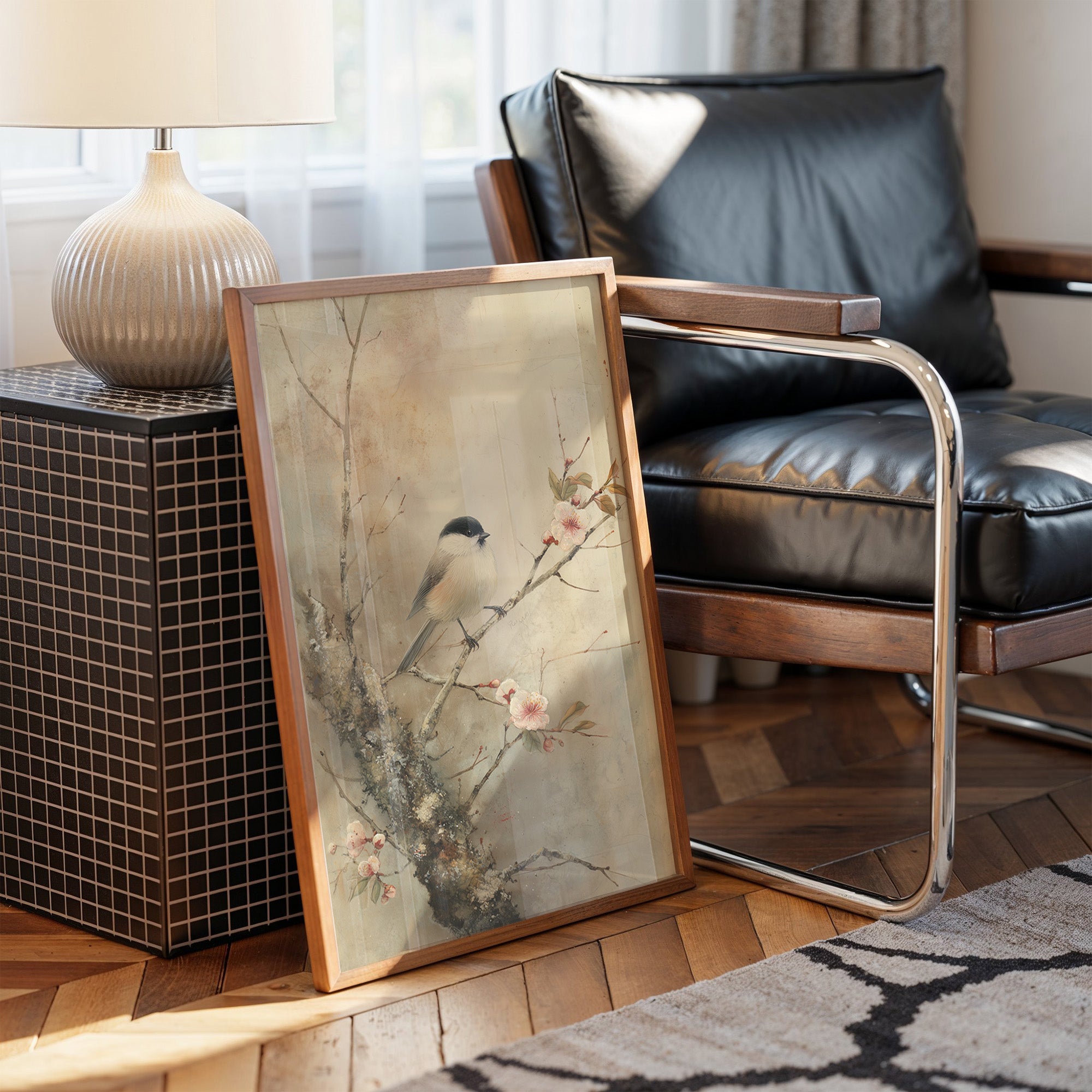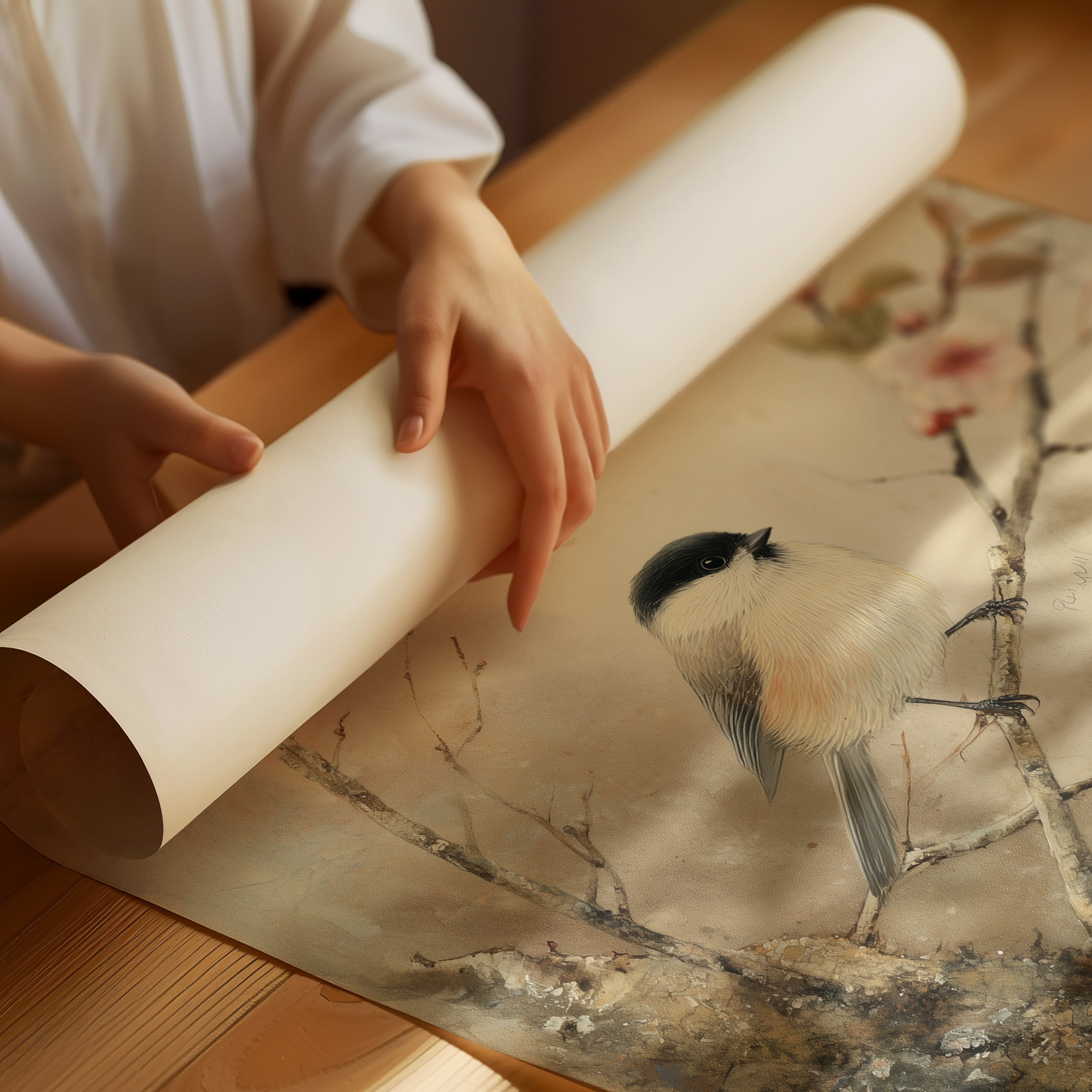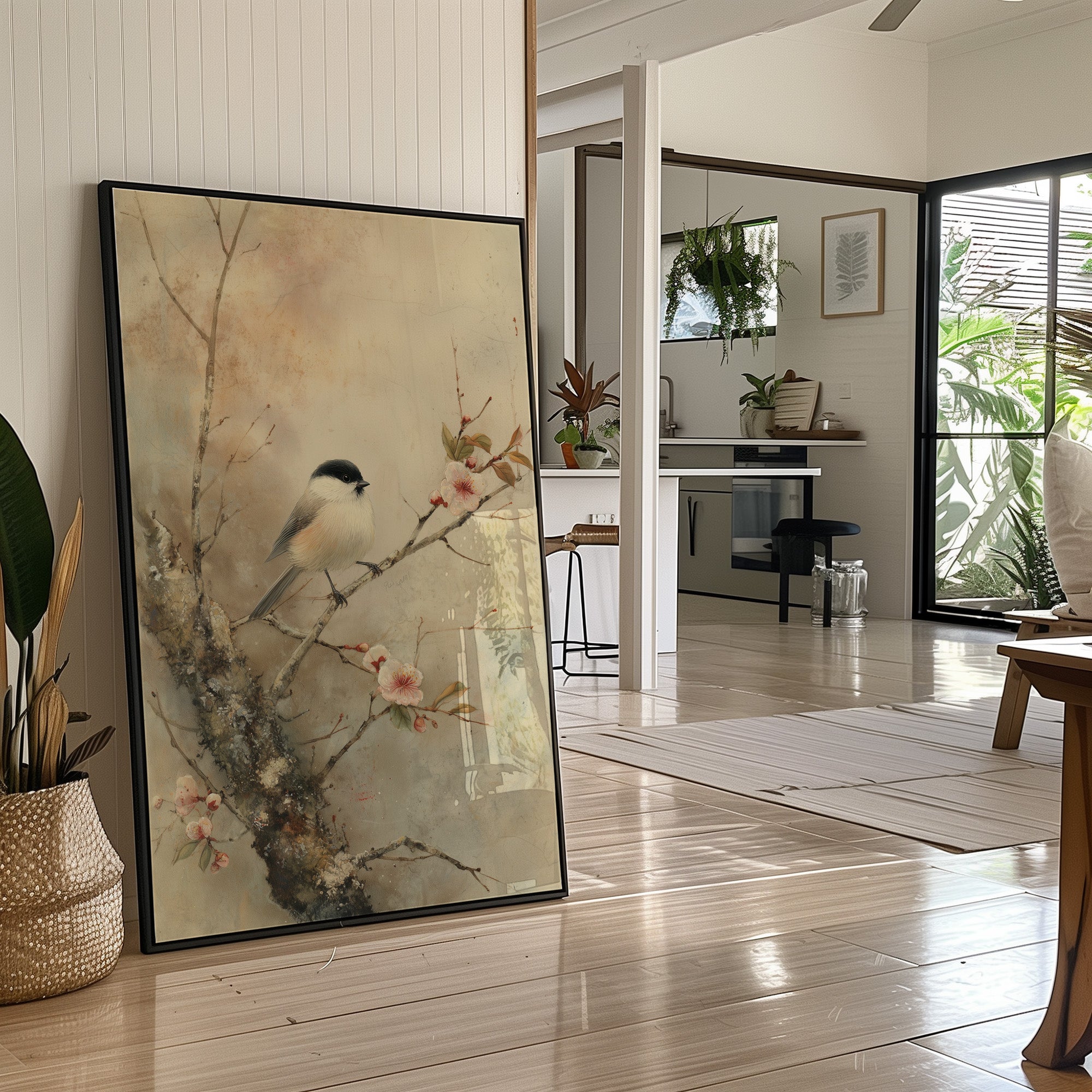 Delicate brushstrokes capture a peaceful moment where a small bird perches among blooming cherry blossoms. The subtle wash of muted tones creates a dreamy atmosphere, with pink petals dancing against a misty background. The composition balances the strength of dark branches with the ethereal quality of spring flowers, telling a story of nature's gentle awakening. This serene piece would bring tranquility to a reading nook or meditation space, where its quiet beauty can be fully appreciated.