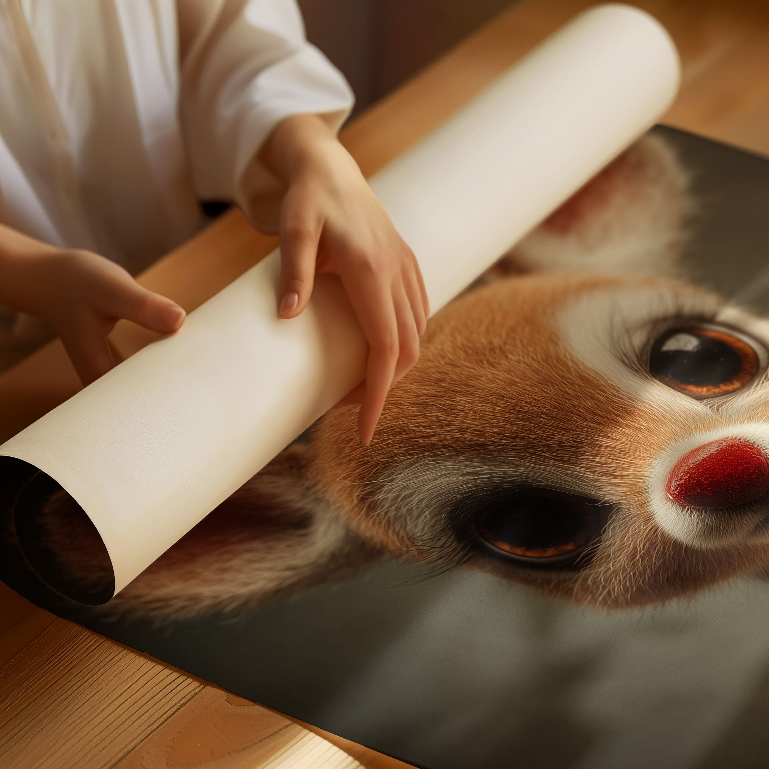 In the soft glow of holiday lights, an endearing young reindeer peers out with wide-eyed wonder and innocence. The gentle brown fur and signature red nose capture the magical essence of childhood Christmas tales. Delicate details like the fuzzy antlers and expressive eyes create an enchanting portrait that bridges reality and fantasy. This heartwarming scene is set against a backdrop of frosted Christmas trees, twinkling lights, and carefully wrapped presents, embodying the pure joy of the season. Perfect for adding a touch of whimsy to a child's room or creating a festive focal point in living spaces during the holiday season.
