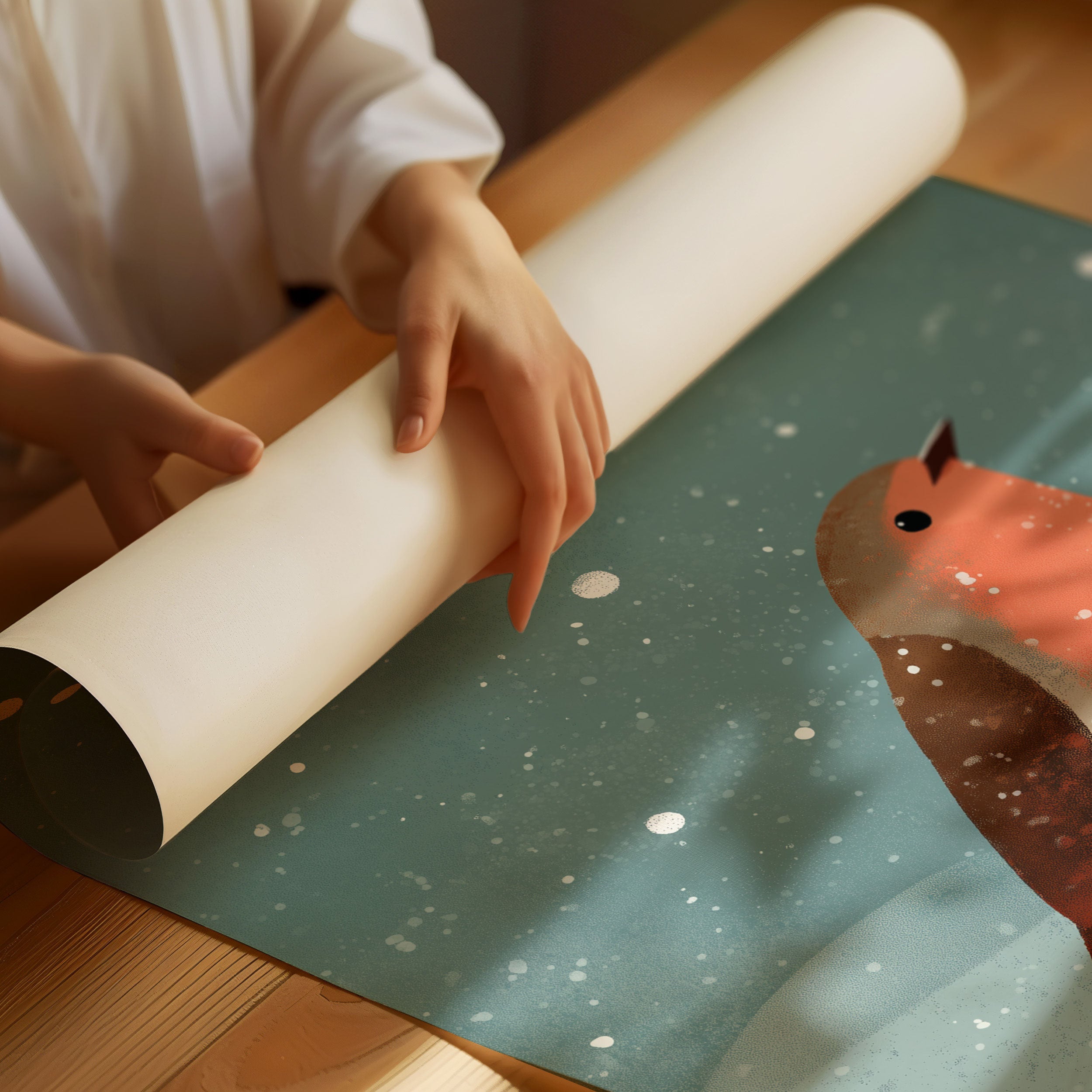 A charming illustration captures winter's gentle poetry through a plump robin set against a serene teal sky. Delicate snowflakes dance around the bird's russet feathers and cream belly, creating a moment of quiet wonder. The minimalist design speaks to childhood memories of first snowfalls and holiday anticipation, while the soft color palette weaves together winter's crisp beauty with warm nostalgia. This piece would bring seasonal charm to a child's room or add a touch of whimsical sophistication to any holiday decor collection.