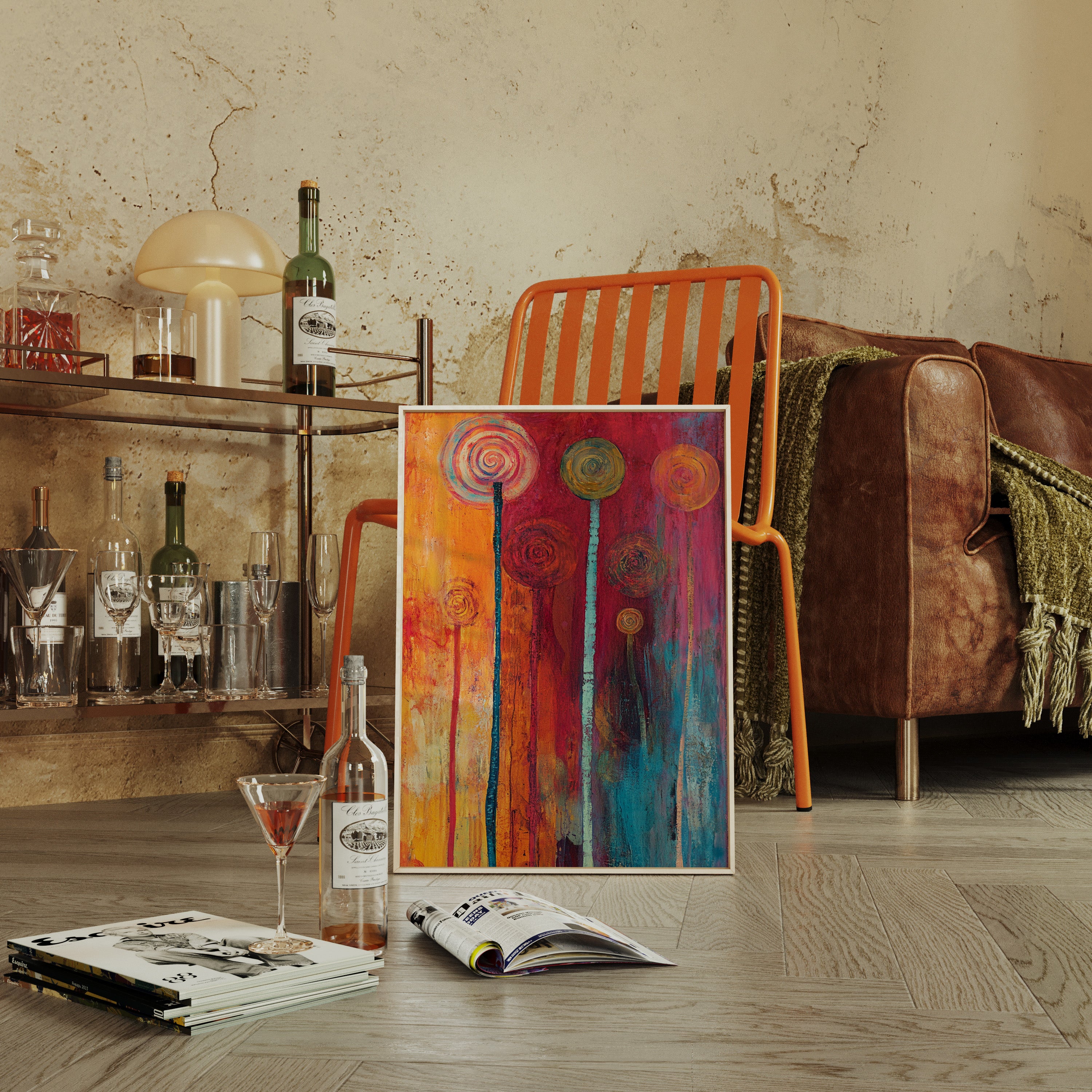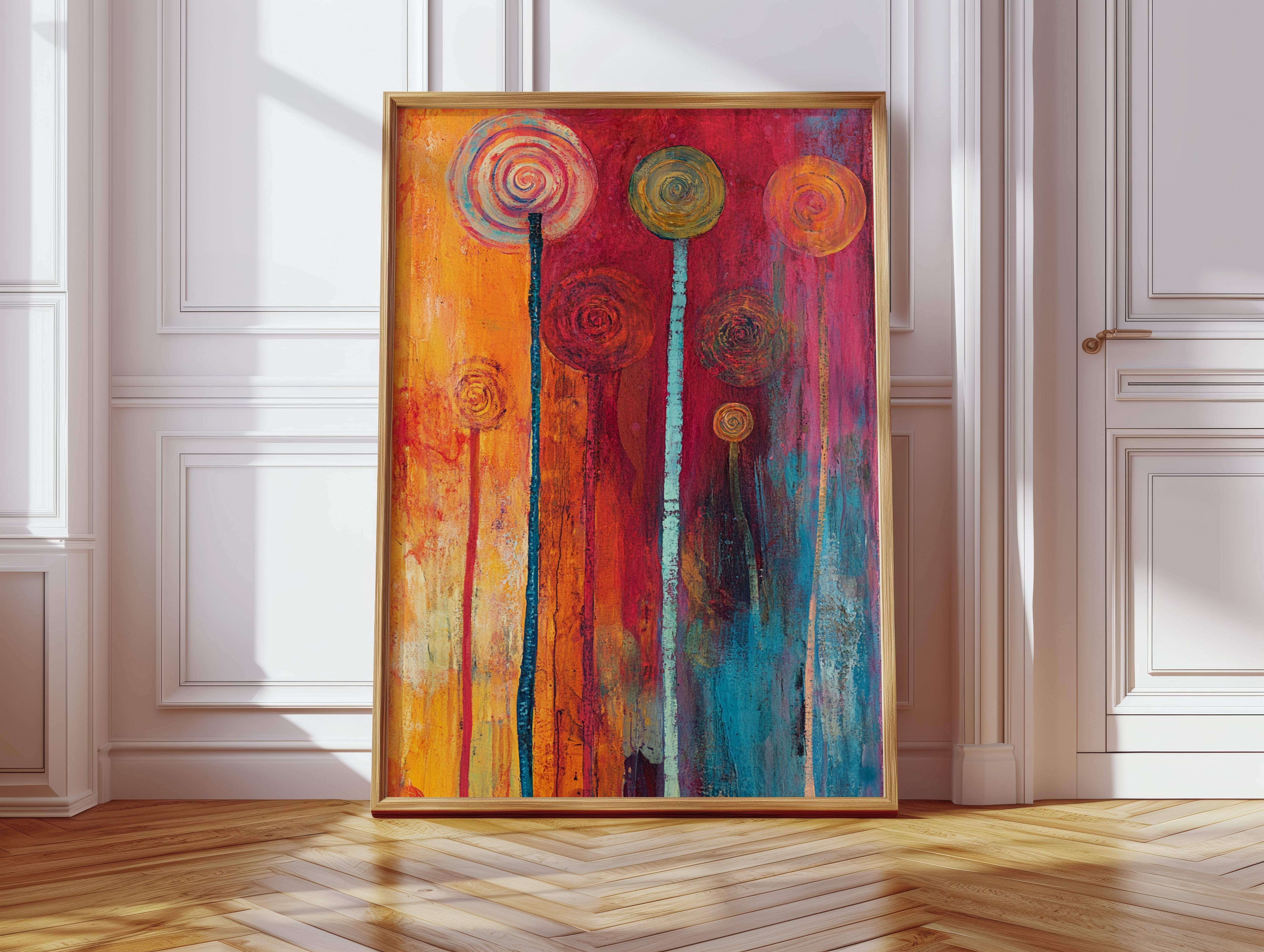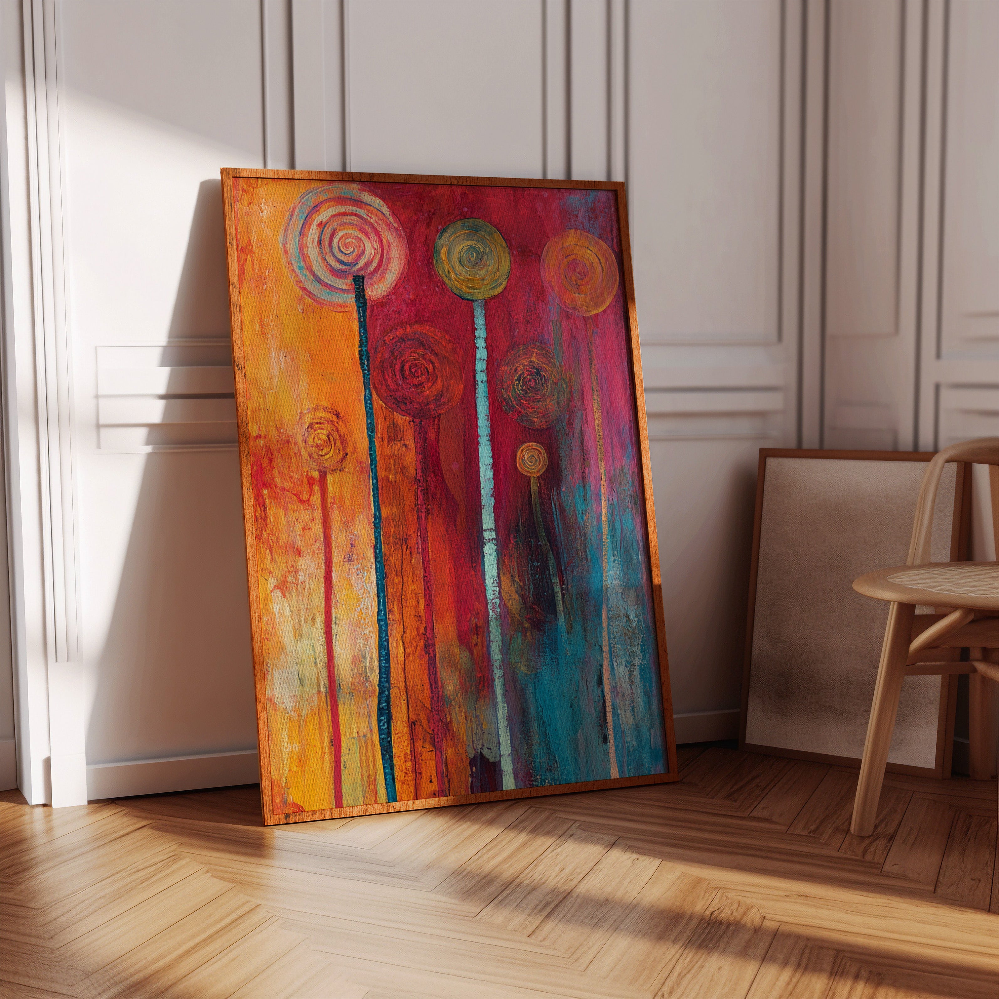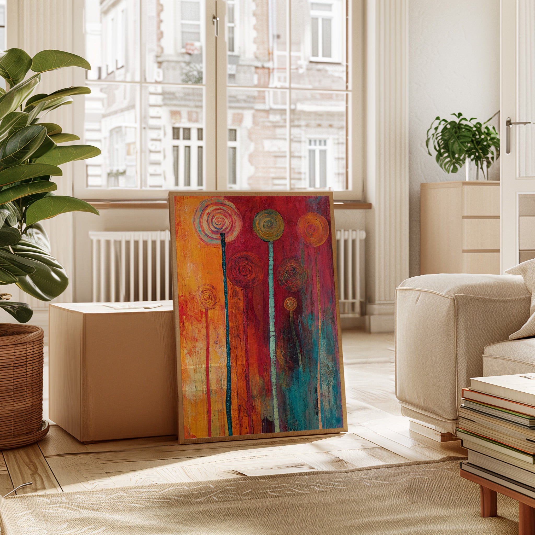 Whimsical spirals dance against a backdrop of fiery sunset hues, each one perched atop slender stems like nature's own candy garden. The composition pulses with vibrant energy, blending warm oranges and deep crimsons with striking turquoise accents that create a mesmerizing rhythm across the canvas. Textured brushstrokes and deliberate drips add depth and movement, while the circular forms suggest a playful interpretation of flowers or celestial bodies caught in a moment of joyful celebration. This contemporary piece would bring a burst of creative energy to a modern living space or add a splash of sophisticated whimsy to a home office.