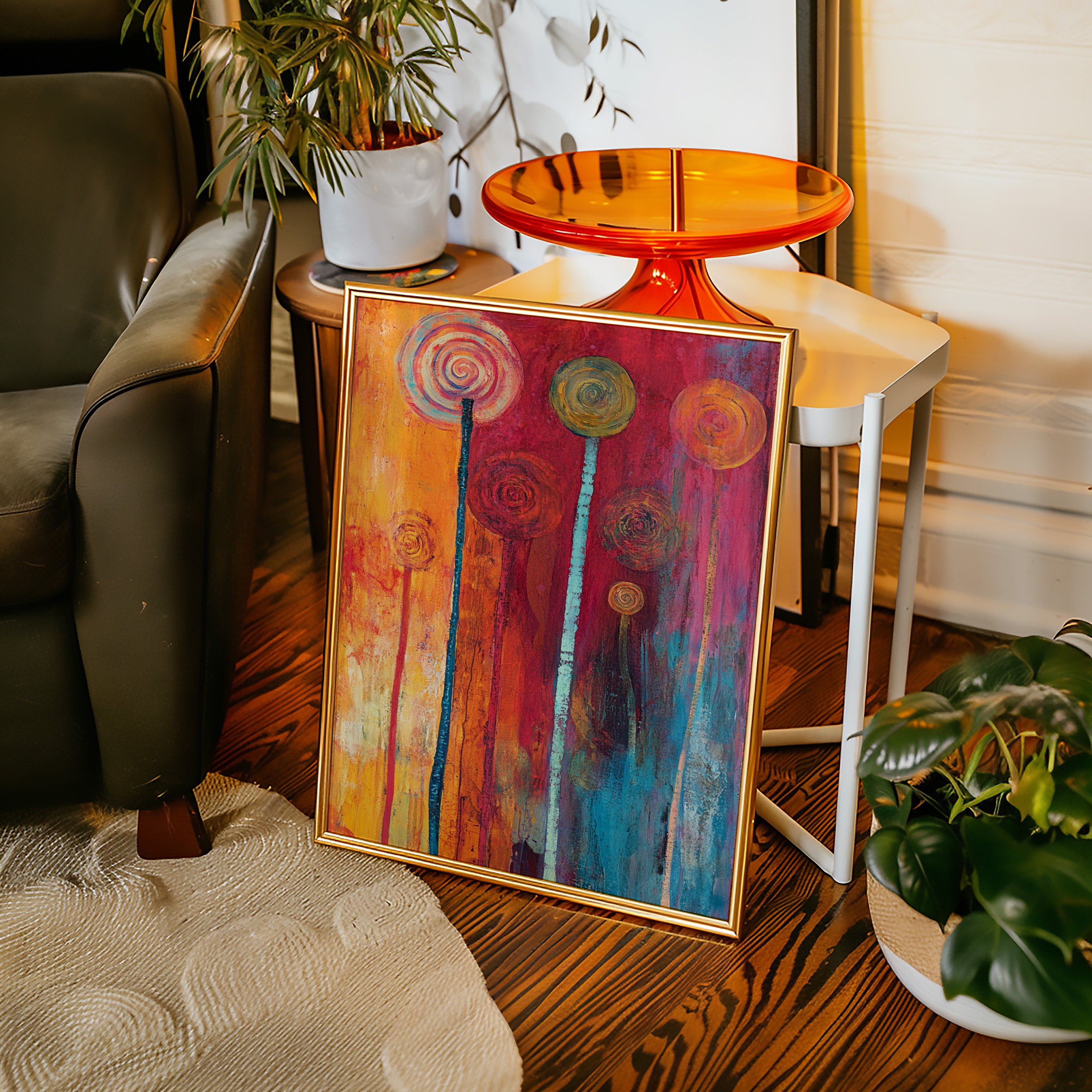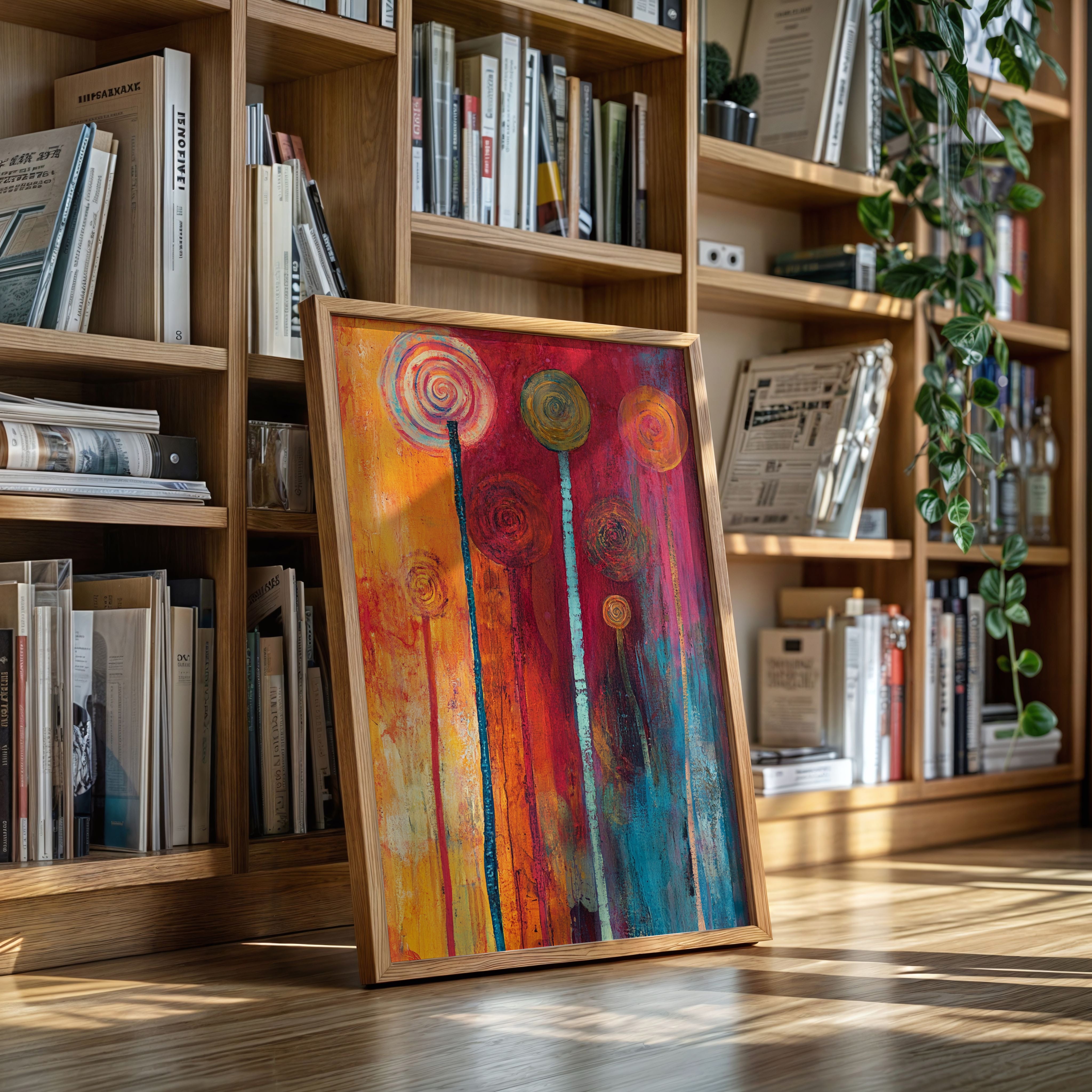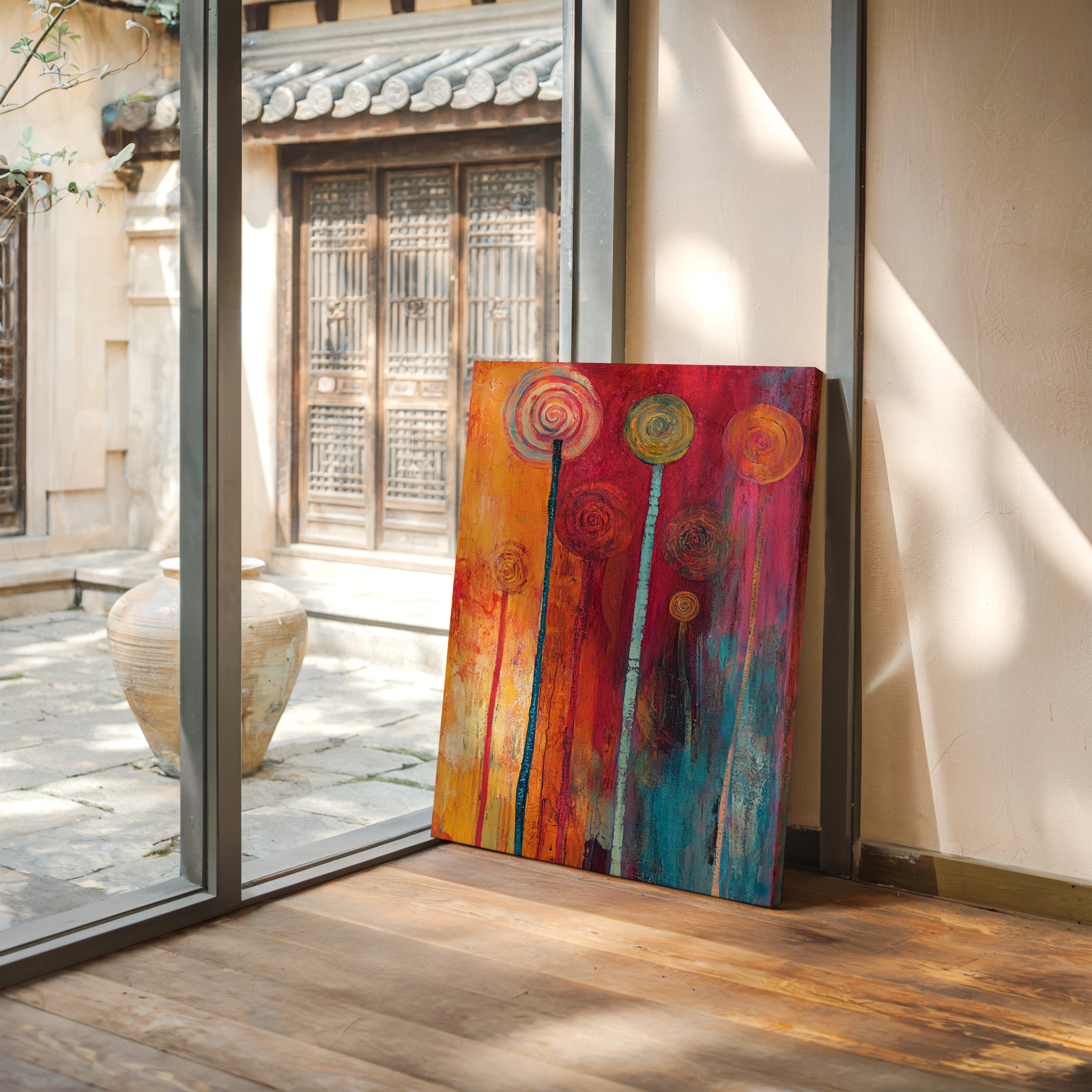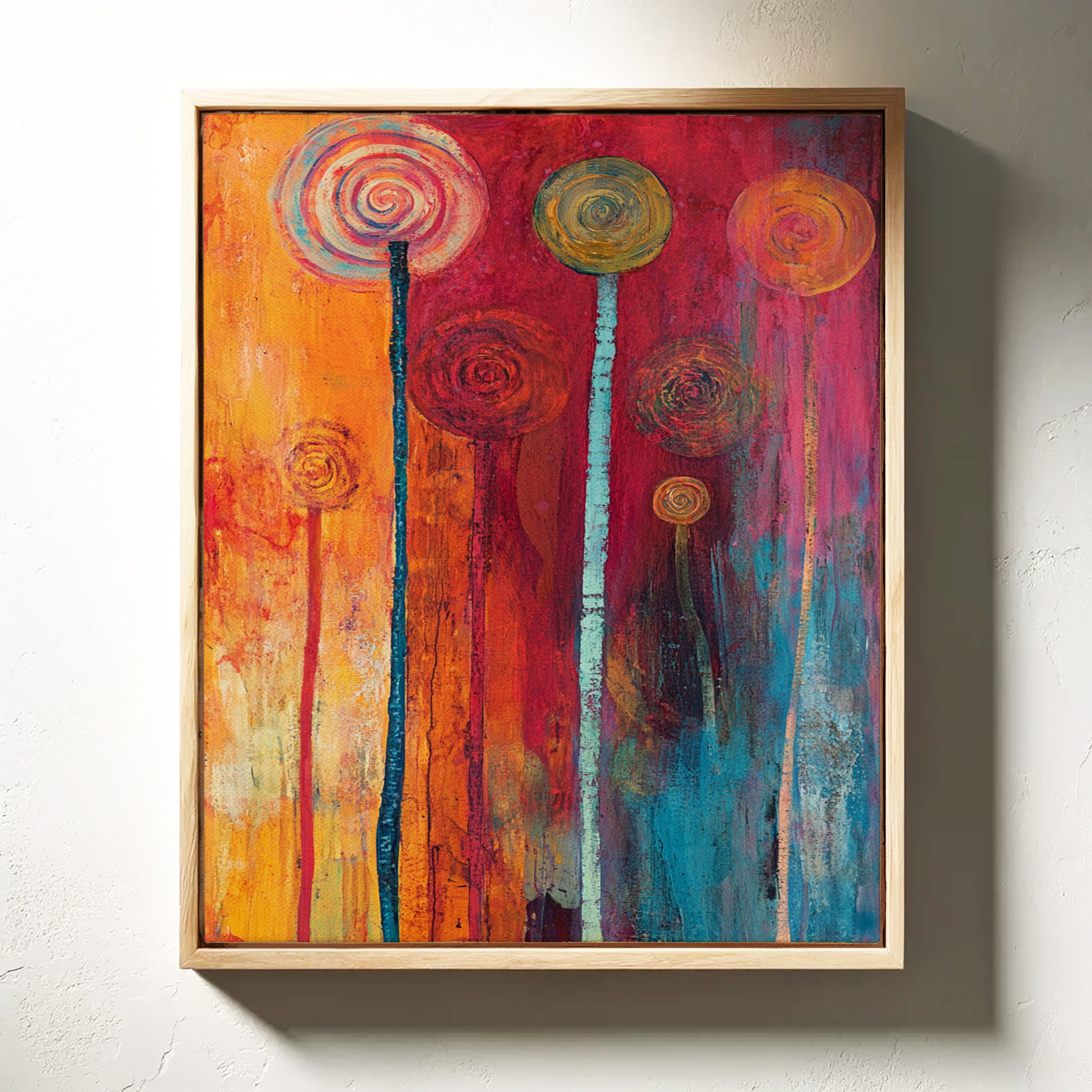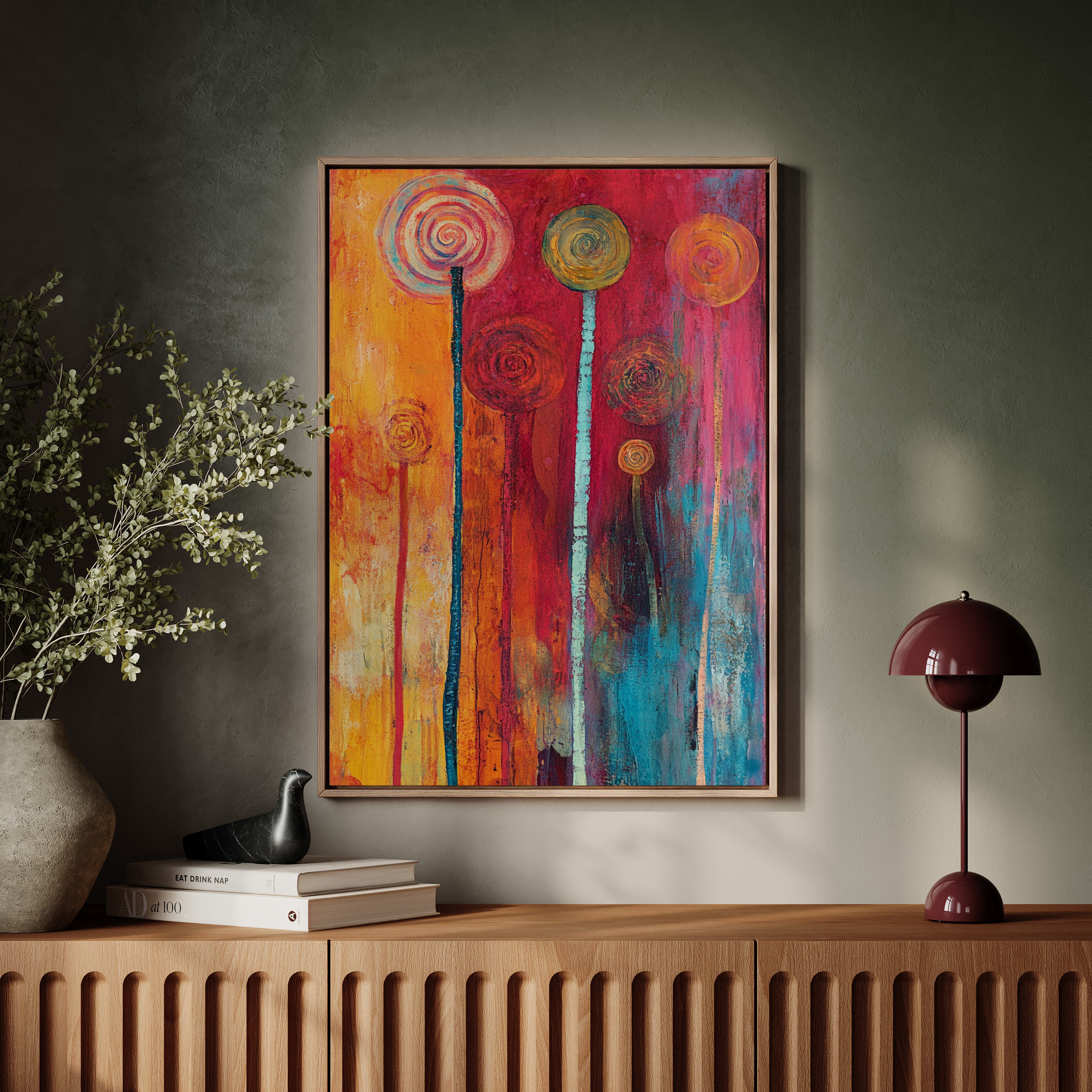 Whimsical spirals dance against a backdrop of fiery sunset hues, each one perched atop slender stems like nature's own candy garden. The composition pulses with vibrant energy, blending warm oranges and deep crimsons with striking turquoise accents that create a mesmerizing rhythm across the canvas. Textured brushstrokes and deliberate drips add depth and movement, while the circular forms suggest a playful interpretation of flowers or celestial bodies caught in a moment of joyful celebration. This contemporary piece would bring a burst of creative energy to a modern living space or add a splash of sophisticated whimsy to a home office.