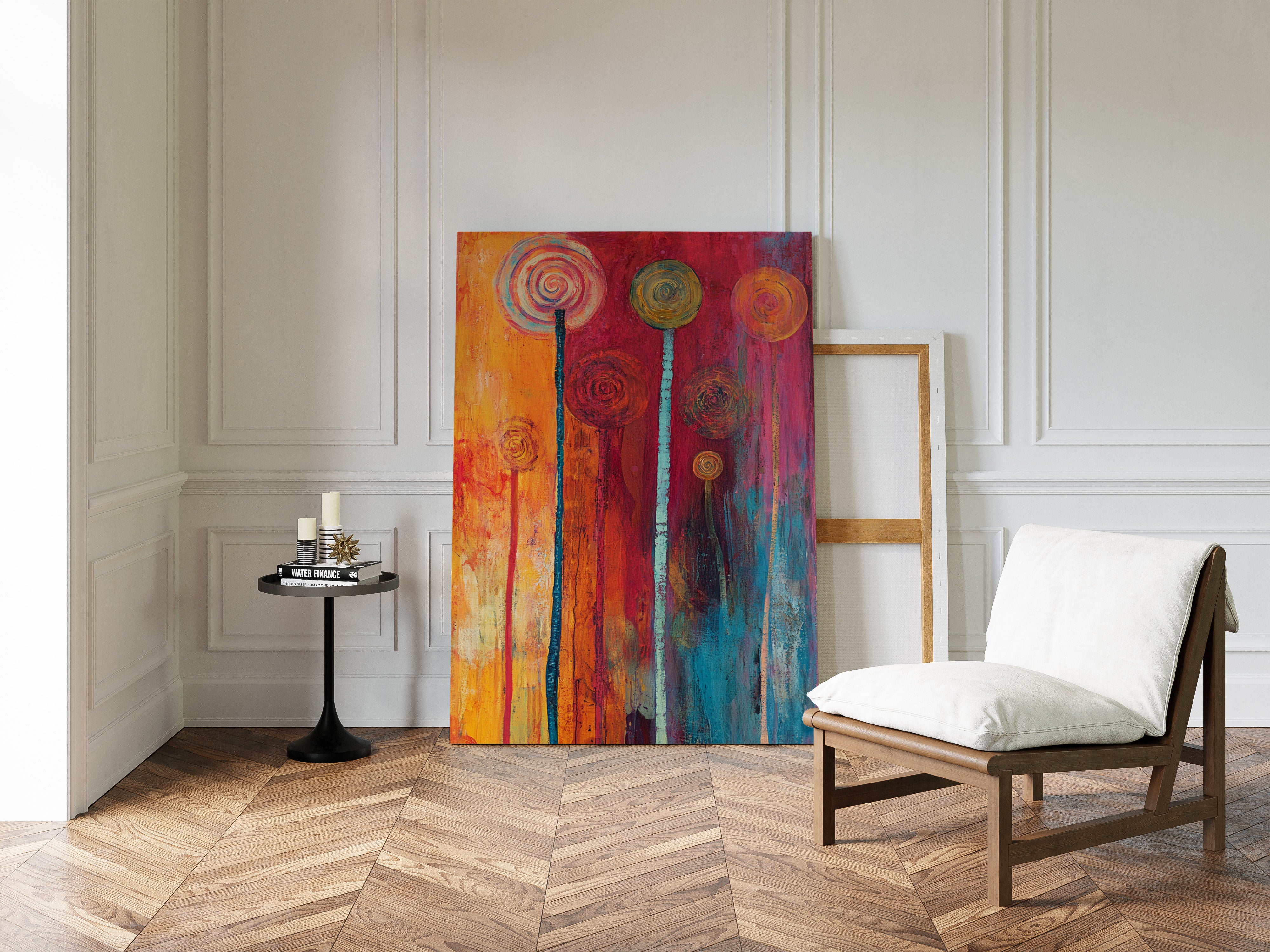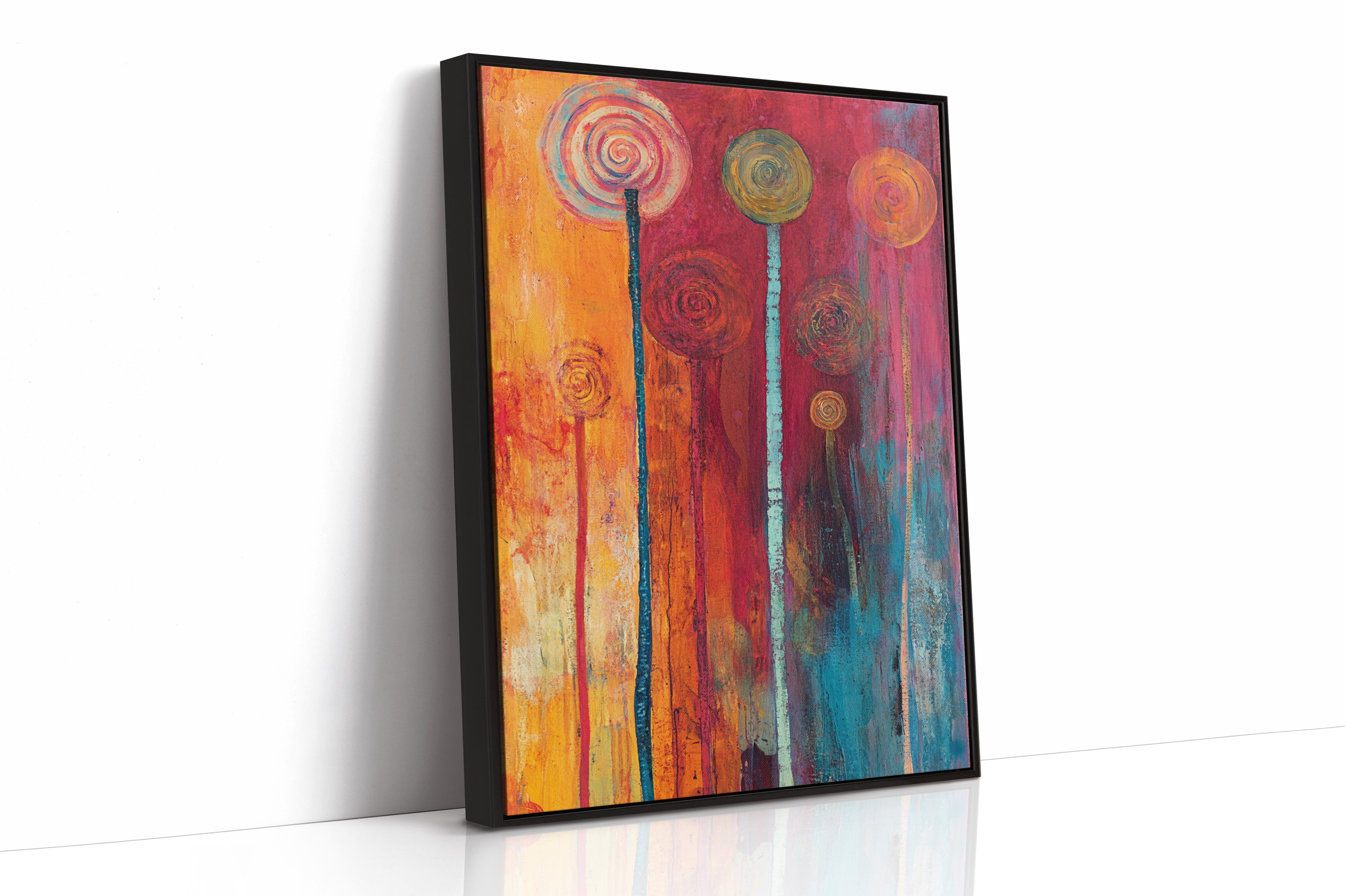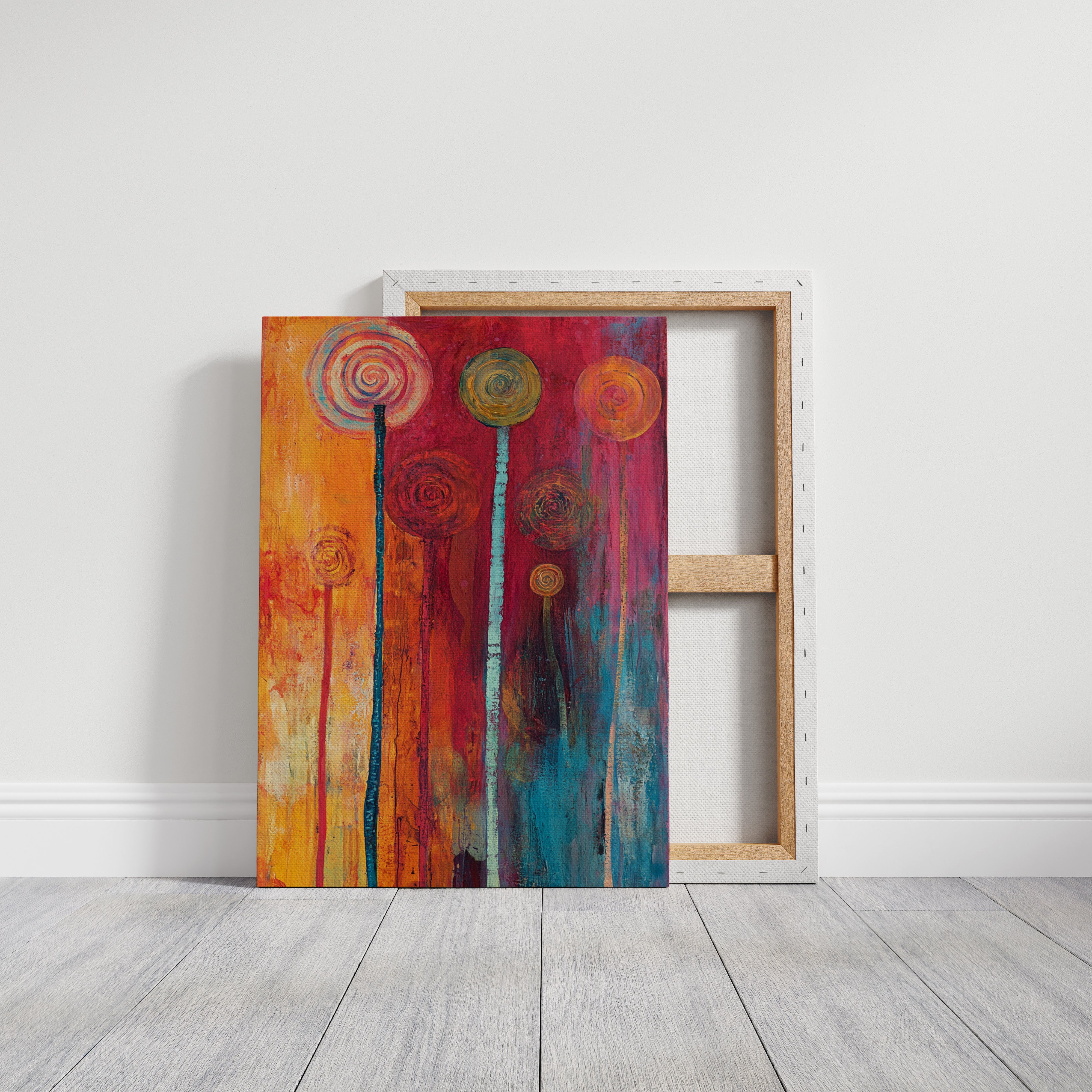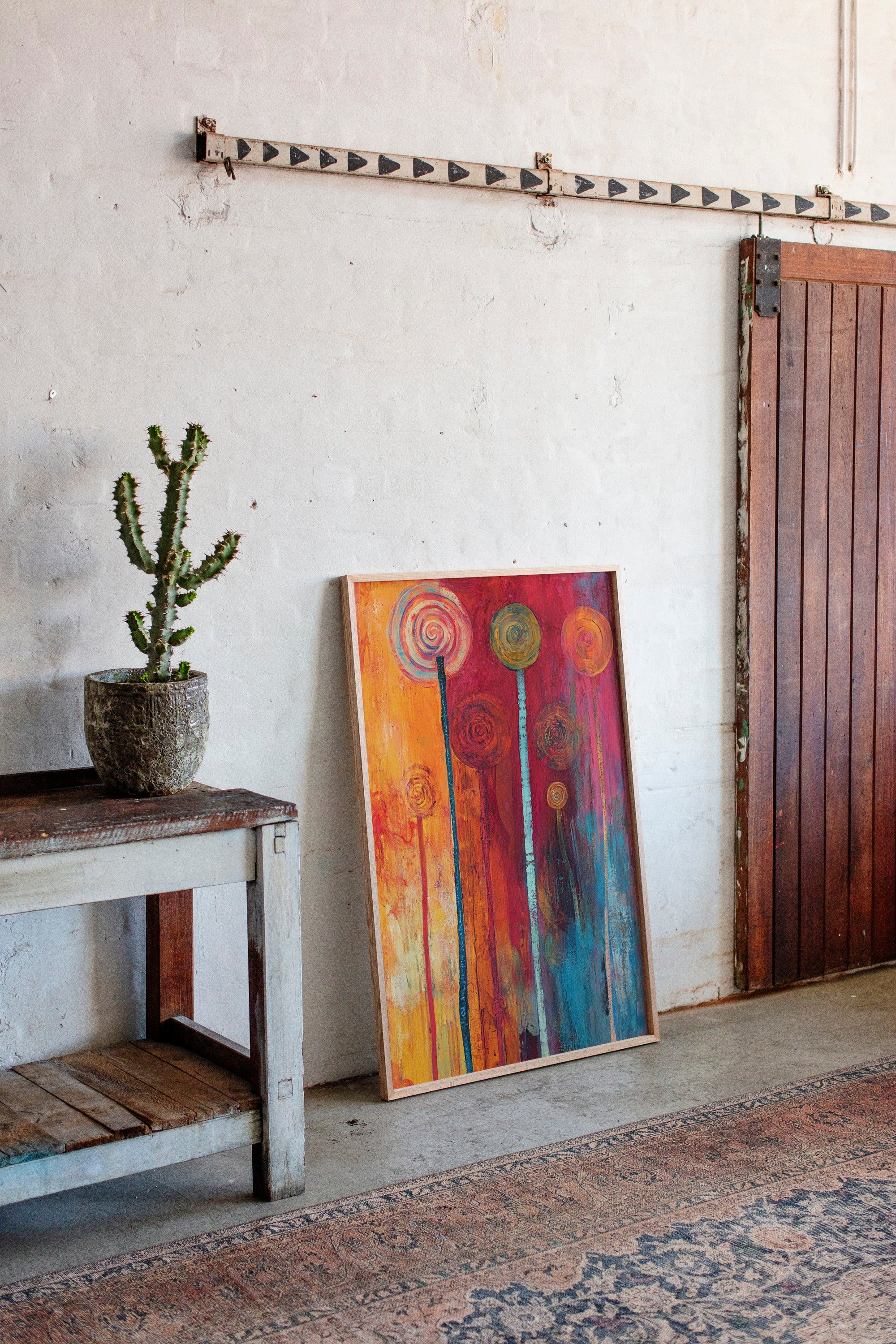 Whimsical spirals dance against a backdrop of fiery sunset hues, each one perched atop slender stems like nature's own candy garden. The composition pulses with vibrant energy, blending warm oranges and deep crimsons with striking turquoise accents that create a mesmerizing rhythm across the canvas. Textured brushstrokes and deliberate drips add depth and movement, while the circular forms suggest a playful interpretation of flowers or celestial bodies caught in a moment of joyful celebration. This contemporary piece would bring a burst of creative energy to a modern living space or add a splash of sophisticated whimsy to a home office.