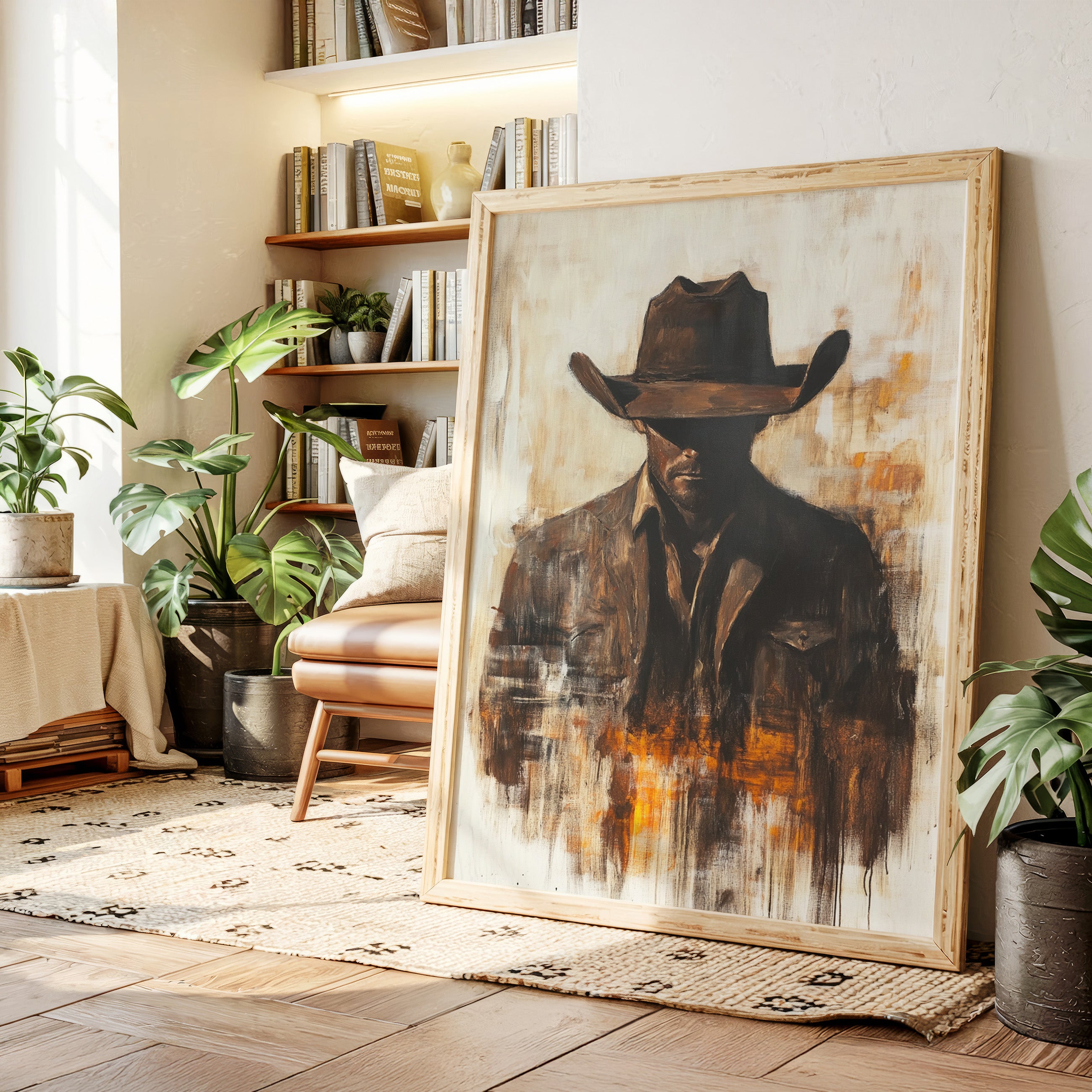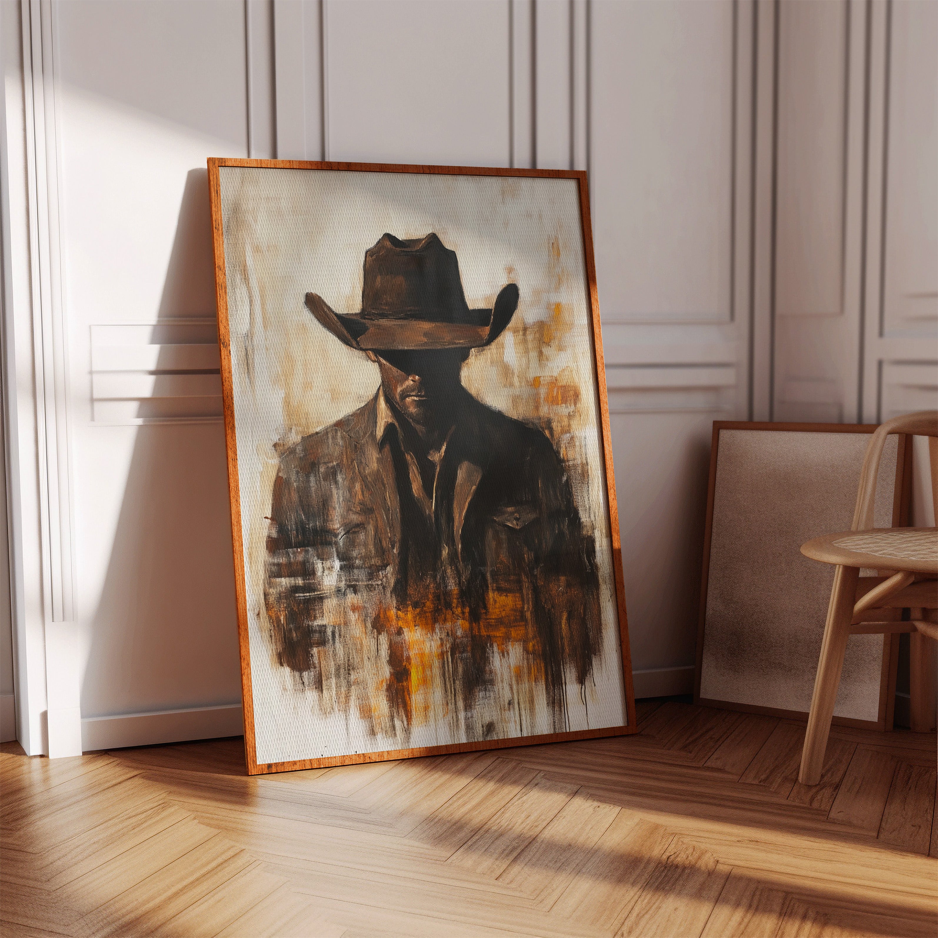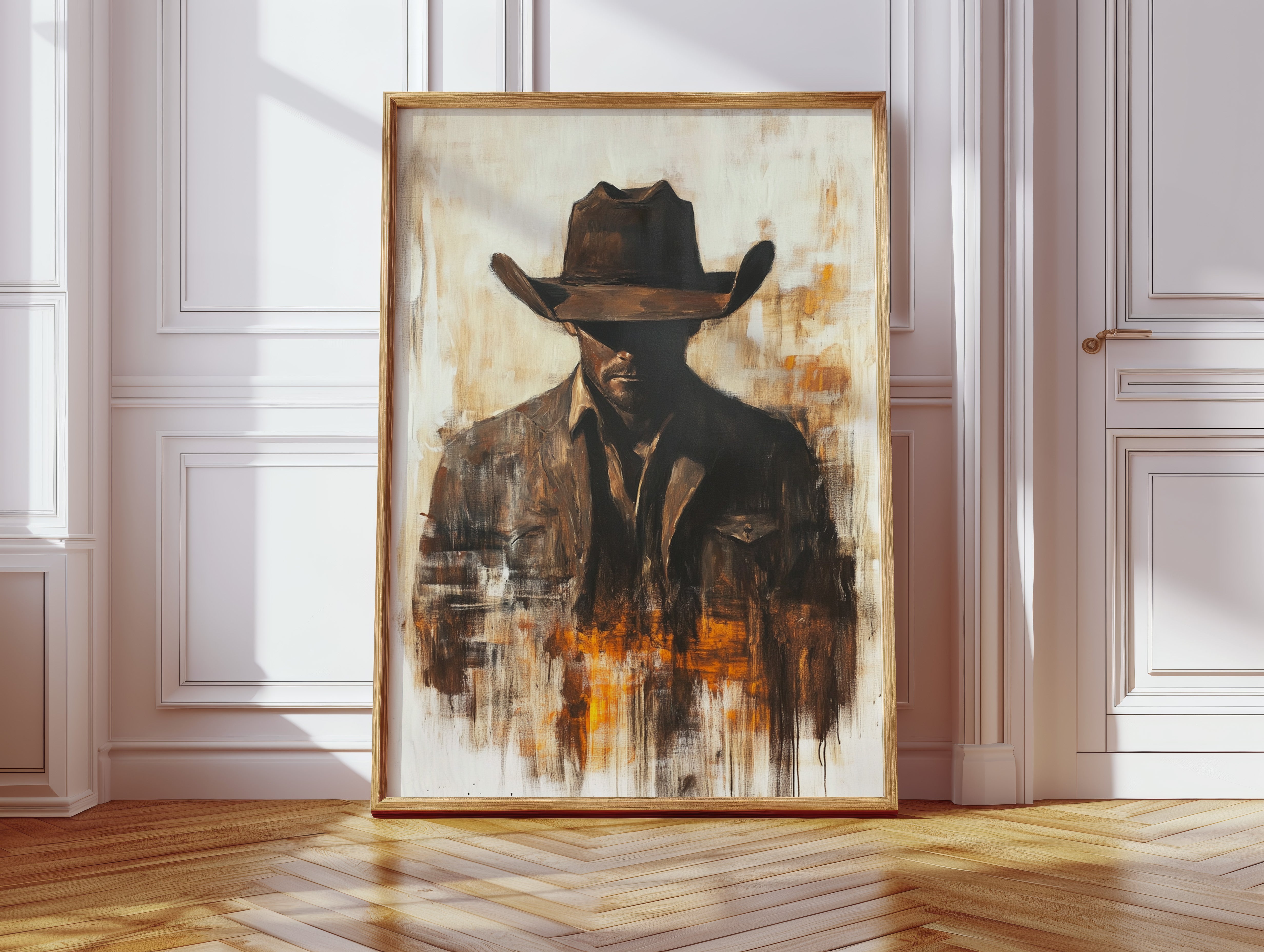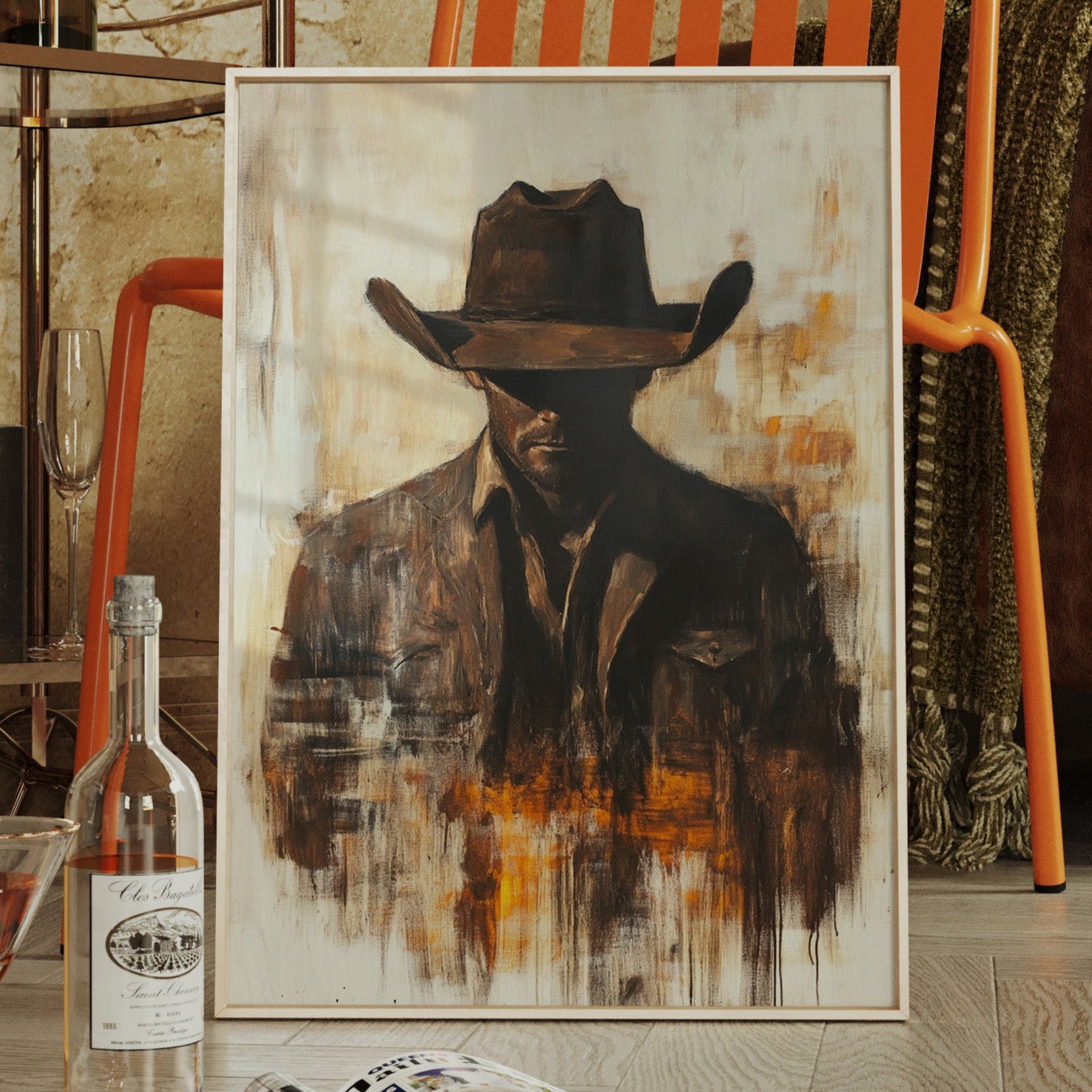 Stoic and weathered, this cowboy stands in half-shadow—hat low, expression unreadable. Burnt orange hues and bold brushstrokes echo the grit of the open frontier.