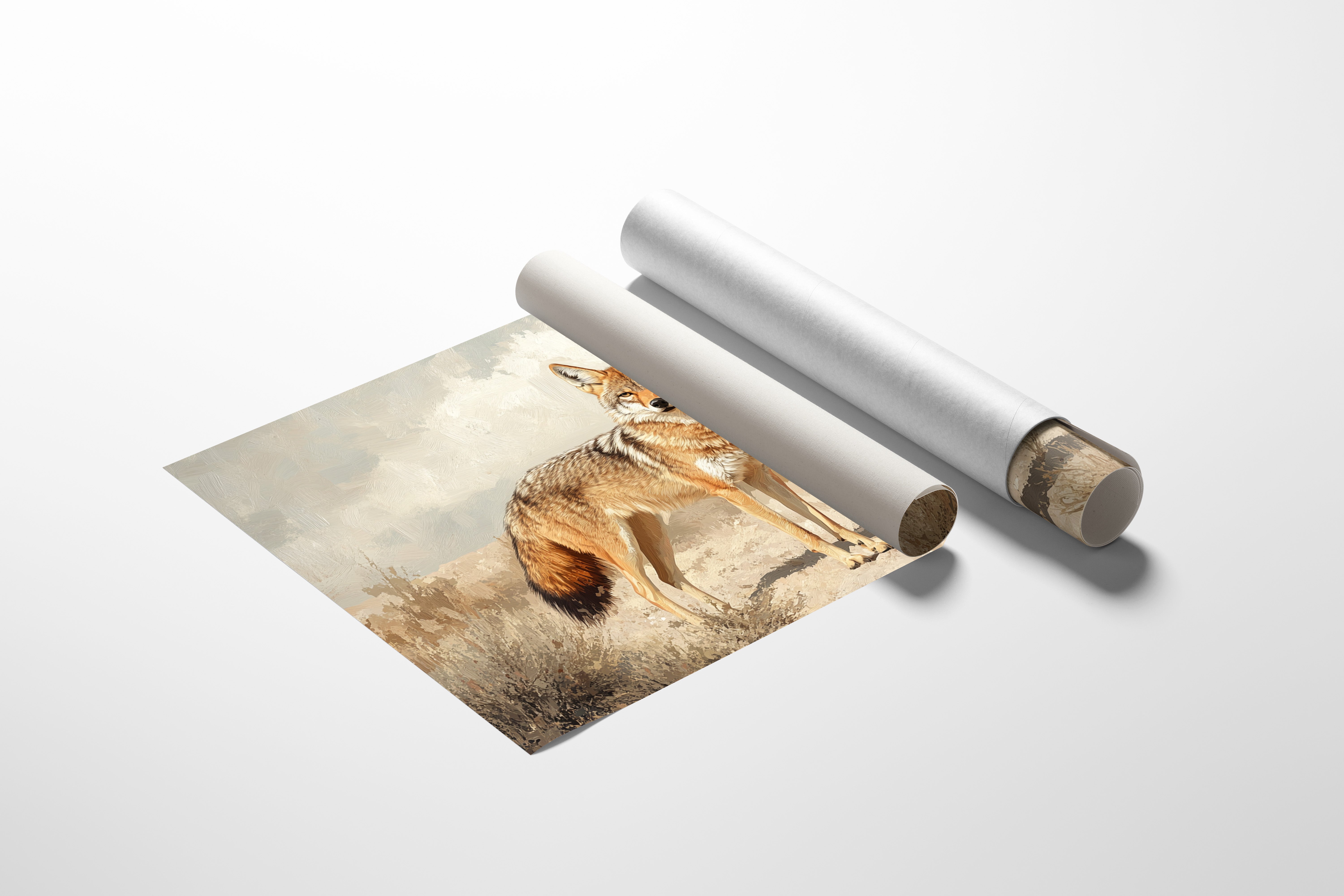 Silent and watchful, the desert’s trickster stands in warm light—its coat glowing, its stance proud. This richly painted scene captures wild resilience and desert soul.
