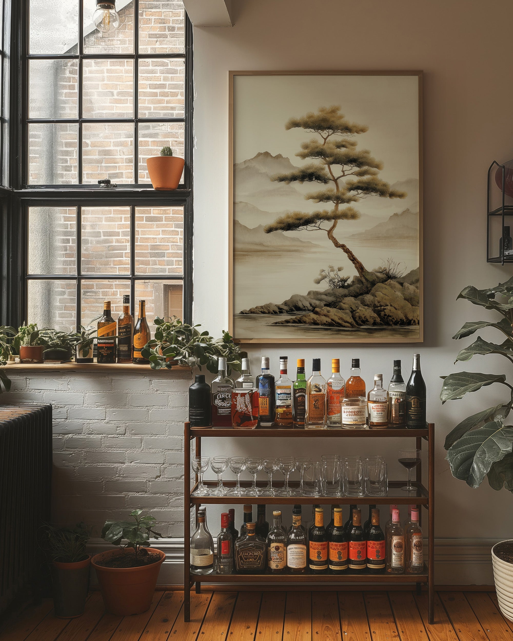 A solitary pine tree stands resilient against a misty horizon, its branches reaching gracefully across a sepia-toned sky. The composition captures the essence of traditional Asian brush painting, where every stroke tells a story of natural harmony and quiet persistence. The rocky coastline below anchors the scene in earthen browns and grays, while the minimal palette creates a meditative atmosphere that speaks to the eternal dialogue between land and sky. This piece would bring contemplative tranquility to a reading nook or create a focal point in a minimalist dining space.