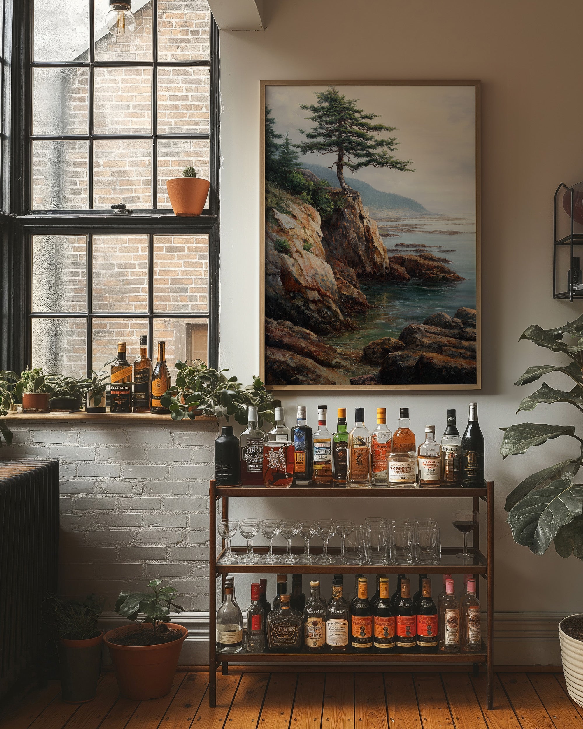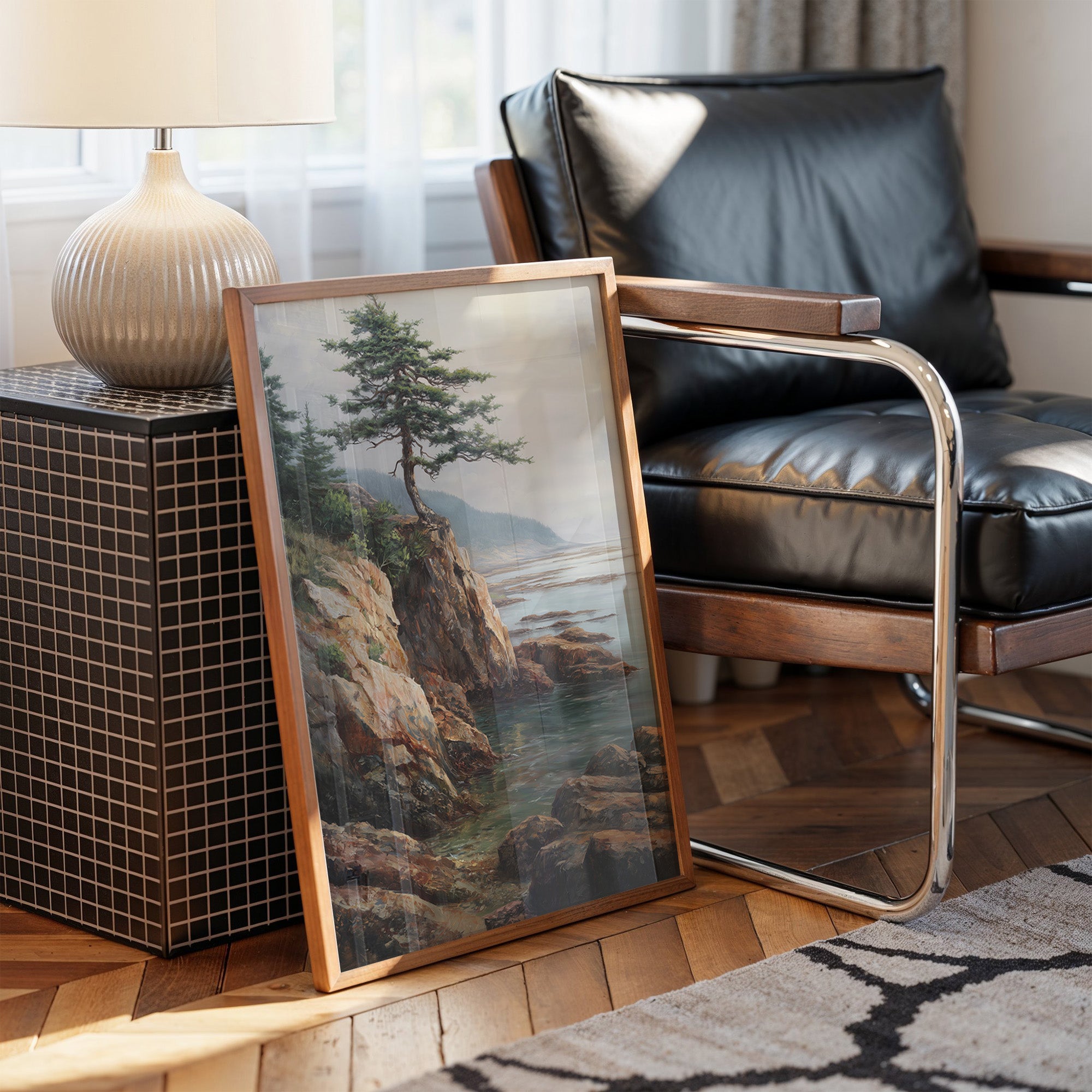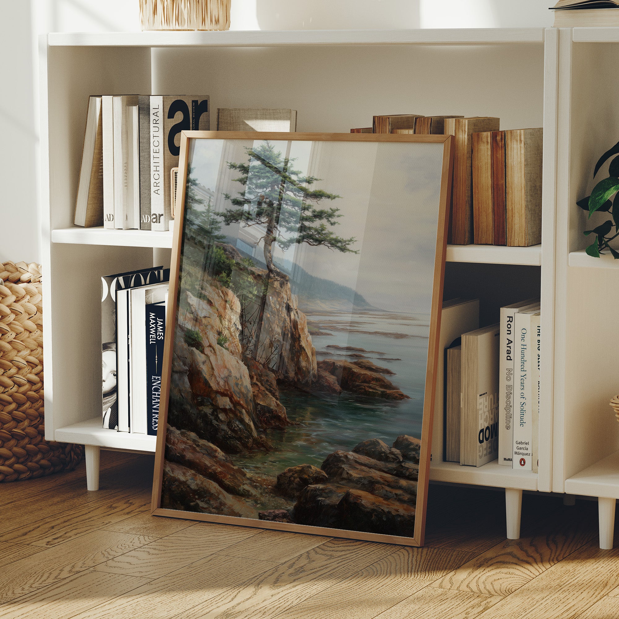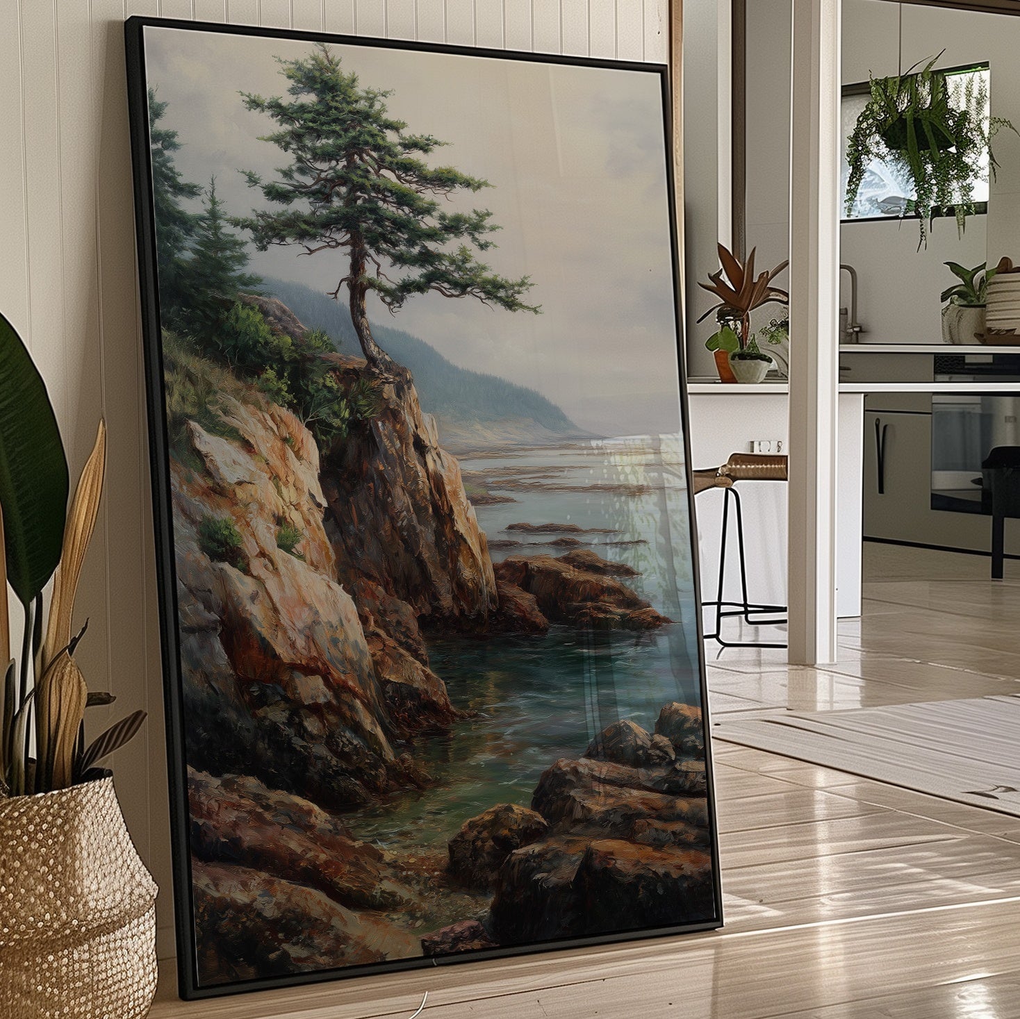 Morning mist hovers over rugged shoreline, where a solitary pine stands defiant against the elements. The painting captures nature's resilience, with weathered cliffs descending into tranquil waters that reflect soft coastal light. Earthy tones of amber and sage create a timeless scene of wild beauty balanced against the raw power of stone and sea.