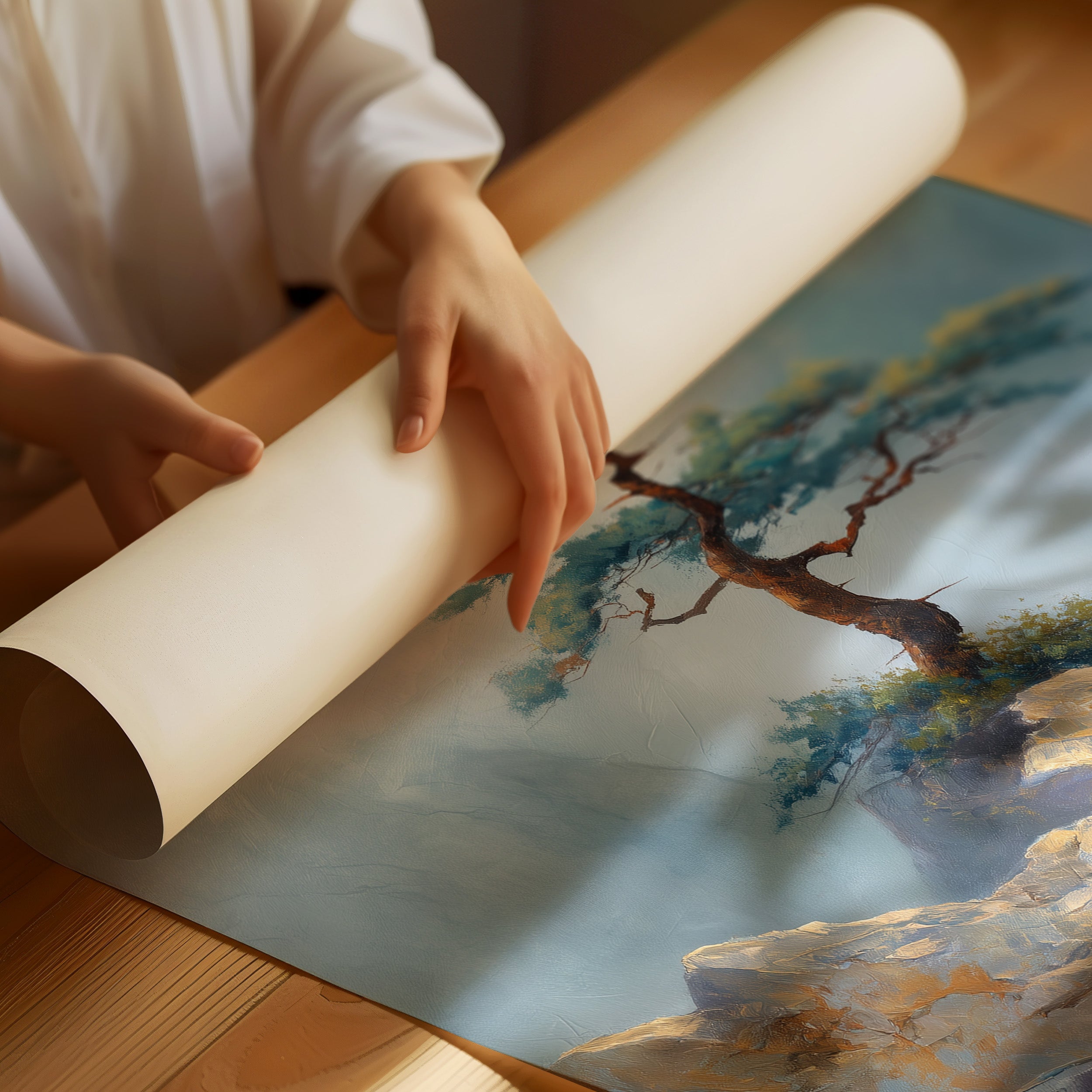 A solitary pine tree reaches skyward from its rocky perch, defying gravity with graceful determination. Its wind-shaped branches dance with teal and sage needles against a misty mountain atmosphere, creating a meditation on resilience and natural beauty. The rugged cliff face below shows warm golden tones that contrast beautifully with the cool, ethereal sky, while delicate brushstrokes capture the eternal dialogue between earth and air. This contemplative piece brings serene energy to a reading nook, meditation space, or any room where you seek to create a sense of peaceful reflection.