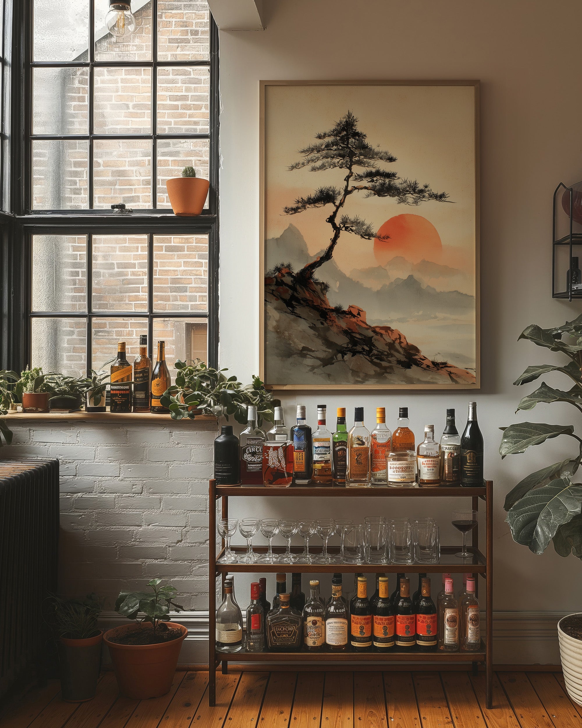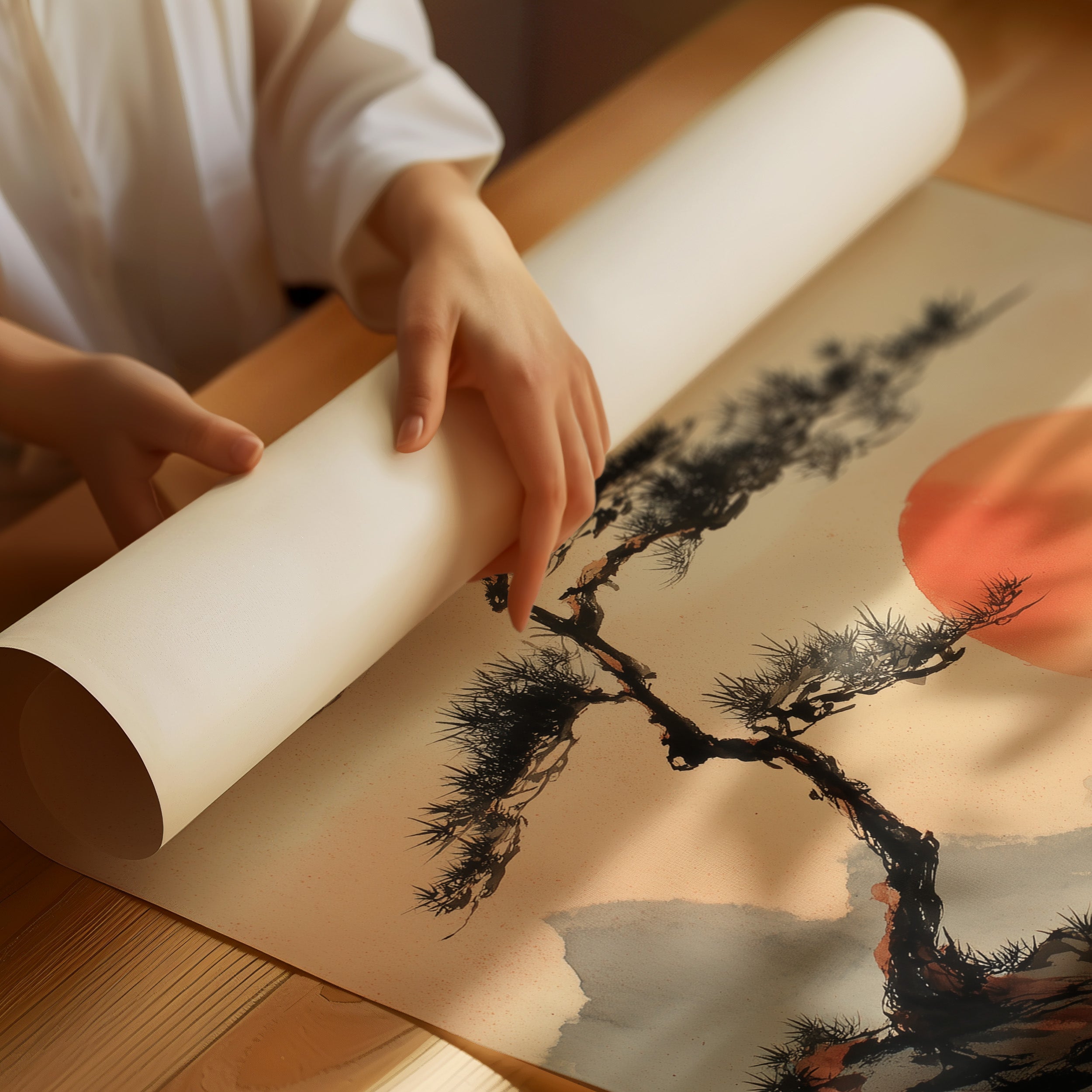 A solitary pine tree stands resilient against a misty mountainscape, its branches reaching toward an enormous coral sun. The composition flows with traditional Asian brushwork techniques, capturing the dramatic interplay between earth and sky. Layers of mountains fade into the distance through delicate washes of gray, while warm terra cotta rocks anchor the foreground with their bold presence. This peaceful scene would bring contemplative energy to a reading nook or meditation space, its balanced composition offering a visual anchor for mindful moments.