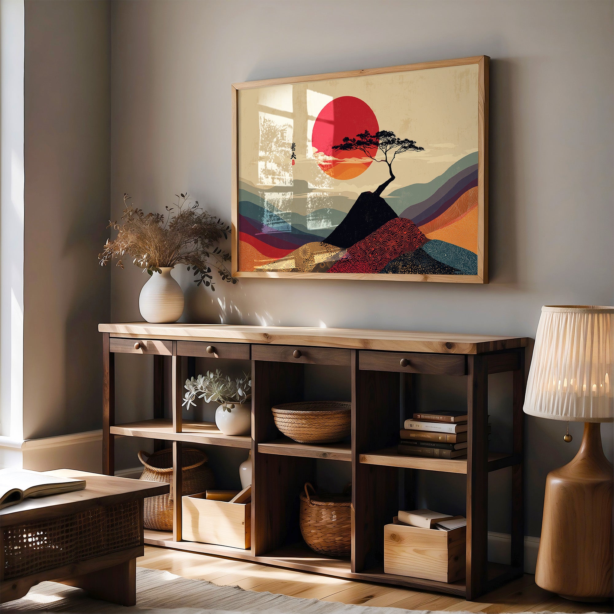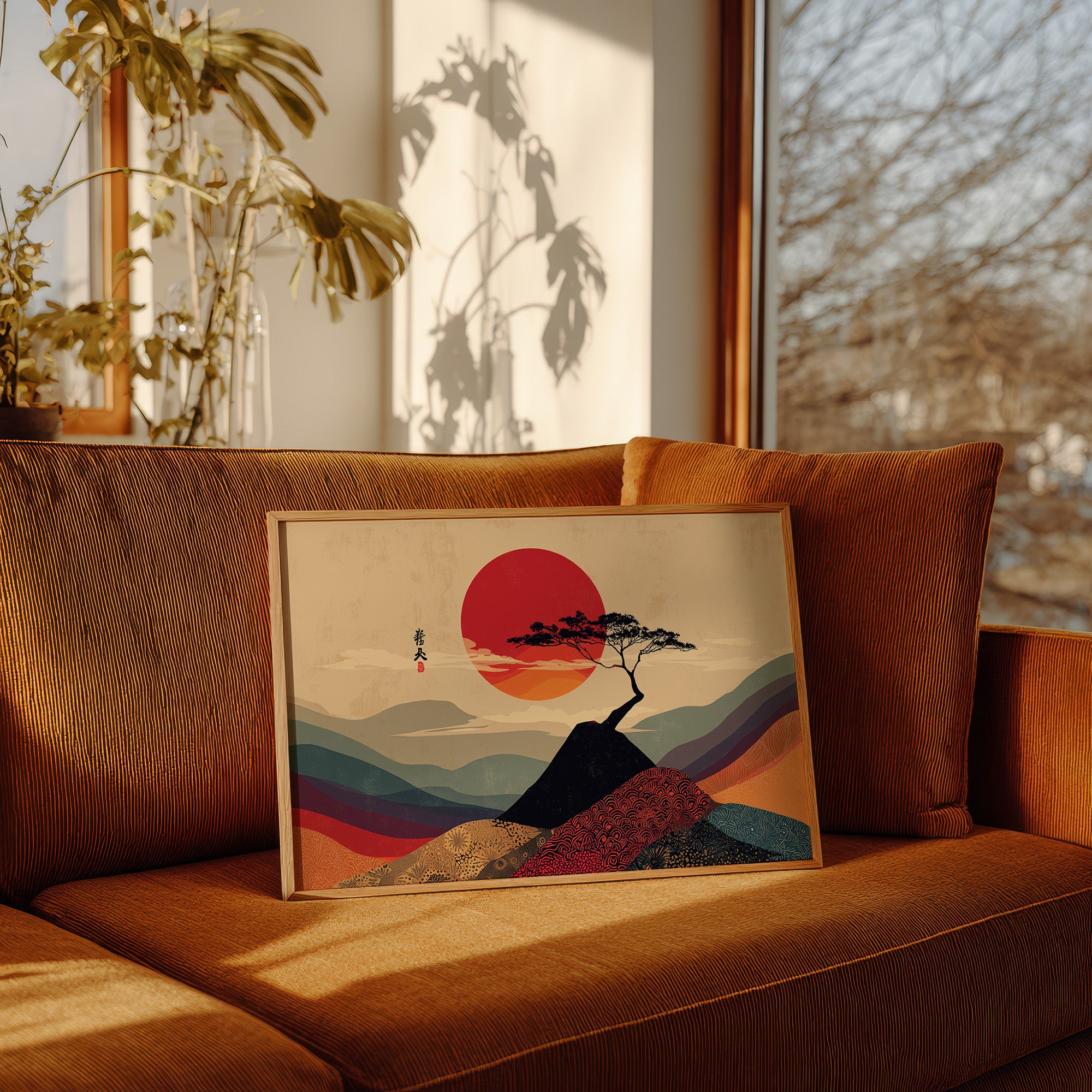 Golden afternoon light streams across a corduroy couch, casting delicate plant shadows on cream walls while illuminating a striking Japanese-inspired landscape. The artwork captures a solitary tree perched atop rolling hills, silhouetted against a bold crimson sun in a composition of sweeping curves and rich earth tones. The interplay of warm sunlight with the cool teals and deep crimsons of the print creates a meditation on balance and natural harmony. This piece would bring contemplative energy to a reading nook, meditation space, or any room seeking to blend contemporary Asian aesthetics with natural elements.