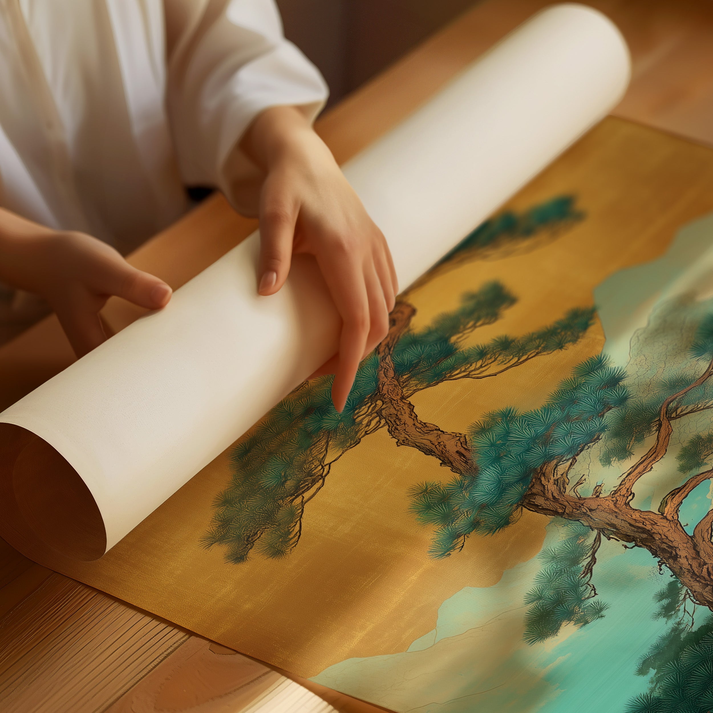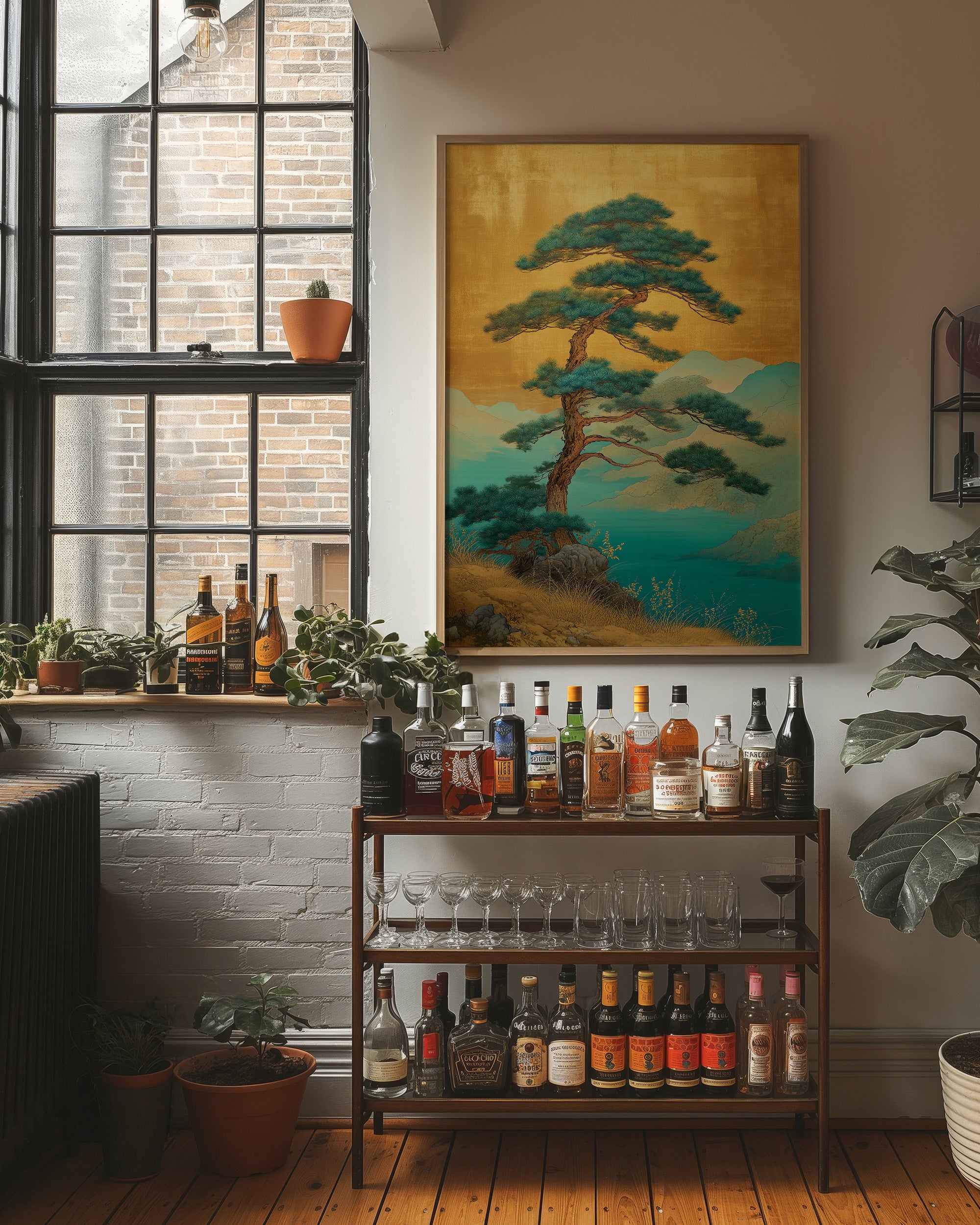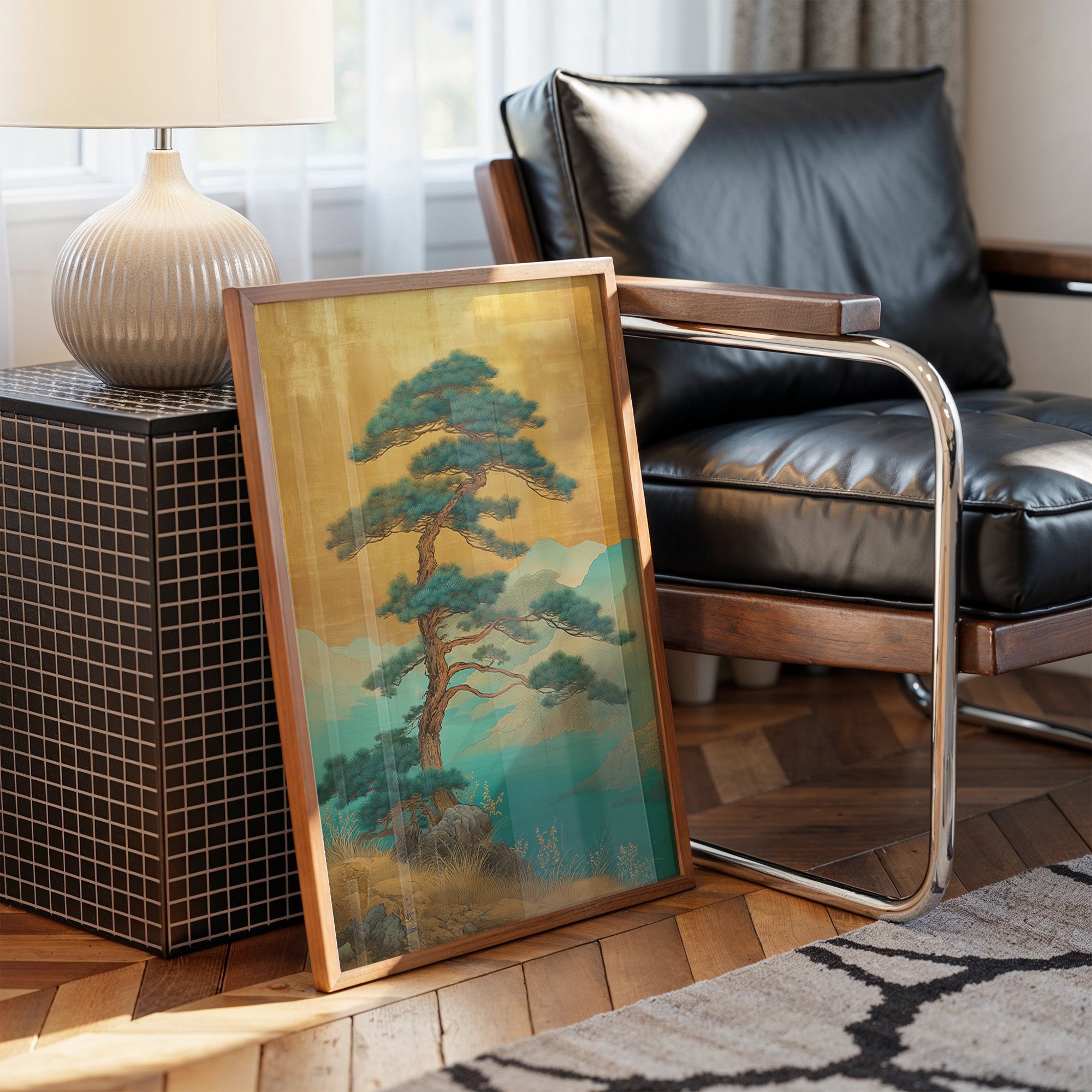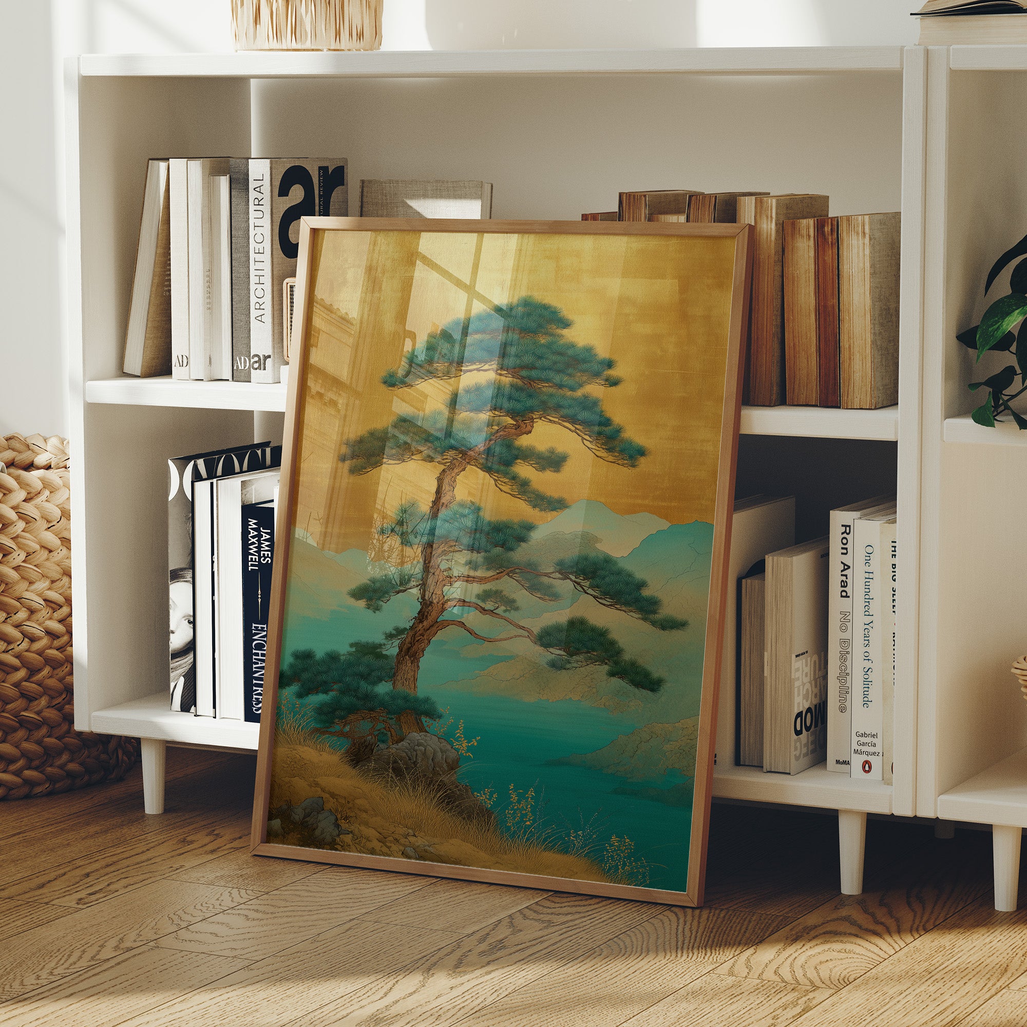 Morning light filters through emerald needles, casting ancient wisdom across a golden sky. The solitary pine stands proudly against the luminous backdrop, its weathered branches reaching outward like brushstrokes of time itself. Rich turquoise waters ripple below, while the metallic sheen of the background creates a dreamlike meditation on nature's enduring beauty. This piece brings tranquil luxury to a reading nook, meditation space, or any room seeking balance between serenity and sophistication.