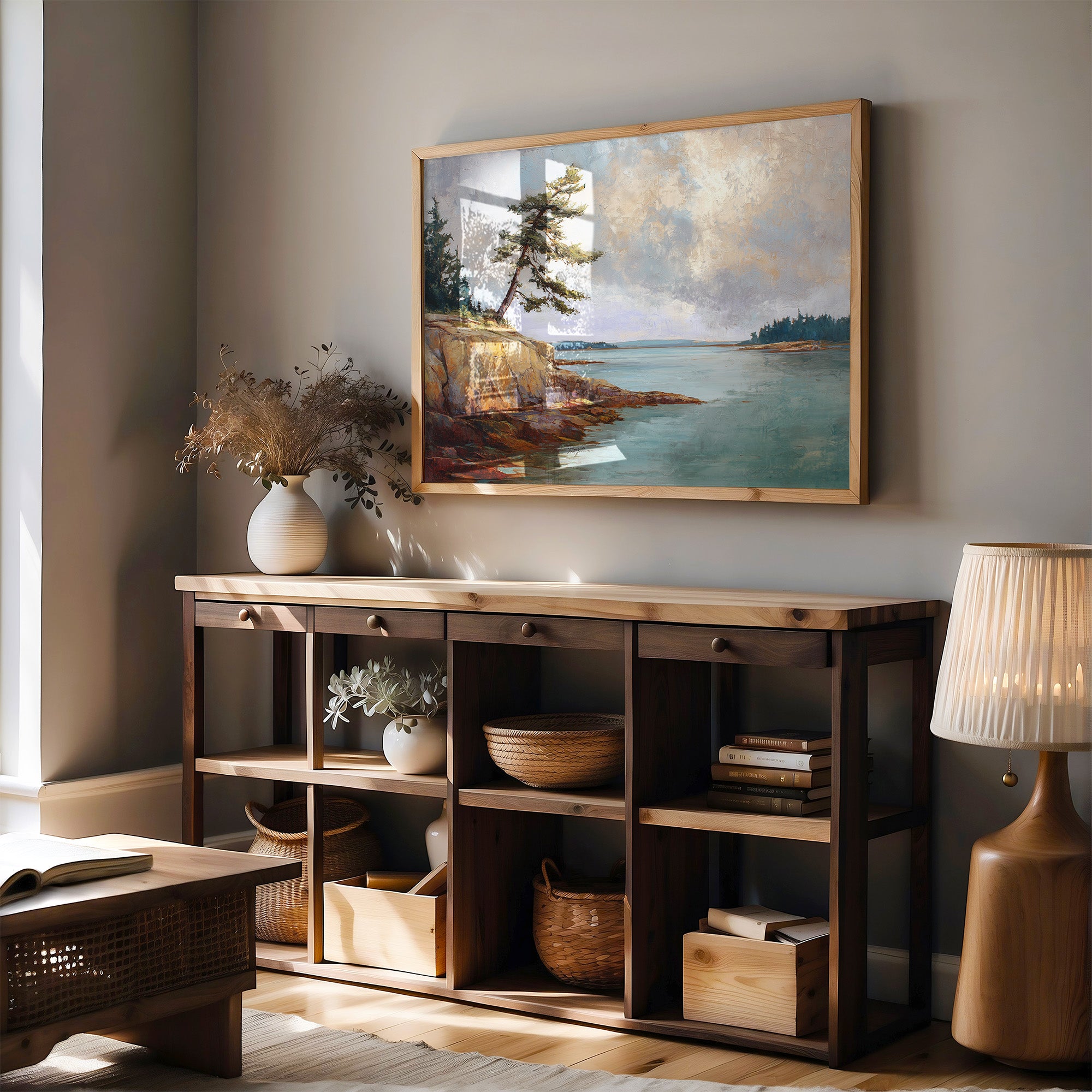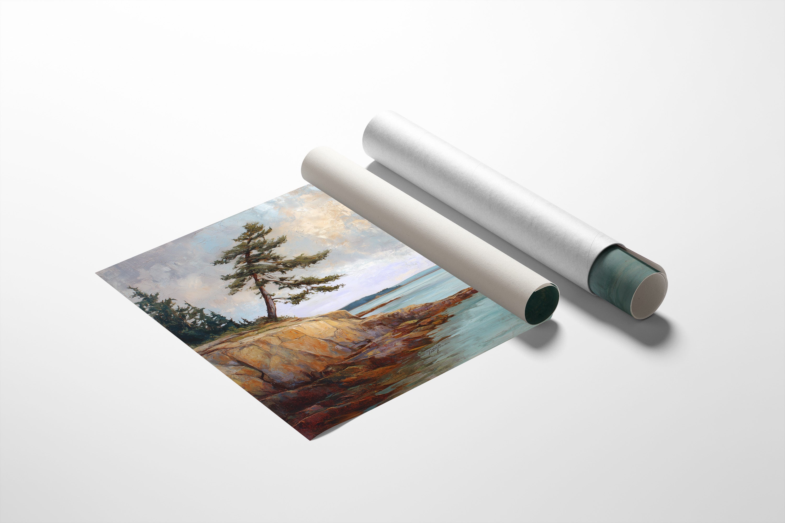 A solitary pine stands sentinel on amber cliffs, leaning into the coastal breeze as if listening to secrets carried across the water. The painting captures that perfect stillness where rugged shoreline meets tranquil turquoise waters, golden rock formations contrasting with the soft mist hanging in the distance. This serene coastal landscape brings the contemplative beauty of nature's edge into your living space, creating a moment of escape in dining rooms or reading nooks where one might pause to breathe deeply.