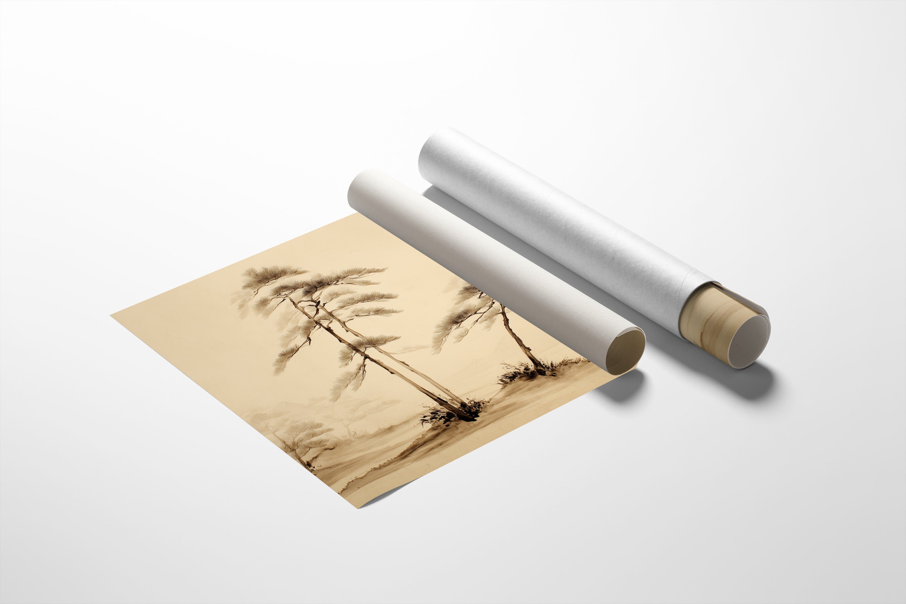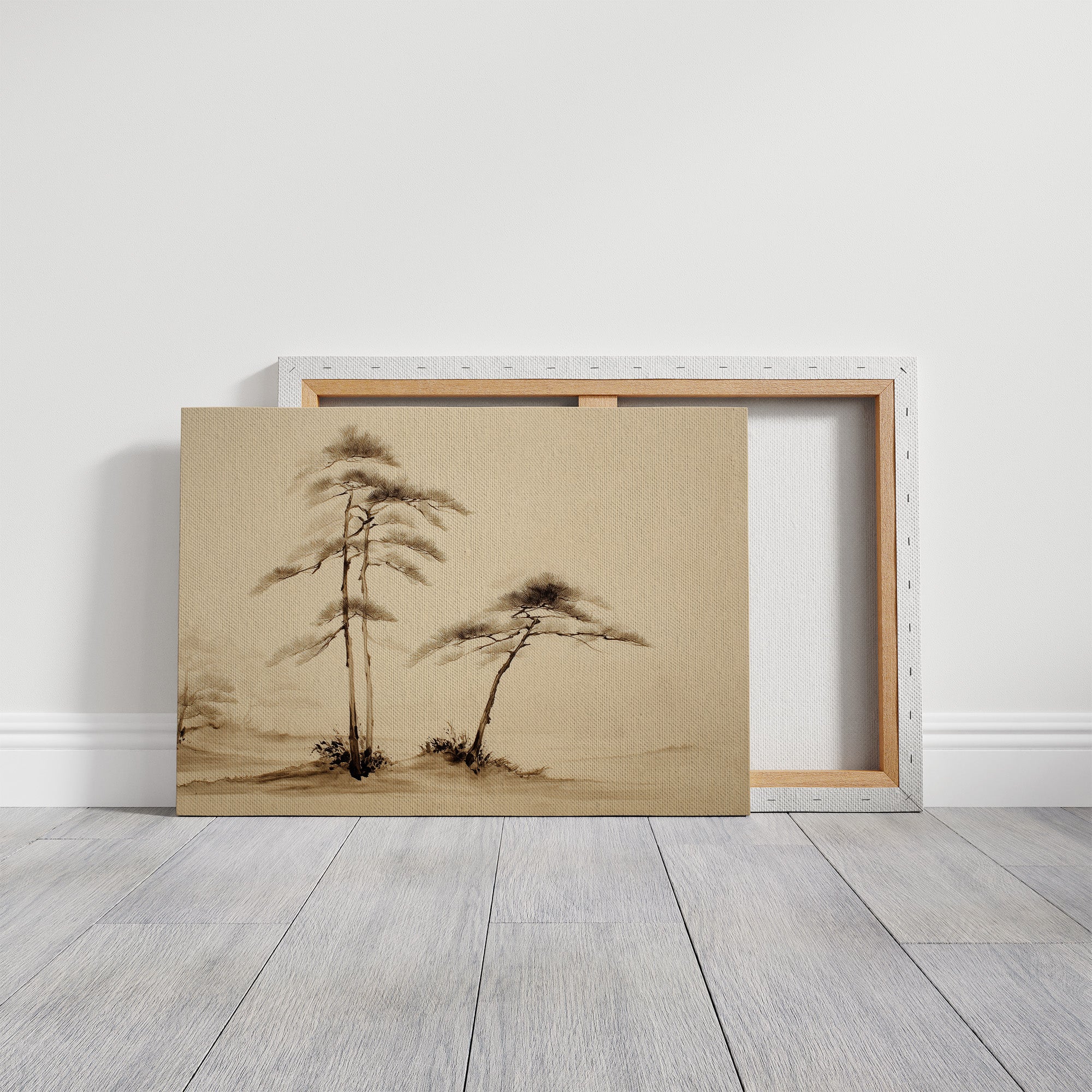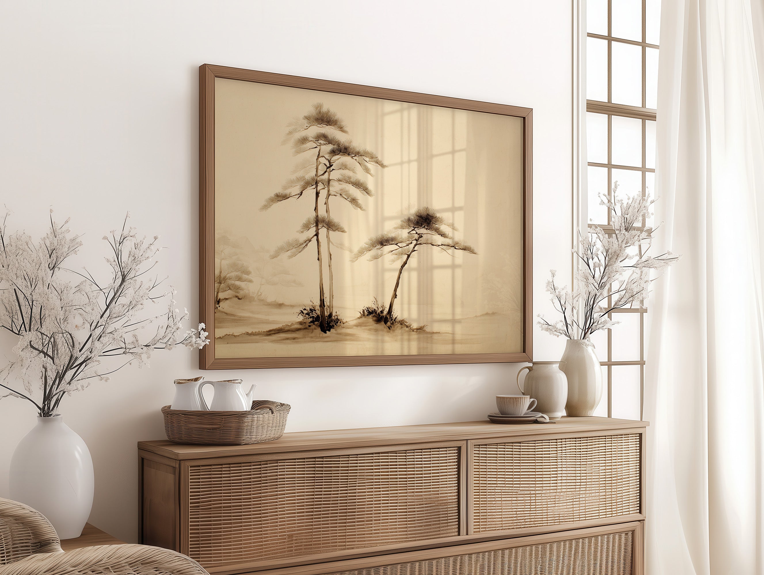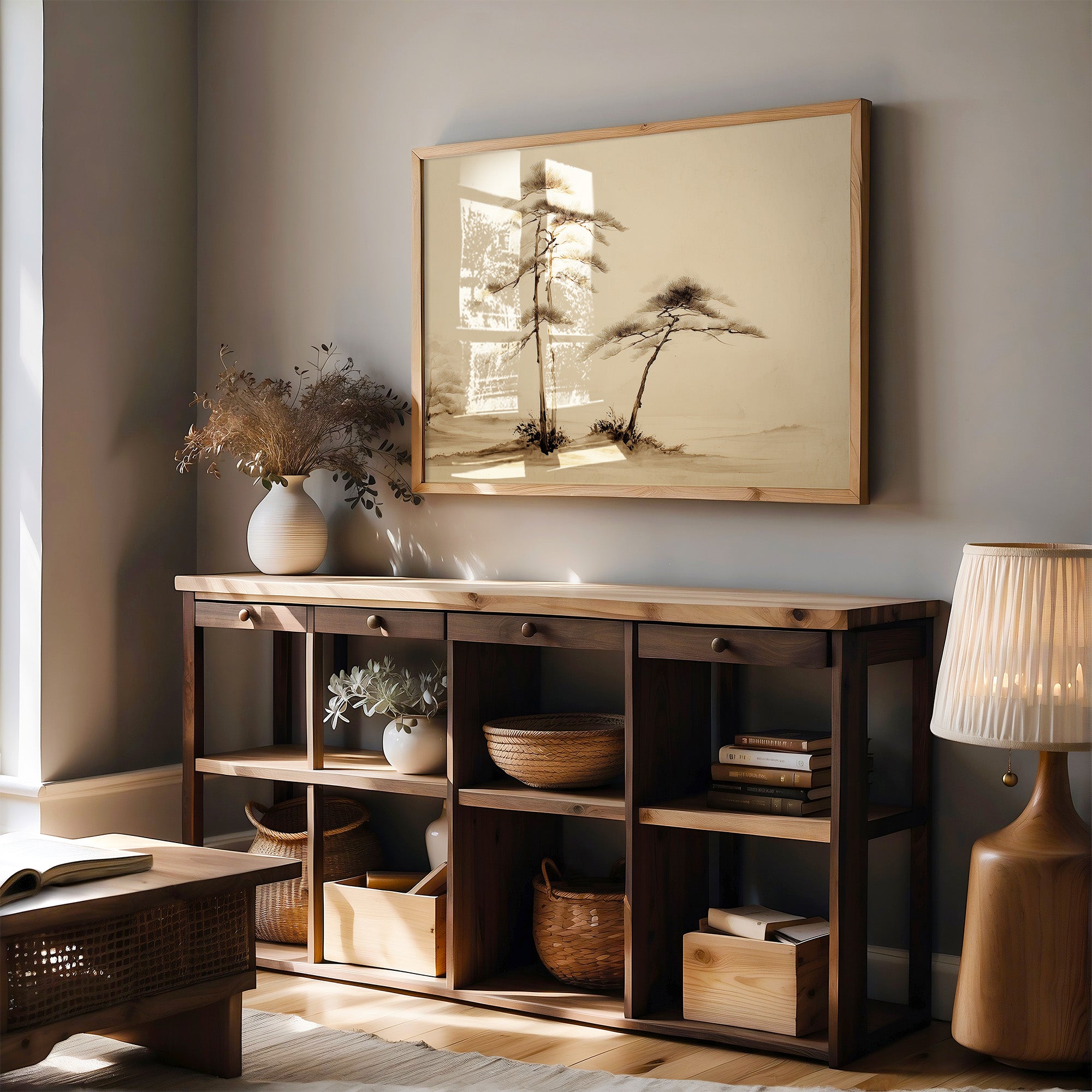 Sunlight streams through unseen windows, casting geometric patterns across a serene ink wash painting of solitary pine trees. The minimalist Asian-inspired artwork captures the essence of tranquility, with delicate brushstrokes creating a misty landscape where two graceful pines stand sentinel against a warm cream background. This piece anchors a thoughtfully curated space, where natural wood tones and organized storage blend seamlessly with organic decorative elements. This piece would bring zen-like serenity to a reading nook, home office, or meditation space where quiet contemplation is valued.