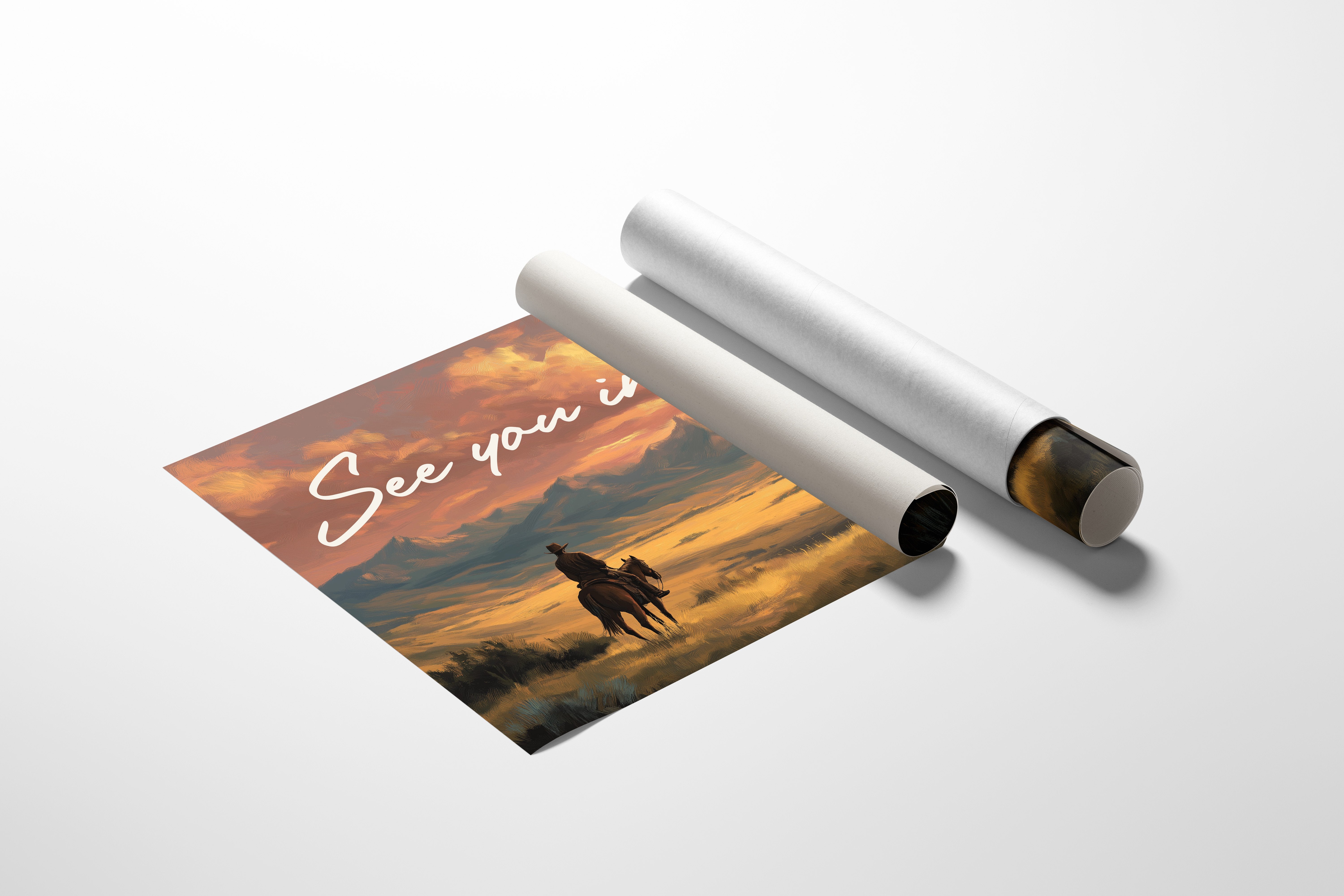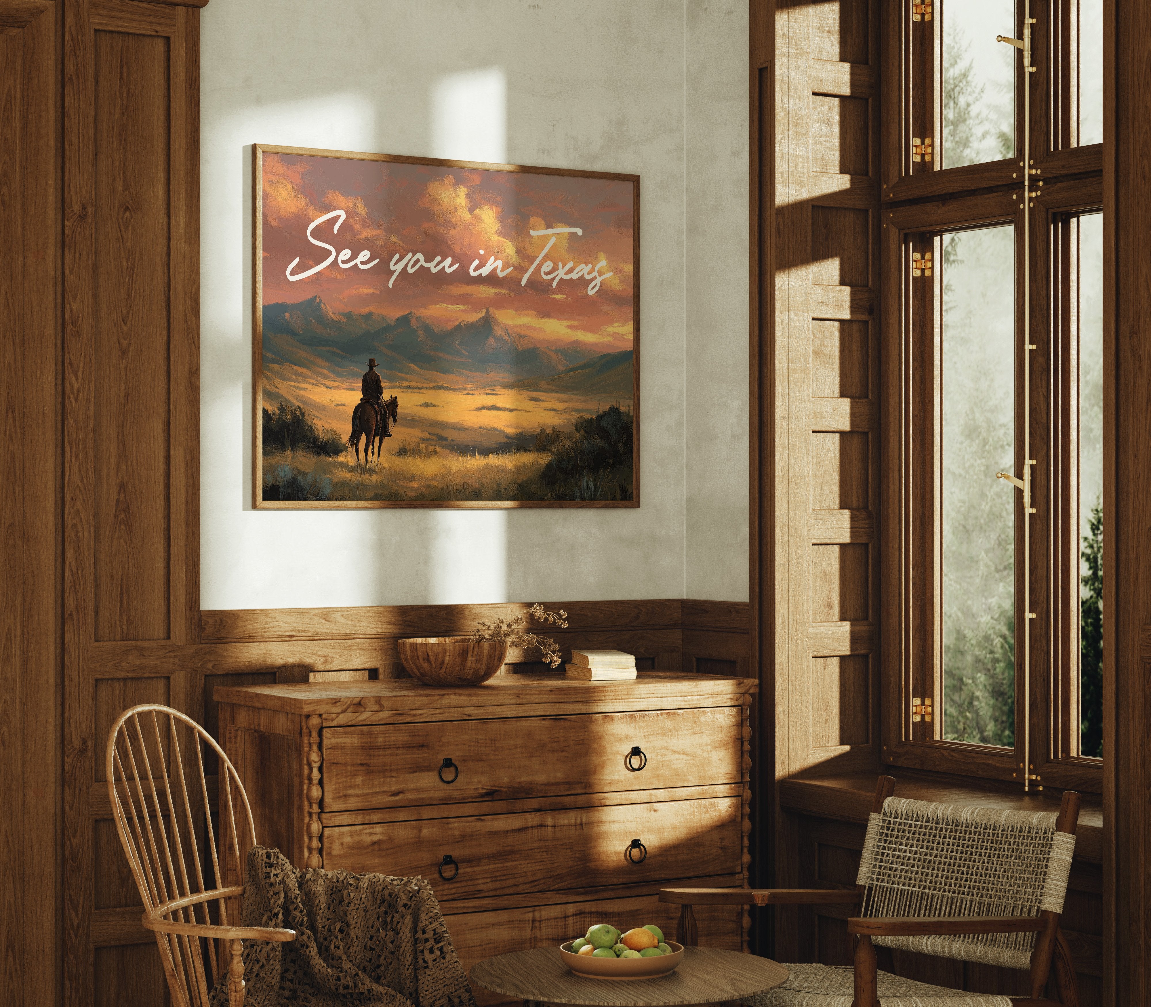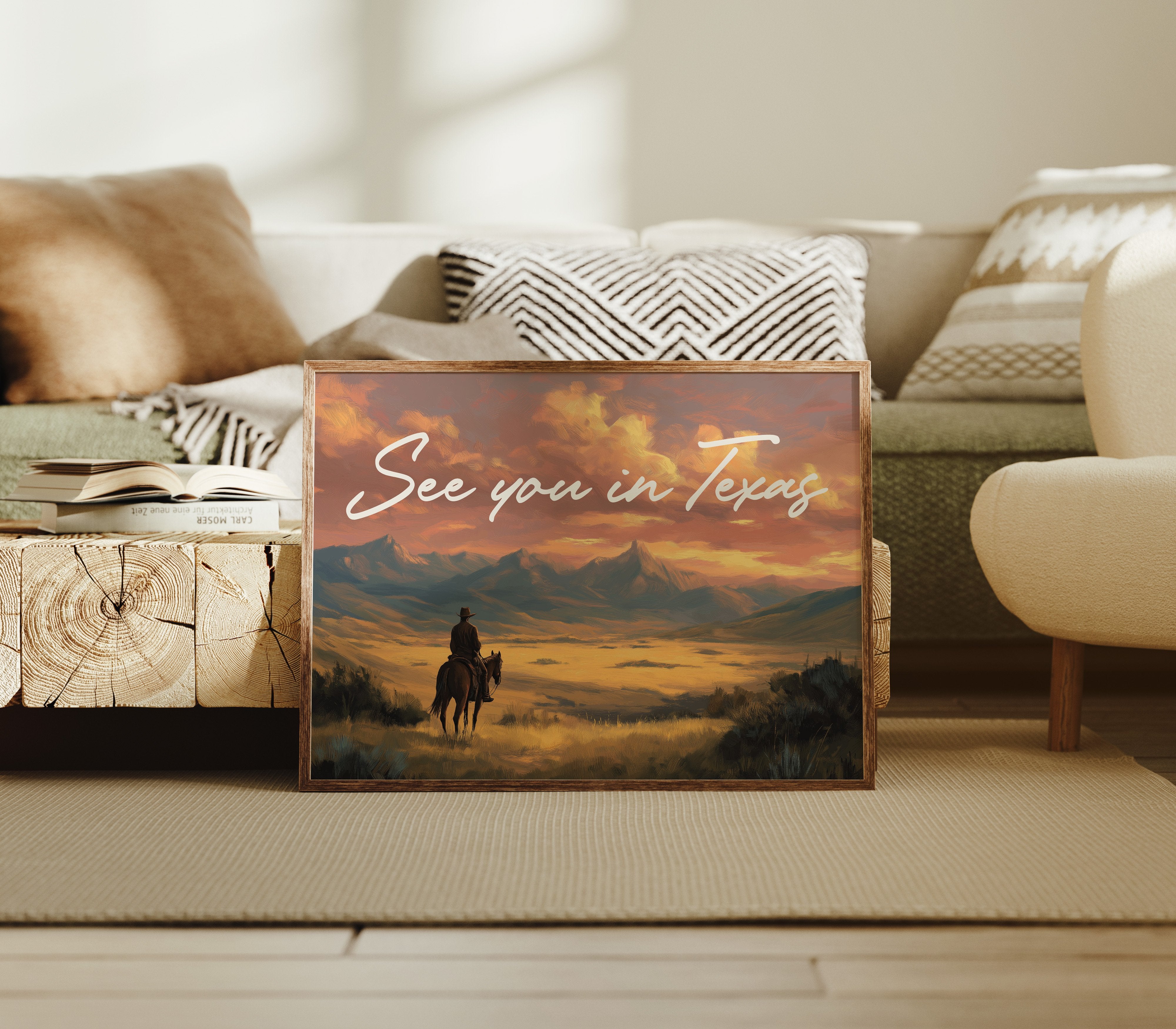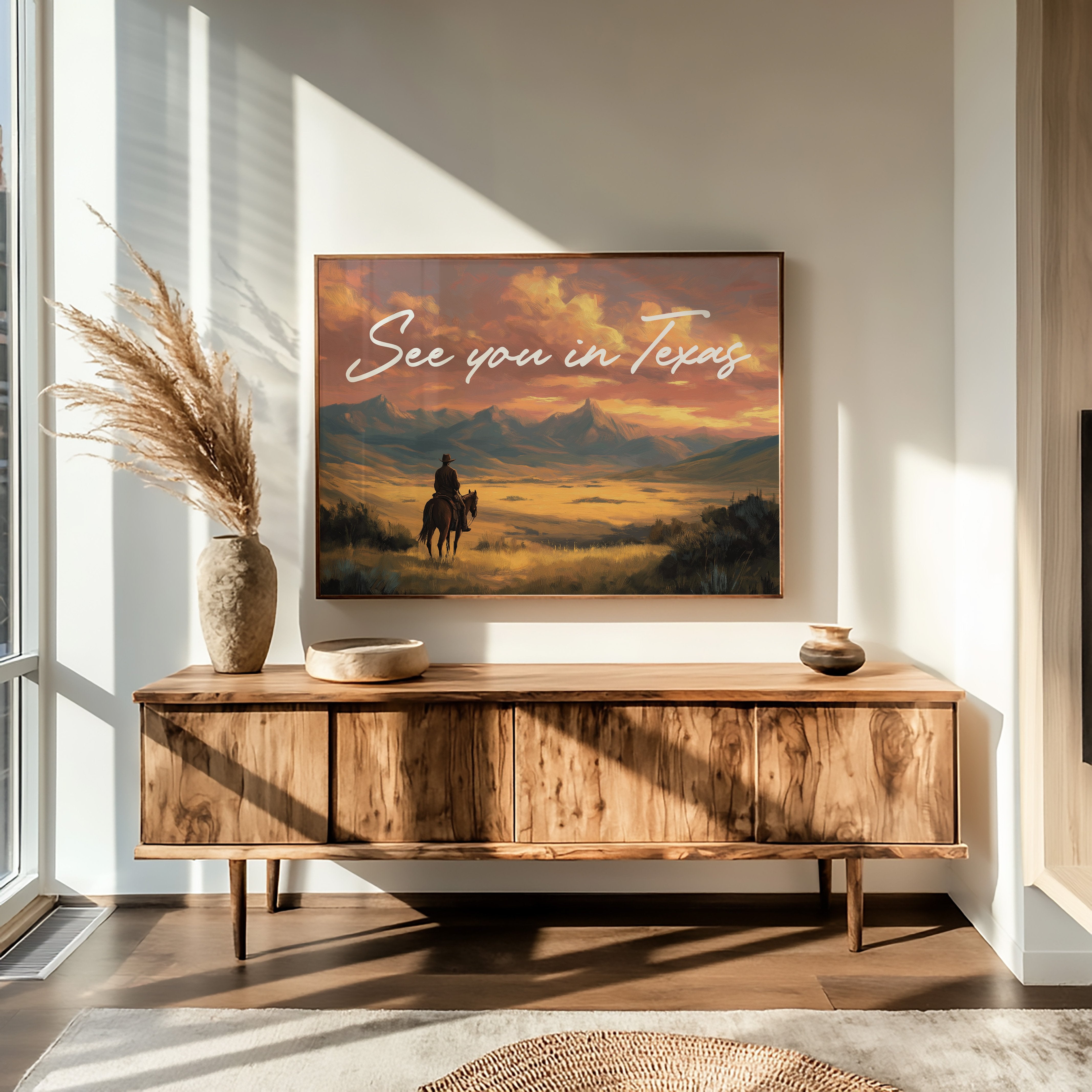 The vast Texas landscape stretches endlessly, painted in fiery amber and gold as the sun casts its final glow across the plains. A solitary rider and horse stand silhouetted against the burning sky, their stillness capturing that perfect moment between adventure and reflection. The mountains rise majestically in the distance, their purple shadows deepening as daylight fades, while the handwritten promise ""See you in Texas"" floats like a whispered invitation above the scene. This piece brings rustic charm and wanderlust to a living room or home office, inviting dreams of wide-open spaces.