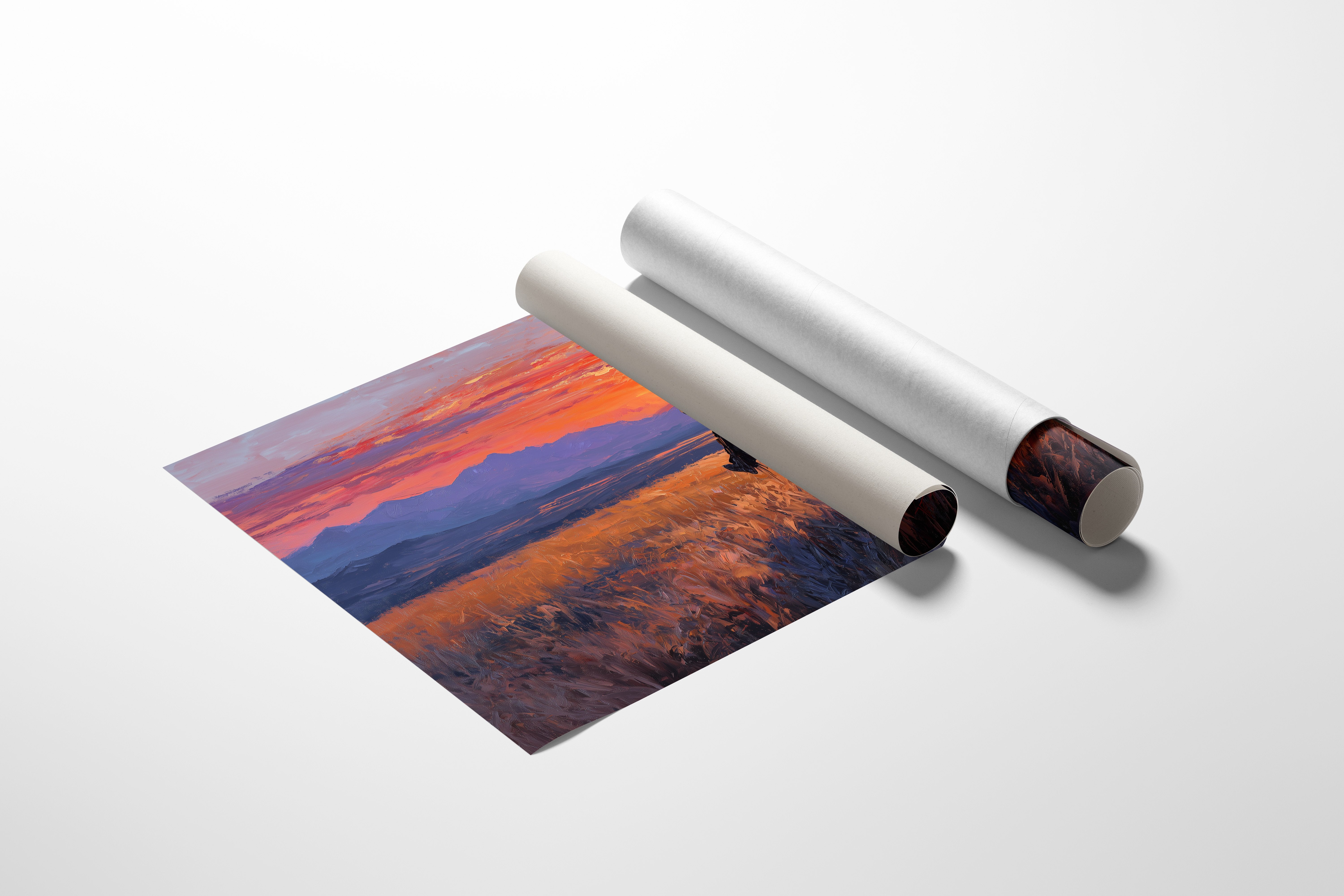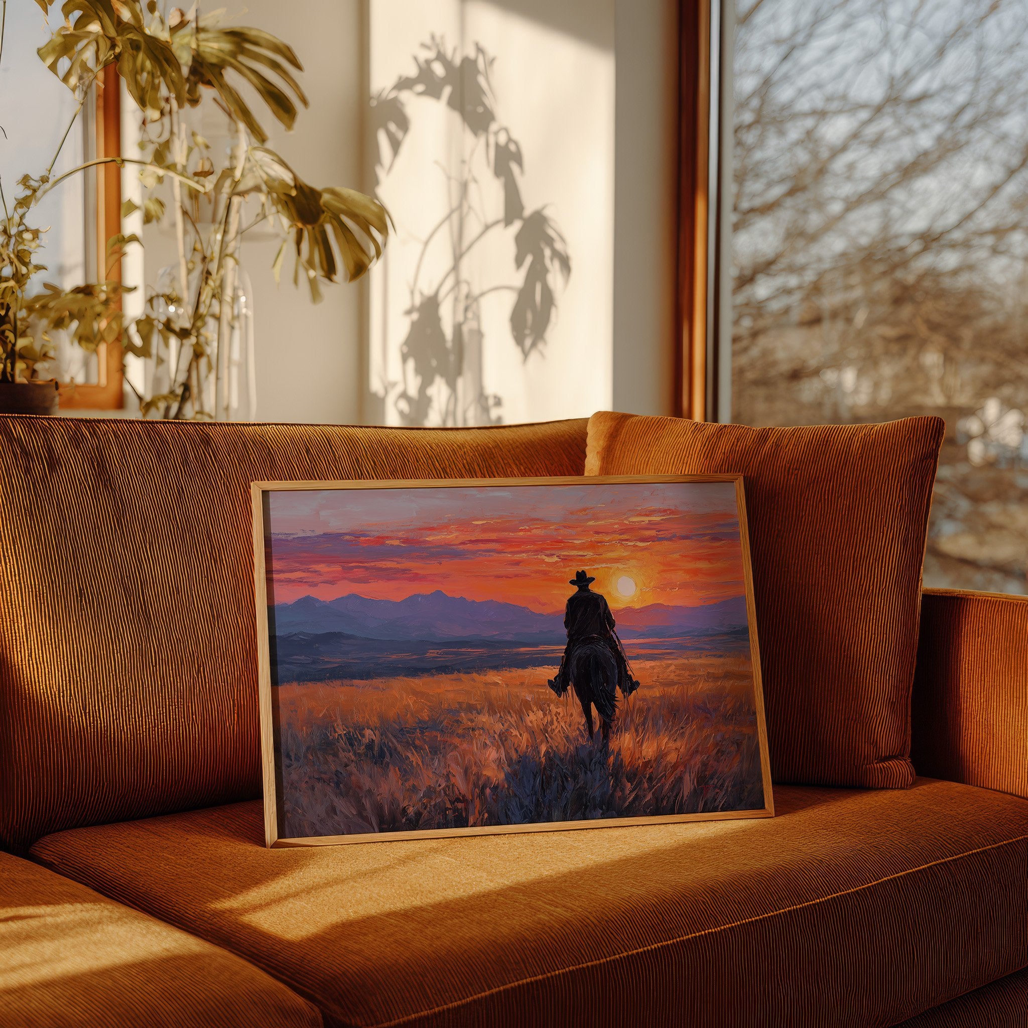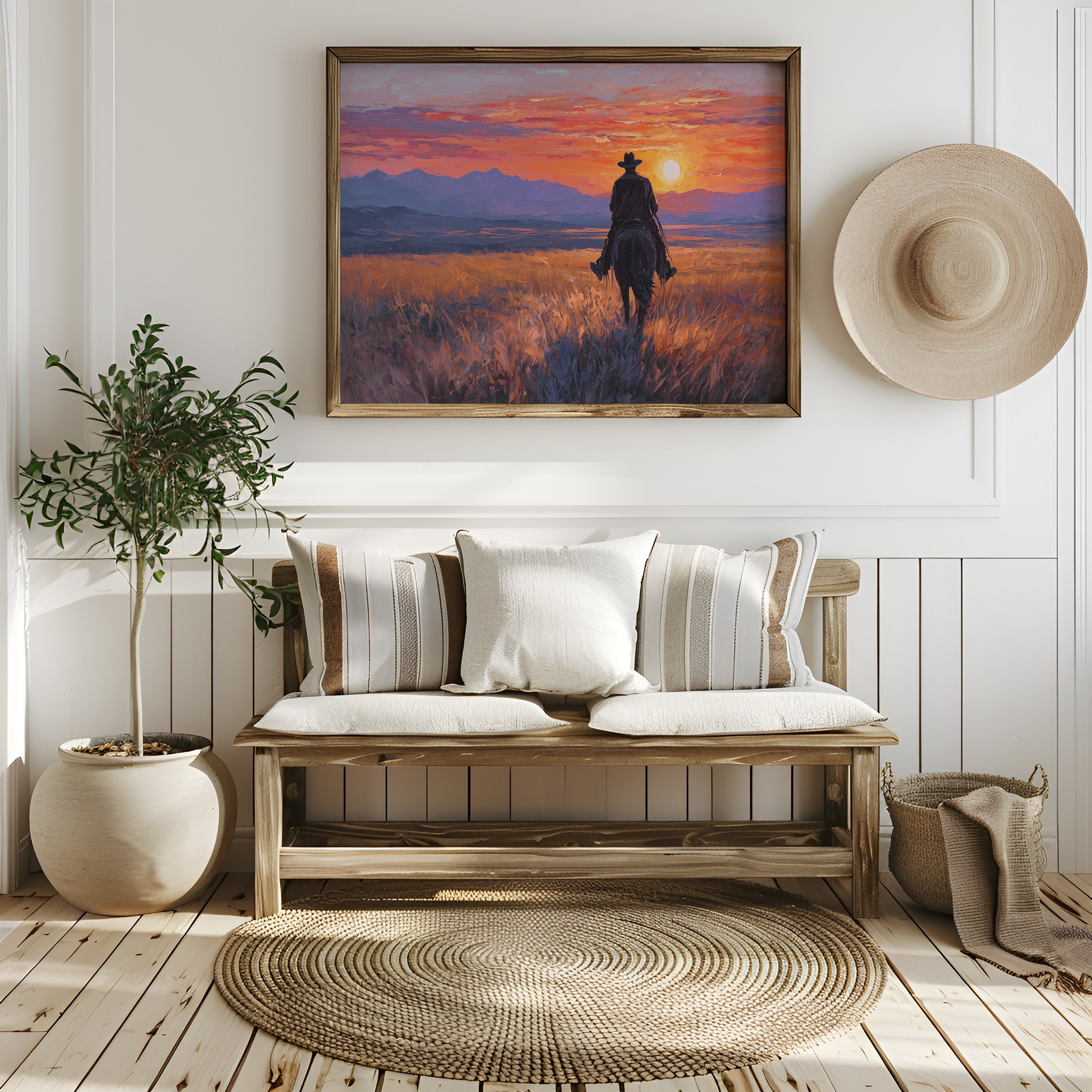 The boundary between earth and heaven burns with possibility as a solitary rider faces the setting sun. Golden light bathes amber grasslands in warm hues, creating a tapestry of oranges and purples against the silhouette of distant mountains. The painting captures that fleeting moment when day surrenders to night, when possibilities feel as endless as the open range. This striking piece brings southwestern charm and quiet contemplation to living rooms, home offices, or hallways seeking a touch of adventure.