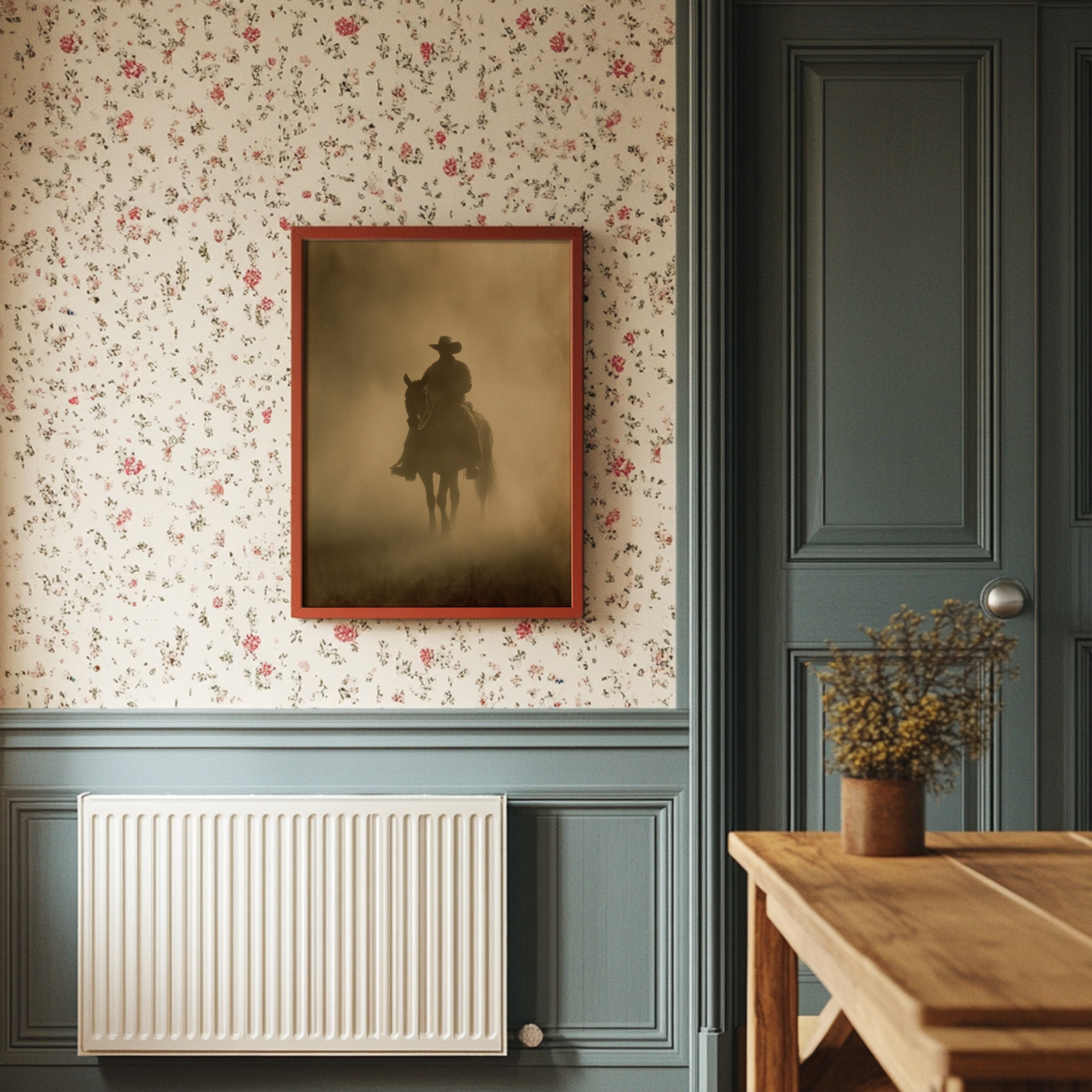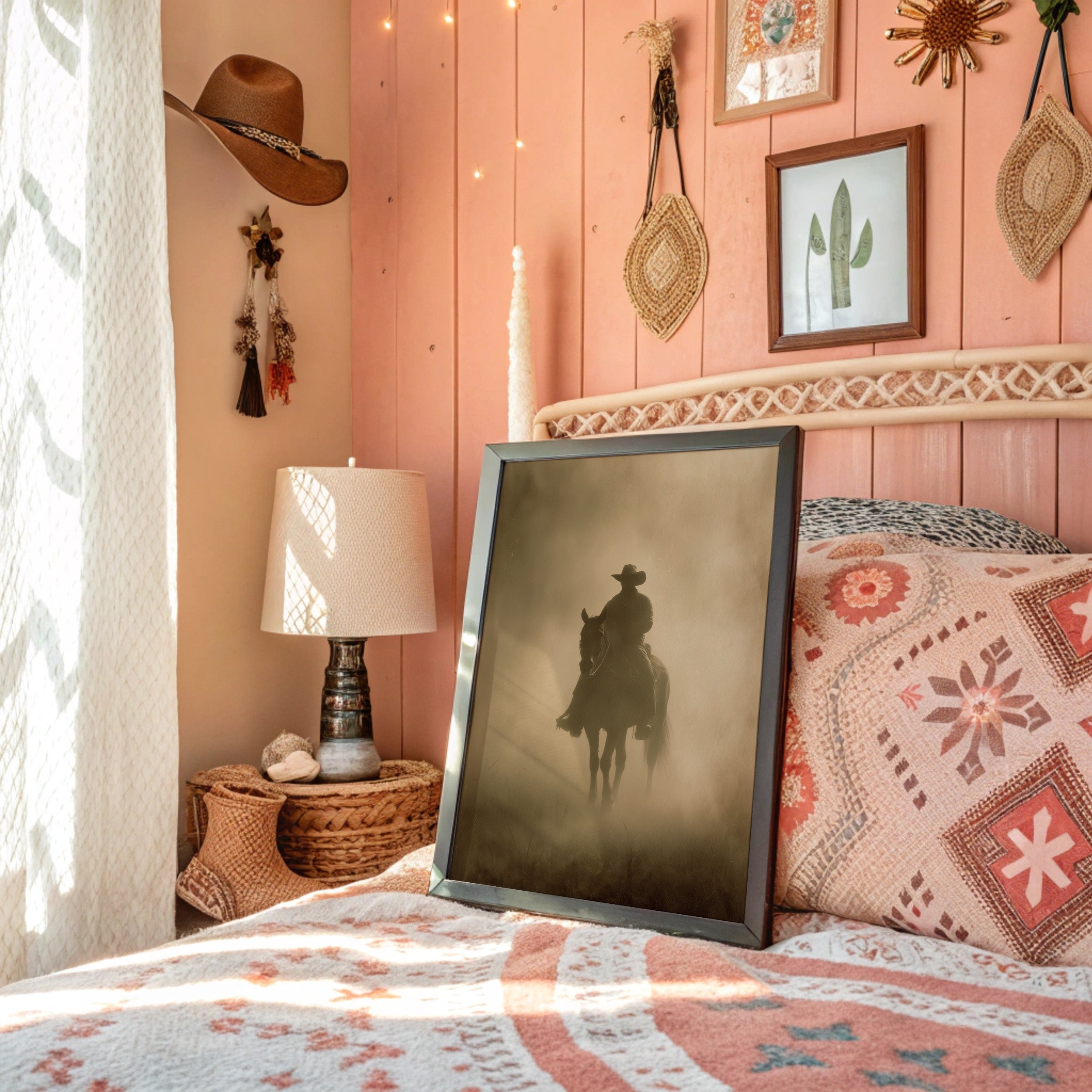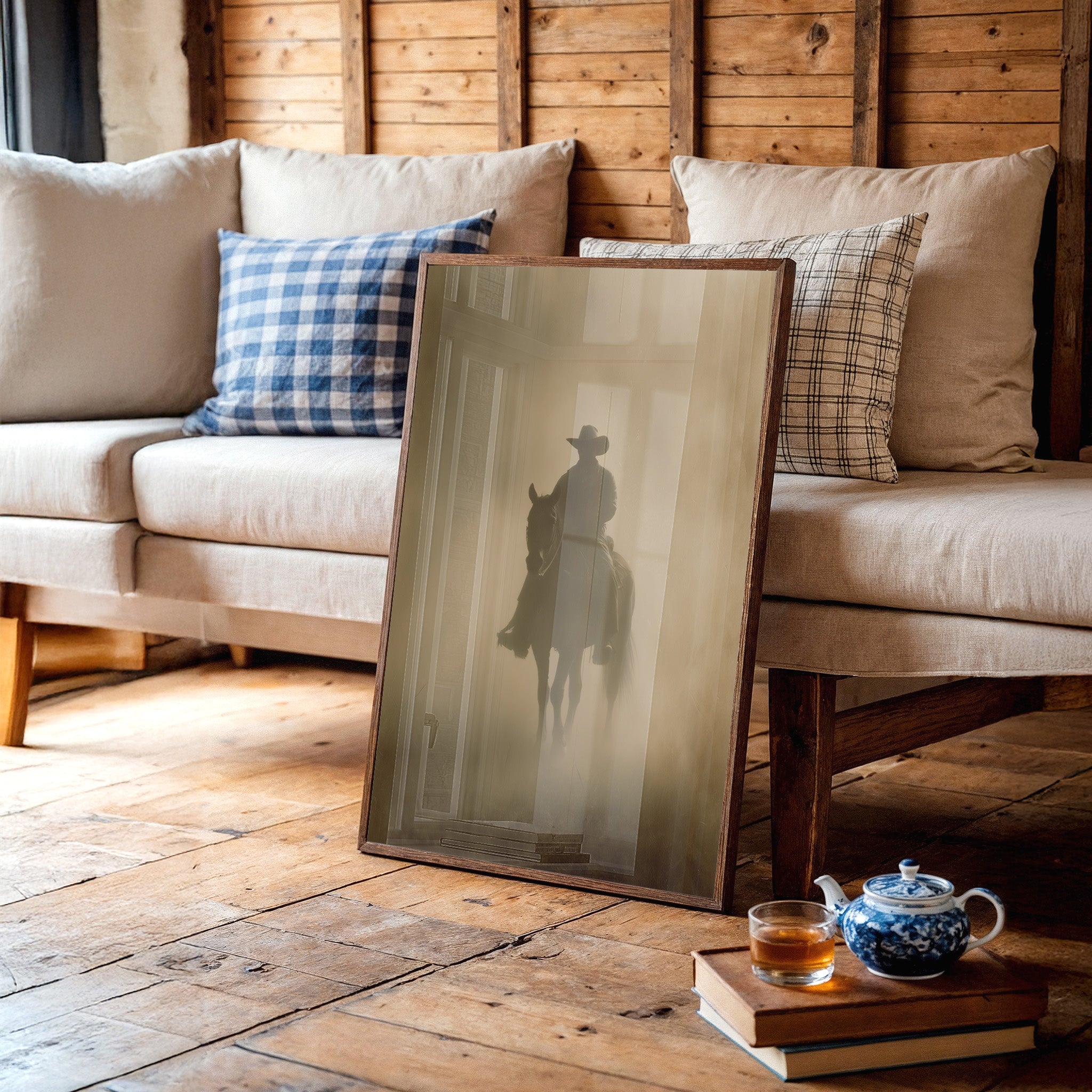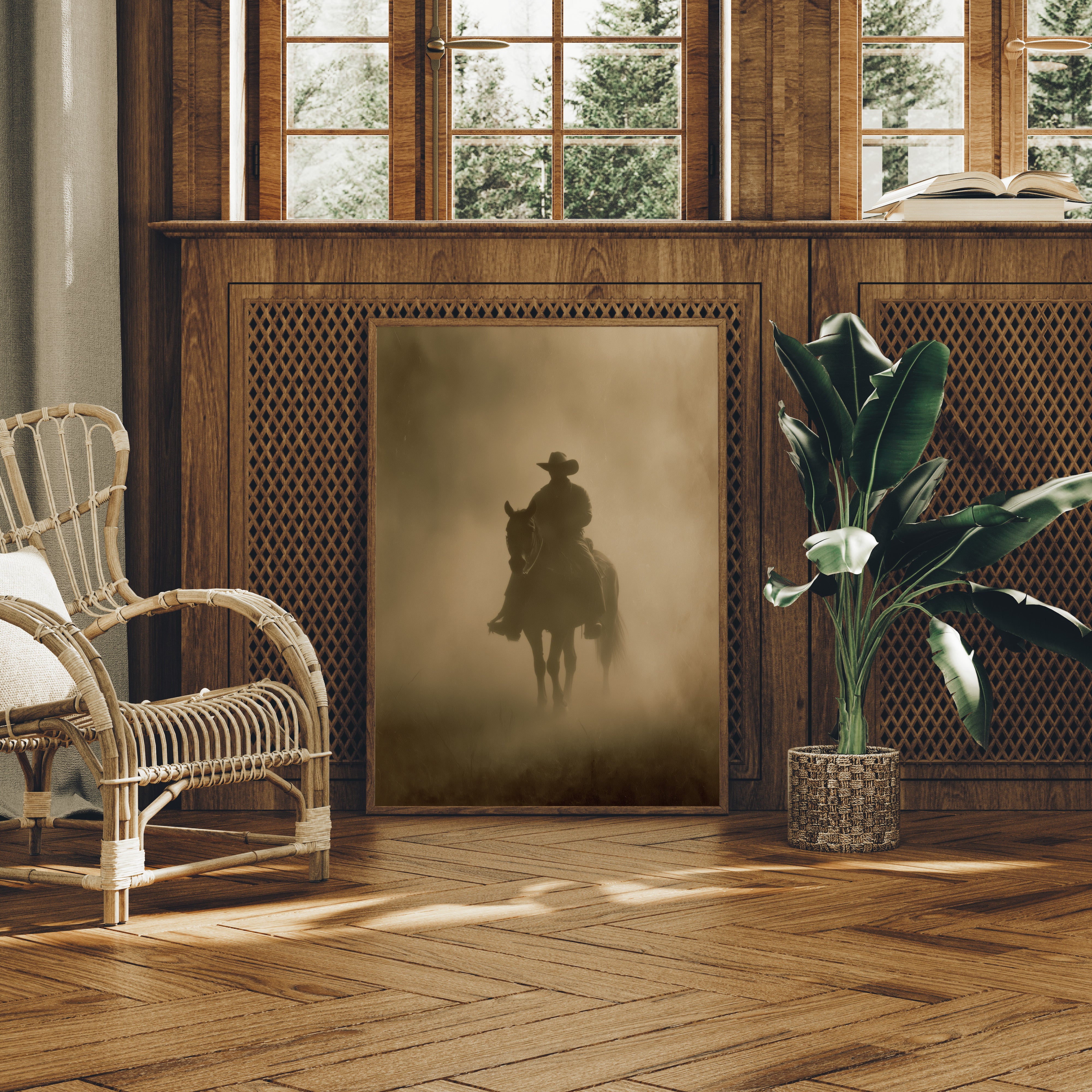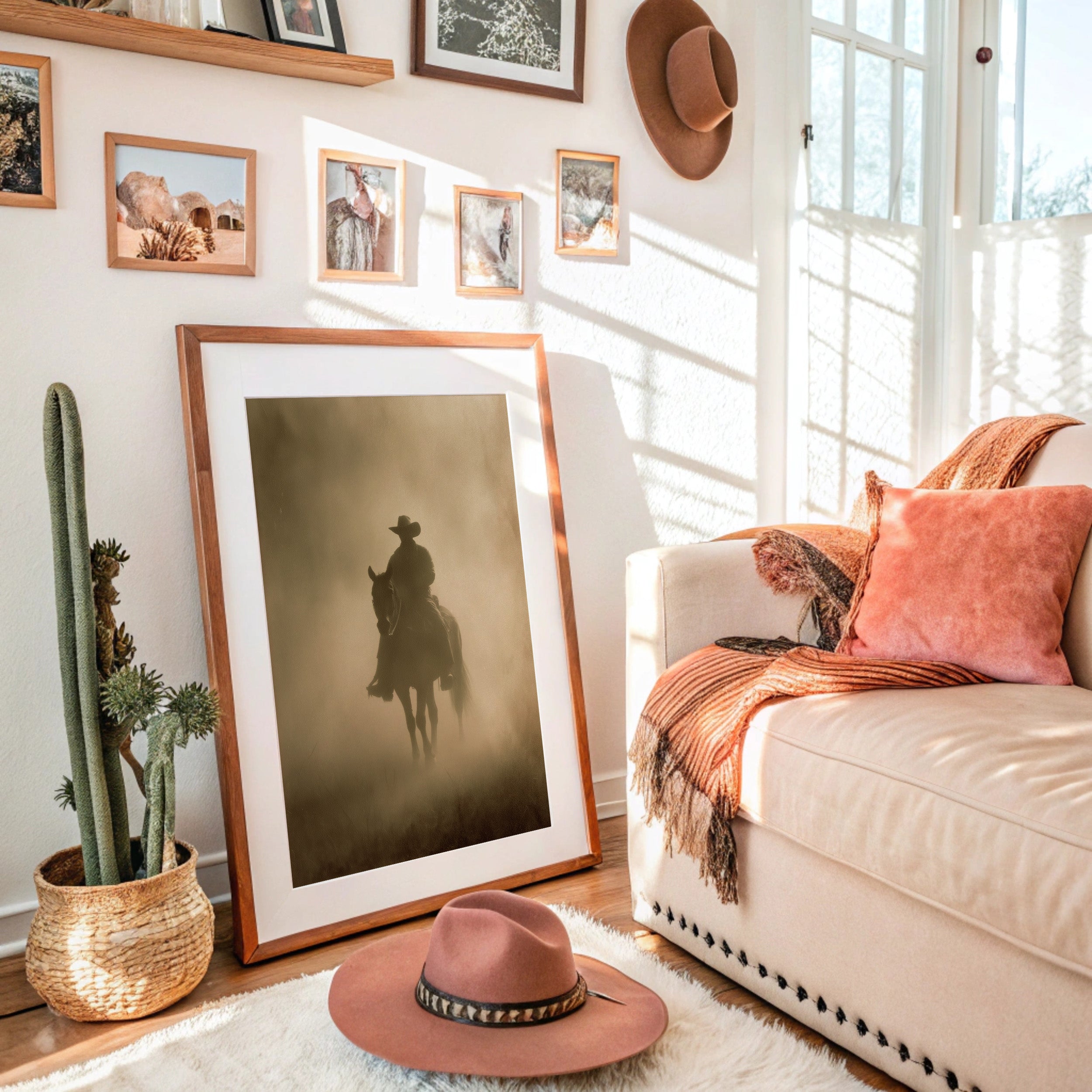 A solitary figure emerges from the ethereal fog, their silhouette merging with their trusted steed in a dance of light and shadow. The sepia tones and misty atmosphere create a timeless moment that captures the spirit of the American West, evoking tales of adventure and untamed frontiers. This striking scene finds its perfect home in a modern rustic living space, where weathered wood meets leather and iron, creating a seamless blend of contemporary comfort and Western heritage.