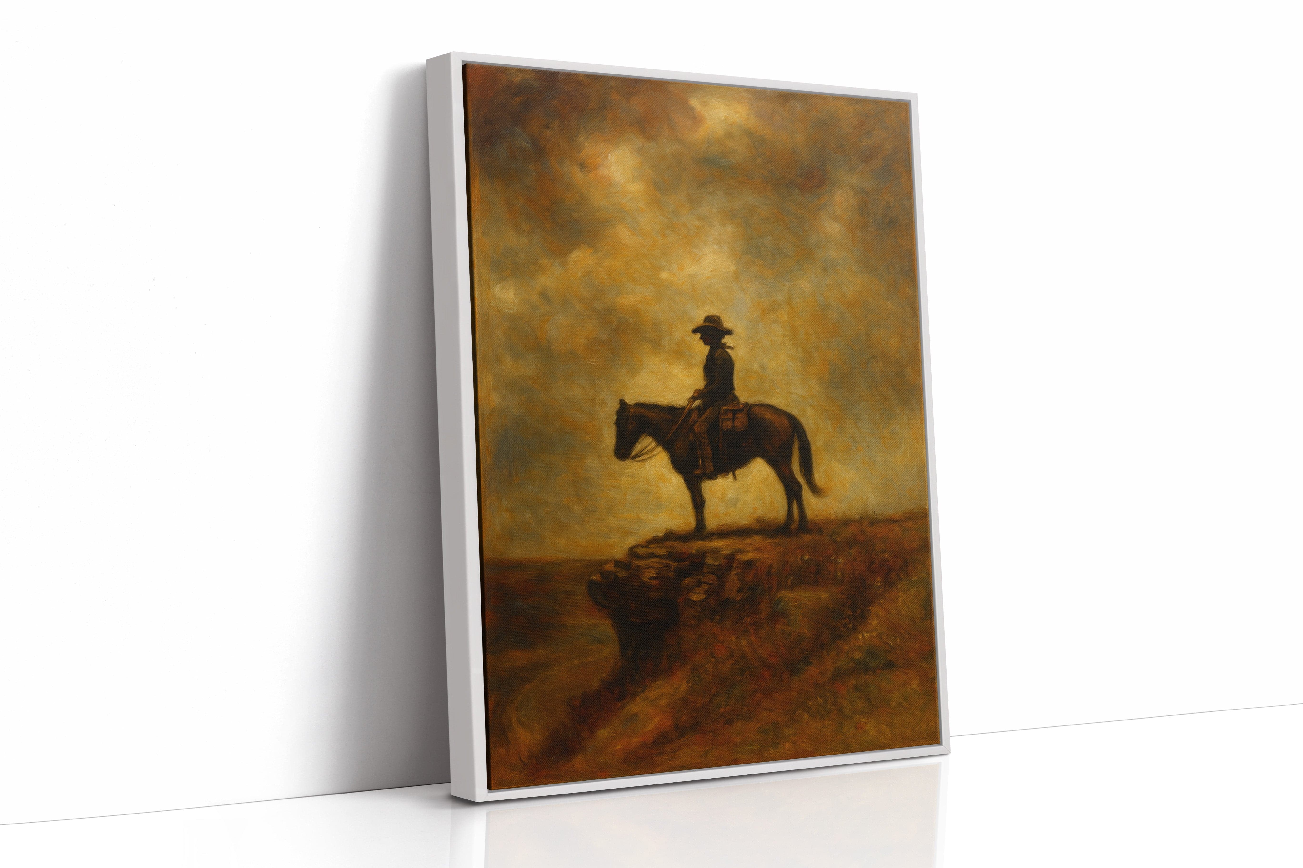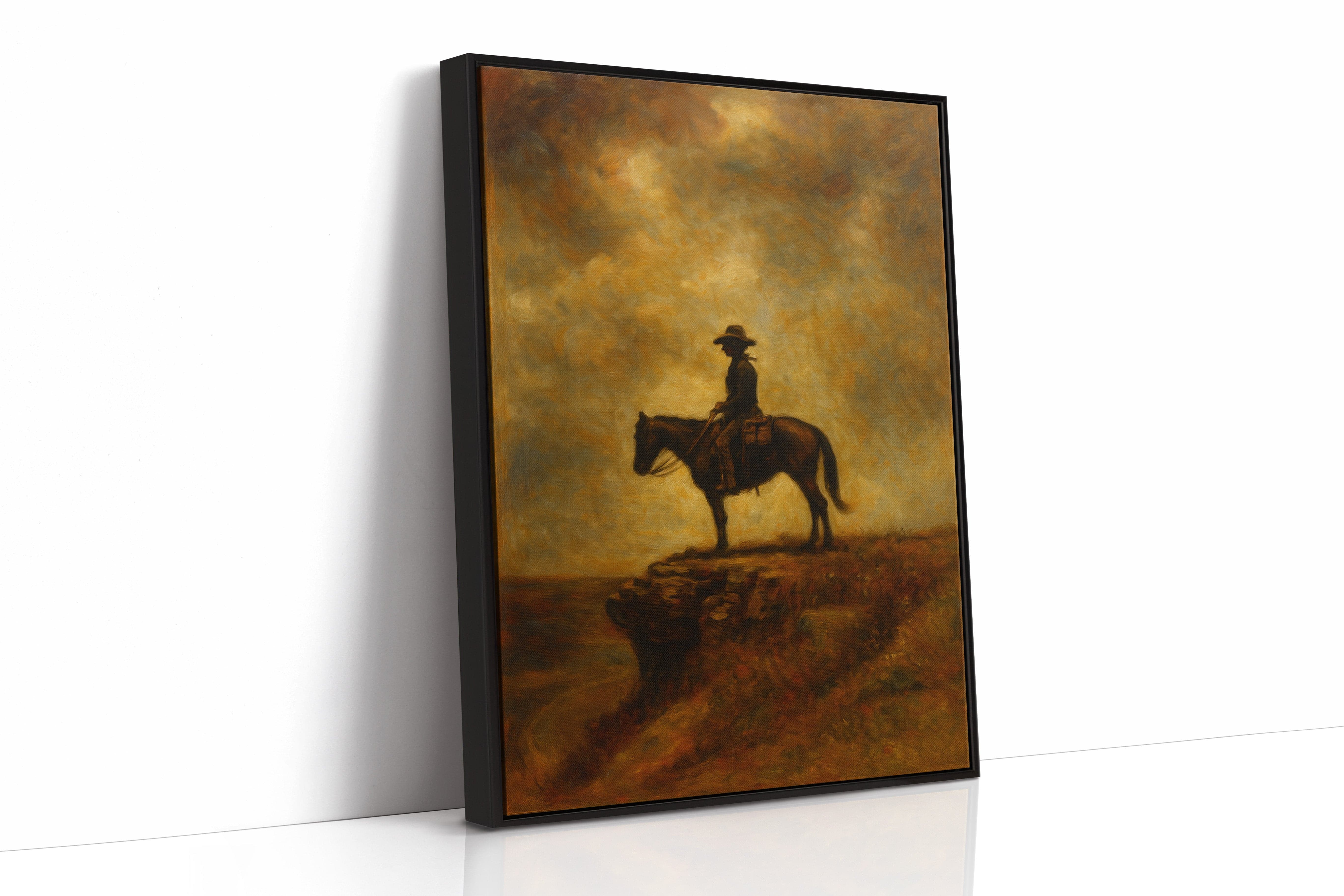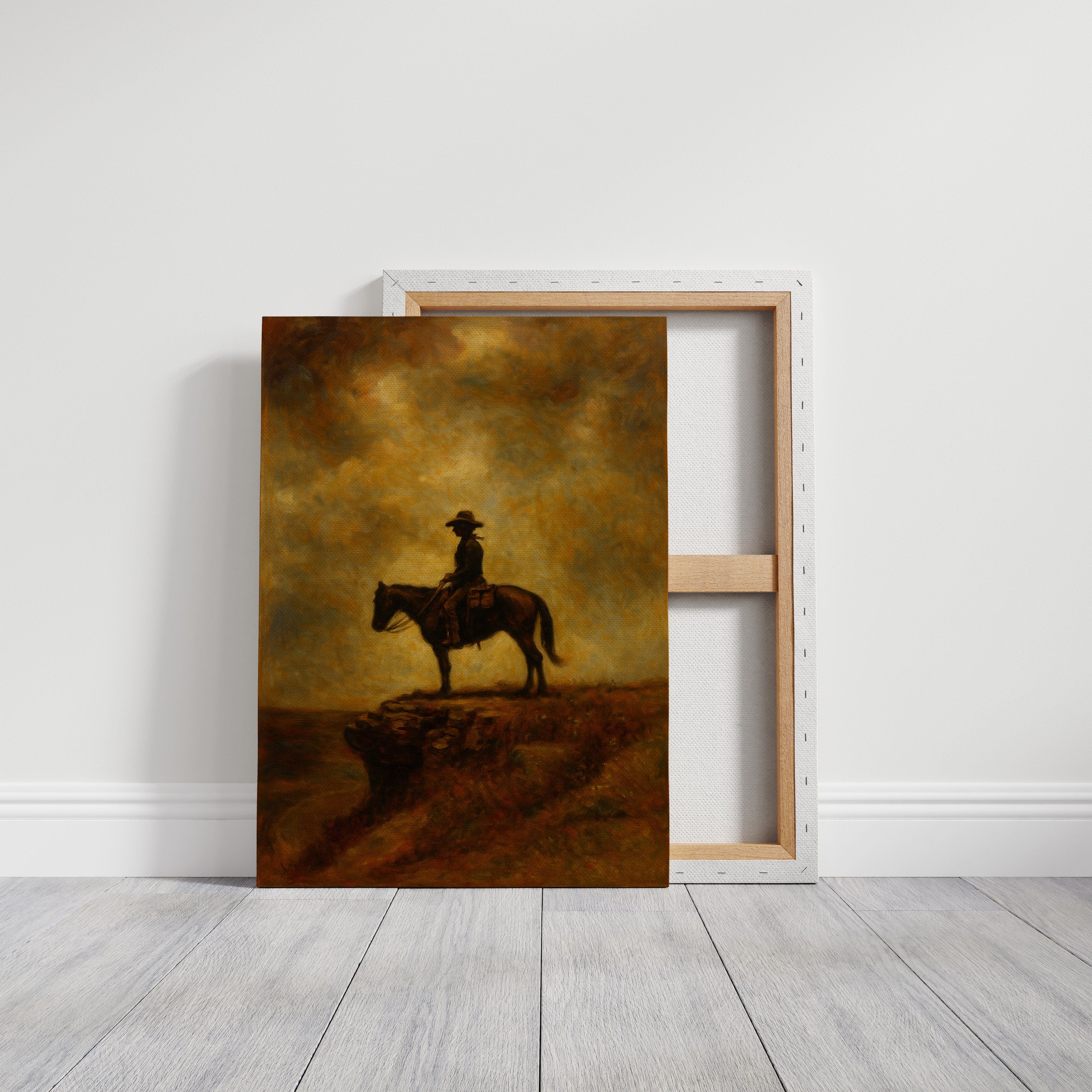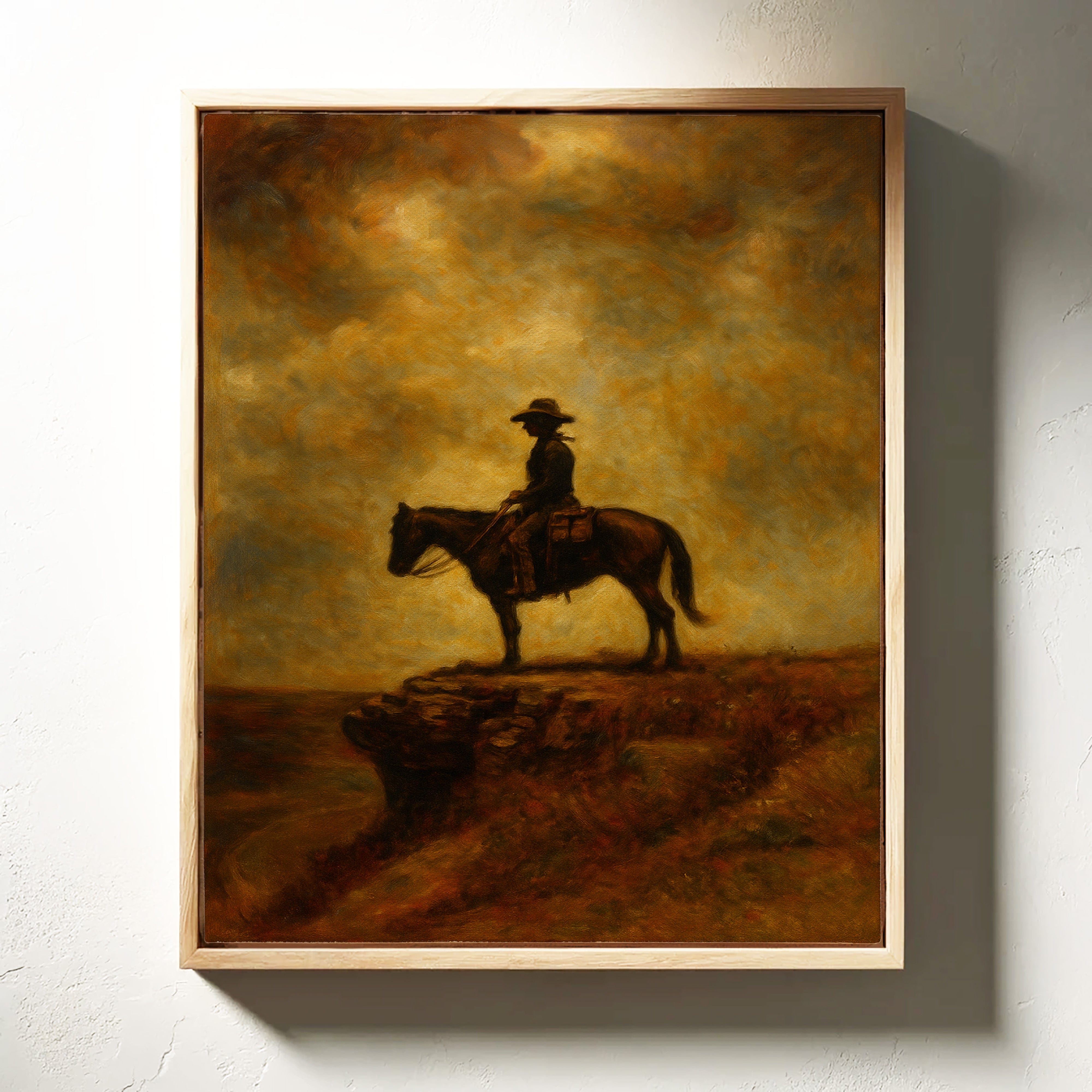 Lone Sentinel captures the quiet dignity of the frontier with a striking silhouette of a cowboy atop a horse, standing watch on a rugged cliff against a dramatic, painterly sky. This atmospheric piece radiates solitude, strength, and timeless Americana, making it an ideal addition to any Western-themed space, office, or gallery wall.